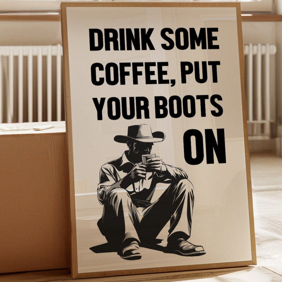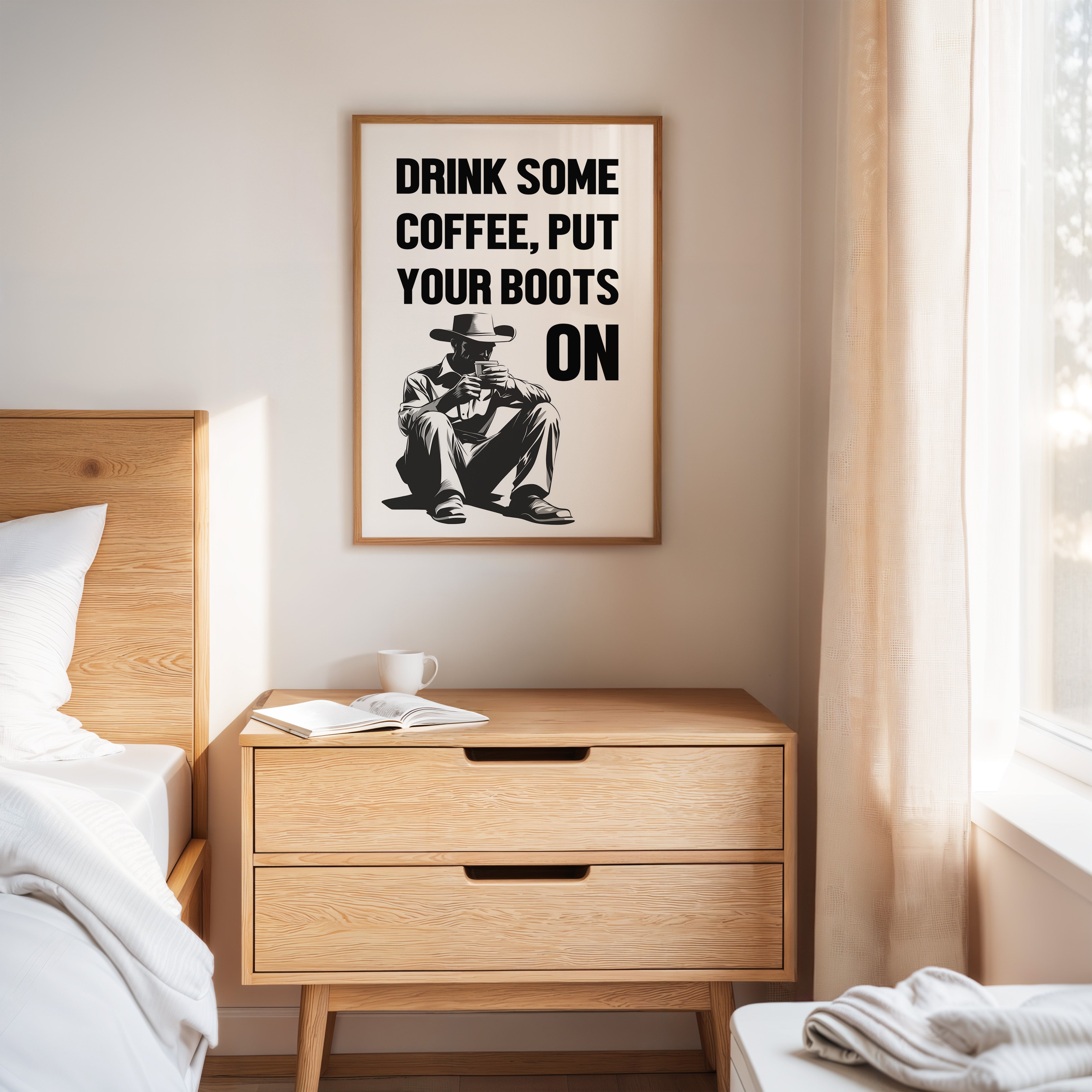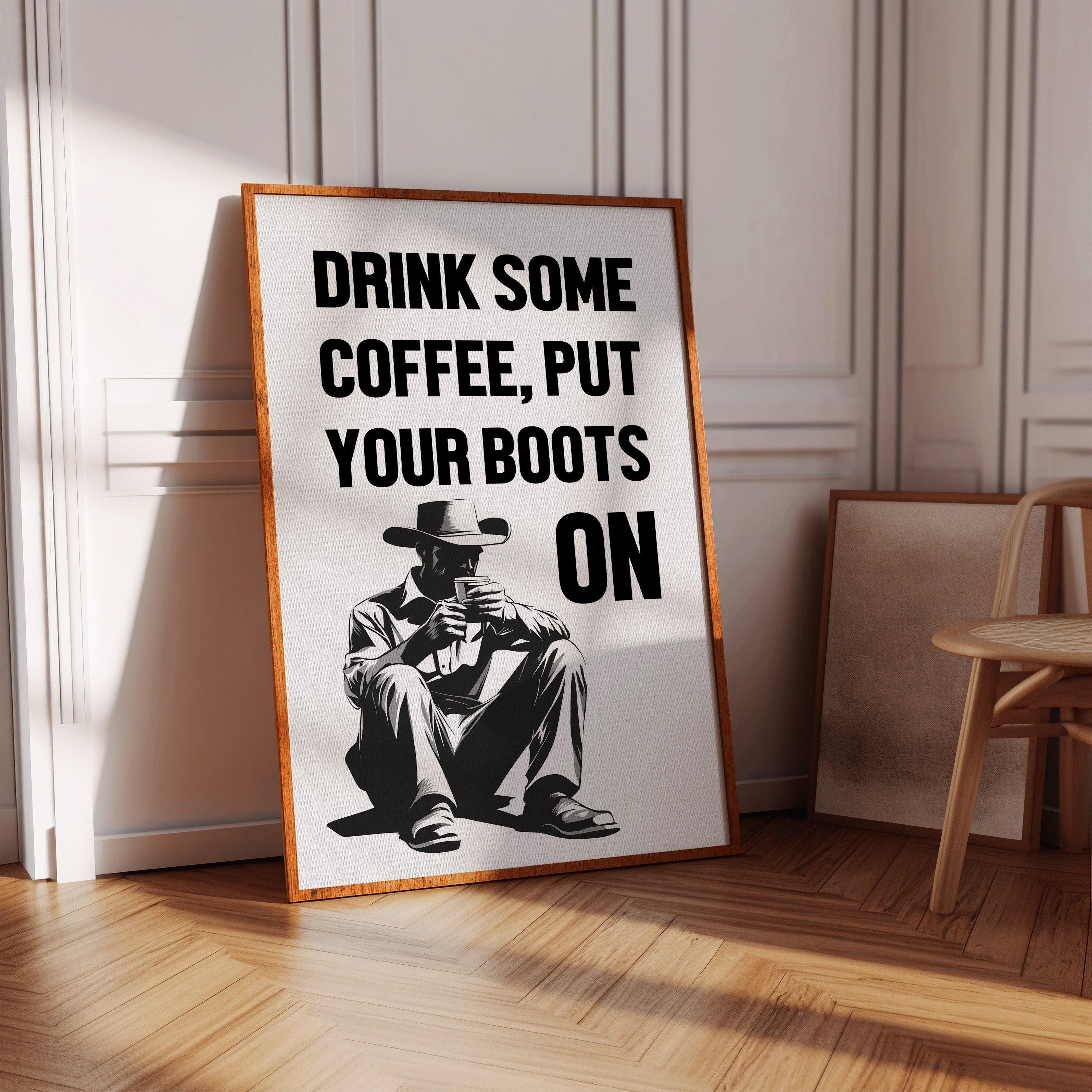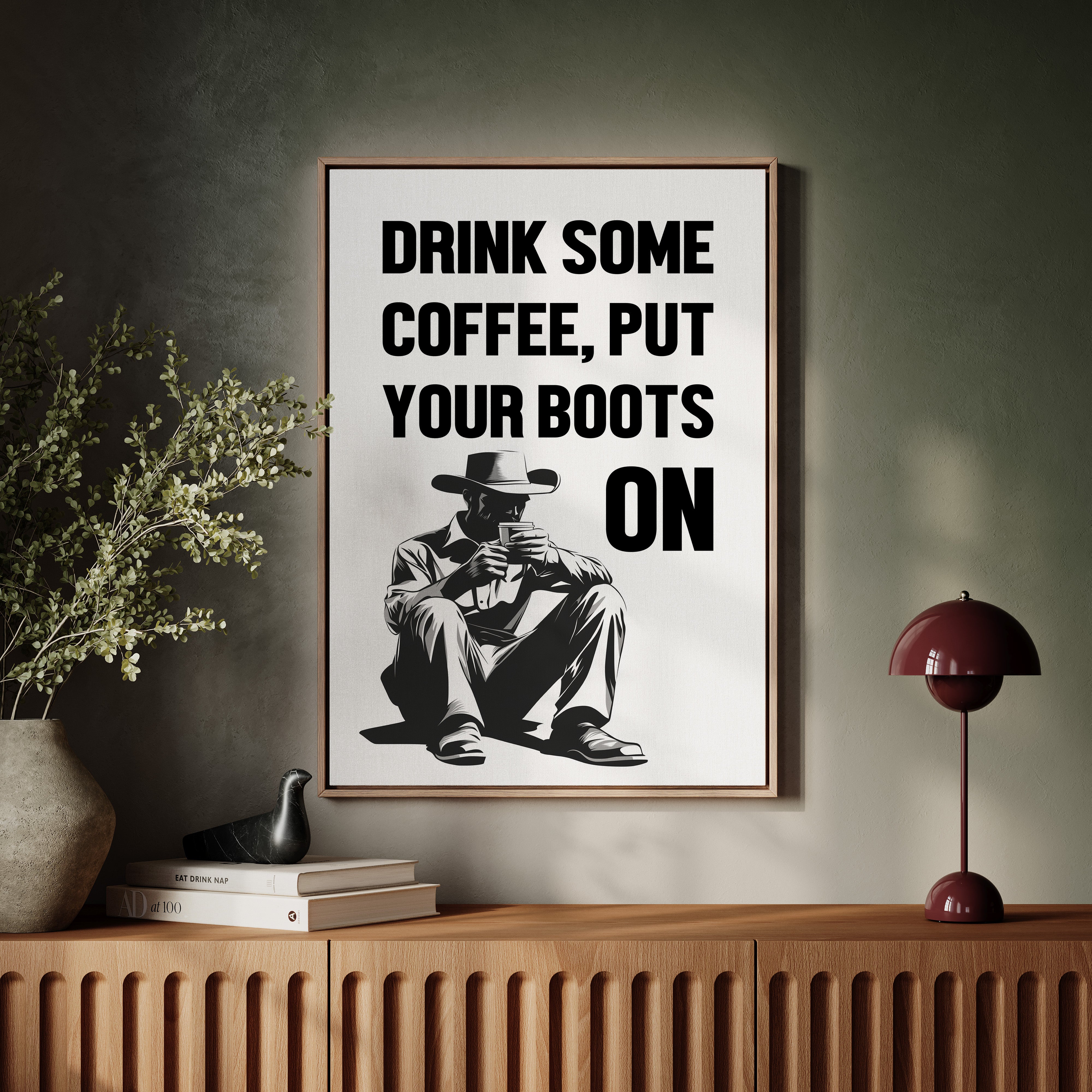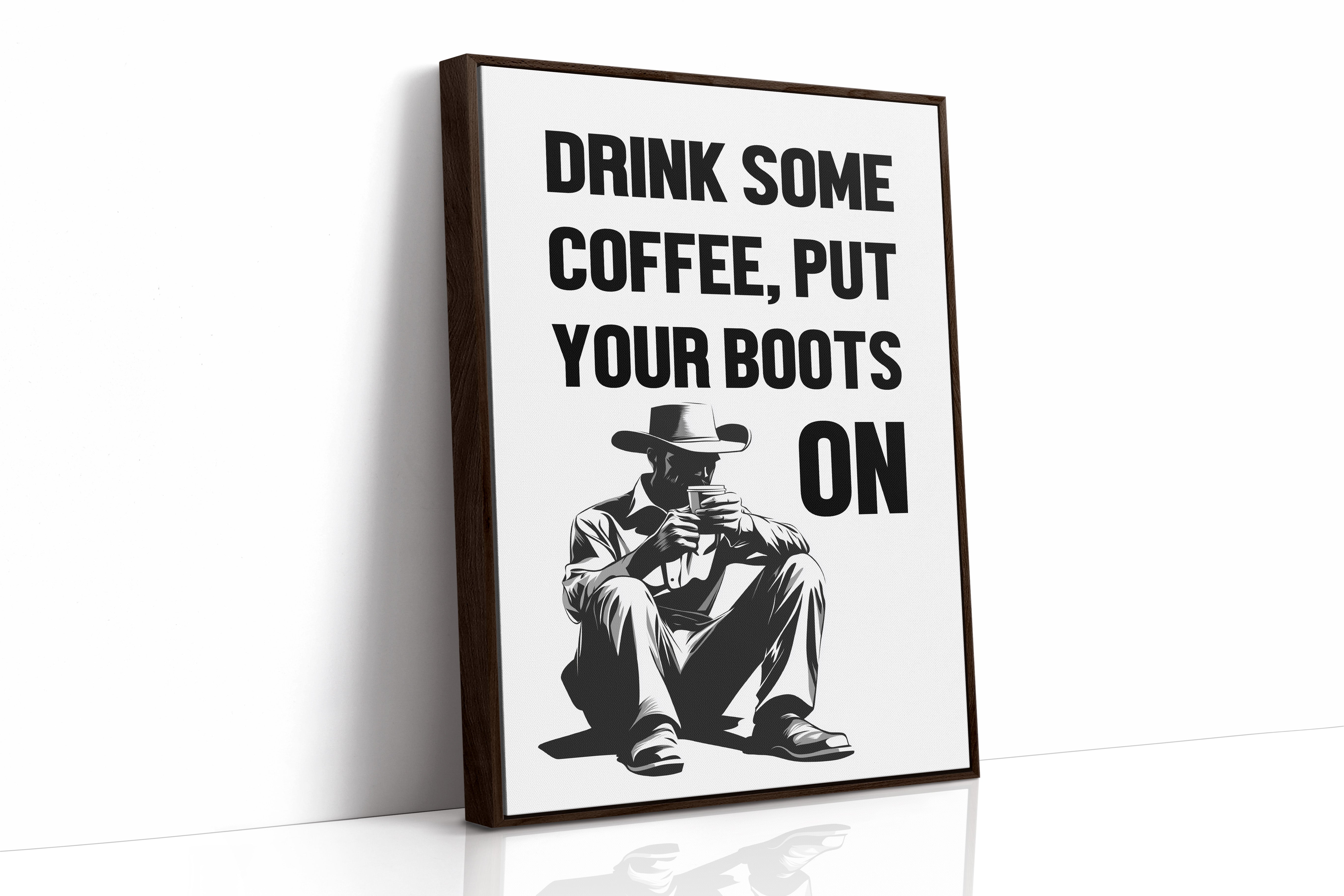 Steam rises like dawn's first breath, mingling with the quiet determination of a new day. This striking monochromatic piece captures the essence of contemporary western minimalism. Against a pristine white background, a lone figure pauses in contemplation, cowboy hat tipped just so, finding sanctuary in that sacred moment between first sip and day's demands. The bold typography and clean lines create a powerful statement about modern ranch life meets coffee culture. This piece commands attention in a kitchen, home office, or coffee bar, bringing both motivation and style to your space. Its message serves as a daily reminder that every morning carries the promise of possibility.