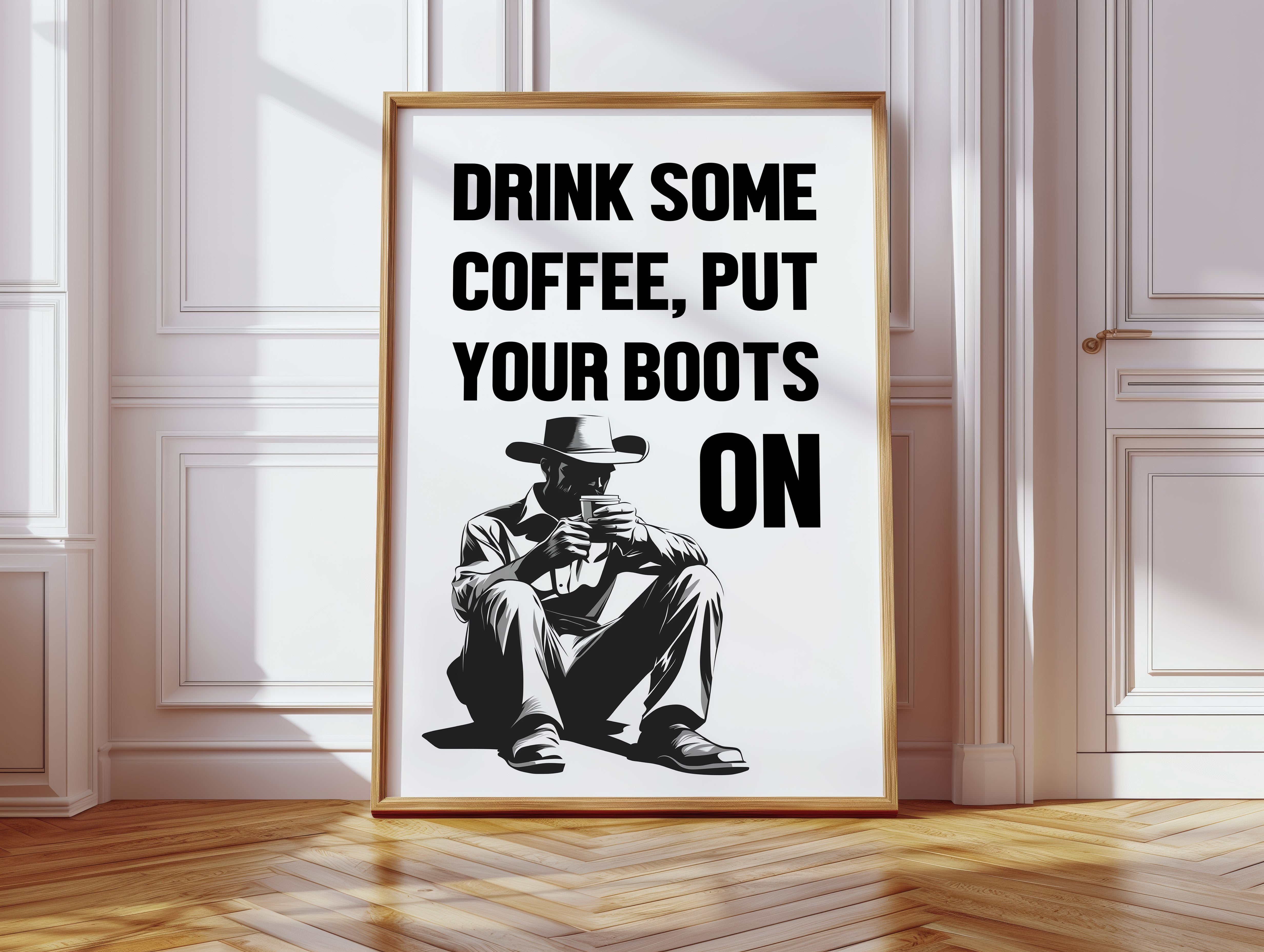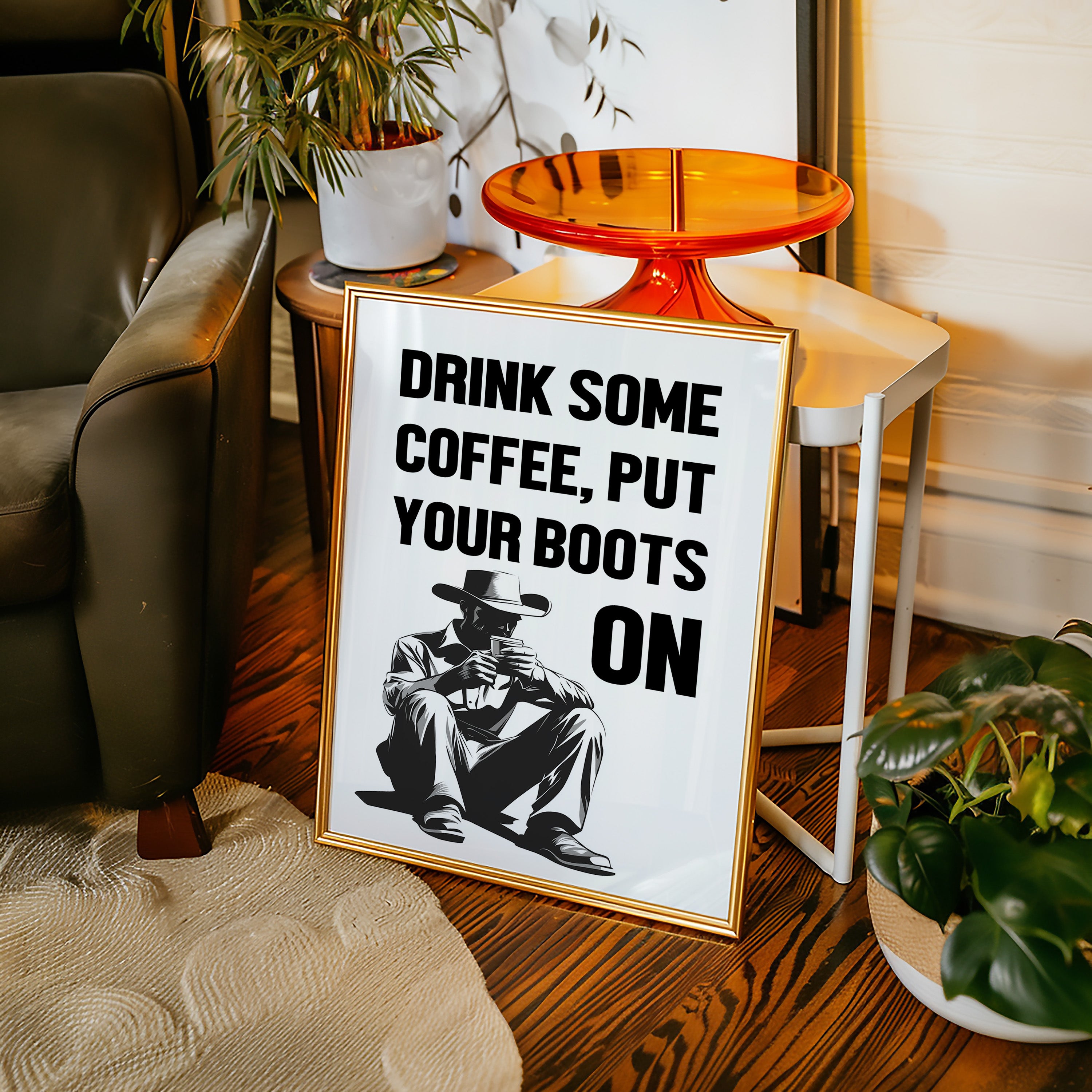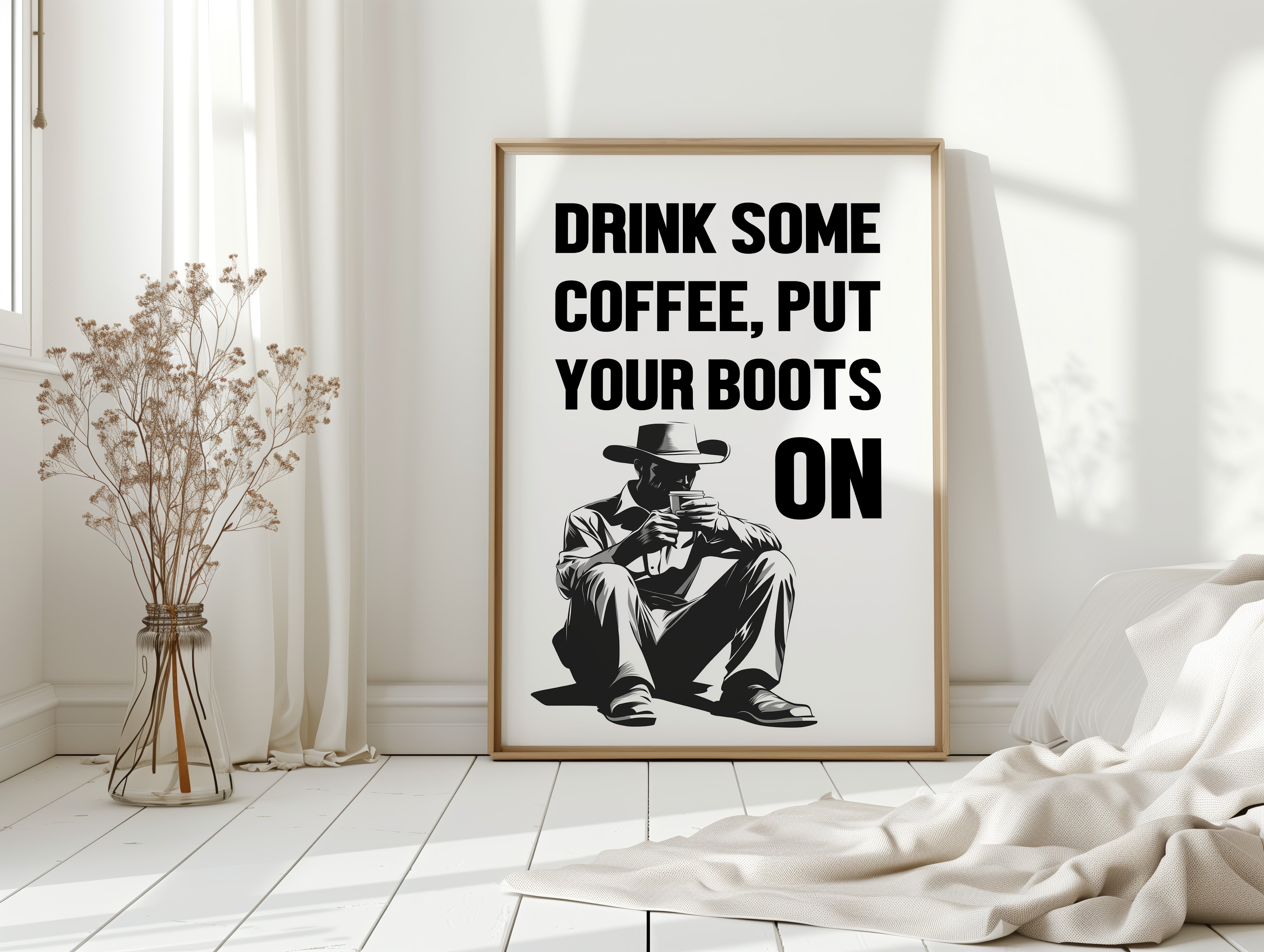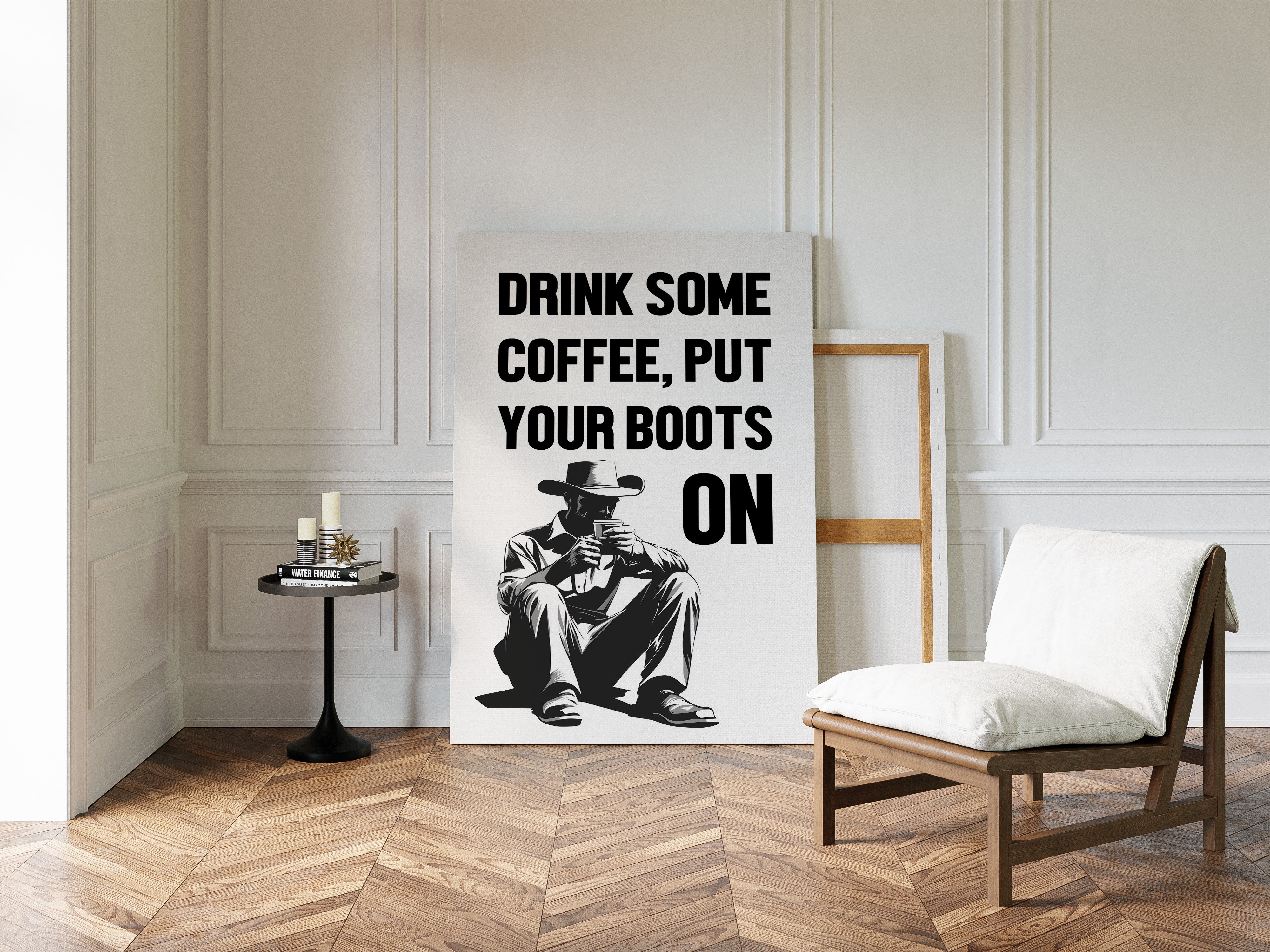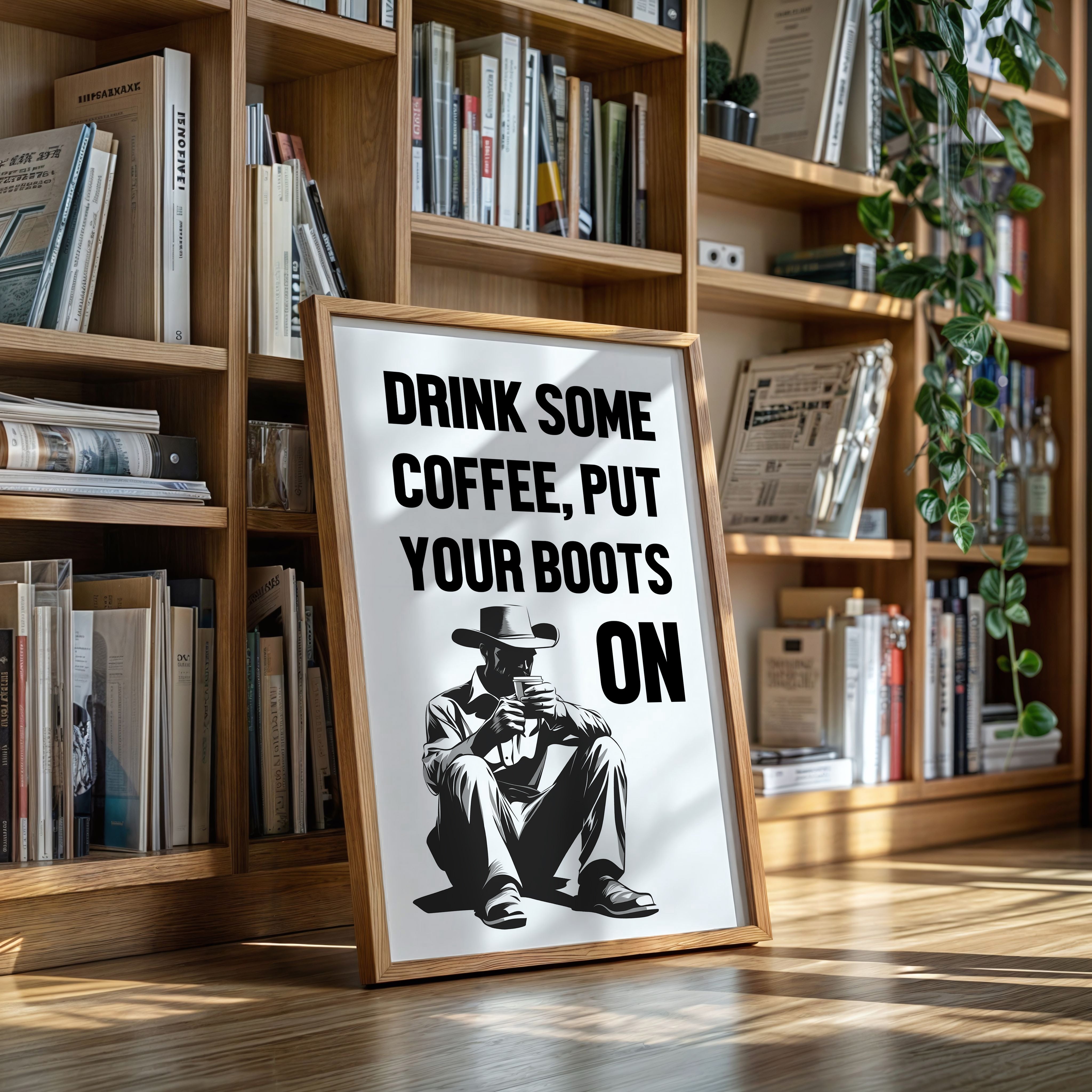 Steam rises like dawn's first breath, mingling with the quiet determination of a new day. This striking monochromatic piece captures the essence of contemporary western minimalism. Against a pristine white background, a lone figure pauses in contemplation, cowboy hat tipped just so, finding sanctuary in that sacred moment between first sip and day's demands. The bold typography and clean lines create a powerful statement about modern ranch life meets coffee culture. This piece commands attention in a kitchen, home office, or coffee bar, bringing both motivation and style to your space. Its message serves as a daily reminder that every morning carries the promise of possibility.