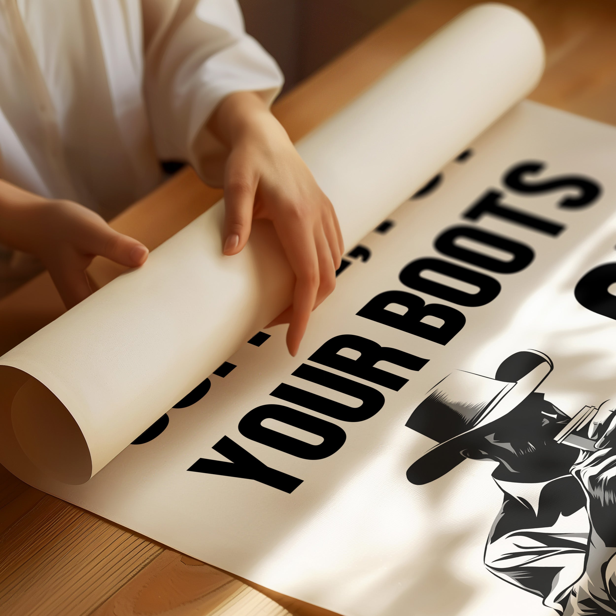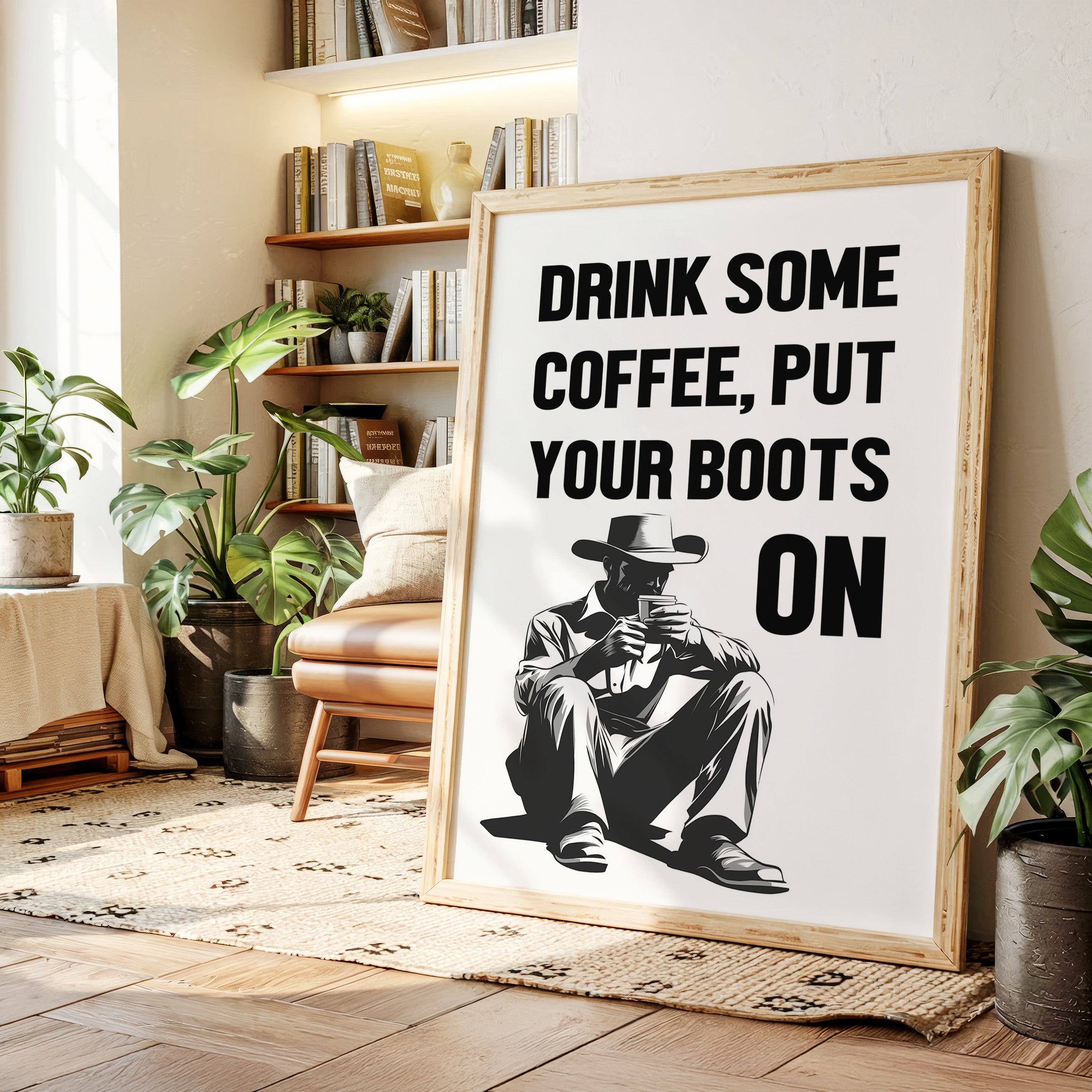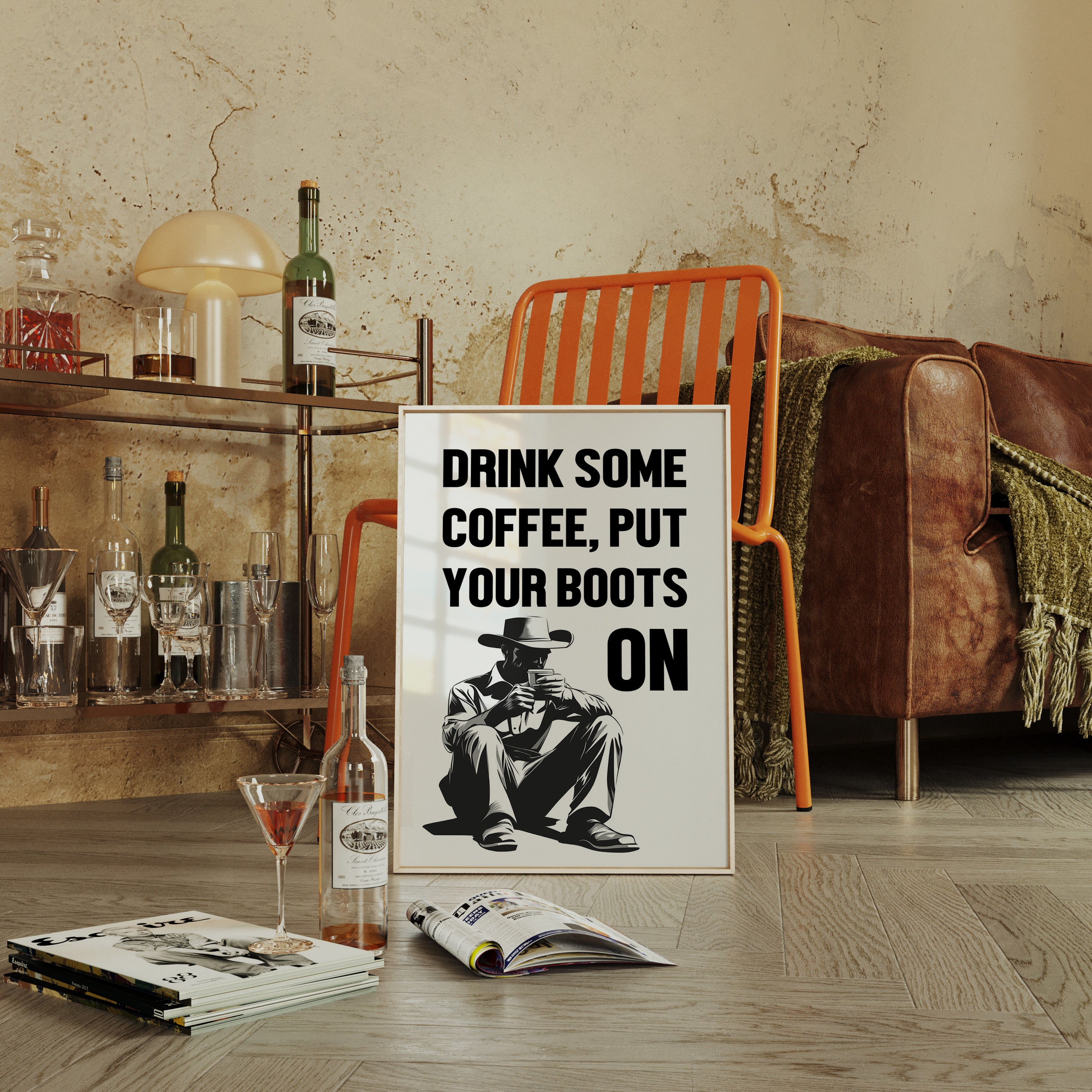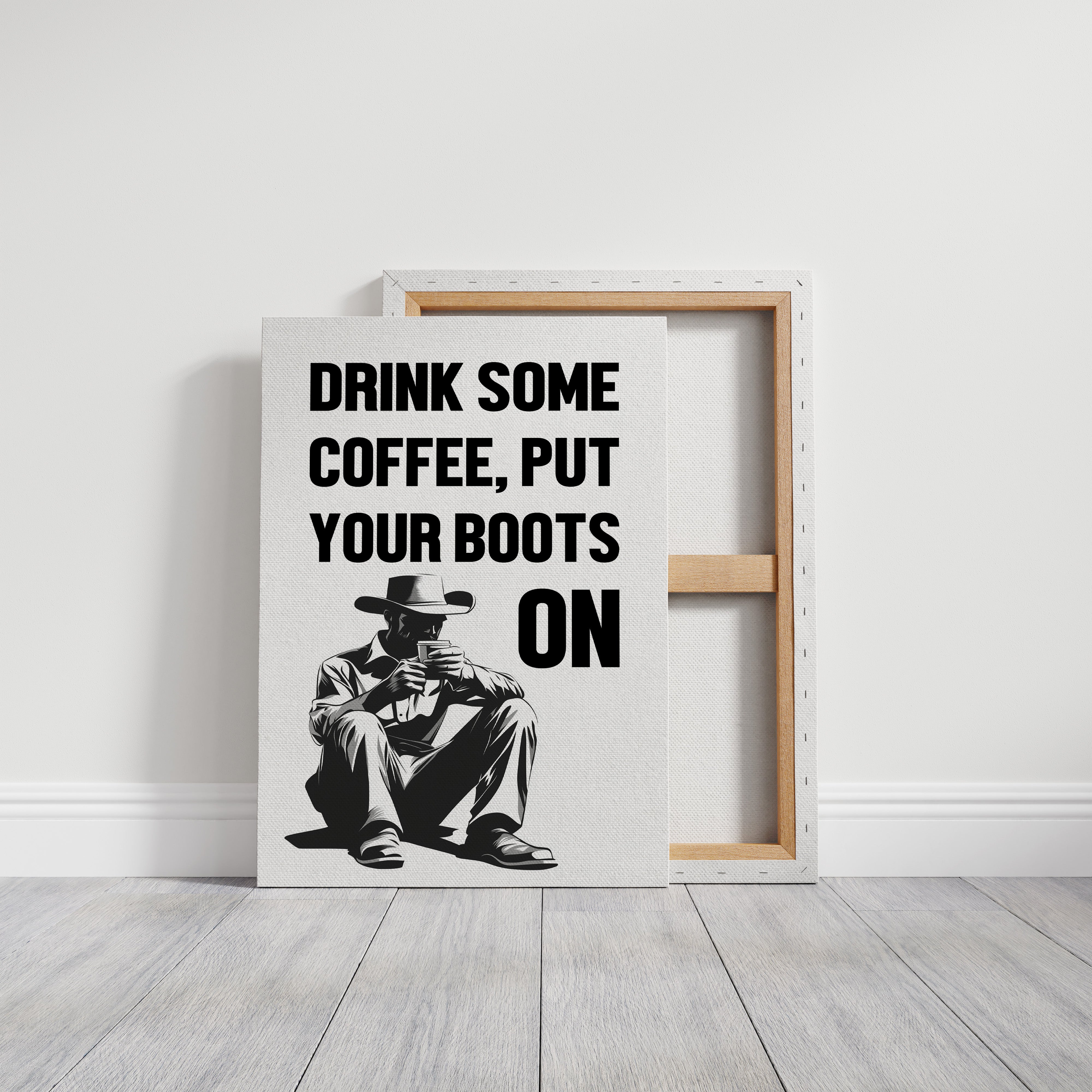 Steam rises like dawn's first breath, mingling with the quiet determination of a new day. This striking monochromatic piece captures the essence of contemporary western minimalism. Against a pristine white background, a lone figure pauses in contemplation, cowboy hat tipped just so, finding sanctuary in that sacred moment between first sip and day's demands. The bold typography and clean lines create a powerful statement about modern ranch life meets coffee culture. This piece commands attention in a kitchen, home office, or coffee bar, bringing both motivation and style to your space. Its message serves as a daily reminder that every morning carries the promise of possibility.