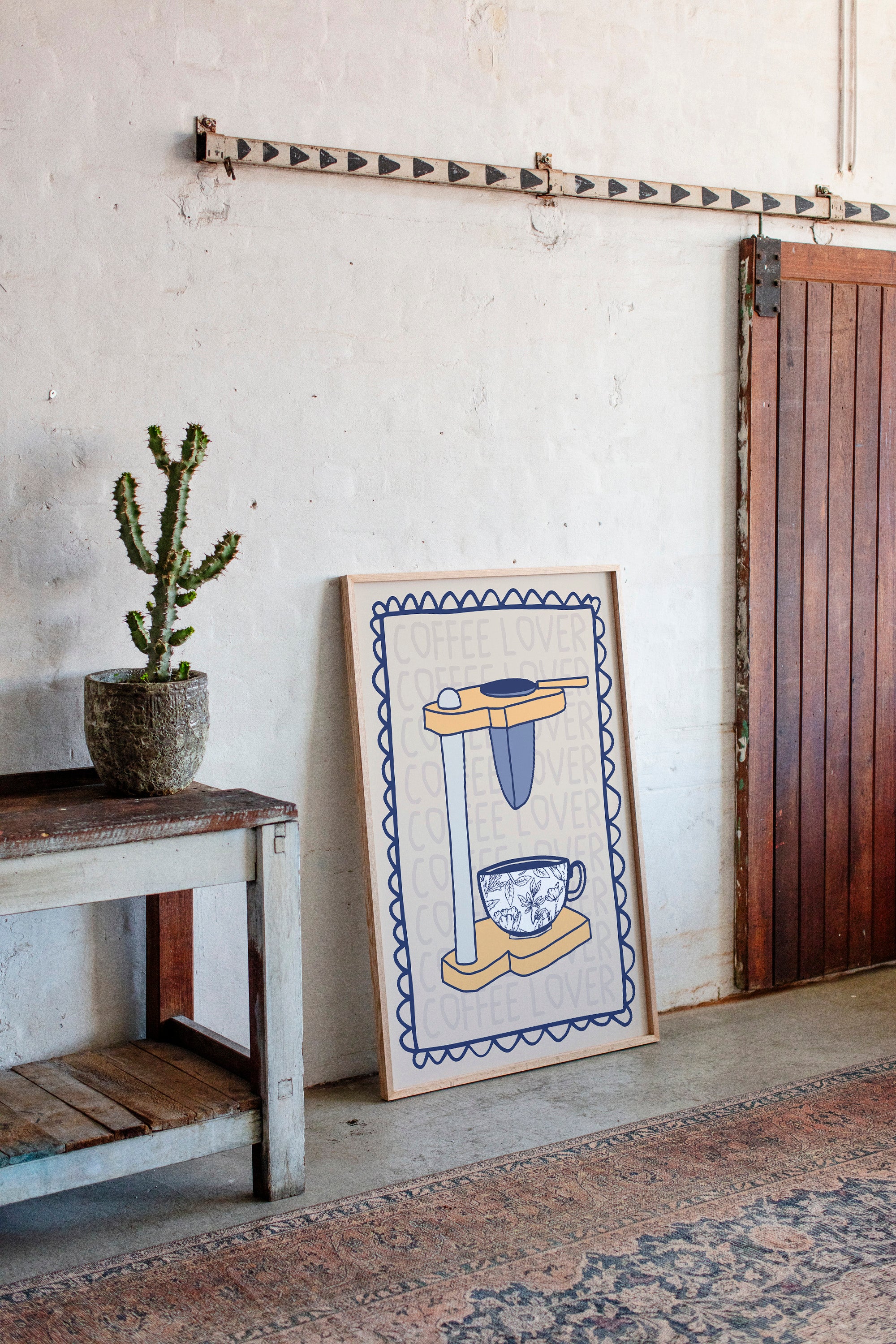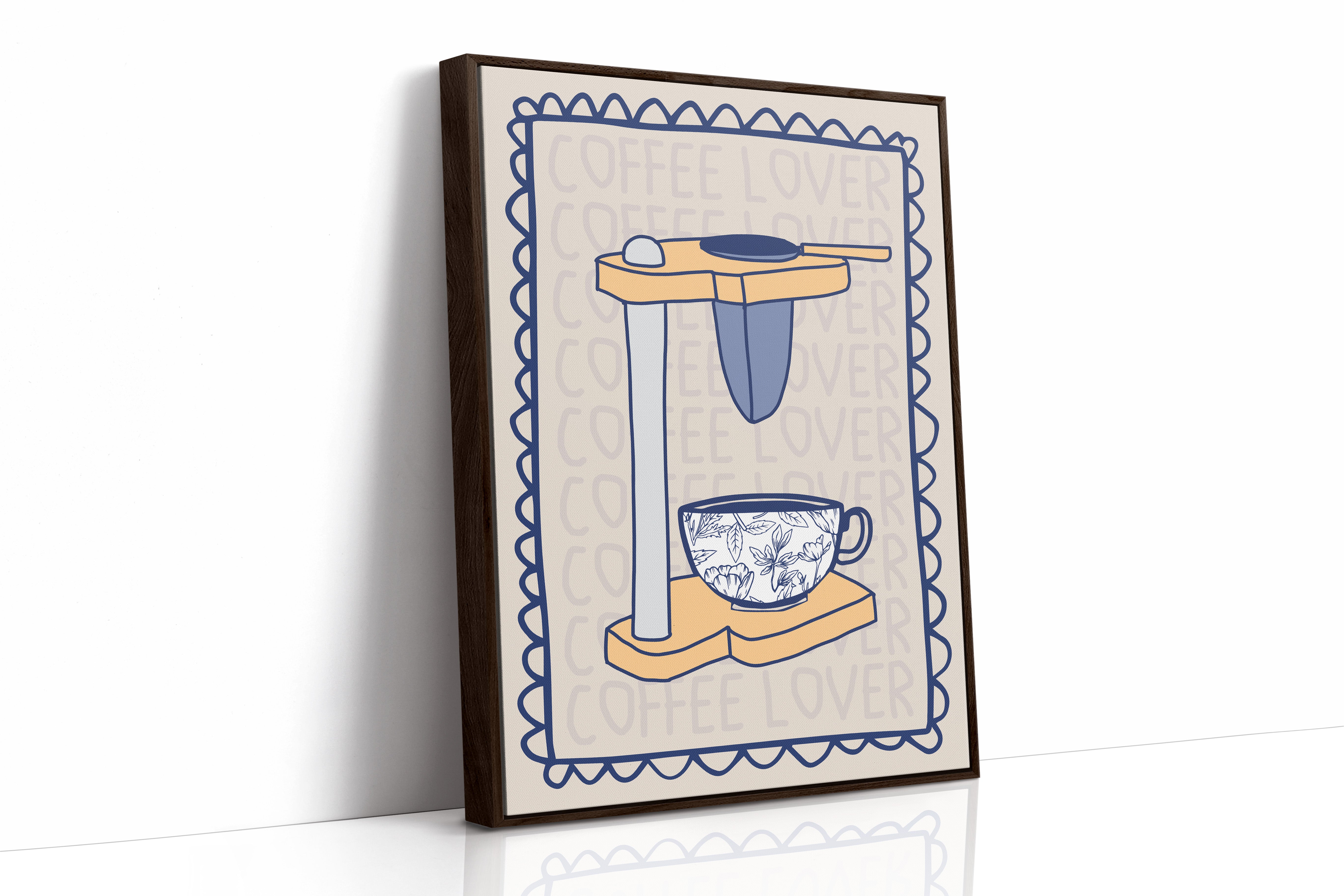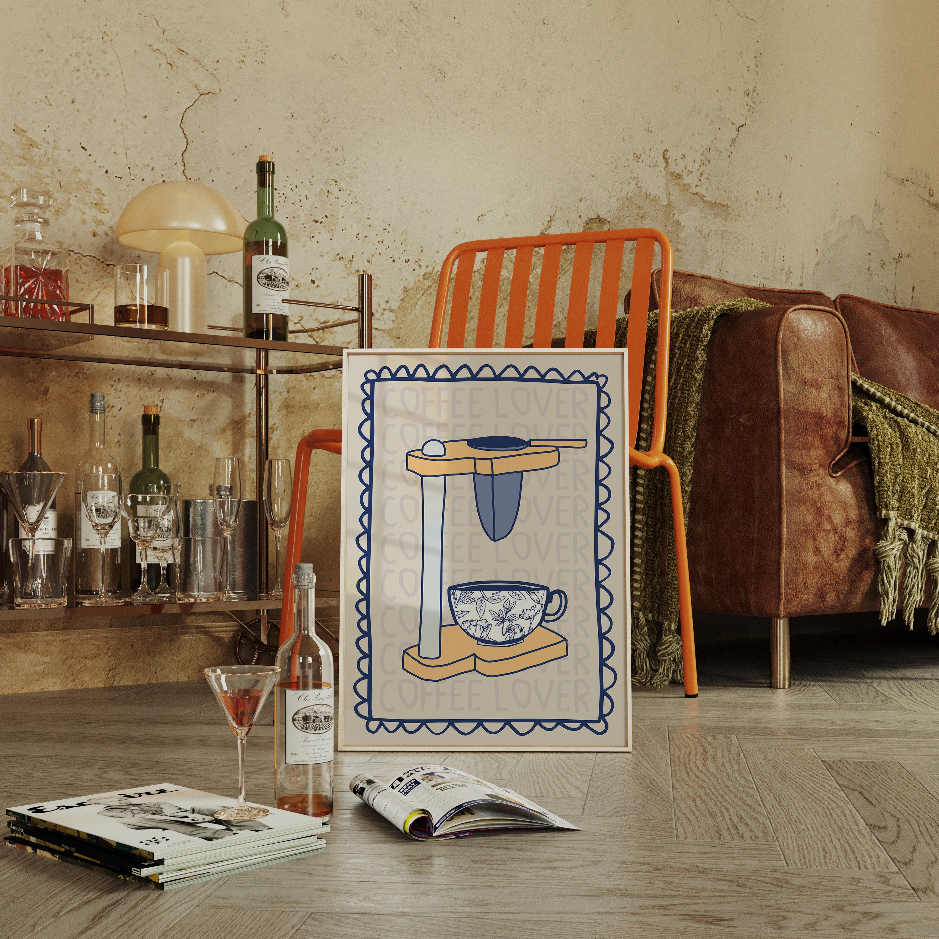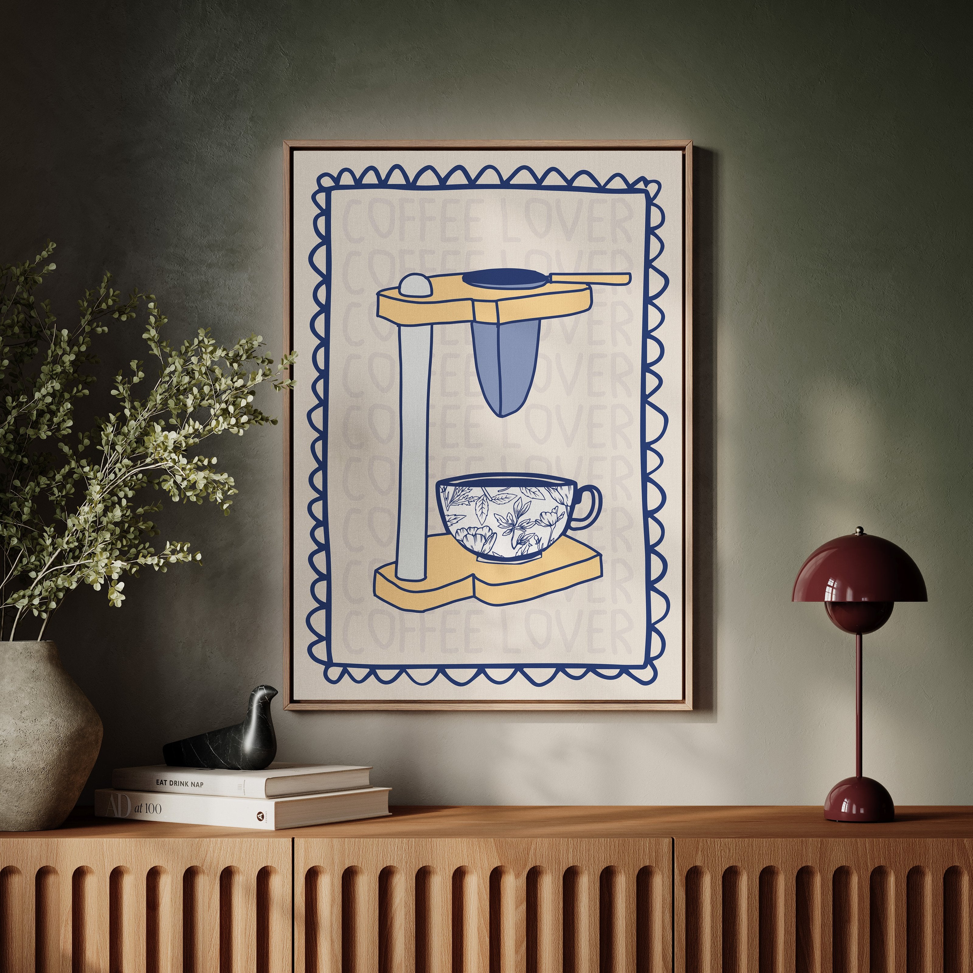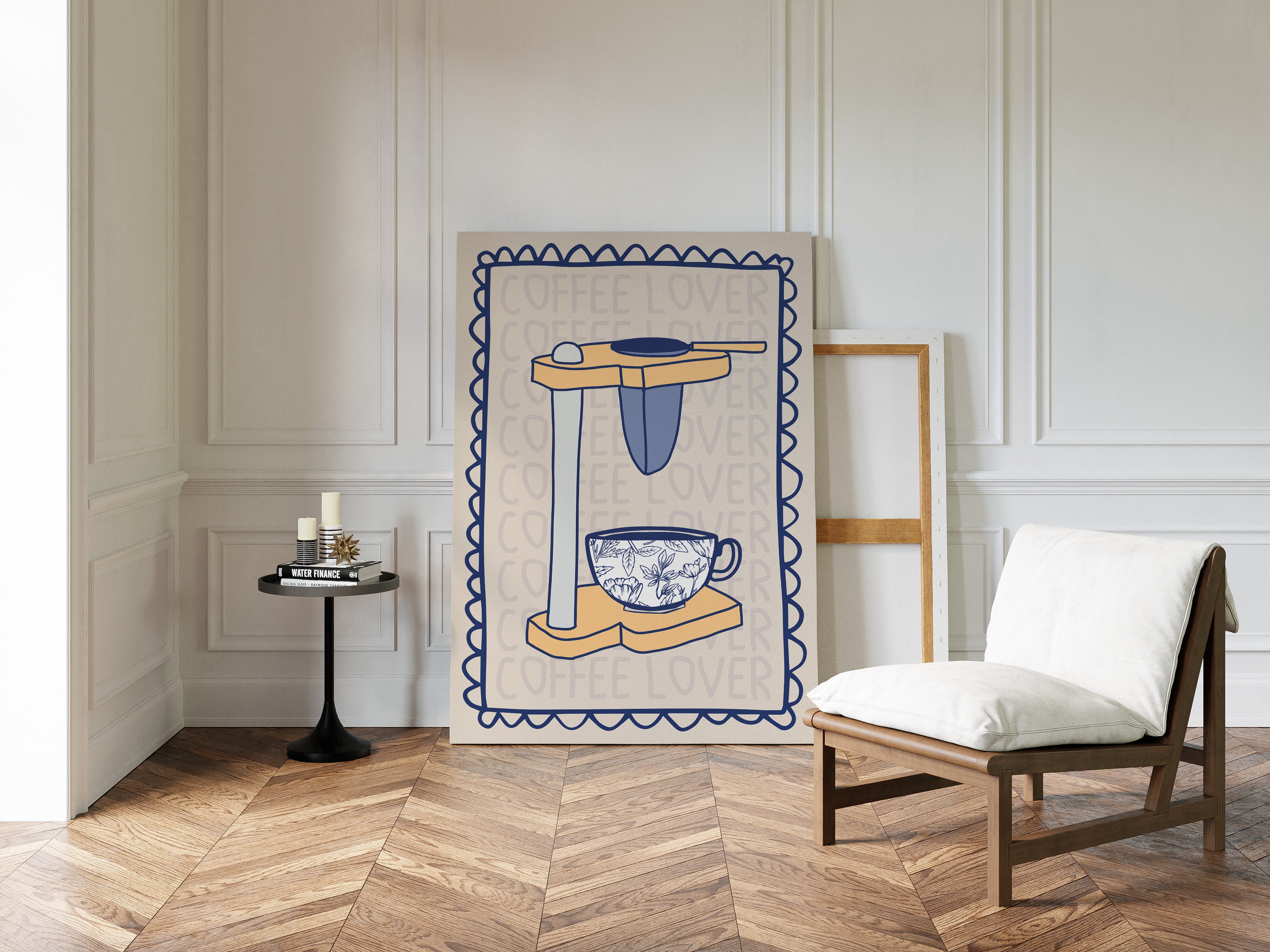Steam rises gently from a delicately patterned cup, promising the first sacred sip of day. This piece from our Contemporary collection celebrates the cherished ritual of coffee preparation with clean lines and playful sophistication. The pour-over stand stands like a modern sculpture, while the cup below blooms with intricate botanical patterns in navy and cream, creating a harmonious dance between form and function. The scalloped border frames this daily ceremony like a treasured moment frozen in time. Perfect for adding character to a kitchen nook or bringing a touch of coffee culture charm to a dining area. Each glance reminds us to pause and savor life's simple pleasures.