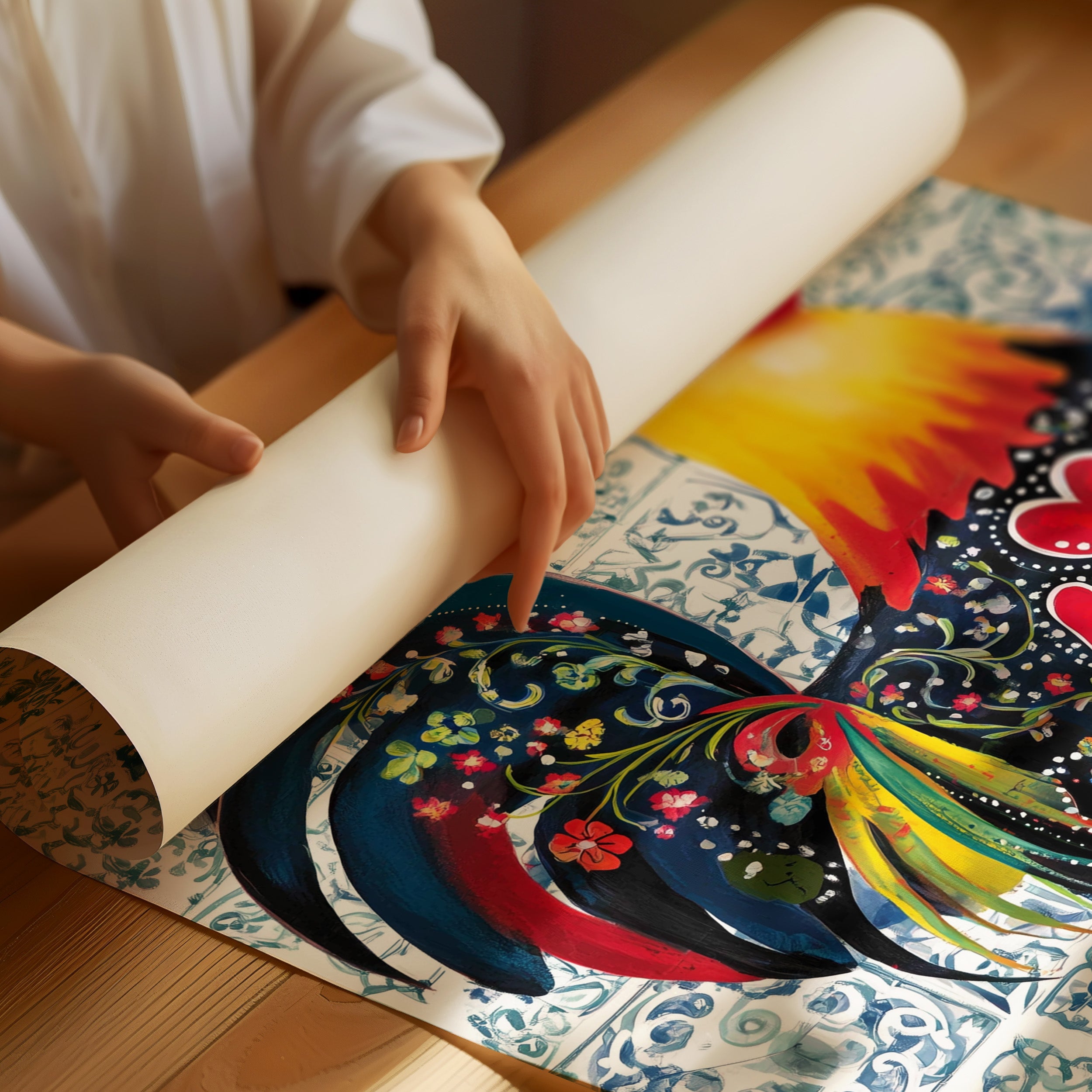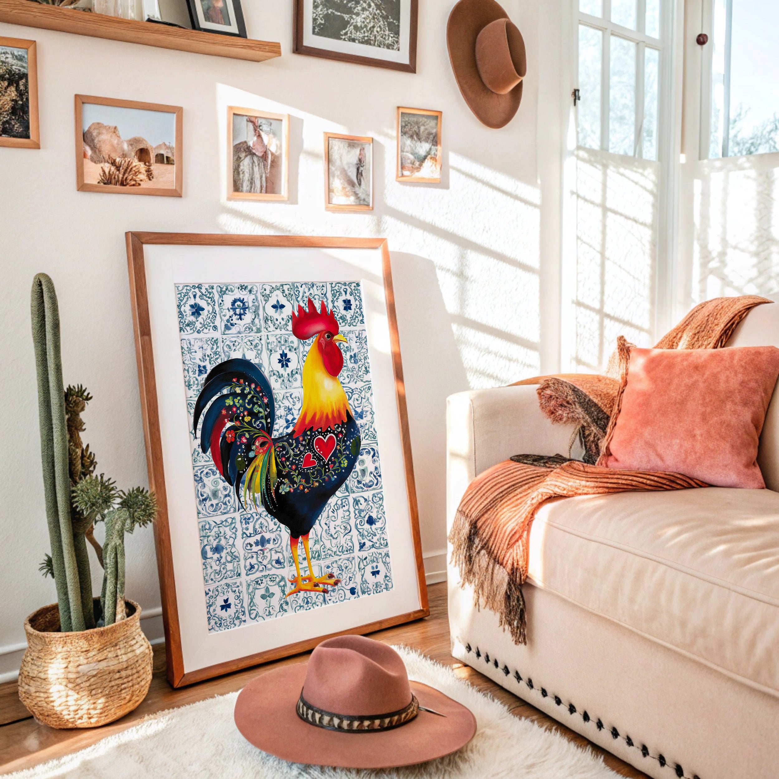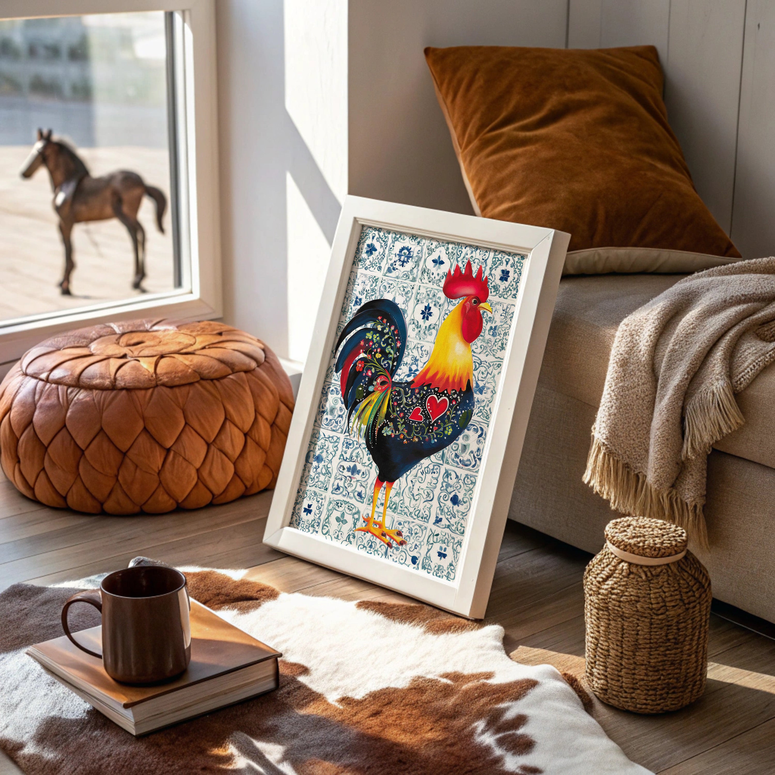 A vibrant rooster struts against a backdrop of delicate blue and white Portuguese-inspired tiles, his feathers a symphony of folk art patterns and bold colors. The heart motif and intricate floral details woven into his plumage tell a story of traditional charm meeting contemporary design. Rich navy blues contrast beautifully with fiery reds and sunny yellows, while the decorative tile pattern creates a harmonious frame for this proud farmyard king. This piece brings warmth and character to modern farmhouse kitchens, breakfast nooks, or any space seeking a touch of rustic European flair.