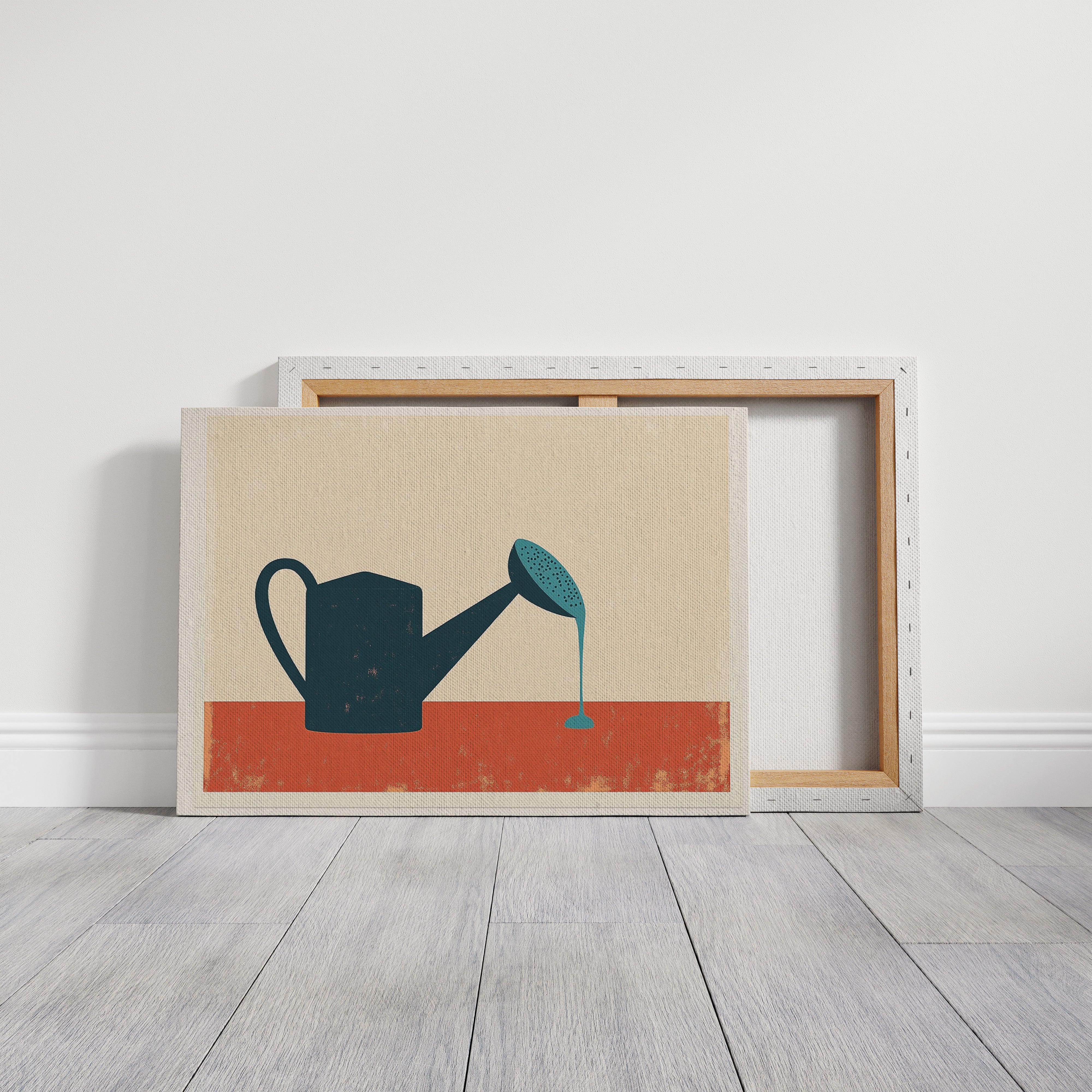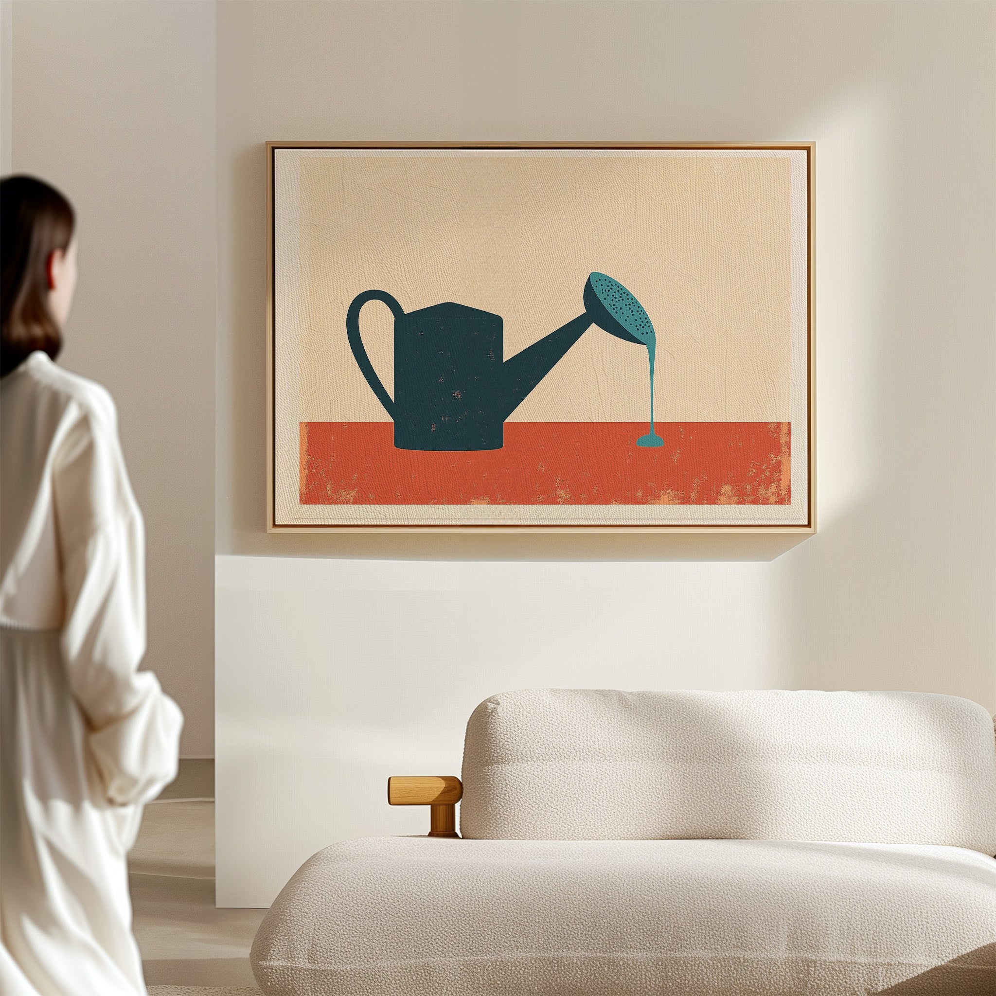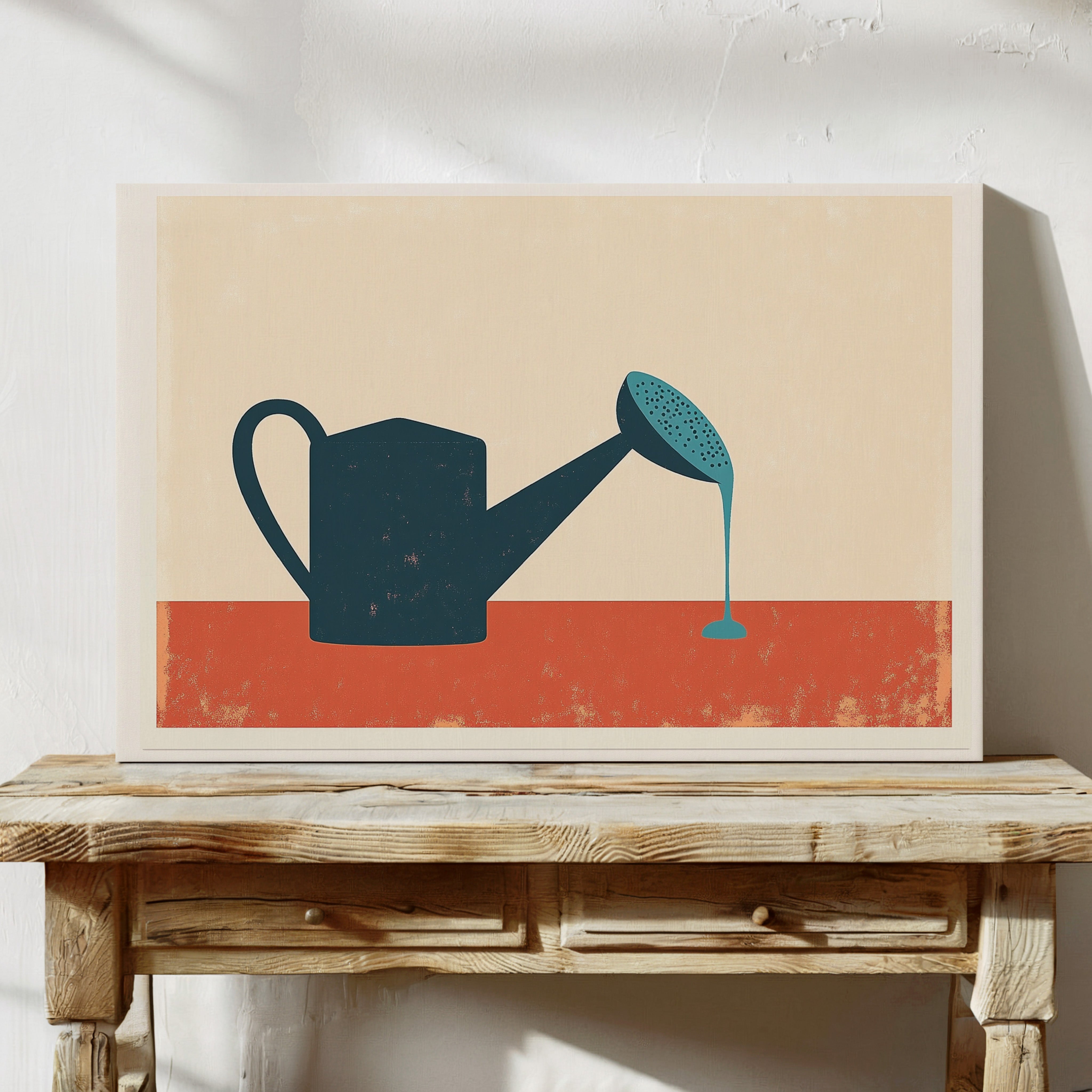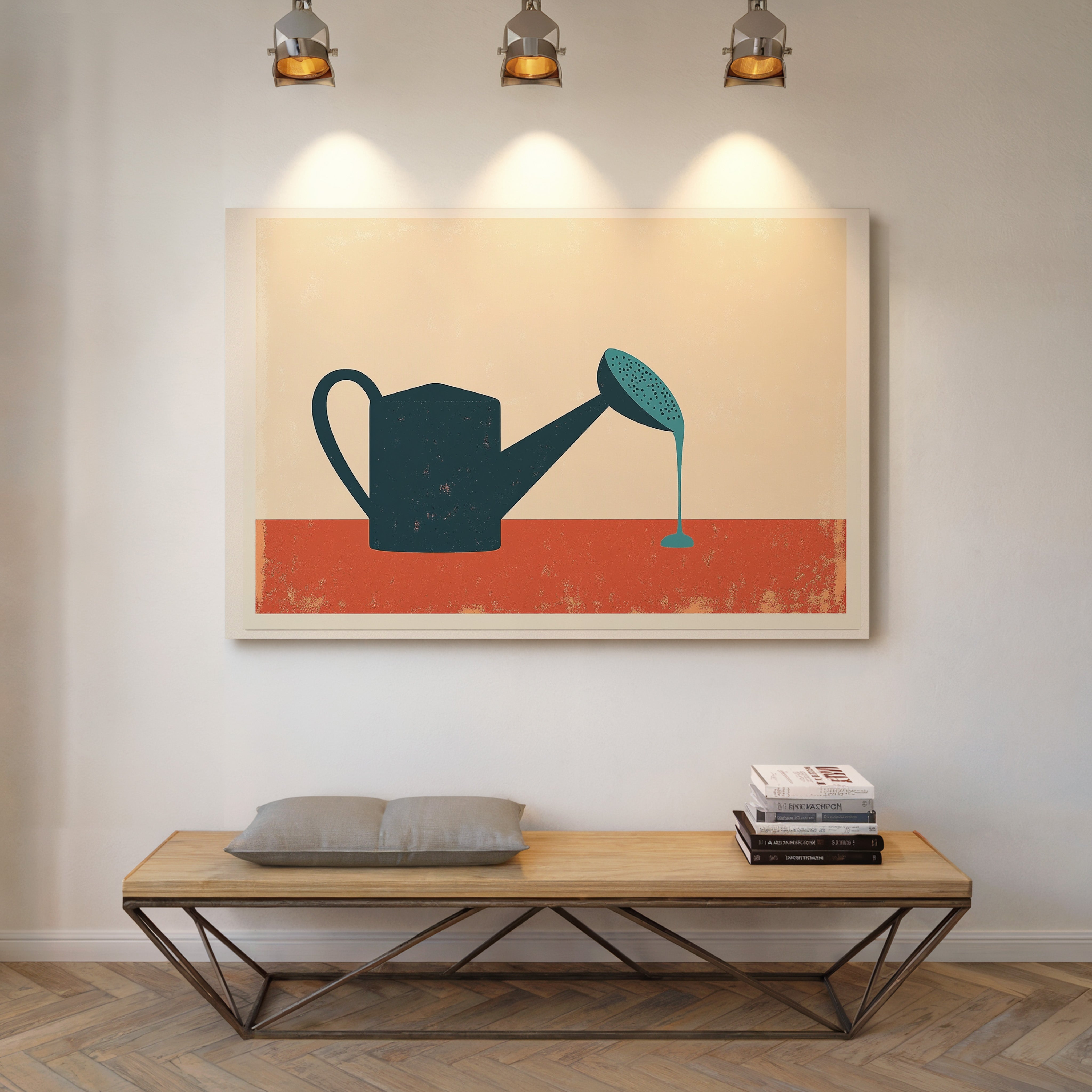 A simple yet profound moment captured in teal and coral tones, where a watering can performs its daily ritual. The minimalist composition speaks of quiet mornings and gentle beginnings, with its clean lines and purposeful design creating a sense of zen-like tranquility. The textured background adds warmth while the streaming water creates a lyrical element, suggesting movement and life in this otherwise still scene. This contemporary piece would bring a touch of mindful simplicity to a modern kitchen, breakfast nook, or any space where quiet contemplation meets daily ritual.