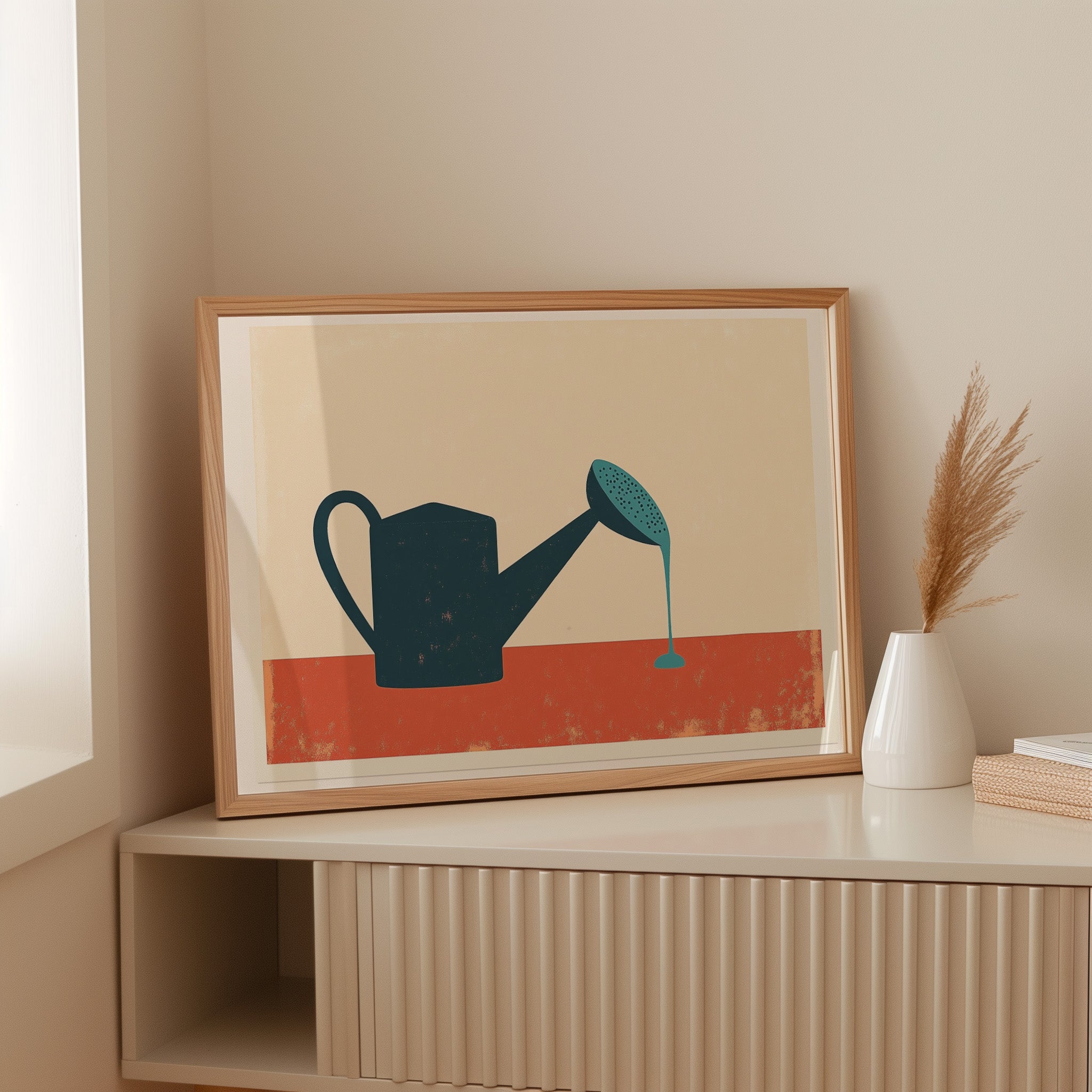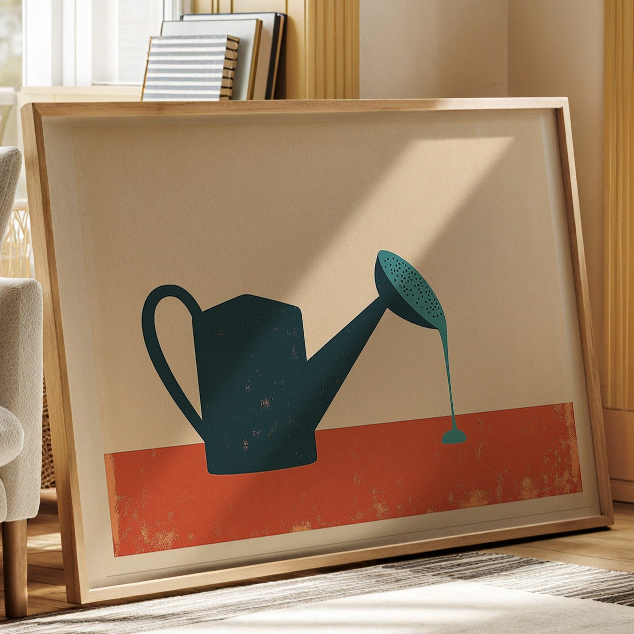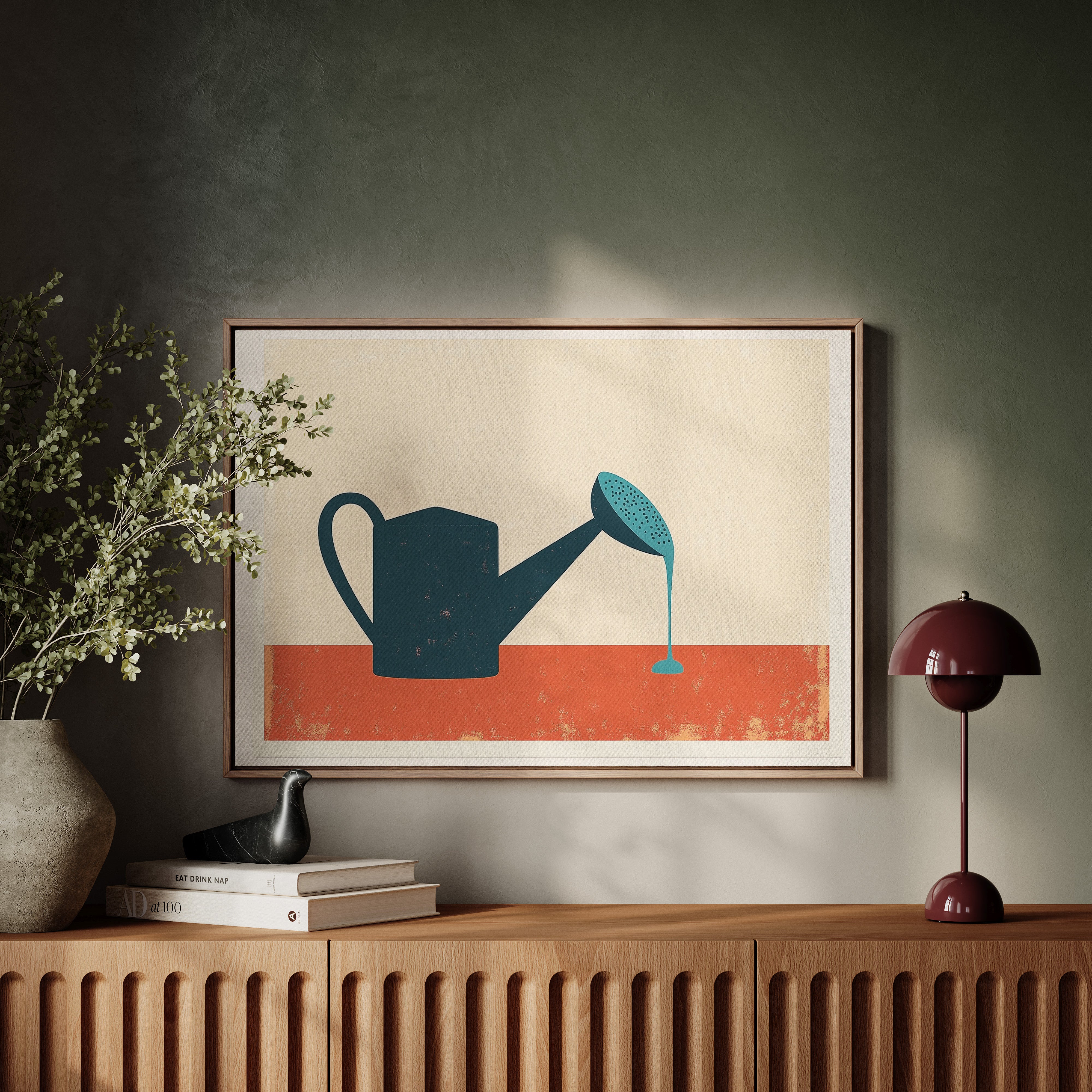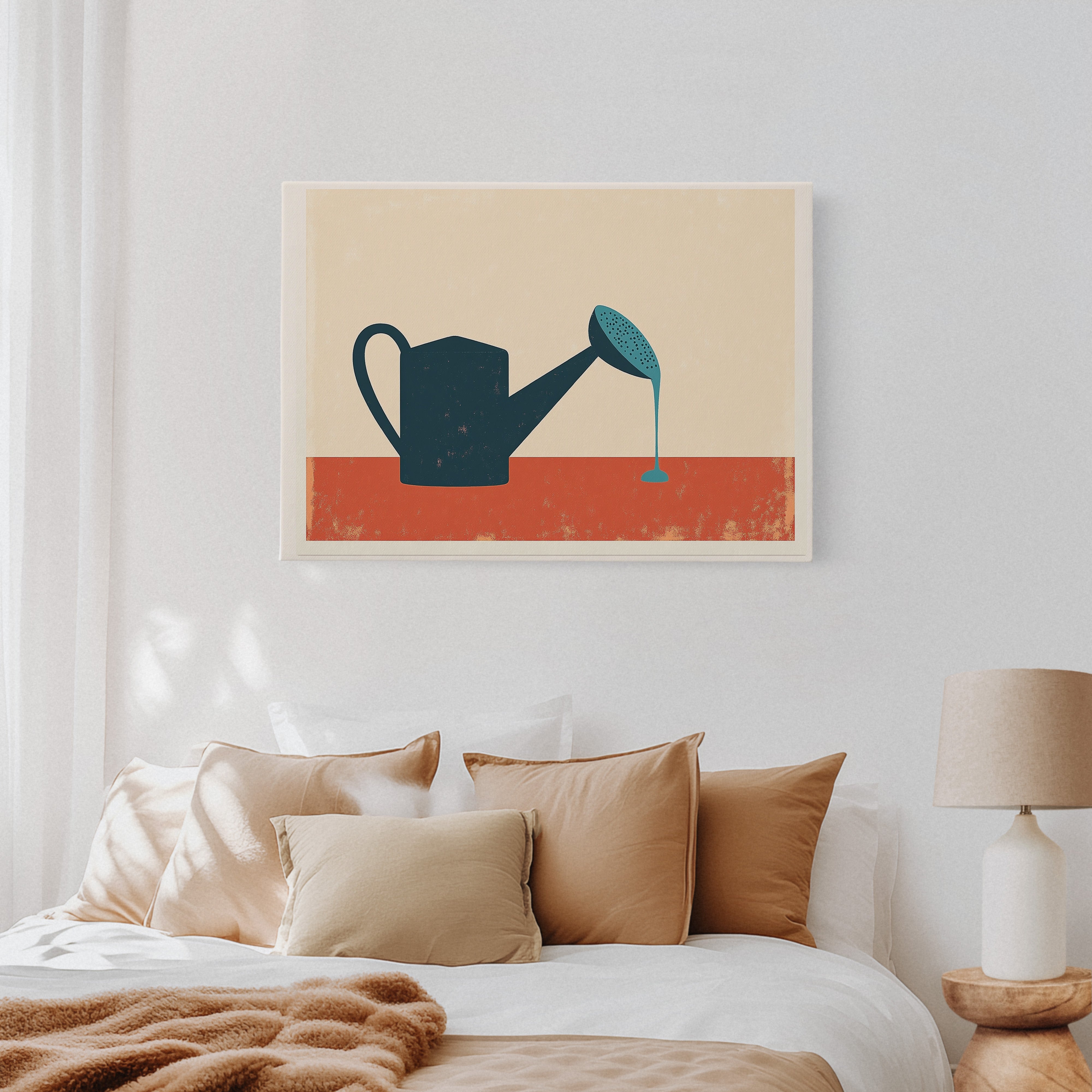 A simple yet profound moment captured in teal and coral tones, where a watering can performs its daily ritual. The minimalist composition speaks of quiet mornings and gentle beginnings, with its clean lines and purposeful design creating a sense of zen-like tranquility. The textured background adds warmth while the streaming water creates a lyrical element, suggesting movement and life in this otherwise still scene. This contemporary piece would bring a touch of mindful simplicity to a modern kitchen, breakfast nook, or any space where quiet contemplation meets daily ritual.