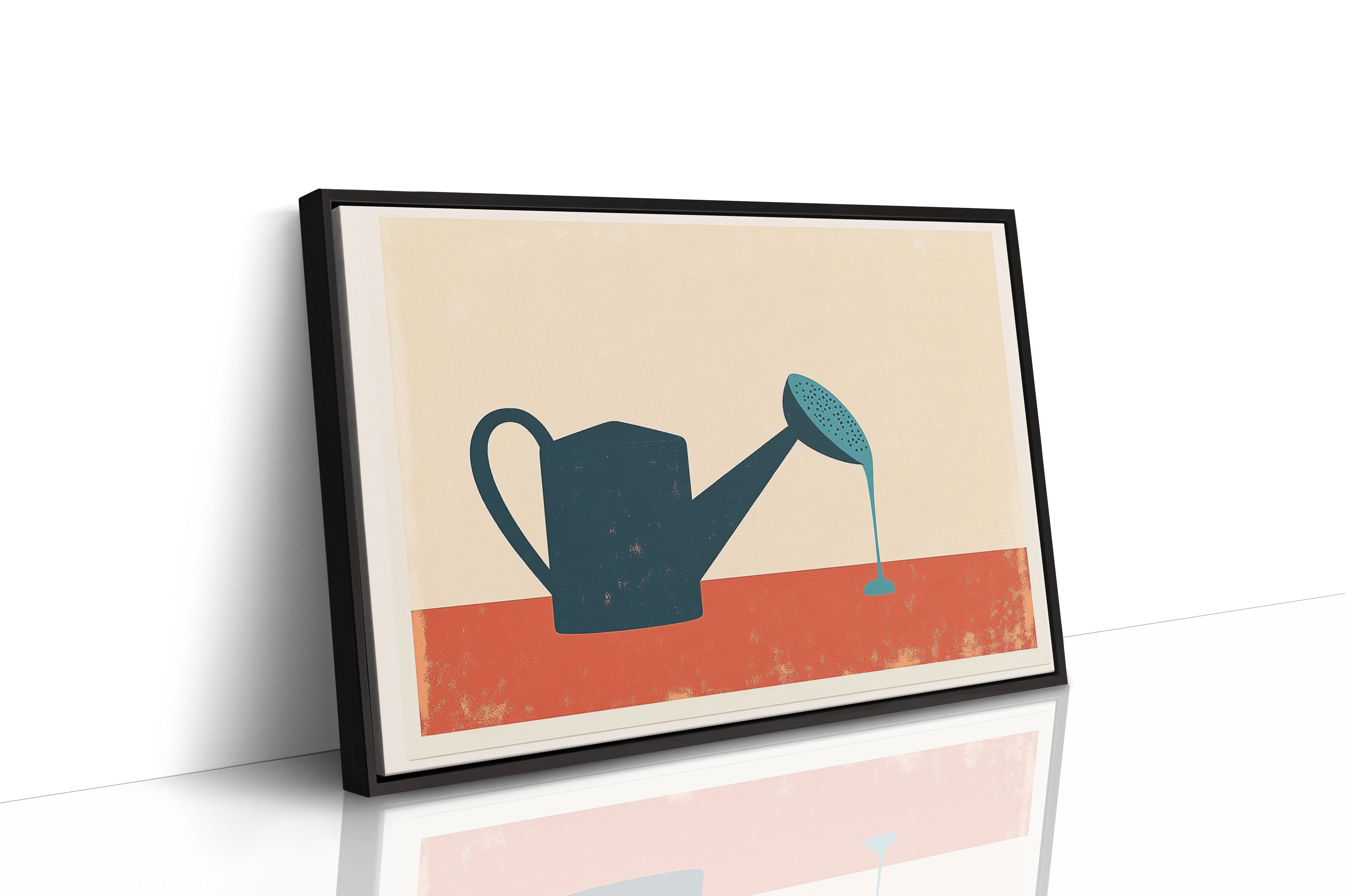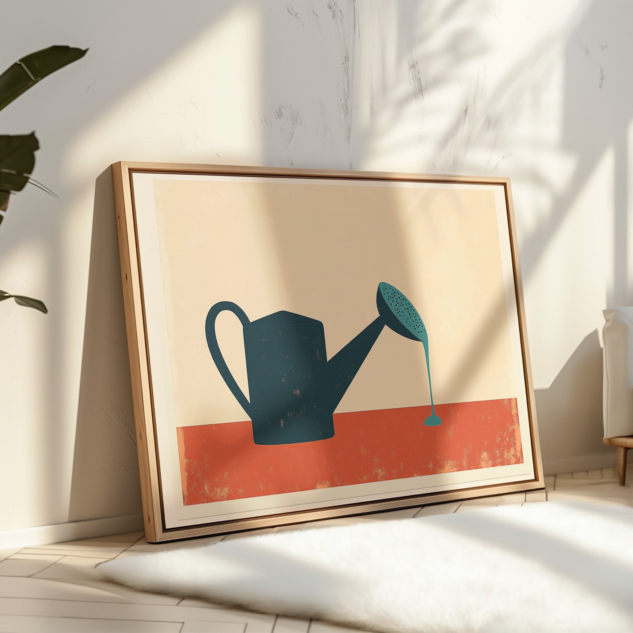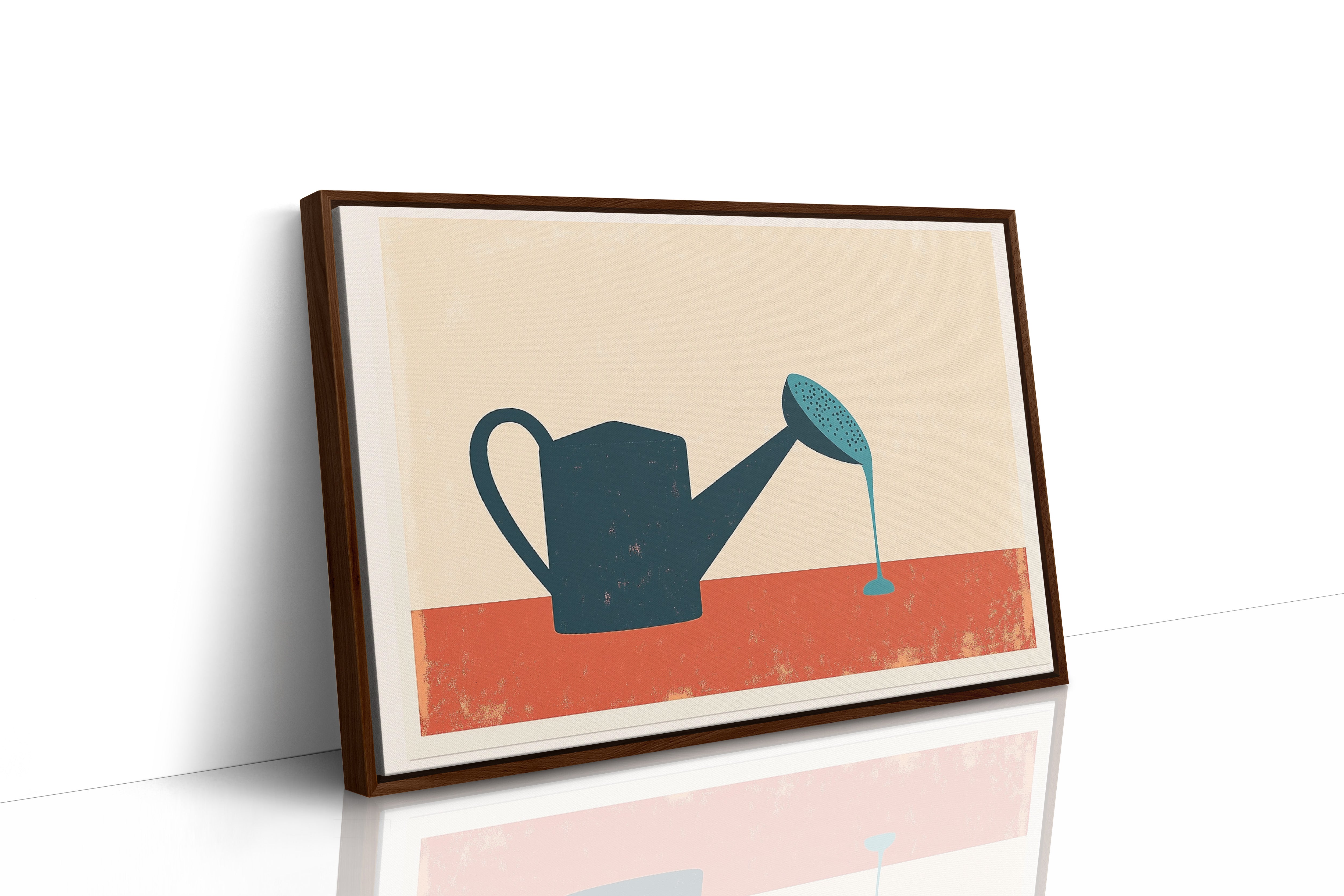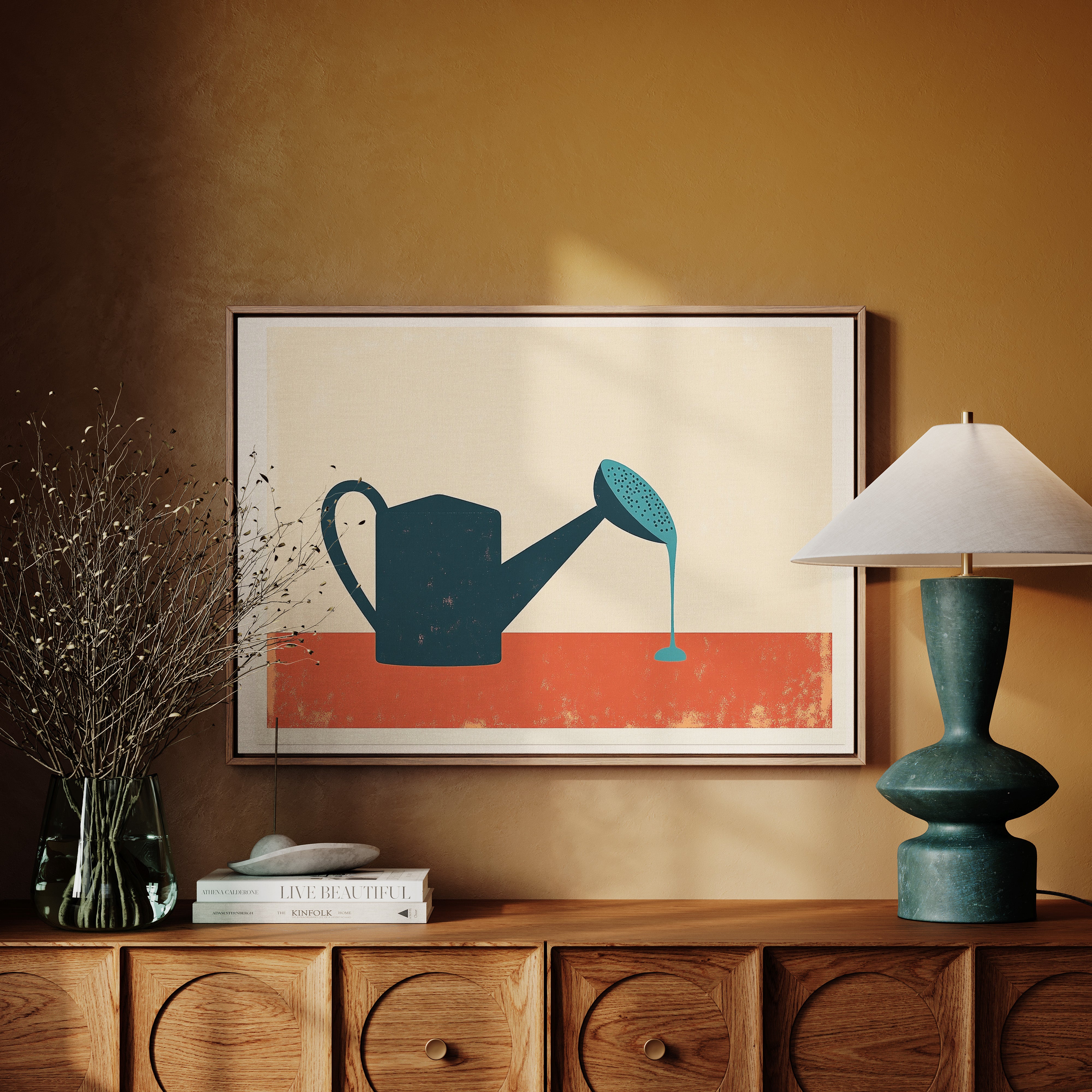A simple yet profound moment captured in teal and coral tones, where a watering can performs its daily ritual. The minimalist composition speaks of quiet mornings and gentle beginnings, with its clean lines and purposeful design creating a sense of zen-like tranquility. The textured background adds warmth while the streaming water creates a lyrical element, suggesting movement and life in this otherwise still scene. This contemporary piece would bring a touch of mindful simplicity to a modern kitchen, breakfast nook, or any space where quiet contemplation meets daily ritual.