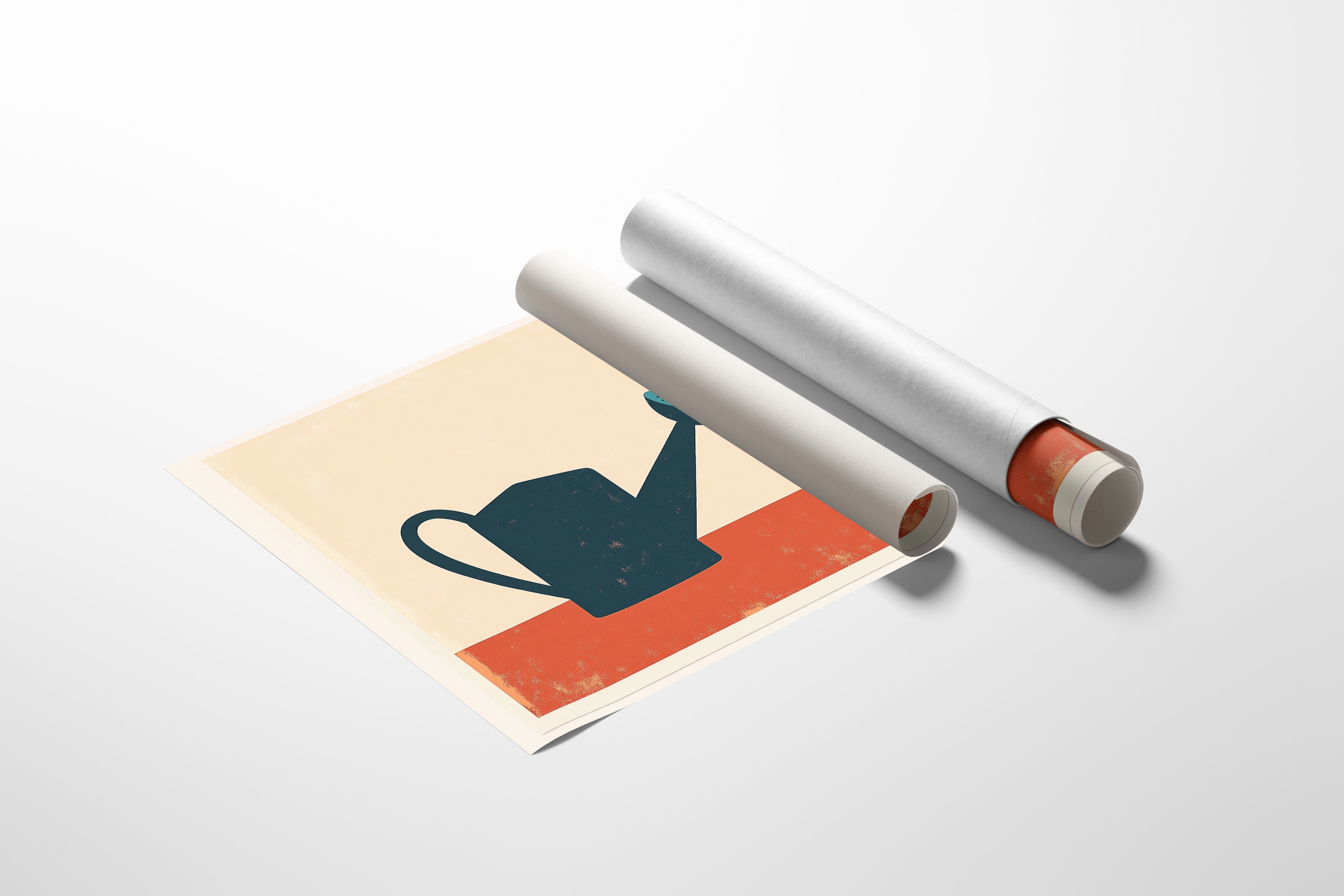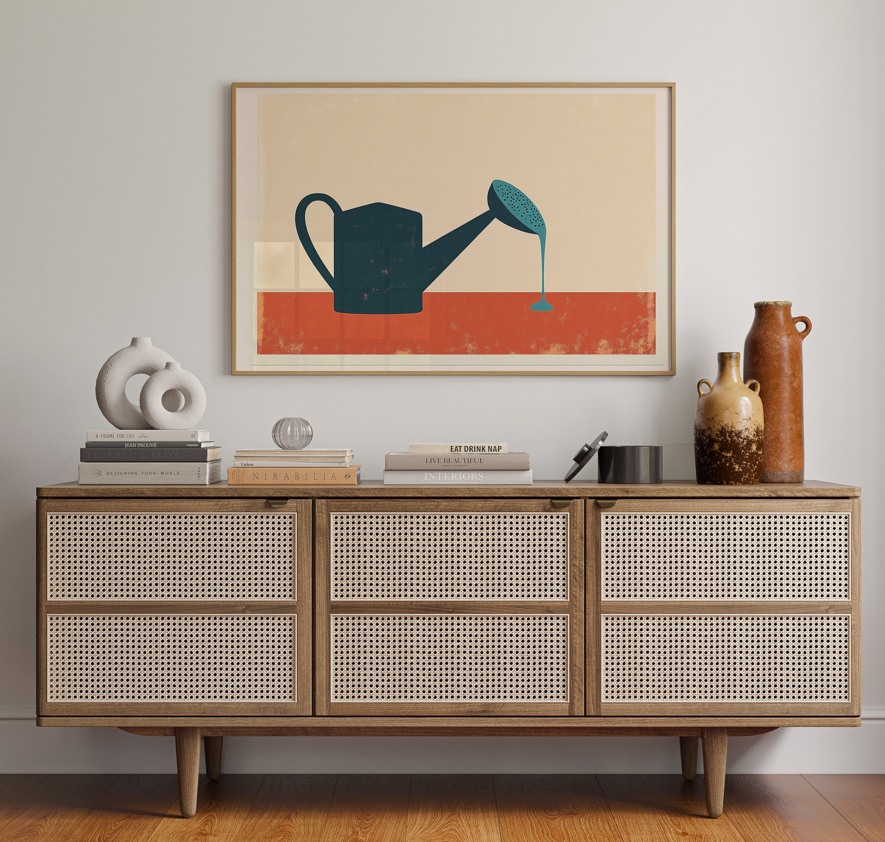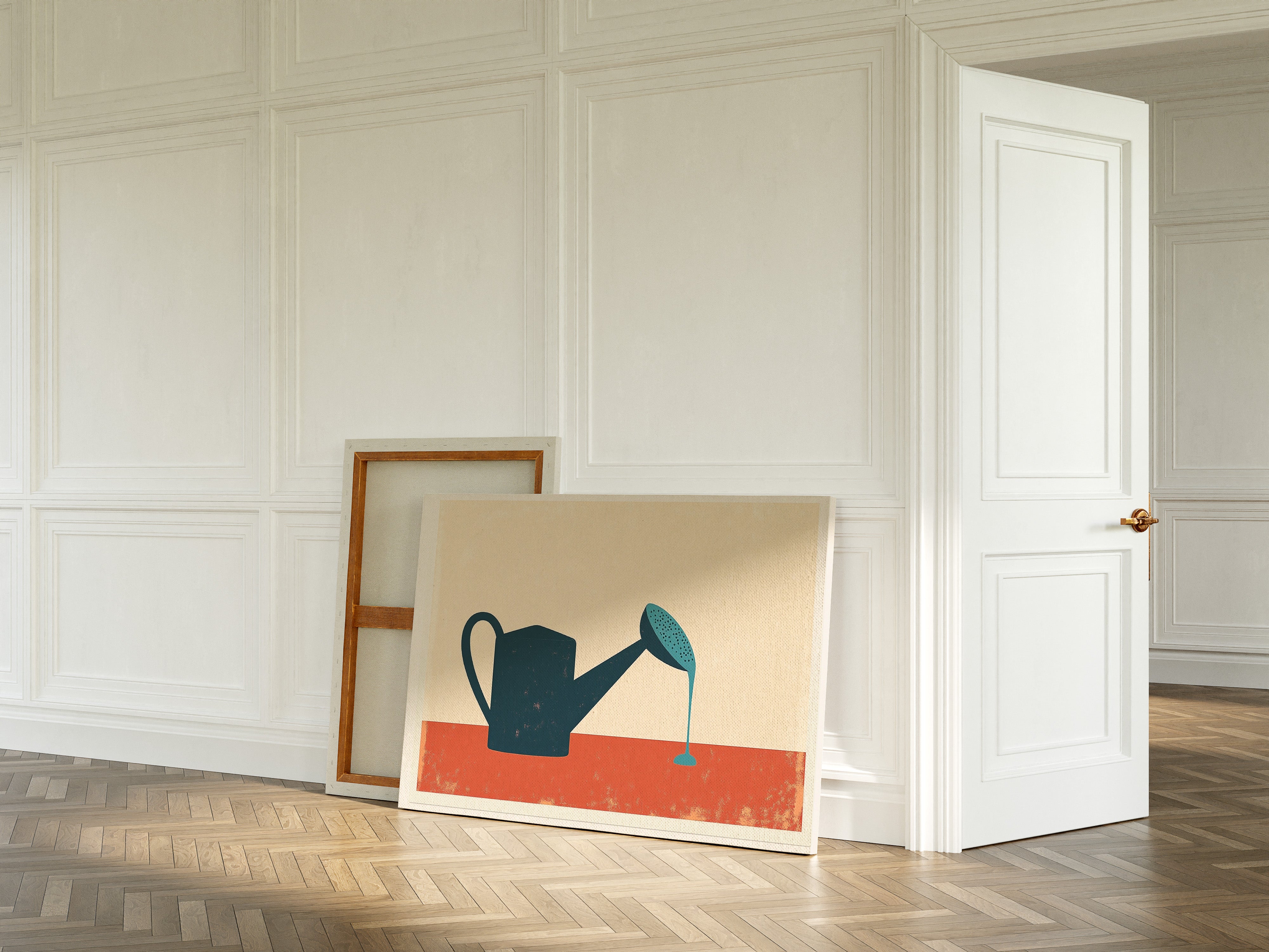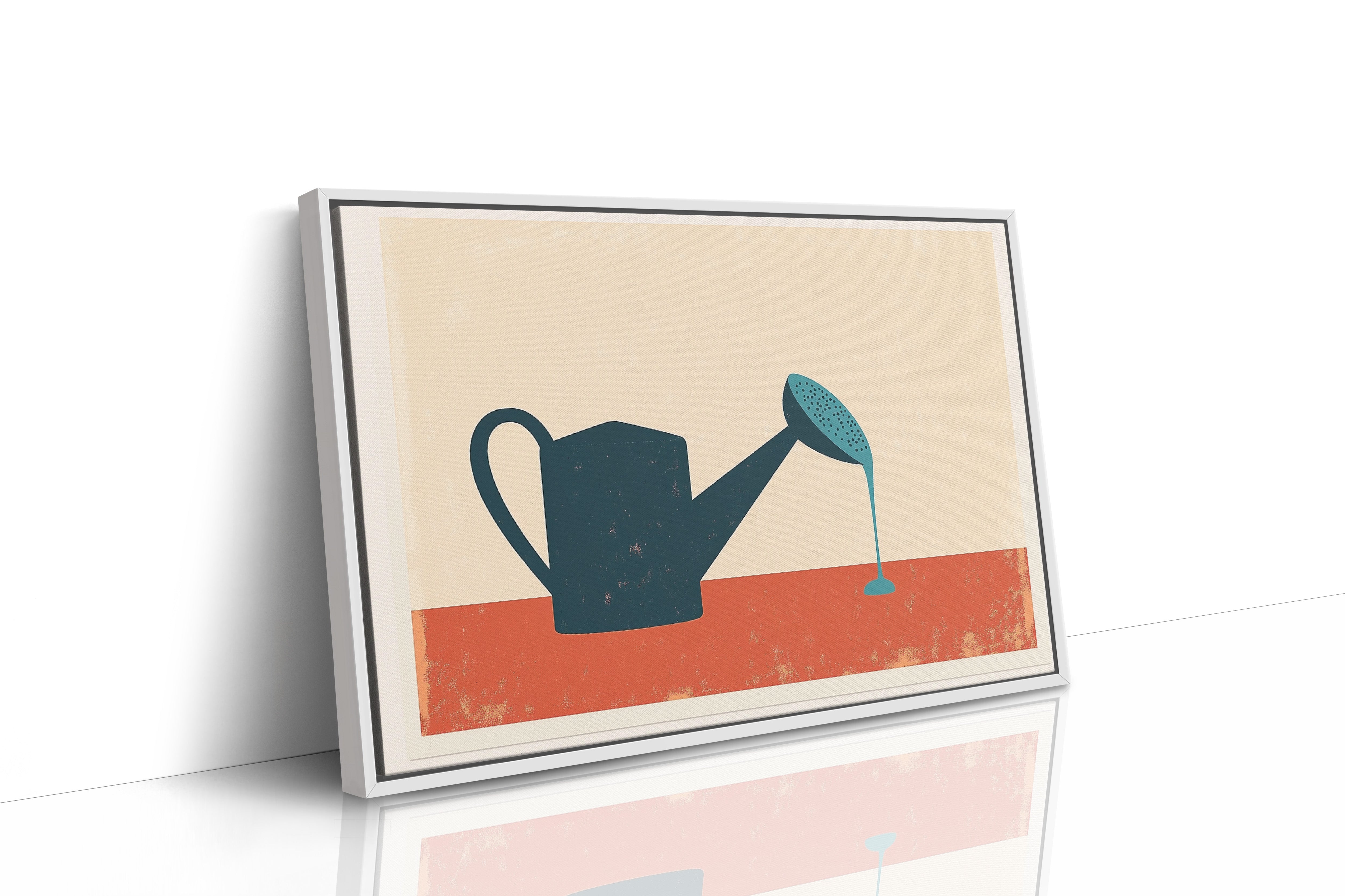 A simple yet profound moment captured in teal and coral tones, where a watering can performs its daily ritual. The minimalist composition speaks of quiet mornings and gentle beginnings, with its clean lines and purposeful design creating a sense of zen-like tranquility. The textured background adds warmth while the streaming water creates a lyrical element, suggesting movement and life in this otherwise still scene. This contemporary piece would bring a touch of mindful simplicity to a modern kitchen, breakfast nook, or any space where quiet contemplation meets daily ritual.