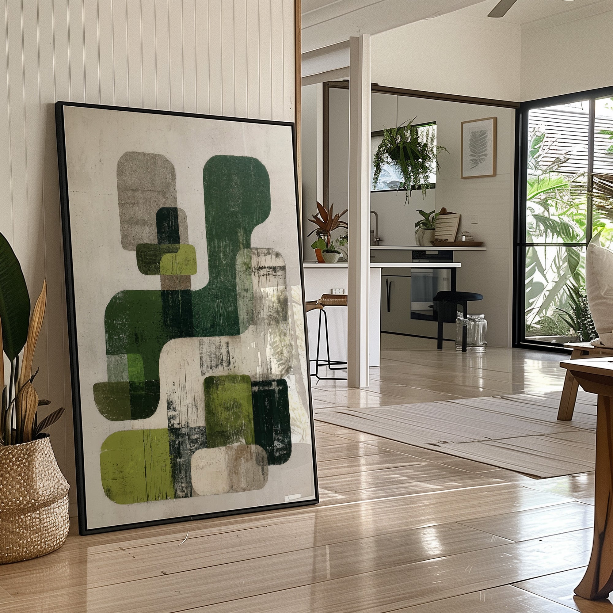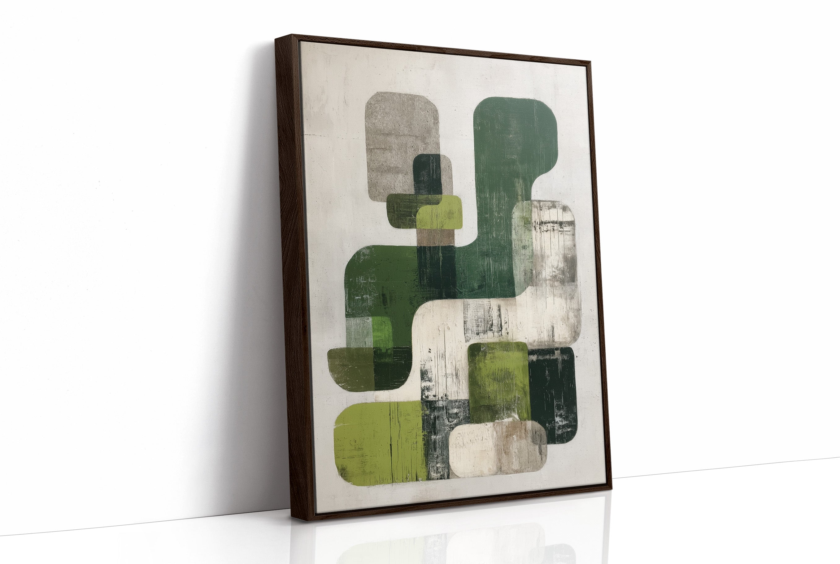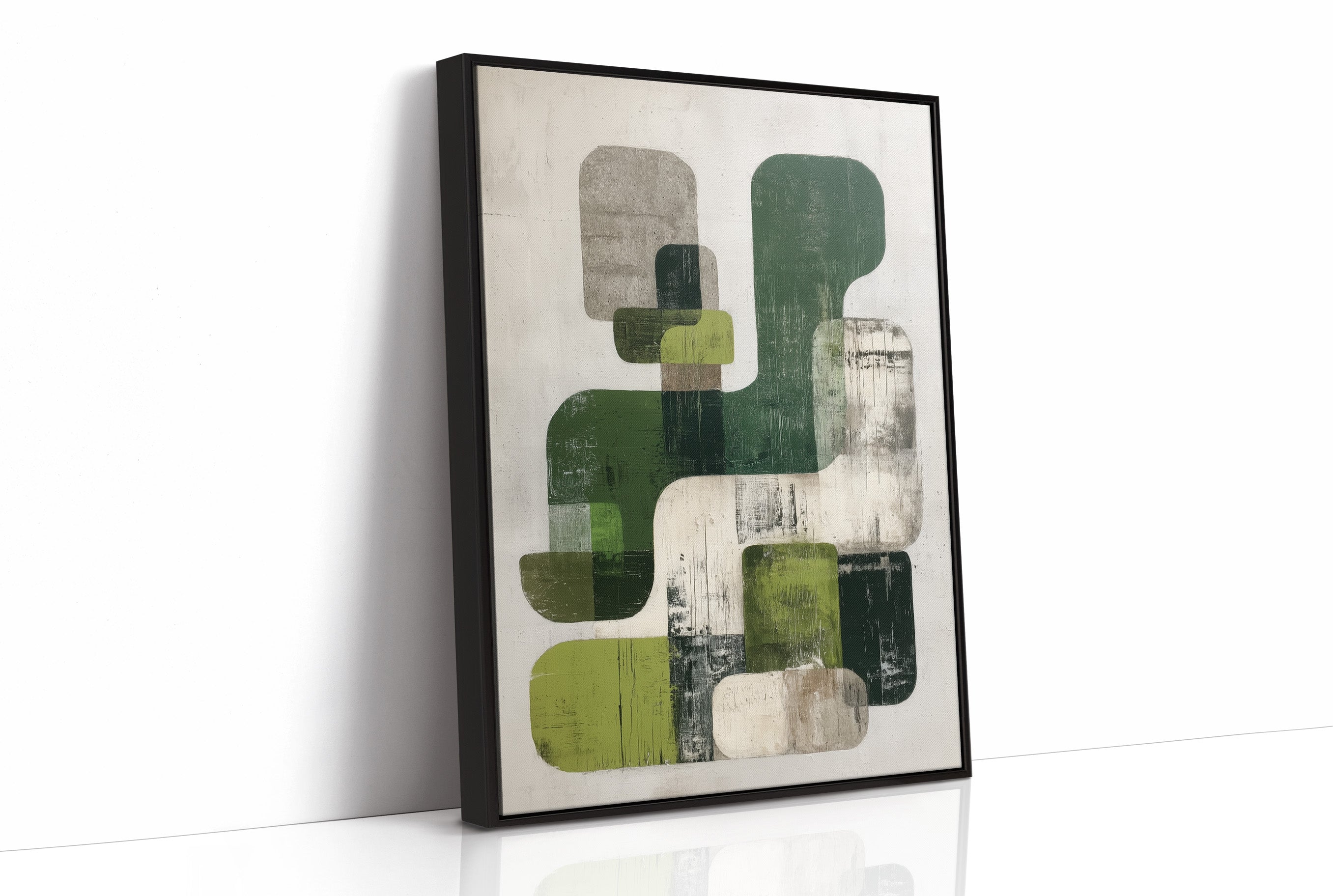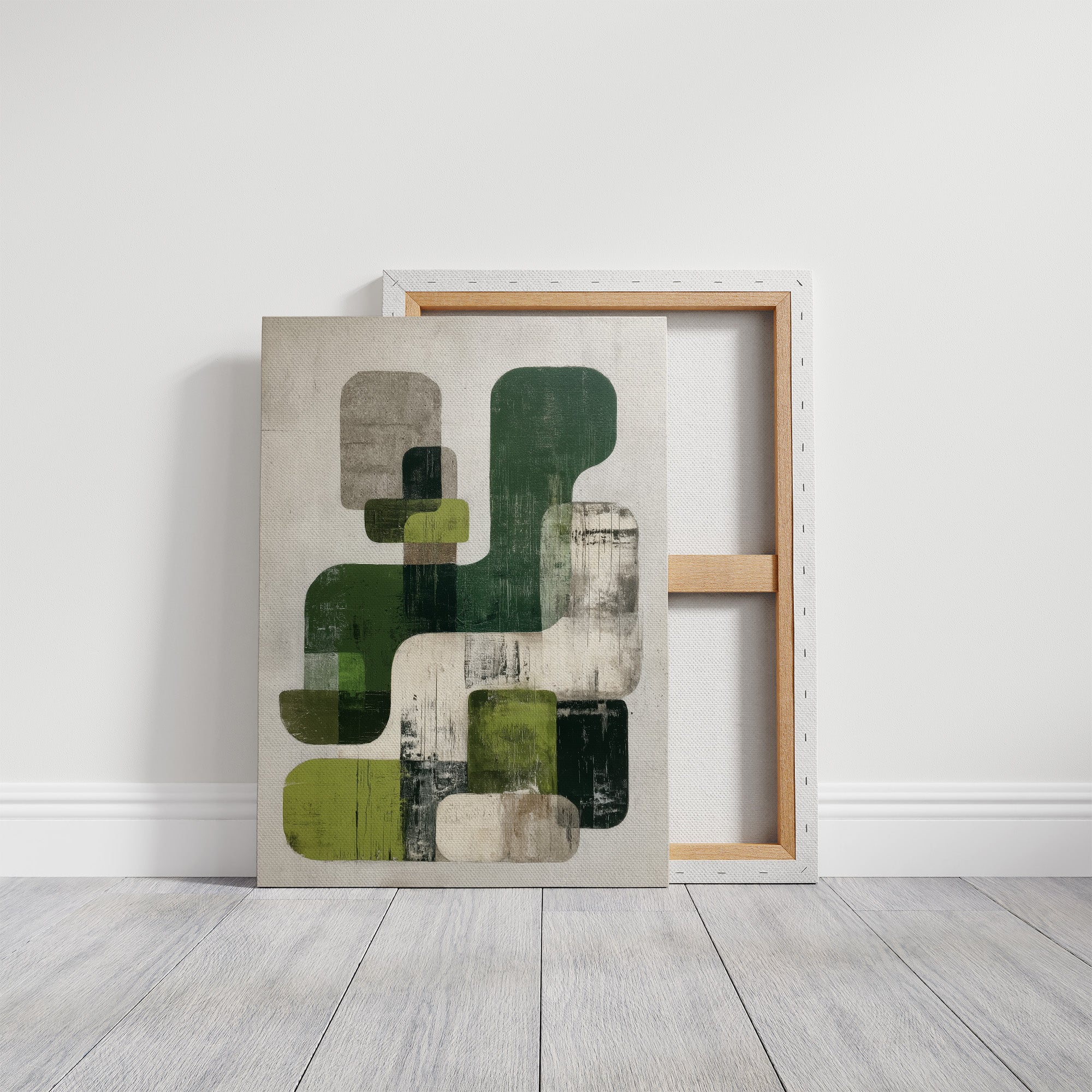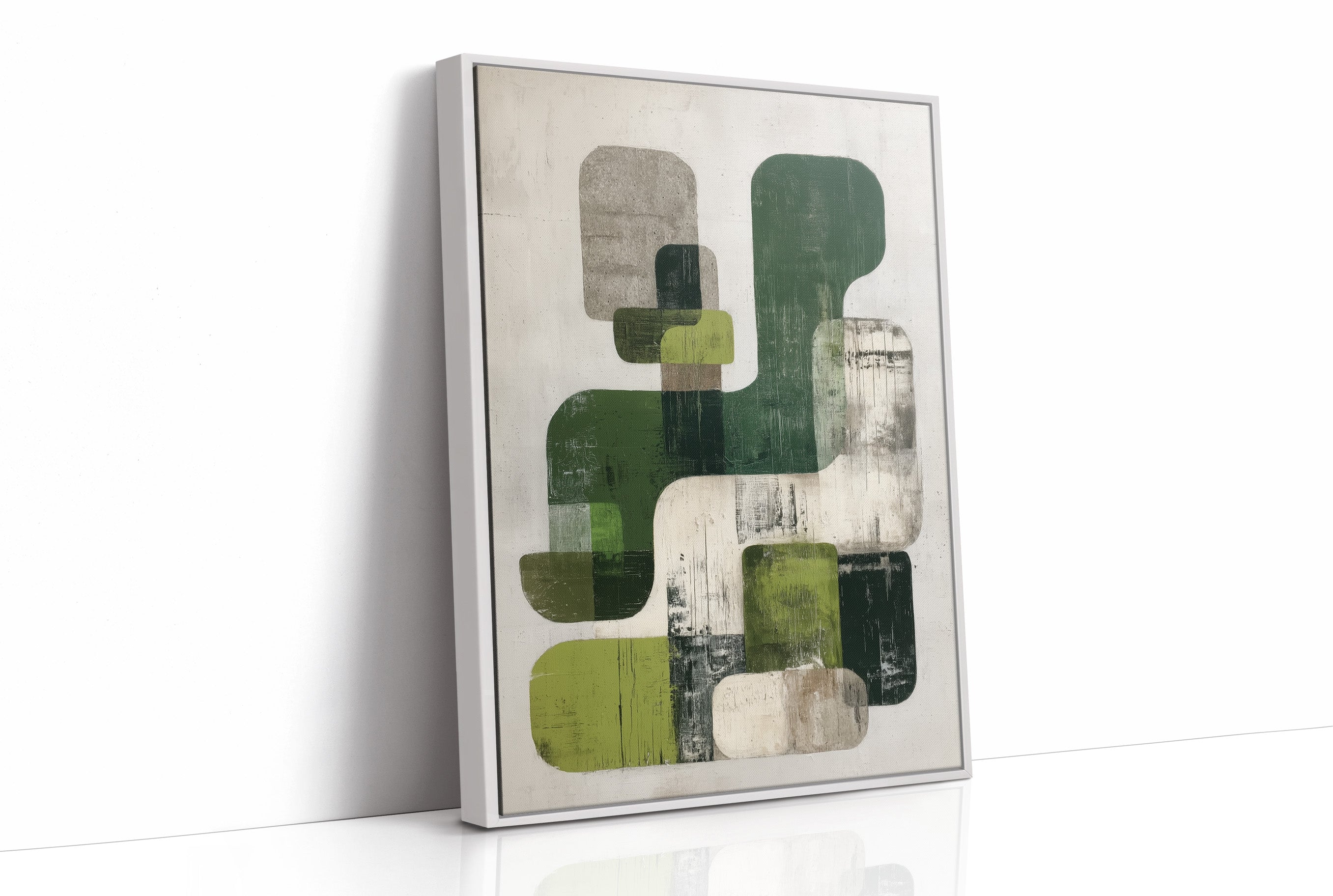 Sunlight streams across hardwood floors, illuminating an abstract composition where organic forms float in harmonious dialogue. Varying shades of forest and sage green blend with cool grays against a weathered white background, creating a peaceful rhythm of overlapping shapes and textures. The piece's modern sensibility is grounded by its earthy palette and distressed finish, offering both sophistication and warmth. This statement piece would elevate a contemporary living room or add artistic depth to a minimalist home office, particularly when paired with natural materials and clean lines.