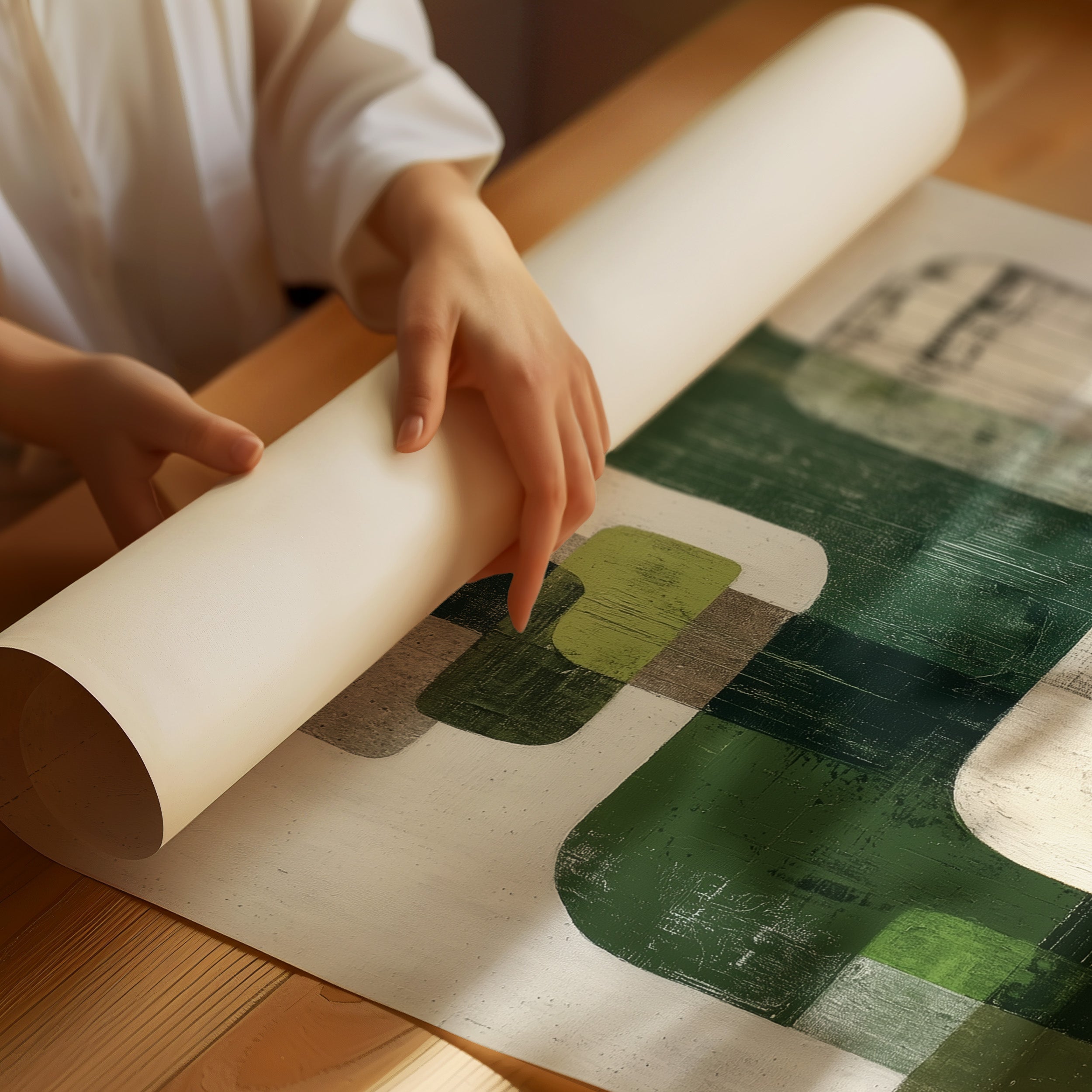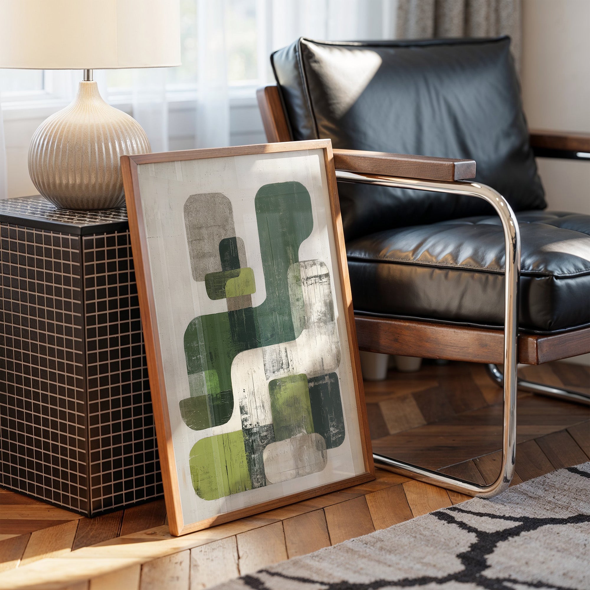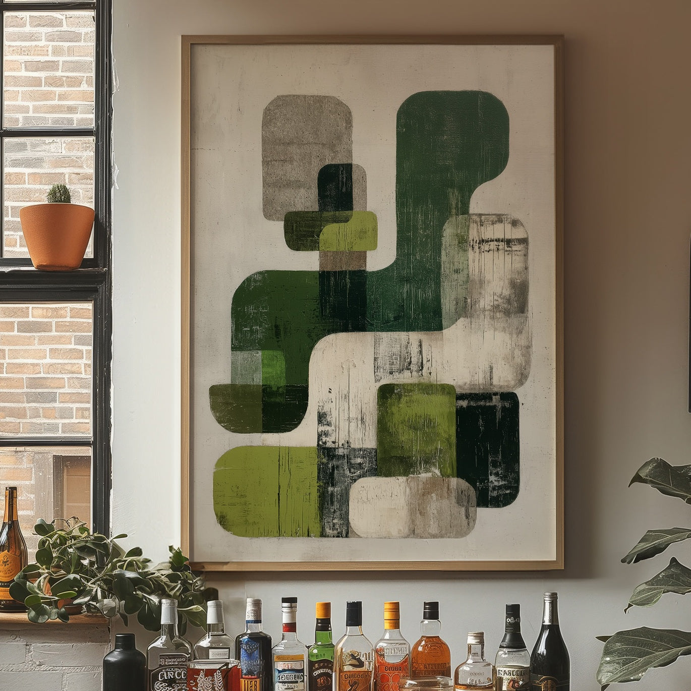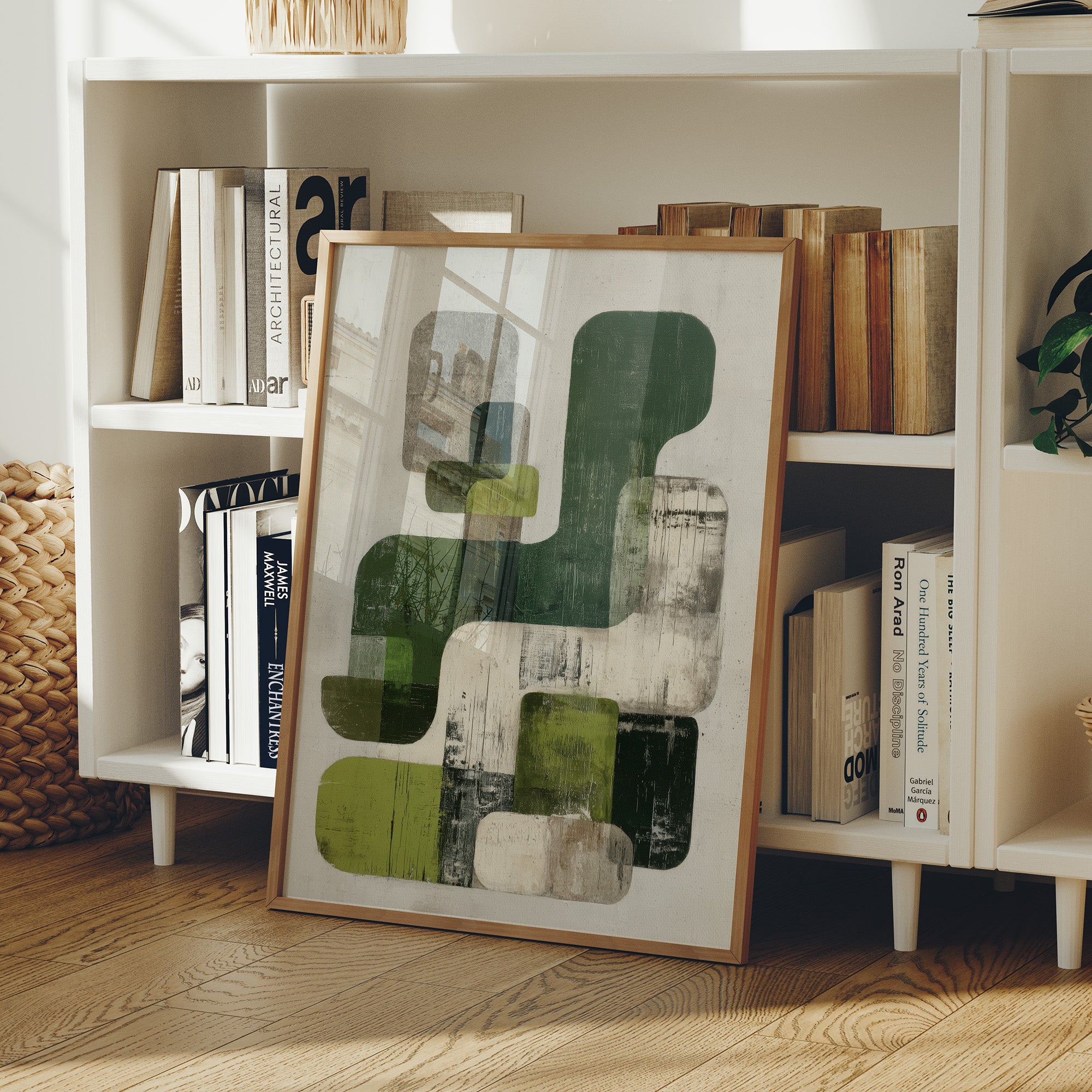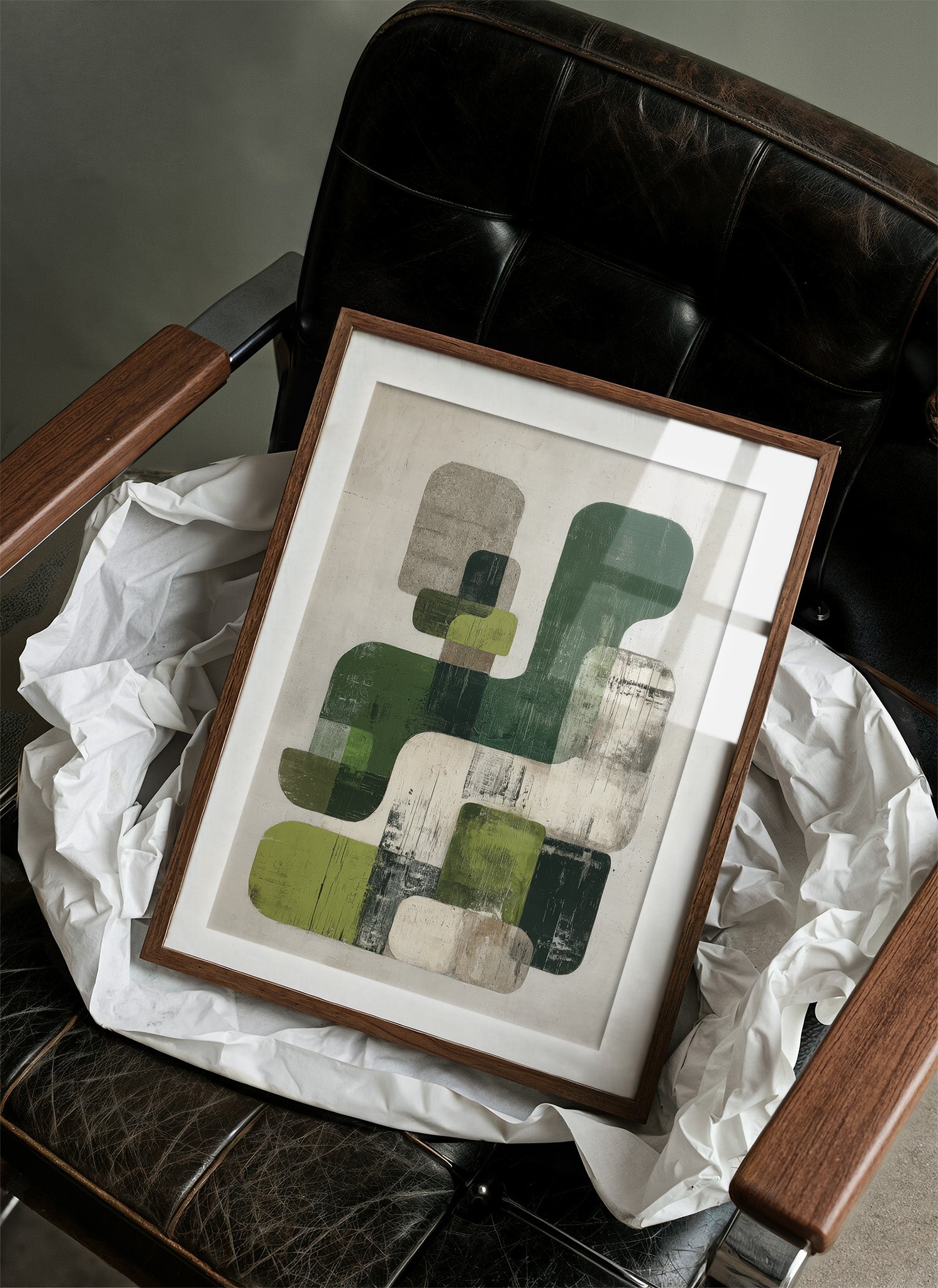 Sunlight streams across hardwood floors, illuminating an abstract composition where organic forms float in harmonious dialogue. Varying shades of forest and sage green blend with cool grays against a weathered white background, creating a peaceful rhythm of overlapping shapes and textures. The piece's modern sensibility is grounded by its earthy palette and distressed finish, offering both sophistication and warmth. This statement piece would elevate a contemporary living room or add artistic depth to a minimalist home office, particularly when paired with natural materials and clean lines.