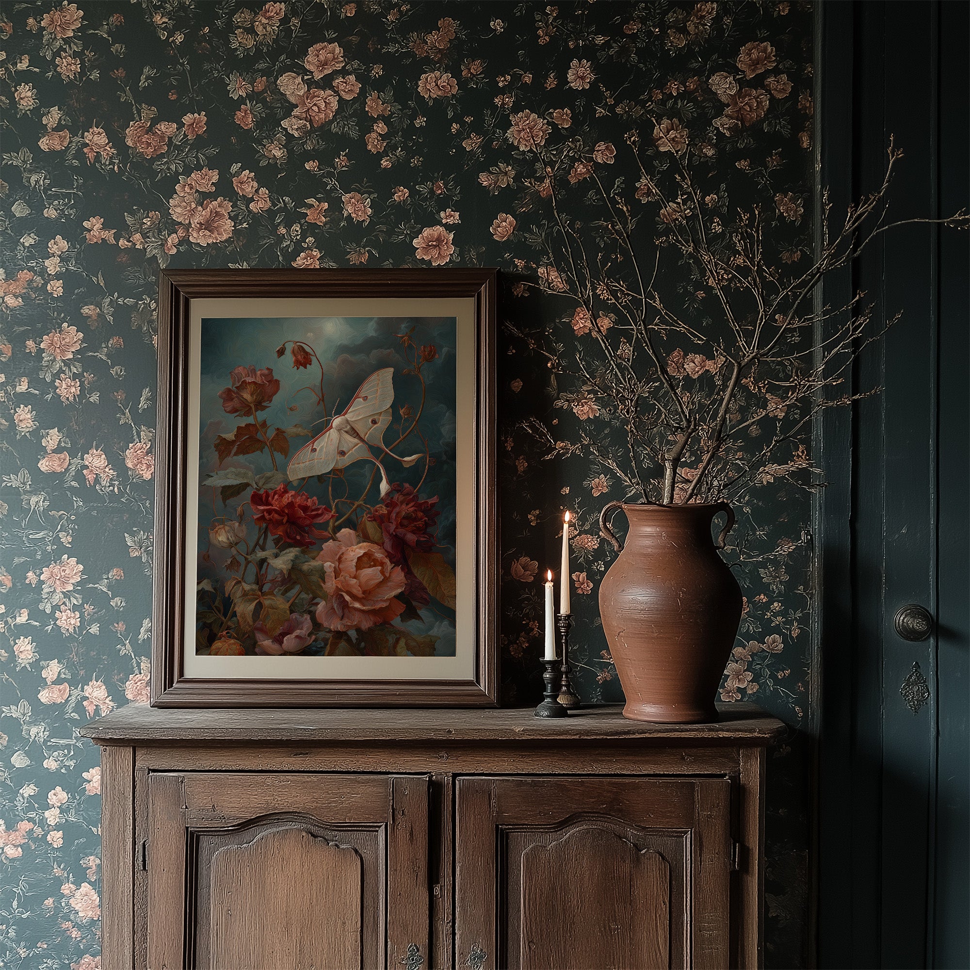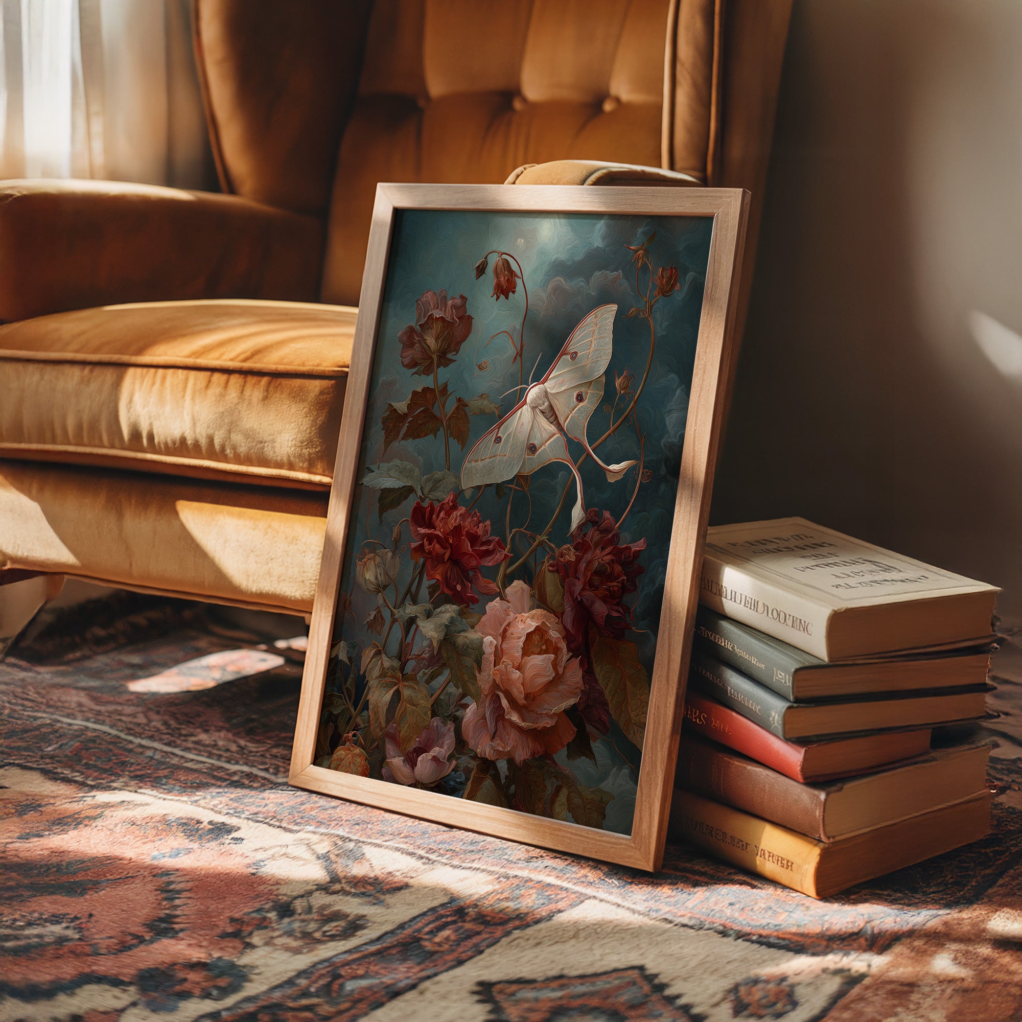 A delicate moth hovers in ethereal suspension, its pale wings catching light against a moody teal backdrop. Deep crimson and blush roses unfurl beneath, their petals rendered with classical attention to texture and shadow, creating a dance between fragility and permanence. The composition marries Dutch master sensibilities with contemporary dramatic presentation, the floral elements twisting upward as if caught in the same gentle current as the nocturnal visitor.