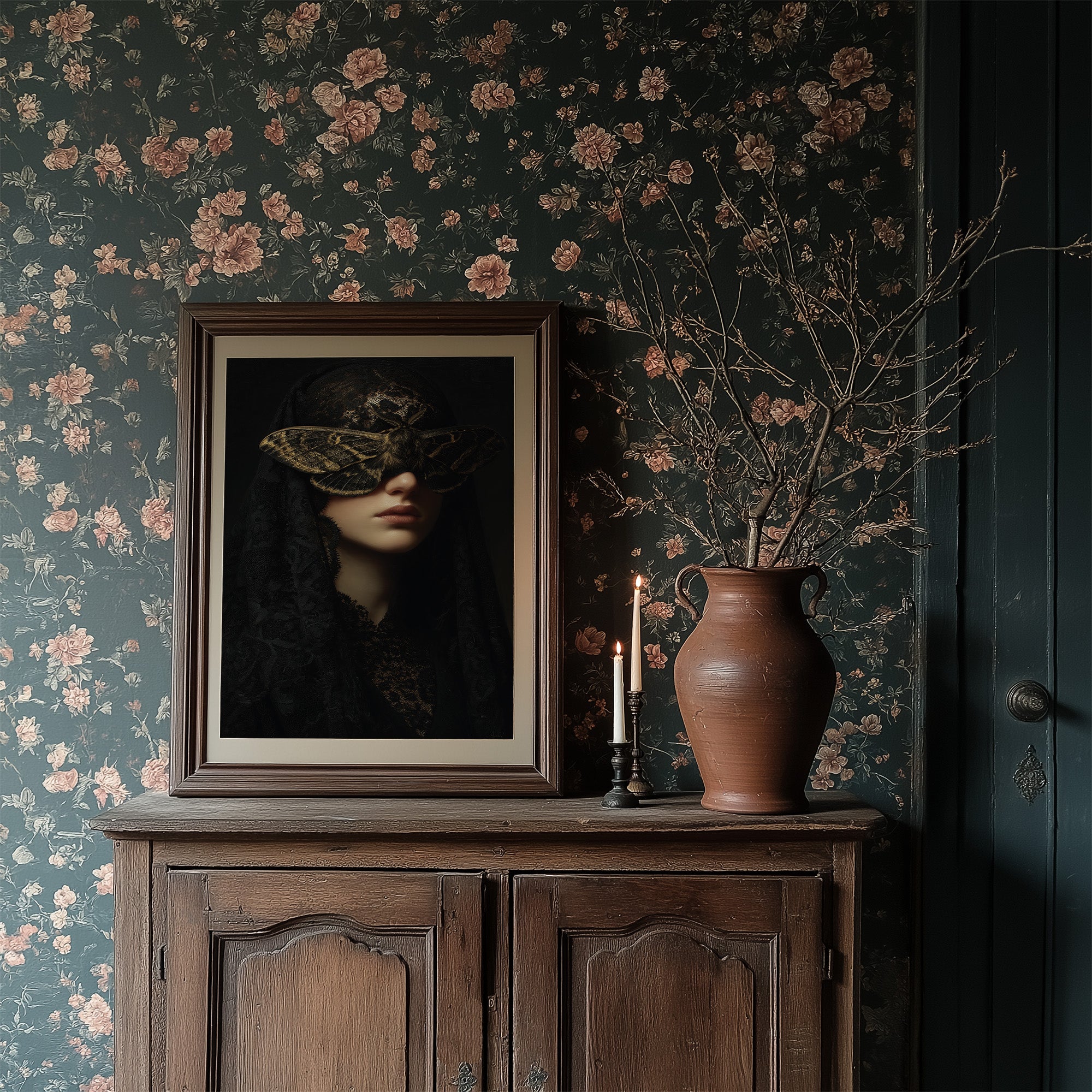 In the velvet darkness, a mysterious portrait emerges where delicate moth wings become a living mask across the eyes. The golden-brown patterns of the wings catch what little light exists, creating an ethereal contrast against the shadowy backdrop and pale skin beneath. This haunting image blurs the line between human and nature, suggesting transformation and the beauty found in nocturnal metamorphosis. Perfect for sophisticated spaces that aren't afraid of depth and drama a statement piece in a moody dining room or as the focal point in a luxurious bedroom where dreams and reality intertwine.