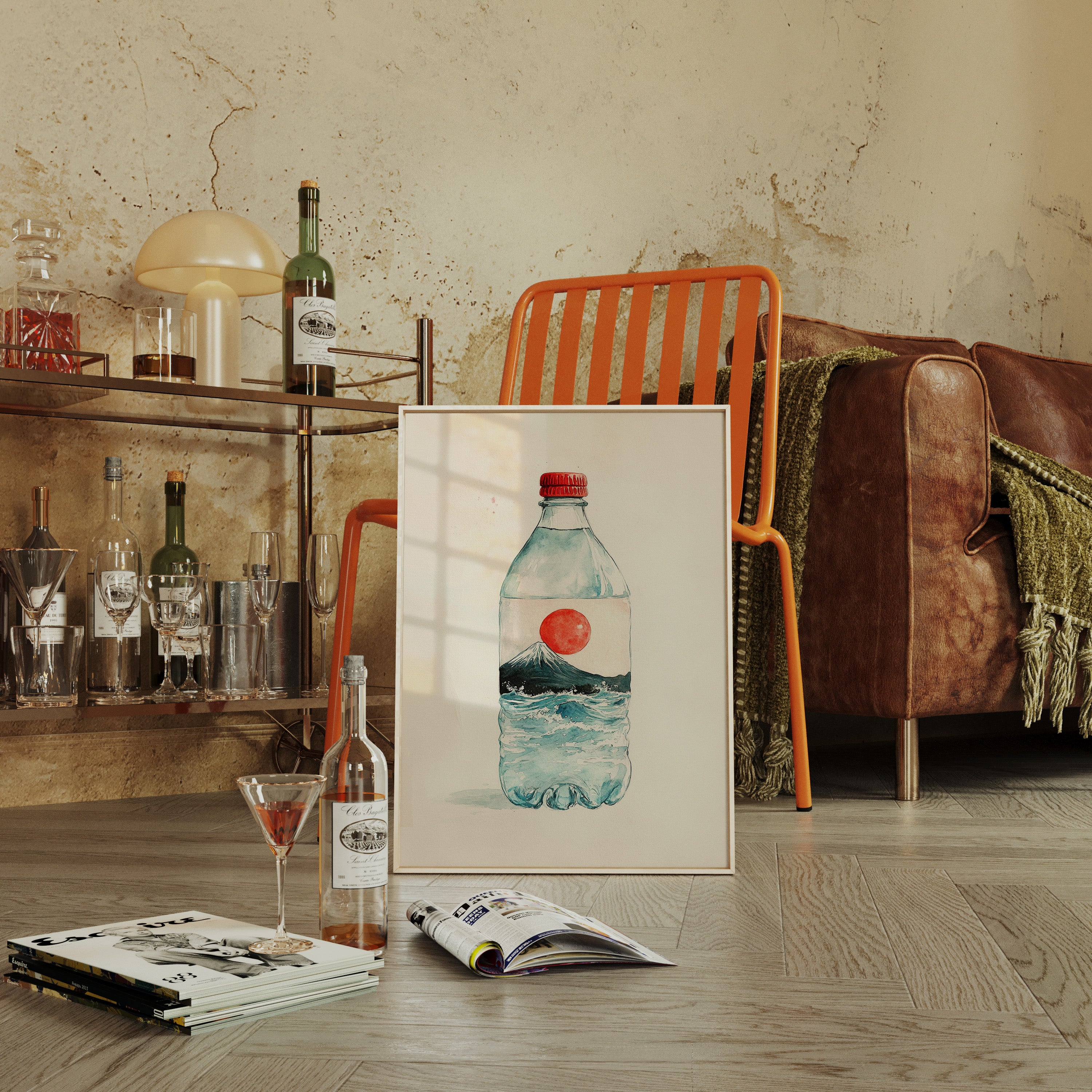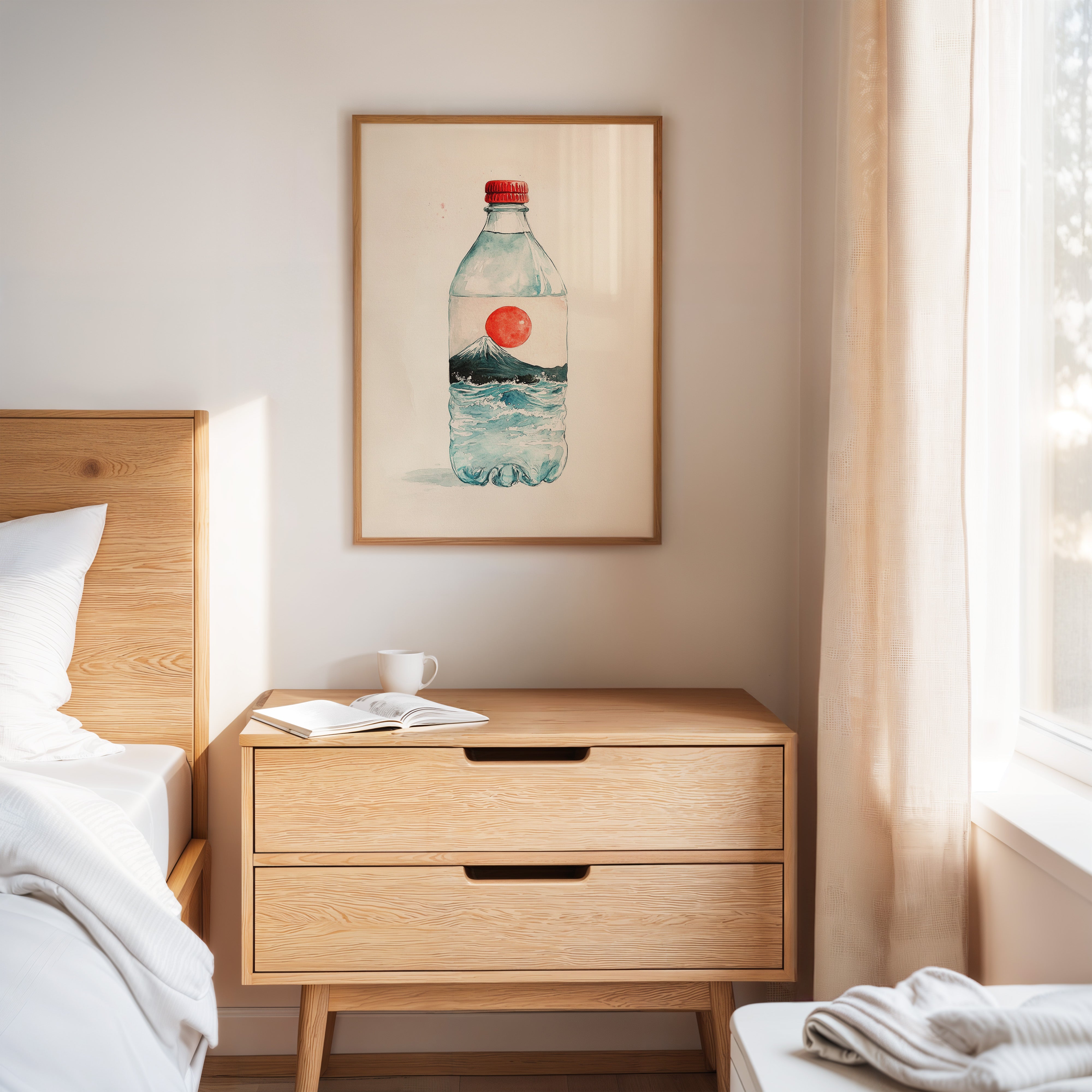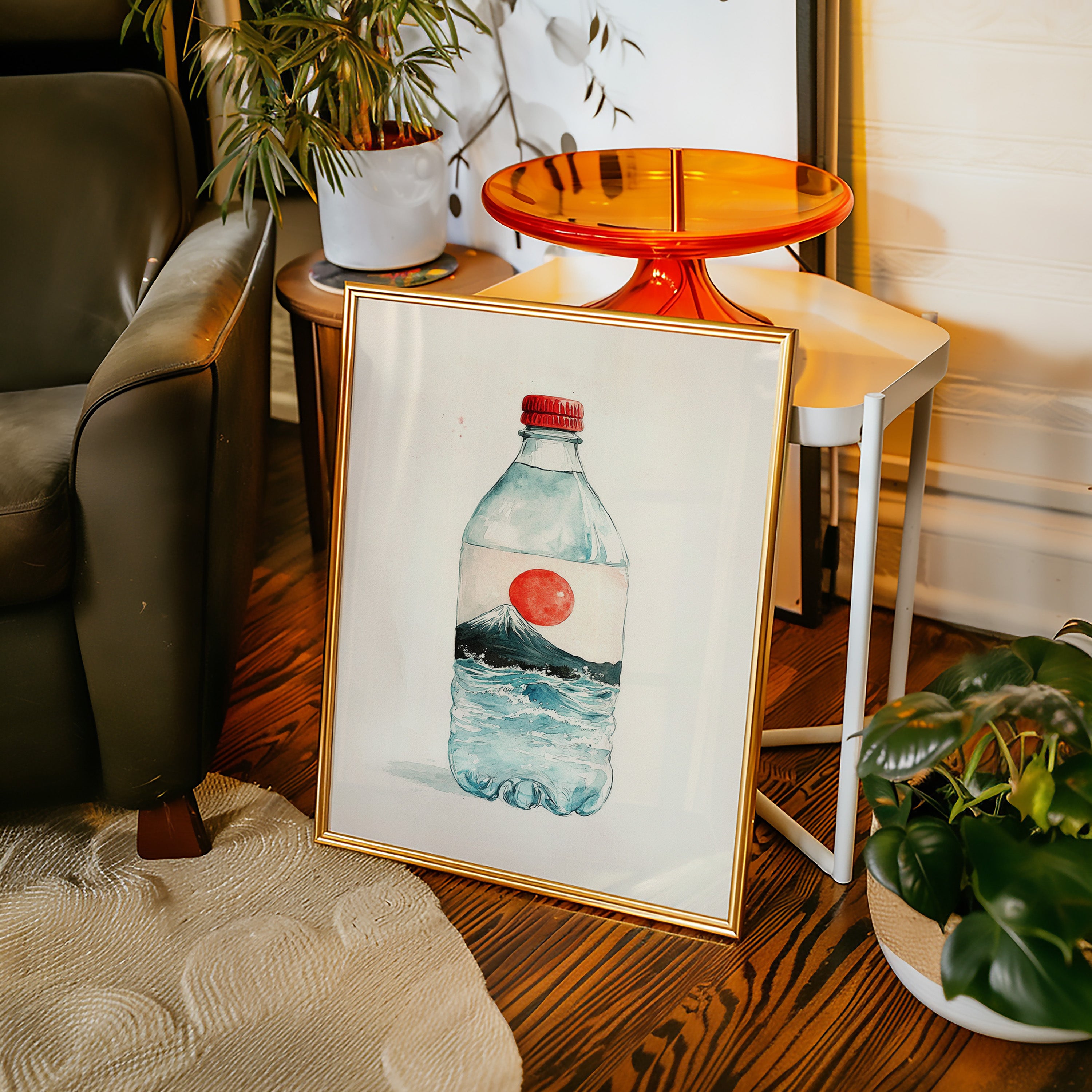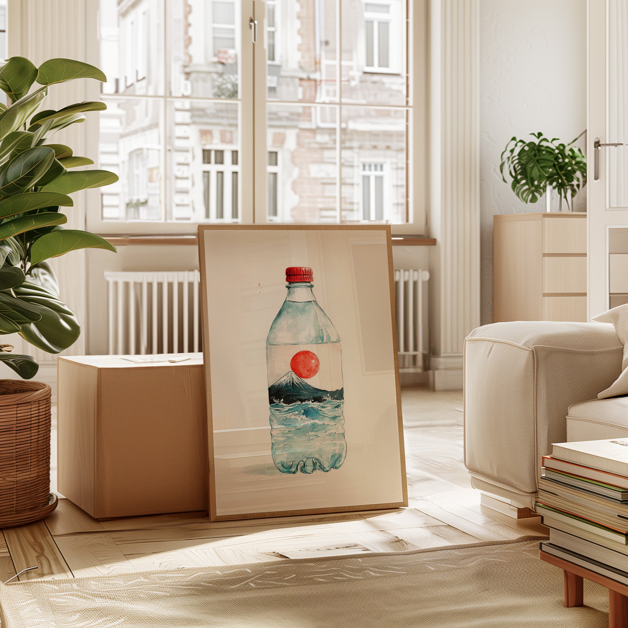 A serene Japanese landscape captured within the confines of a plastic water bottle, where waves crash beneath a snow-capped Mount Fuji. The striking red sun hangs in perfect balance against the pale backdrop, creating a minimalist interpretation of Japan's iconic vista. The watercolor technique brings fluidity to the scene, with translucent aqua tones merging into foamy white caps below the majestic mountain. Perfect for modern spaces seeking a contemporary twist on traditional Eastern imagery, this piece adds a thoughtful narrative to minimalist dining rooms or meditation spaces.
