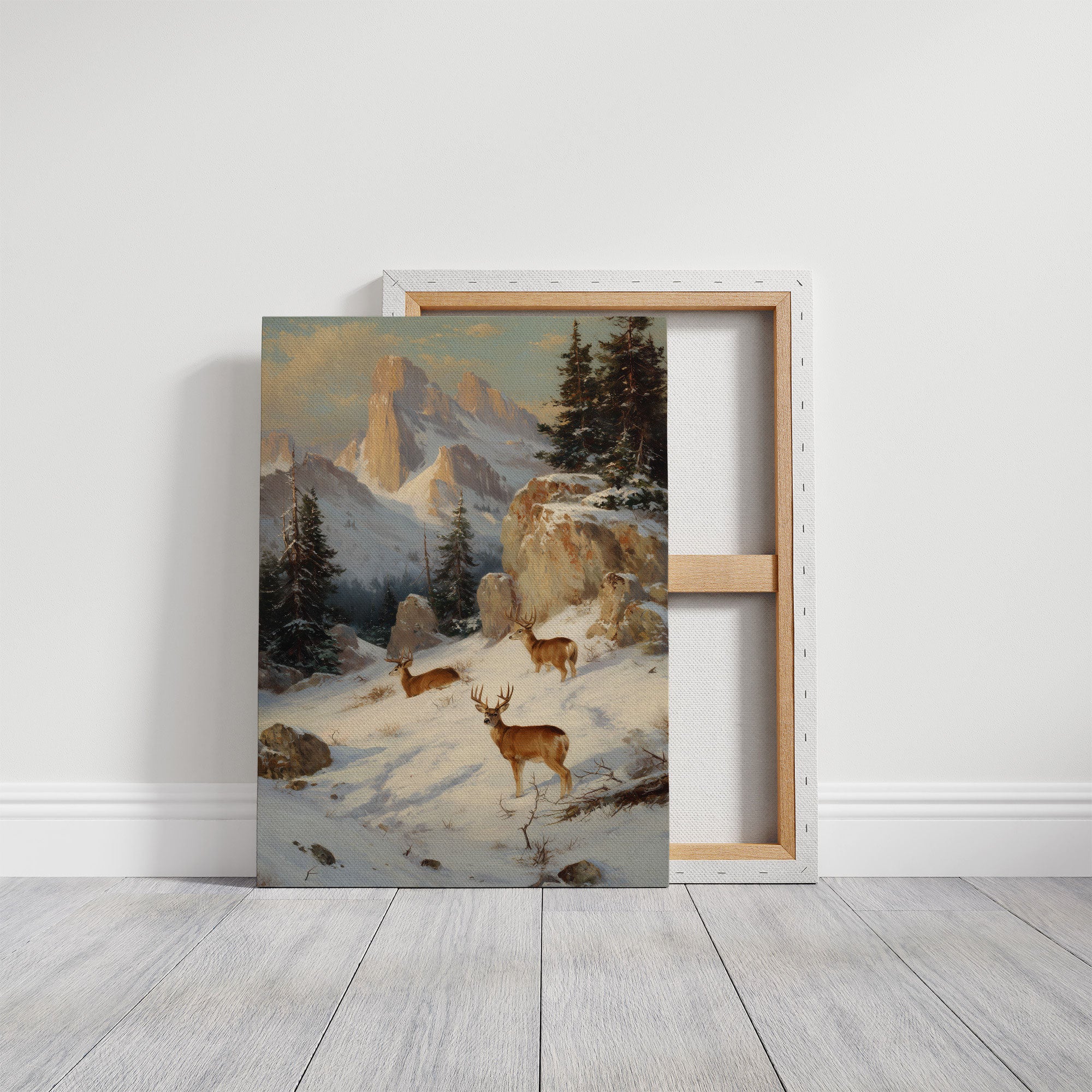 Winter sunlight streams through sheer curtains, casting gentle shadows across a serene corner where classic meets contemporary. A masterful painting of deer in a snow-covered mountain landscape commands attention, its earthy tones harmonizing with the room's natural palette. The scene is punctuated by a luminous white Christmas tree, its warm glow creating an ethereal atmosphere against the minimalist backdrop. This thoughtful arrangement marries rustic charm with modern simplicity, where clean lines and natural materials create a peaceful dialogue. Perfect for a contemporary mountain home, modern lodge, or any space seeking to capture the quiet majesty of winter's embrace.