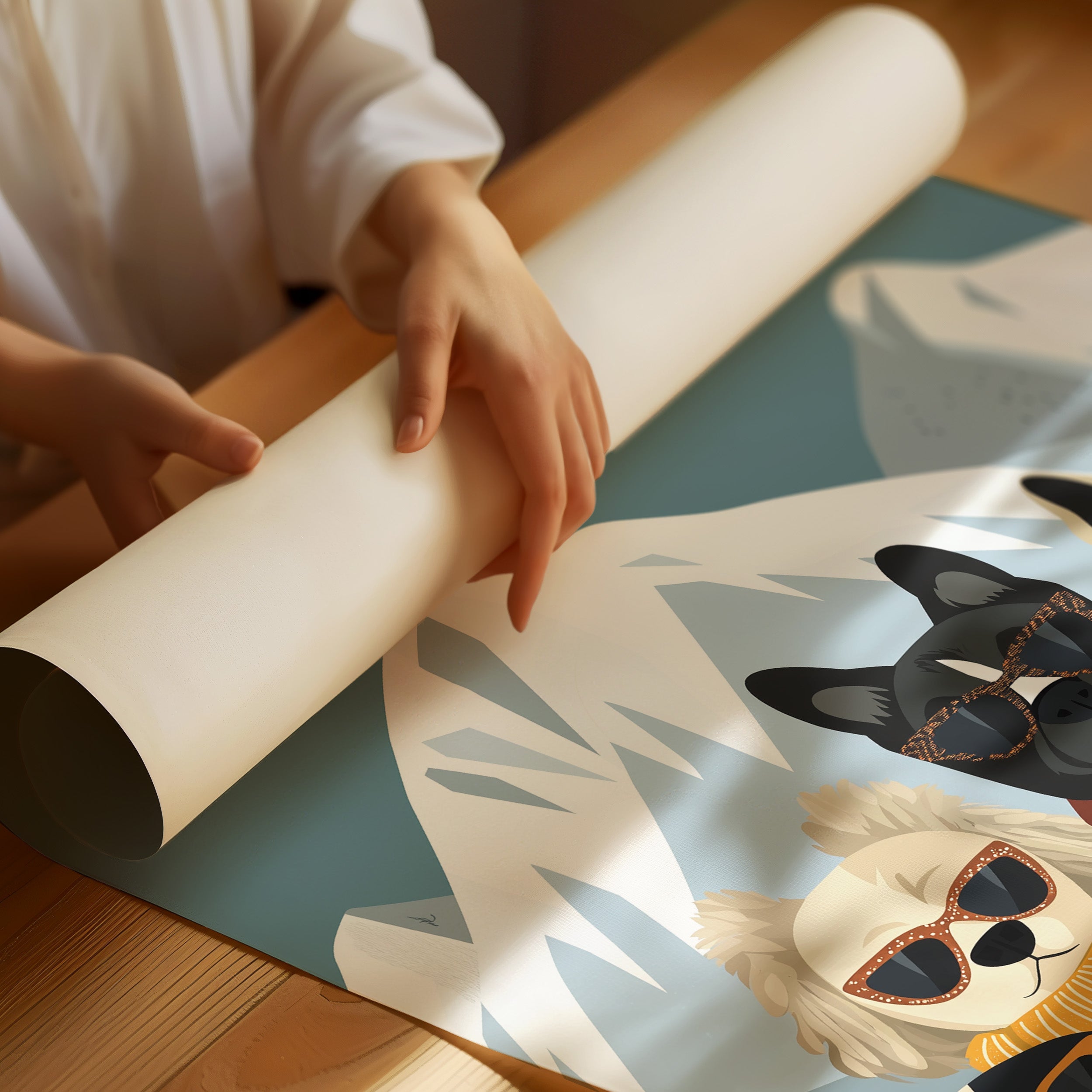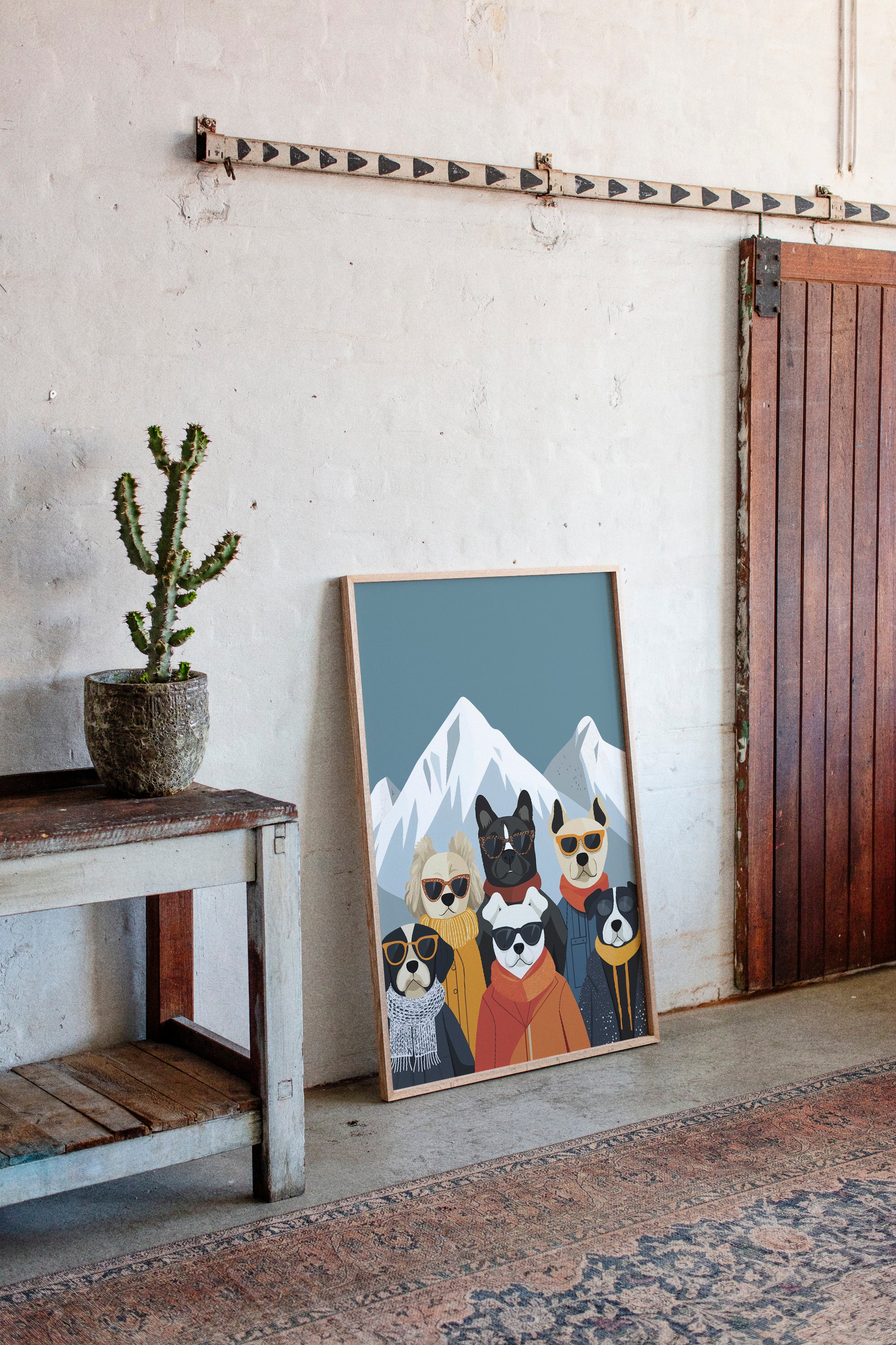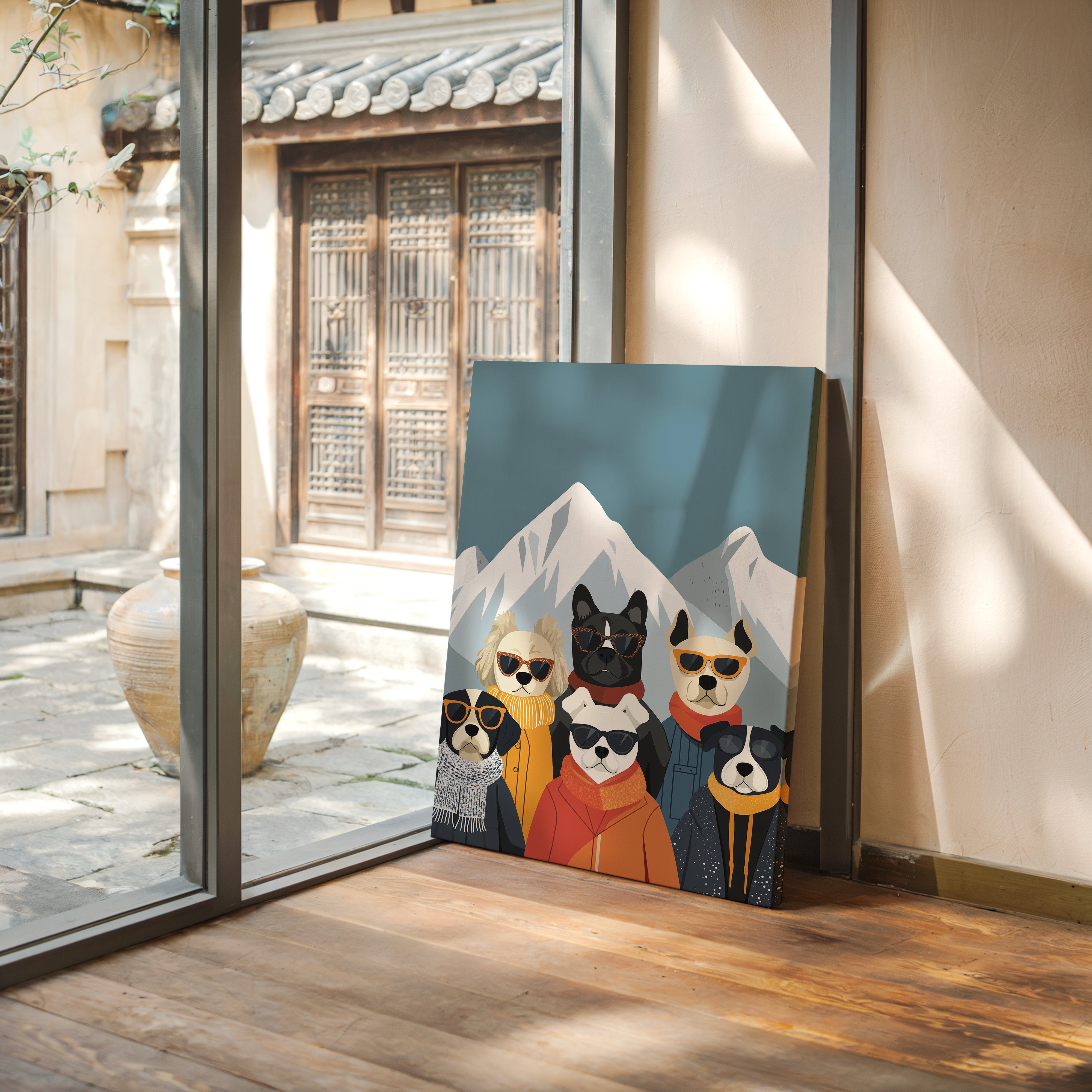 Six stylish pups strike a pose against snowy peaks, each sporting their own signature winter look complete with designer shades and cozy scarves. This playful piece from our Contemporary collection brings whimsical charm to modern spaces through its clever blend of fashion and furry friends. The cool teal backdrop frames the snow-capped mountains perfectly, while each dog's personality shines through their carefully chosen accessories and expressions. Pops of orange, yellow, and navy create a sophisticated color story that feels both fresh and timeless. Perfect for adding a touch of joy to a home office, children's room, or any space that could use a dose of lighthearted sophistication. The piece invites smiles while maintaining its artistic integrity through clean lines and thoughtful composition.