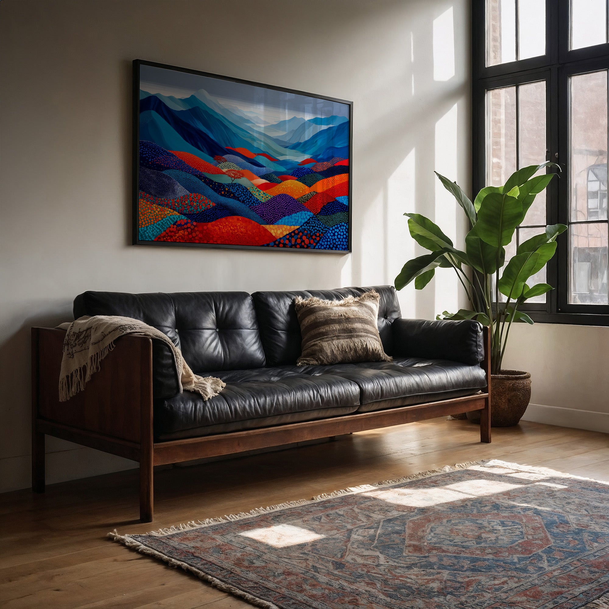 Afternoon light spills across a corduroy couch, casting delicate plant shadows that dance alongside a vibrant mountain scene. The artwork captures rolling peaks in a mesmerizing array of blues and corals, each hill dotted and textured like an intricate quilt of the landscape. The composition weaves together bold turquoise ridges with warm orange valleys, creating a rhythmic pattern that draws the eye deeper into its geometric wilderness. This piece would bring a perfect pop of color and contemporary charm to a reading nook, home office, or any space that needs a touch of artistic wanderlust.