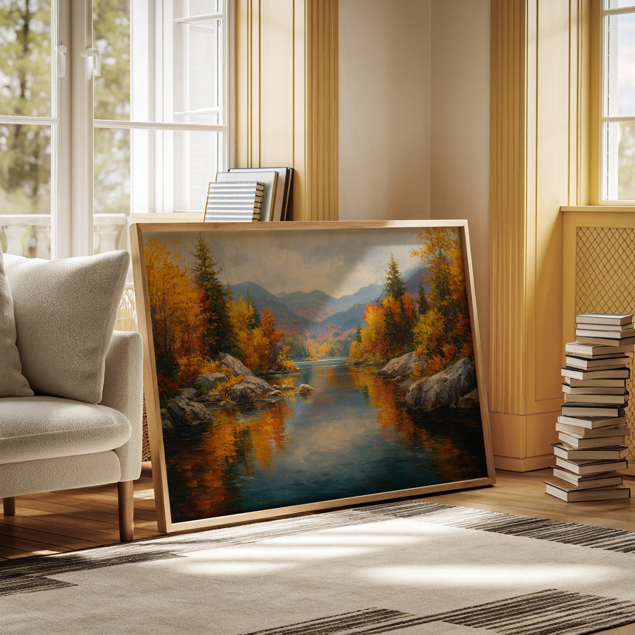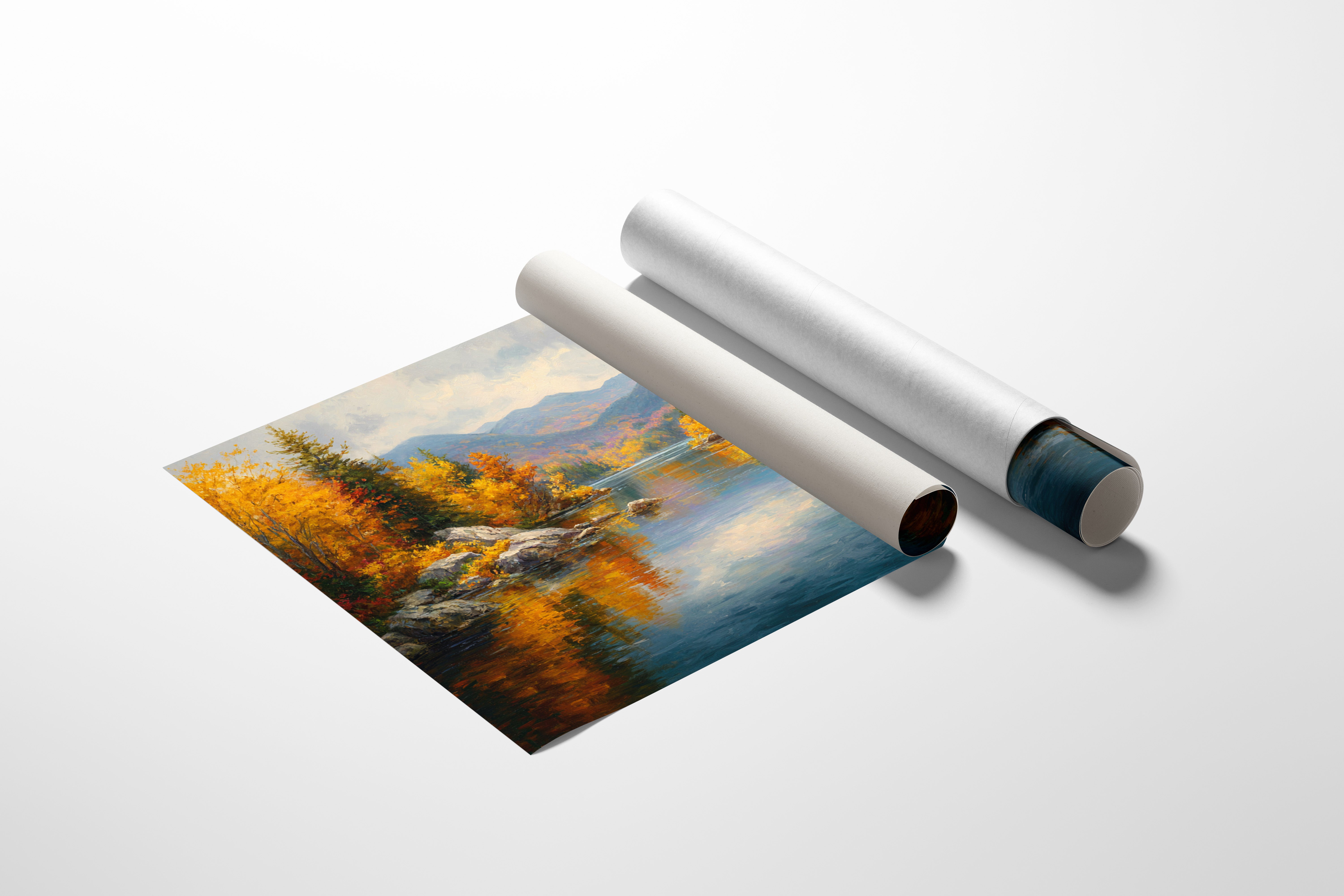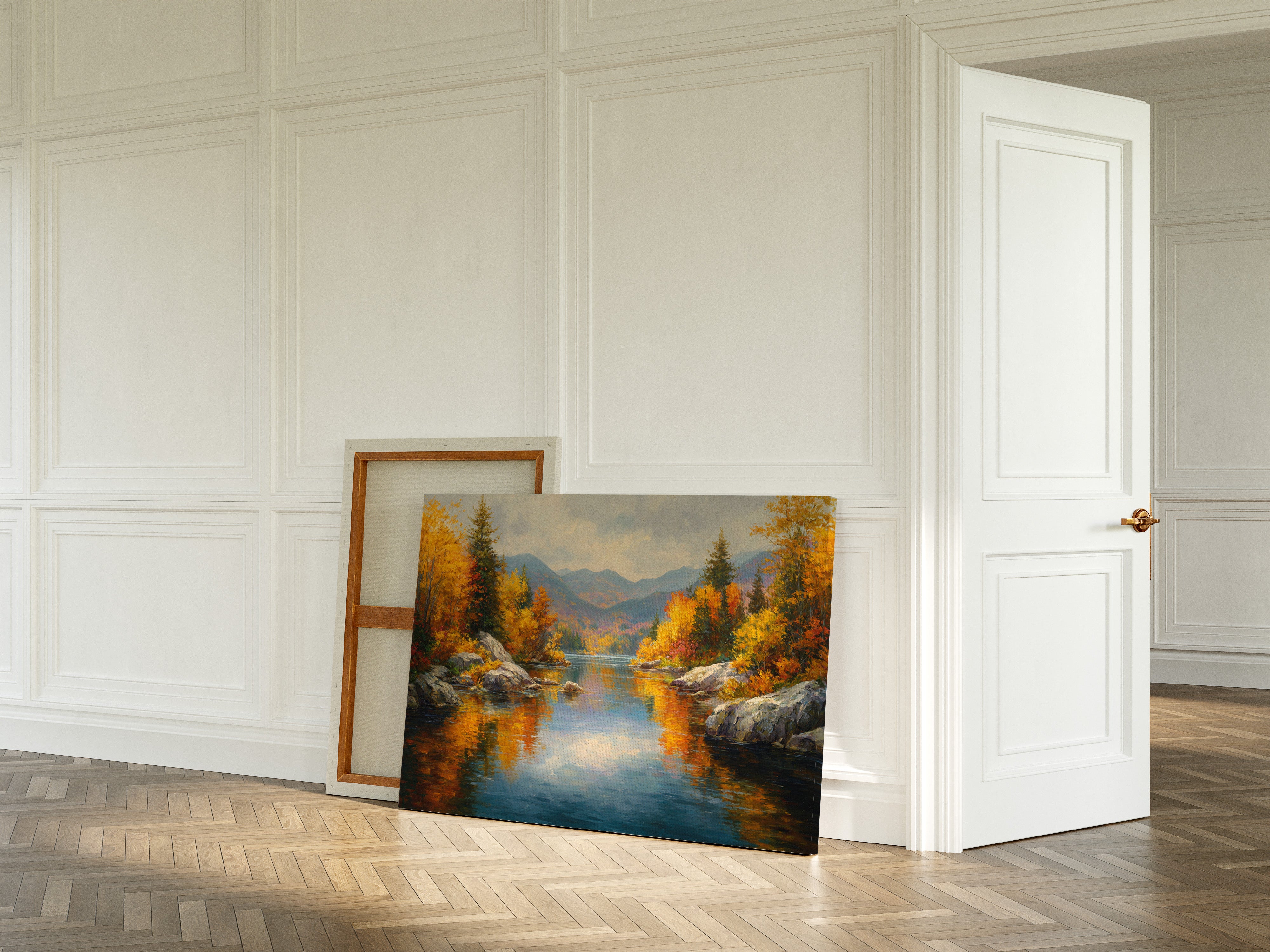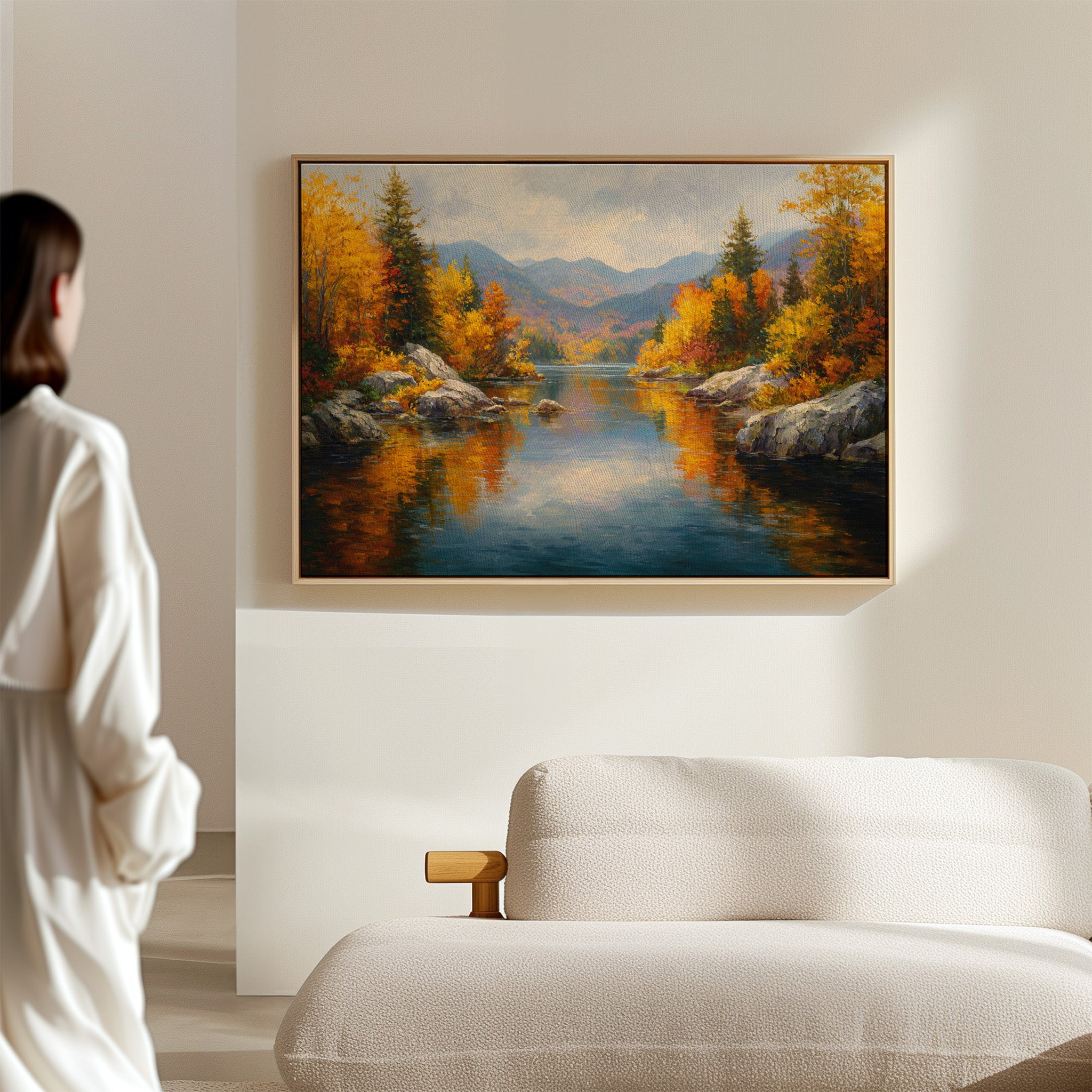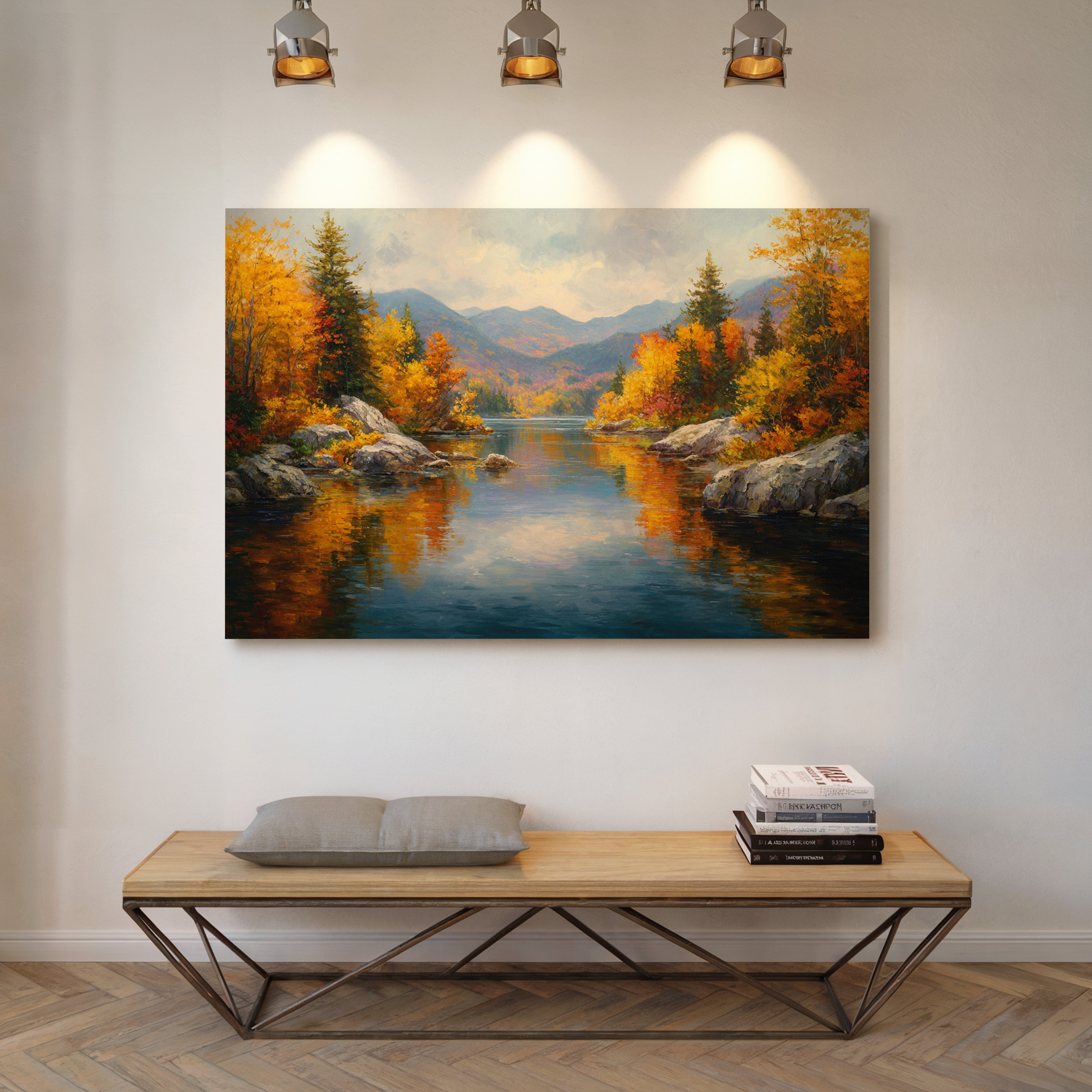 Autumn's warmth spills across the landscape like honey, painting the shoreline in brilliant golds and crimsons. The still mountain lake becomes nature's mirror, perfectly reflecting the dramatic transformation of the season. Weathered granite boulders anchor the scene, while evergreen sentinels stand proud among their deciduous neighbors ablaze in fall splendor. The distant mountains fade into soft blues and purples, creating a peaceful backdrop for this serene wilderness moment. This tranquil scene would bring natural majesty to a living room or create a stunning focal point in an entryway where its reflective qualities can double the impact of ambient light.