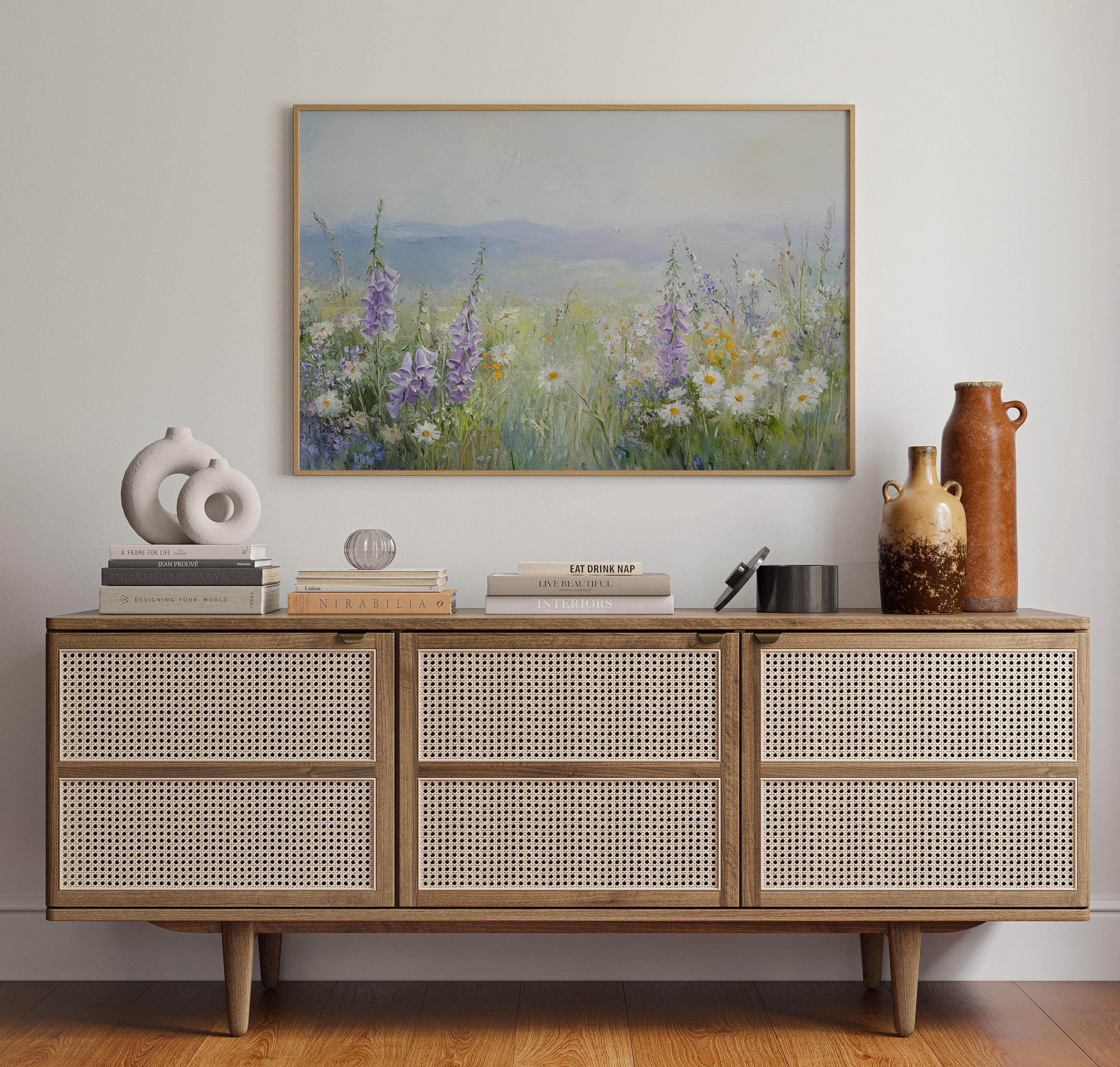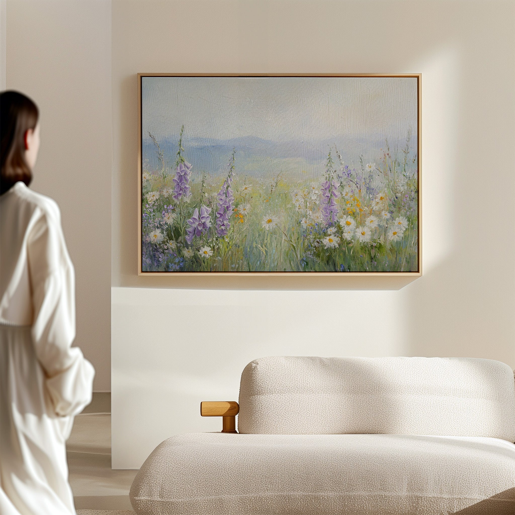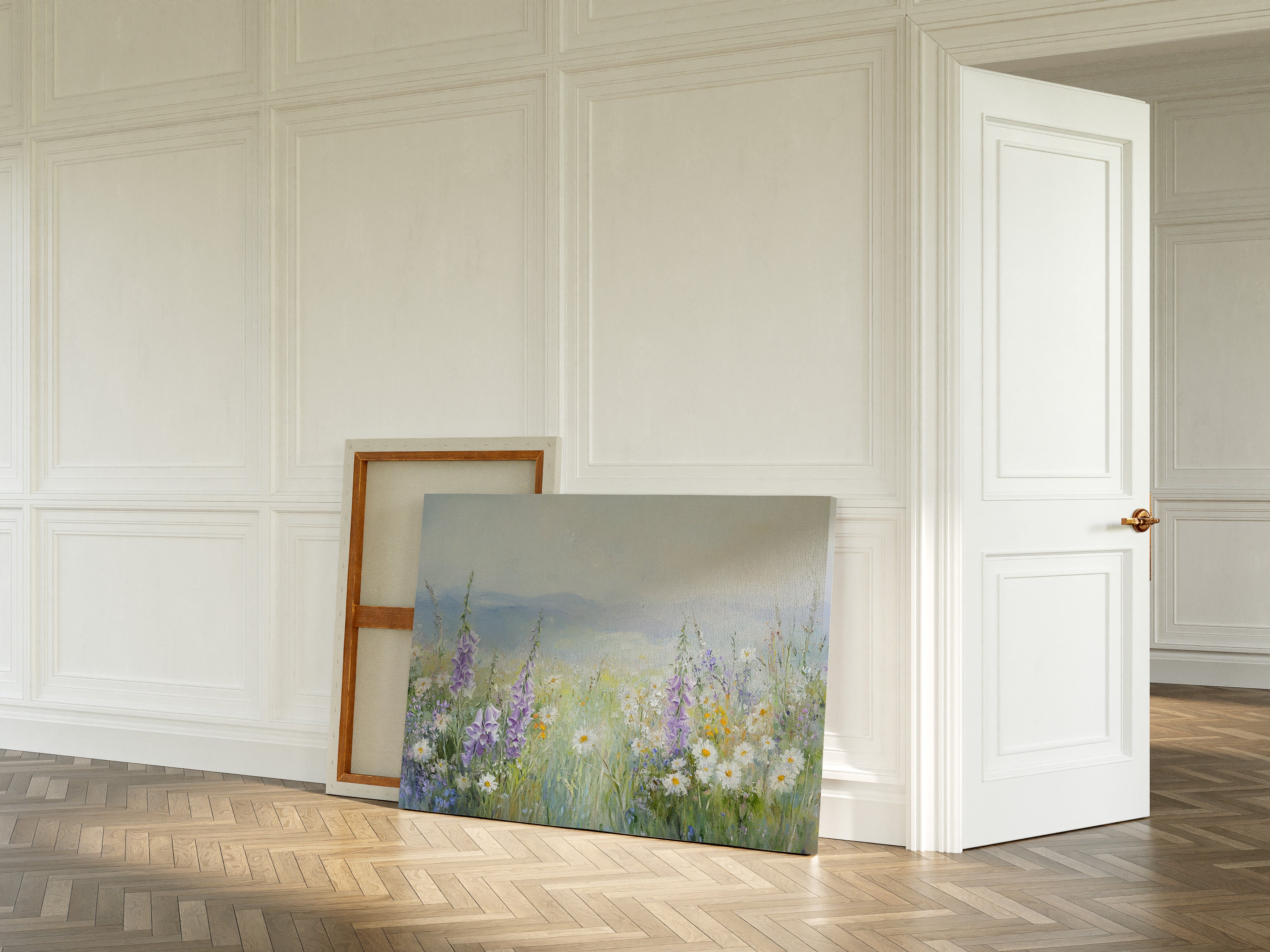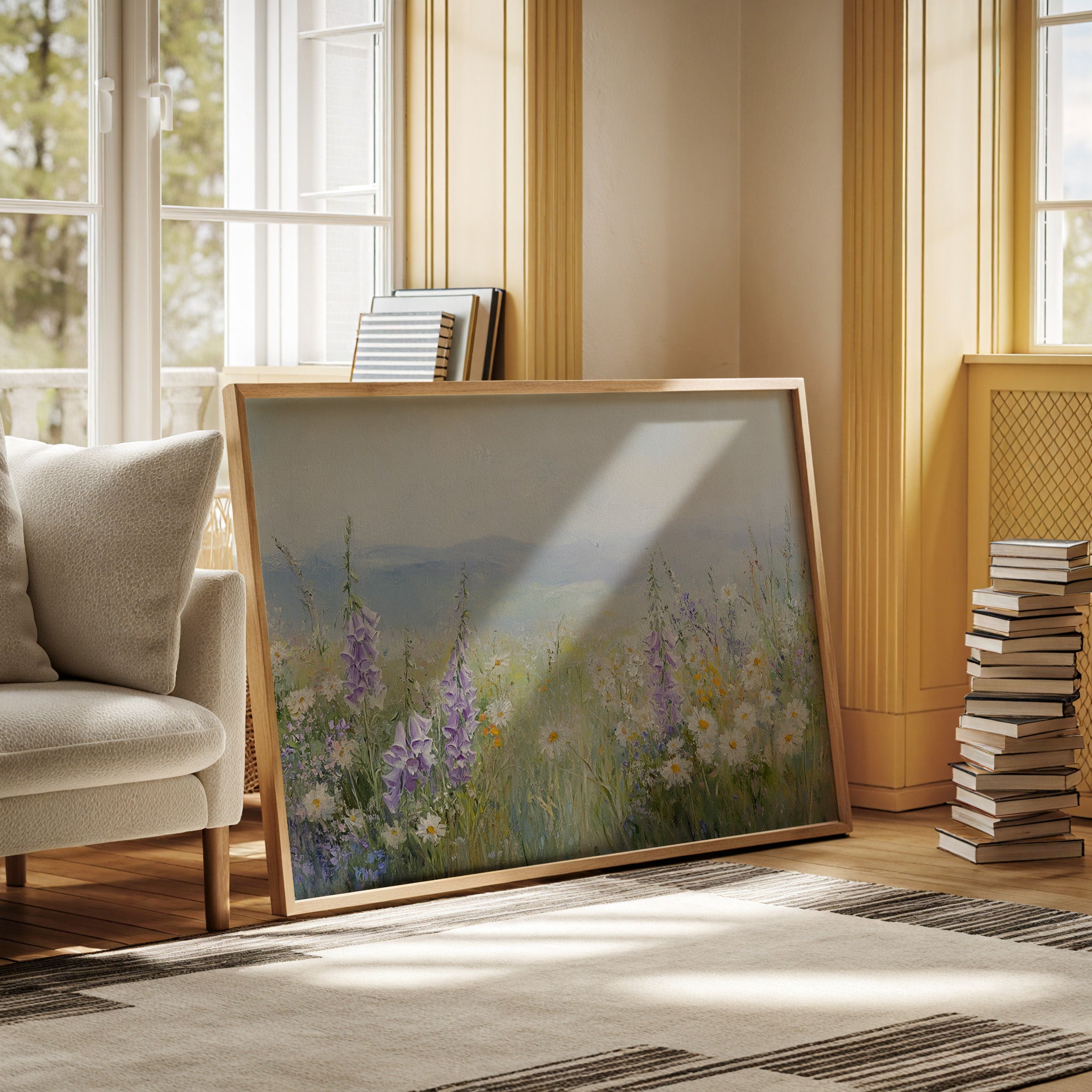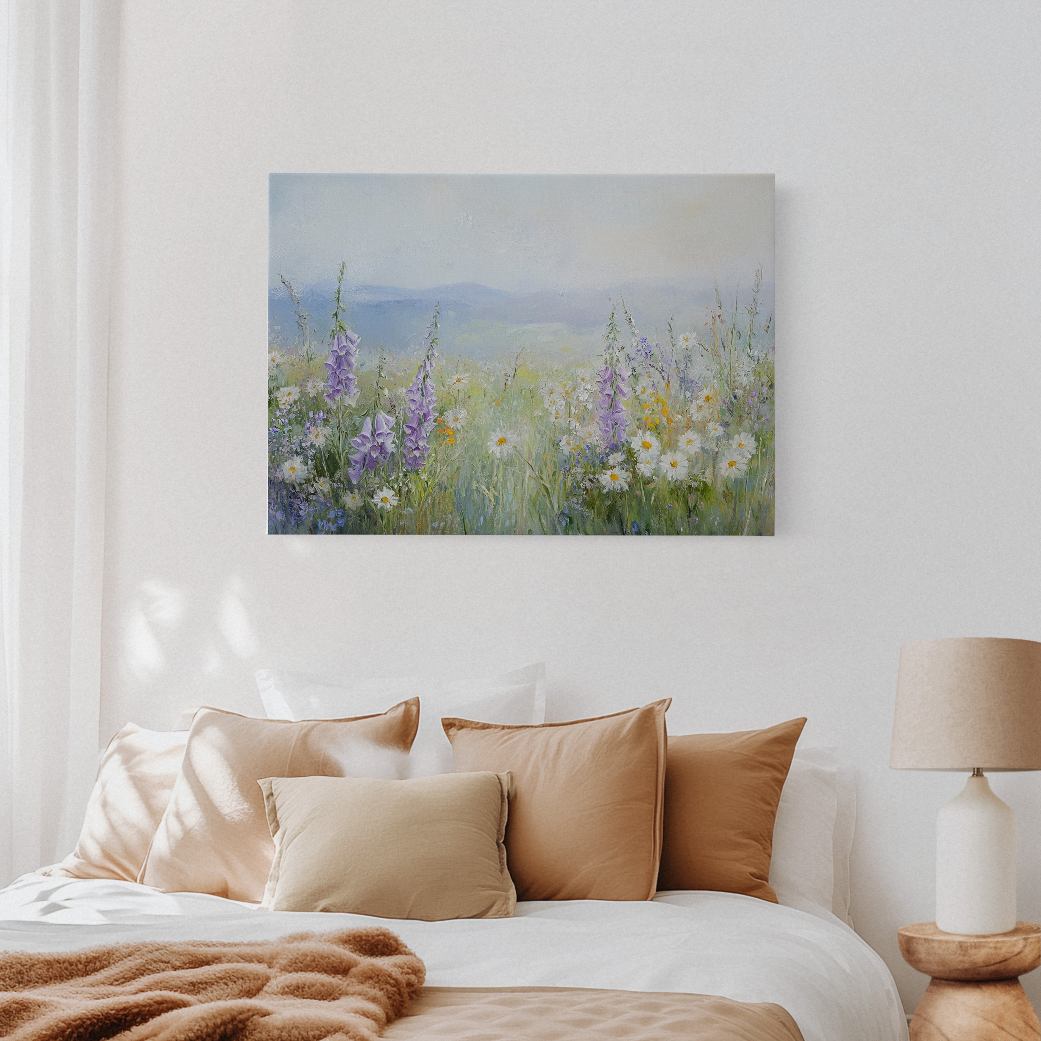 Delicate foxgloves rise like nature's wind chimes among a sea of dancing daisies, their lavender bells catching the soft morning light. The wildflower meadow stretches toward misty blue mountains, creating a symphony of texture and movement in soft pastels and vibrant spring greens. White daisies dot the landscape like stars fallen to earth, while purple blooms stand sentinel against the dreamy horizon. This ethereal scene captures the fleeting beauty of highland wildflowers in their prime, each petal rendered with careful brushstrokes that celebrate nature's artistry. Perfect for bringing the fresh energy of mountain meadows into peaceful living spaces, meditation rooms, or anywhere that calls for a touch of wild serenity.