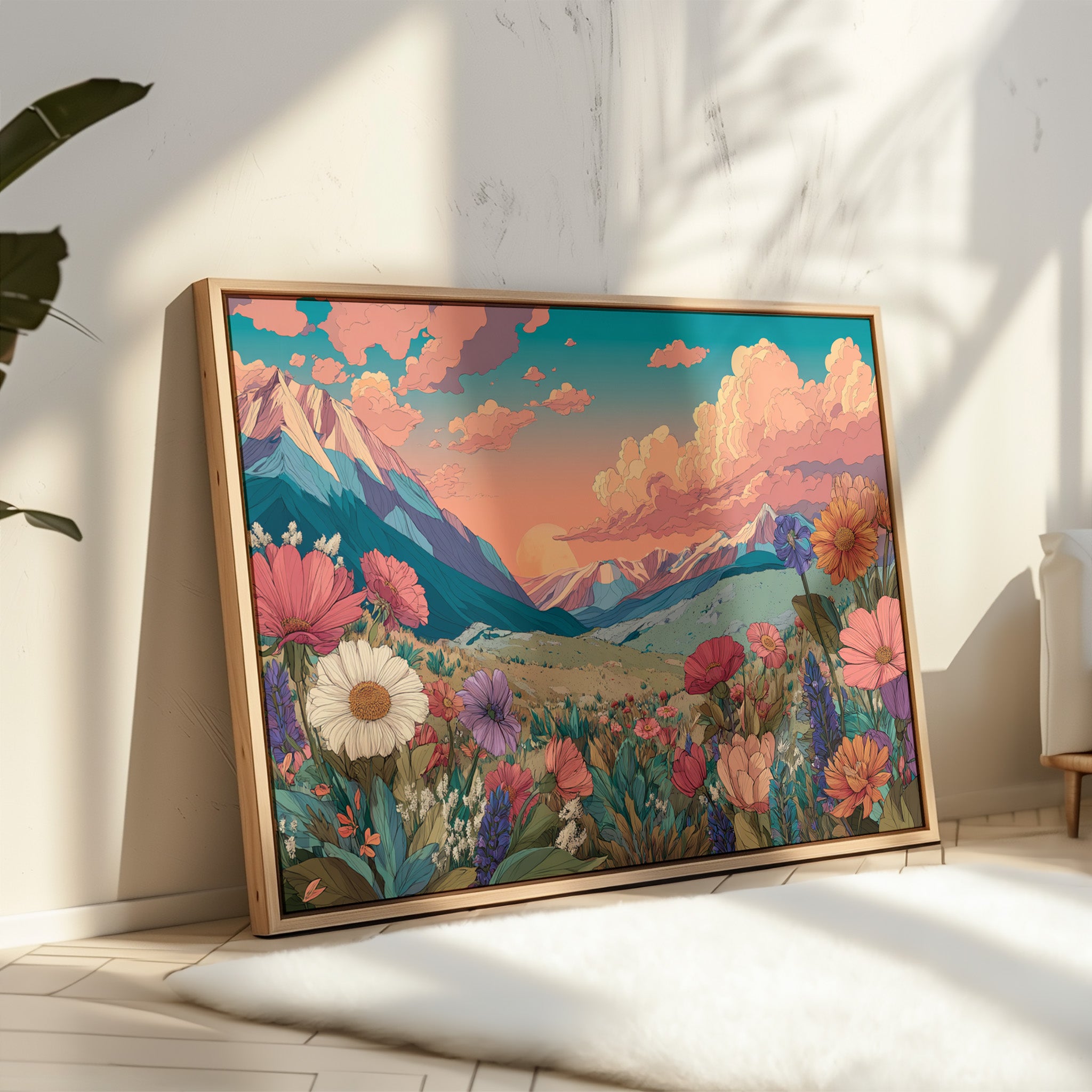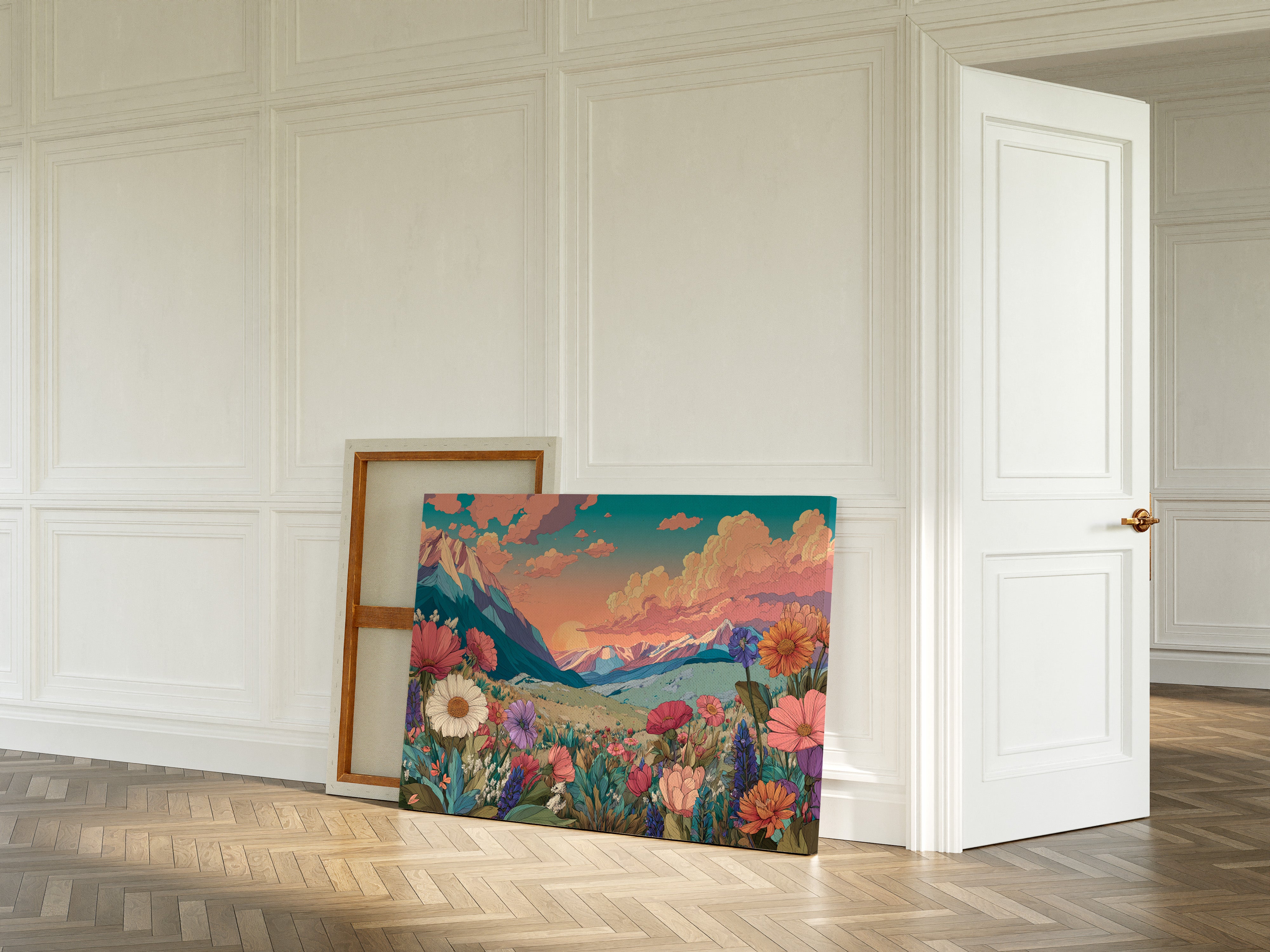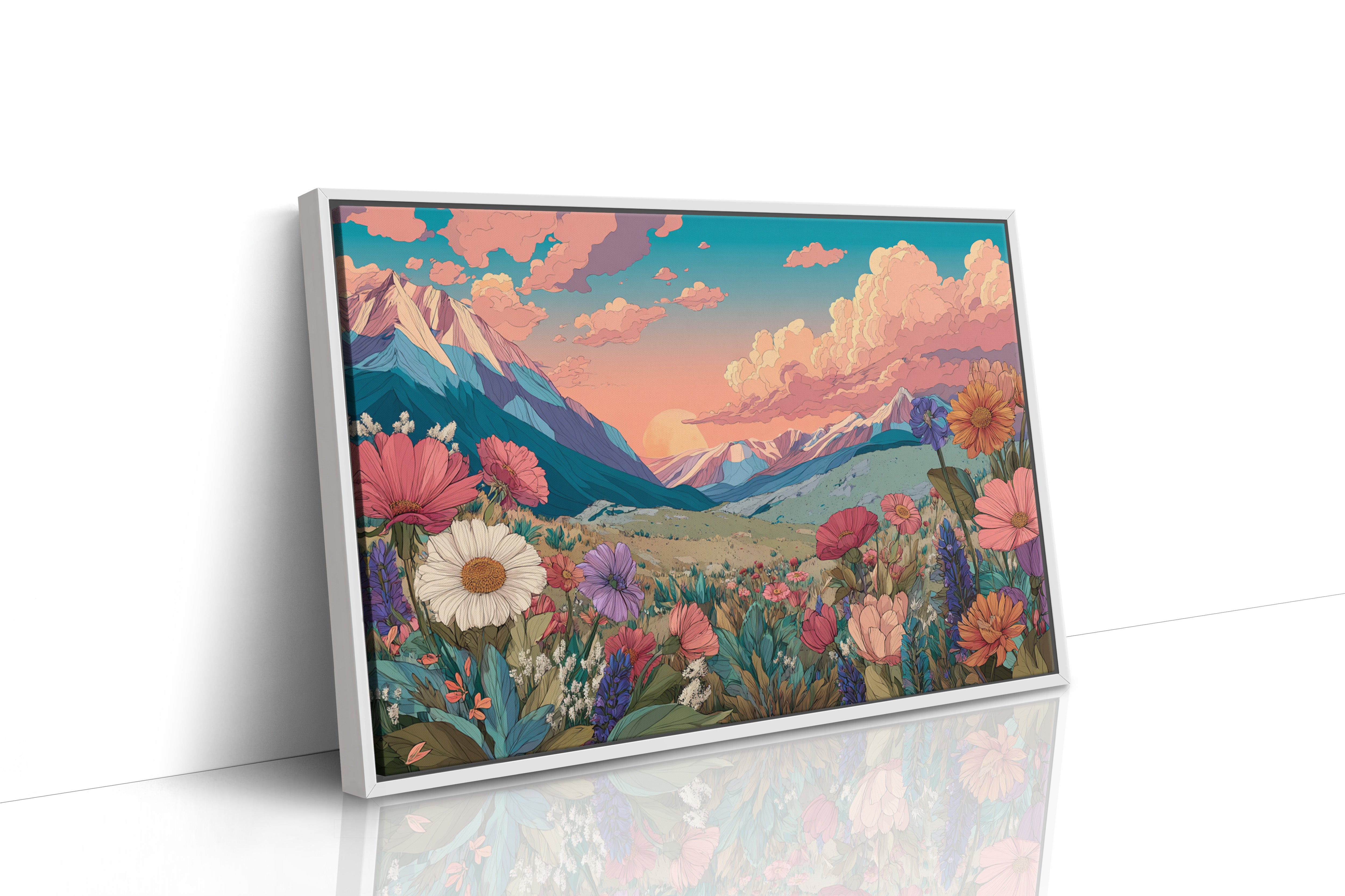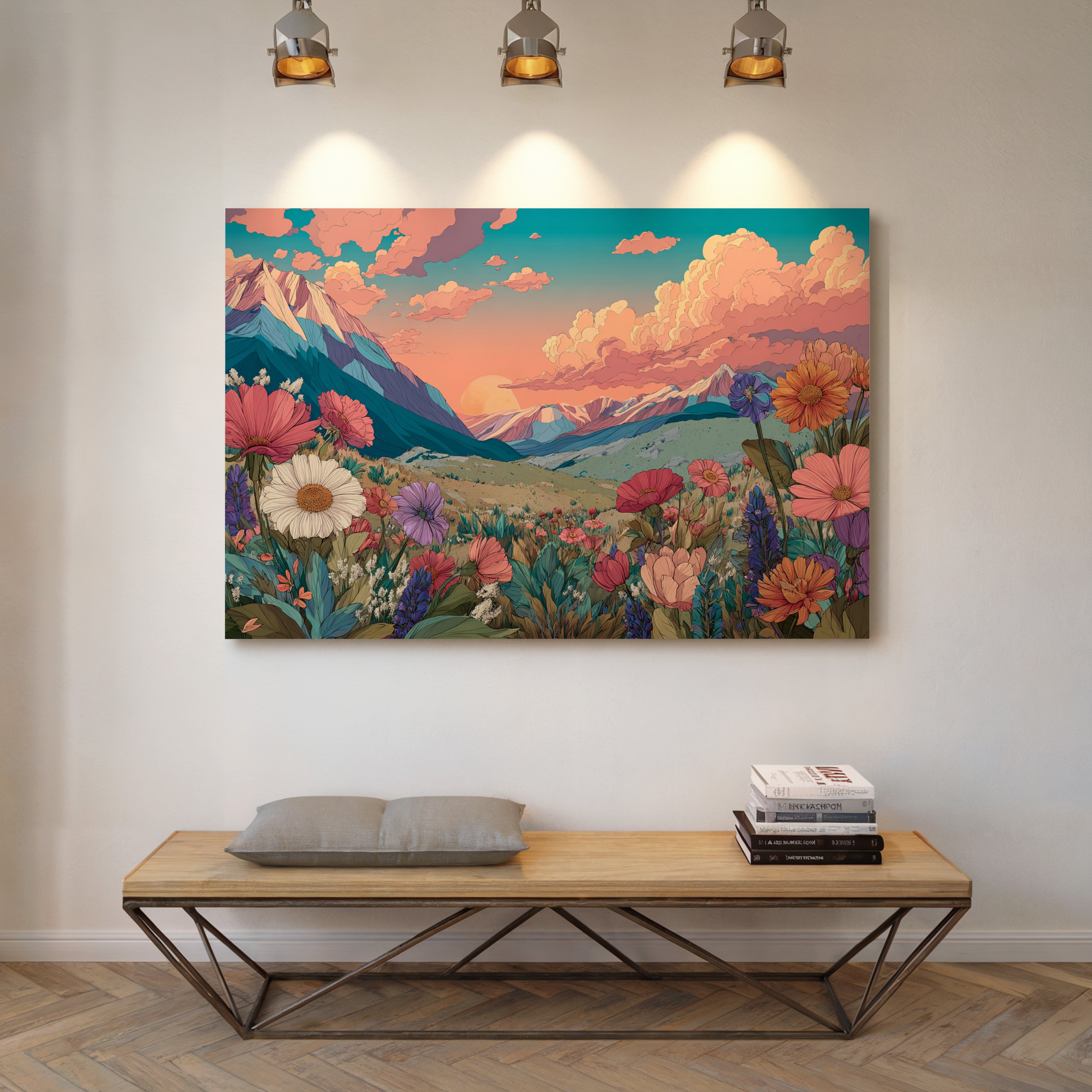 Wild daisies and cosmos dance in an alpine meadow, their petals catching the warm glow of a setting sun. The scene unfolds like a cherished memory, where coral-tinged clouds drift lazily across a turquoise sky. Majestic peaks rise in layers of teal and purple, their snow-capped summits reflecting the day's final rays, while delicate wildflowers in shades of coral, white, and indigo create a natural garden in the foreground. This dreamy landscape captures the fleeting magic of high-country summers.