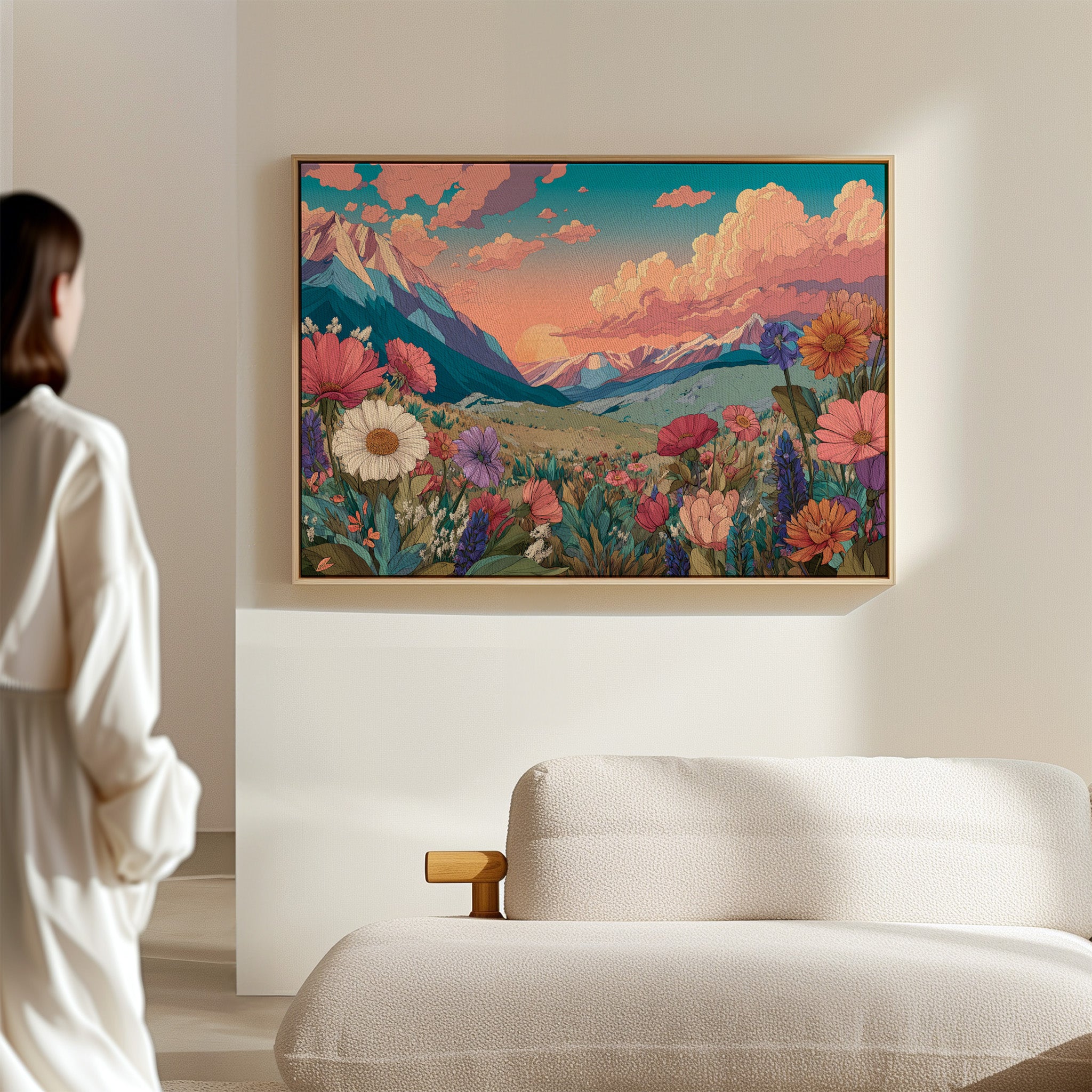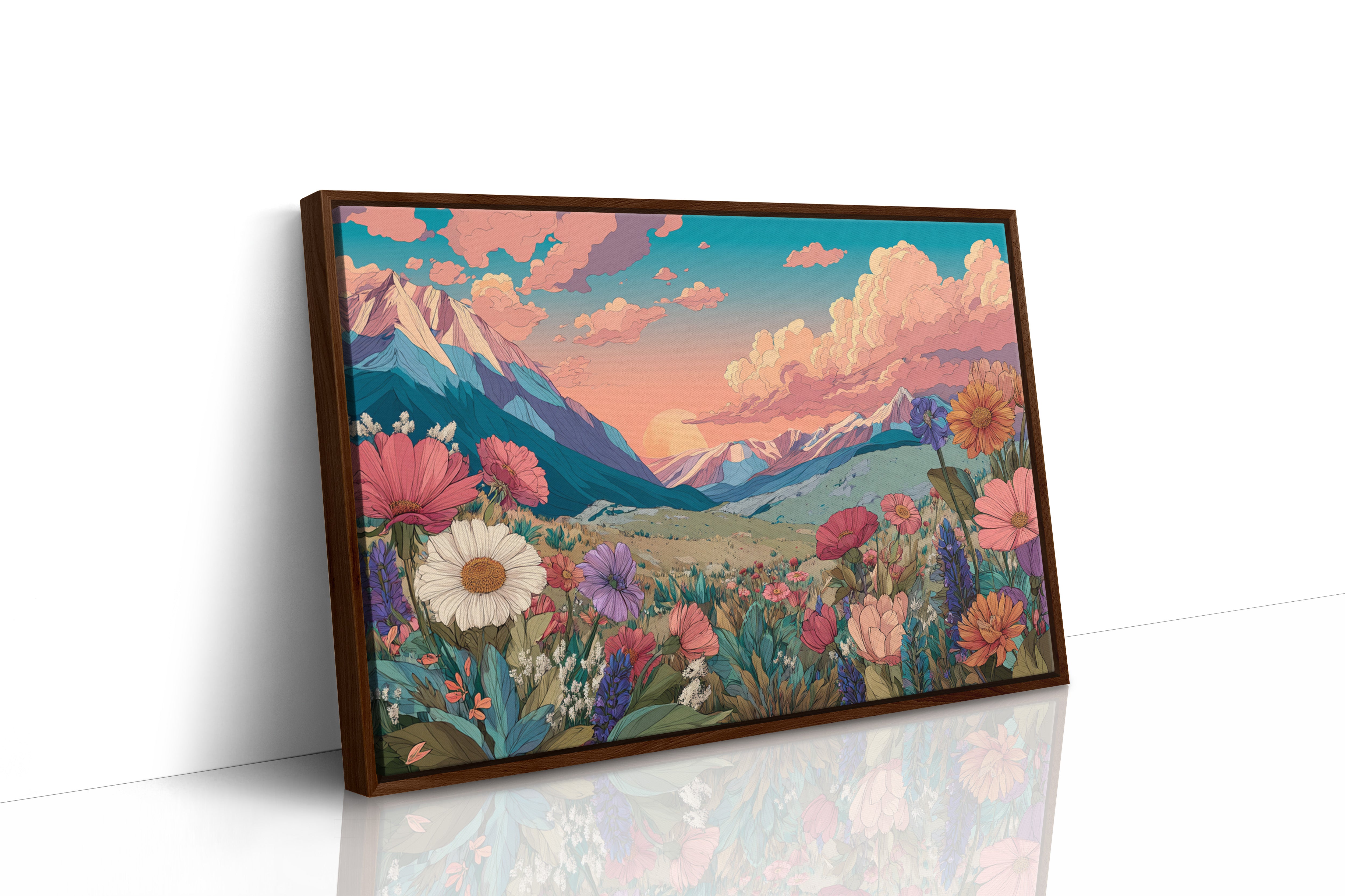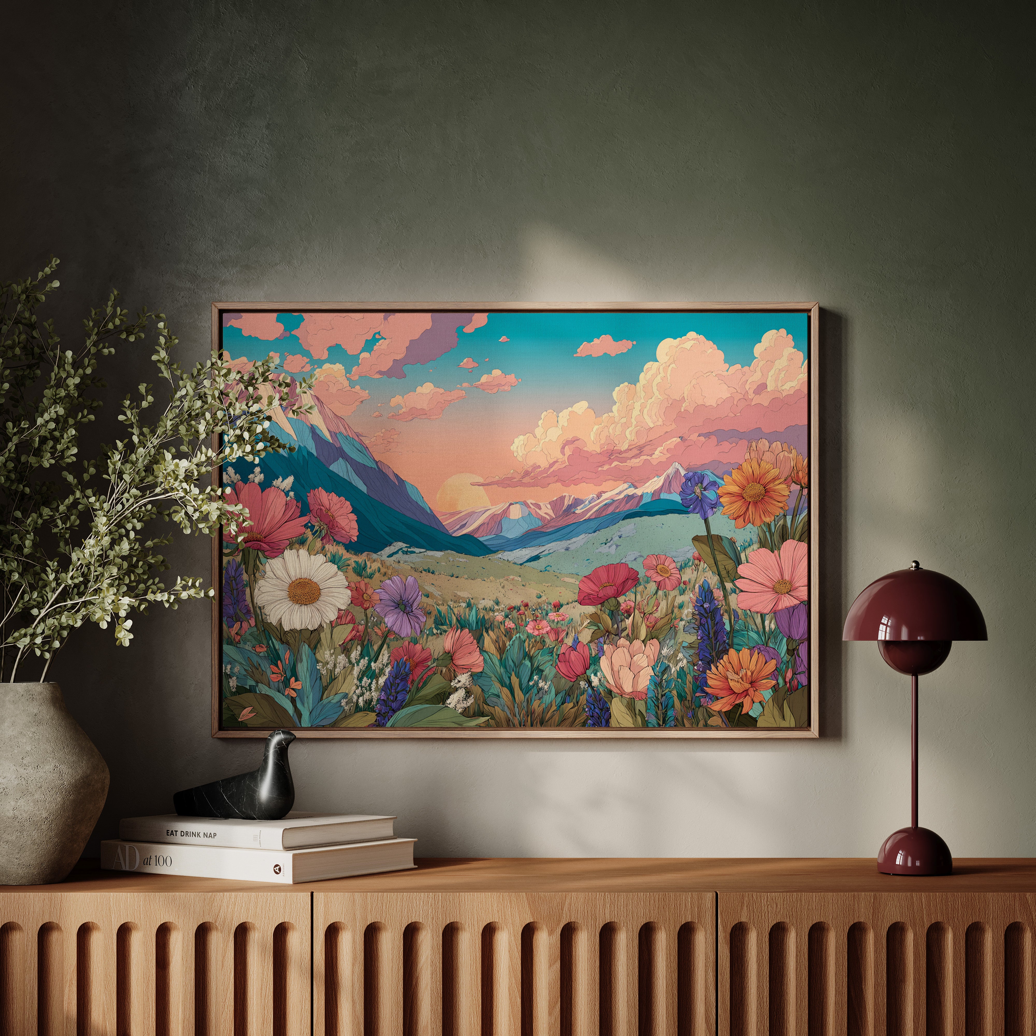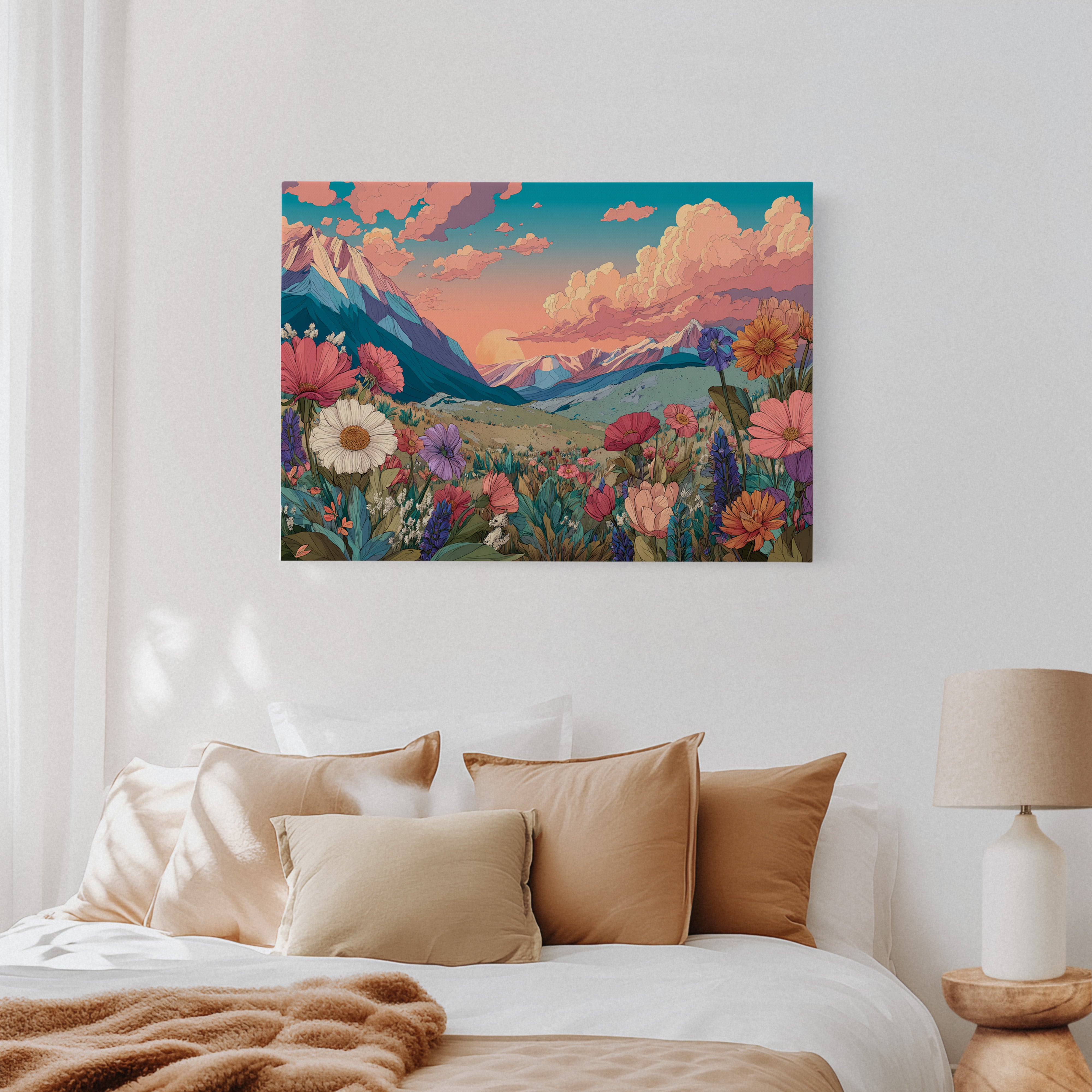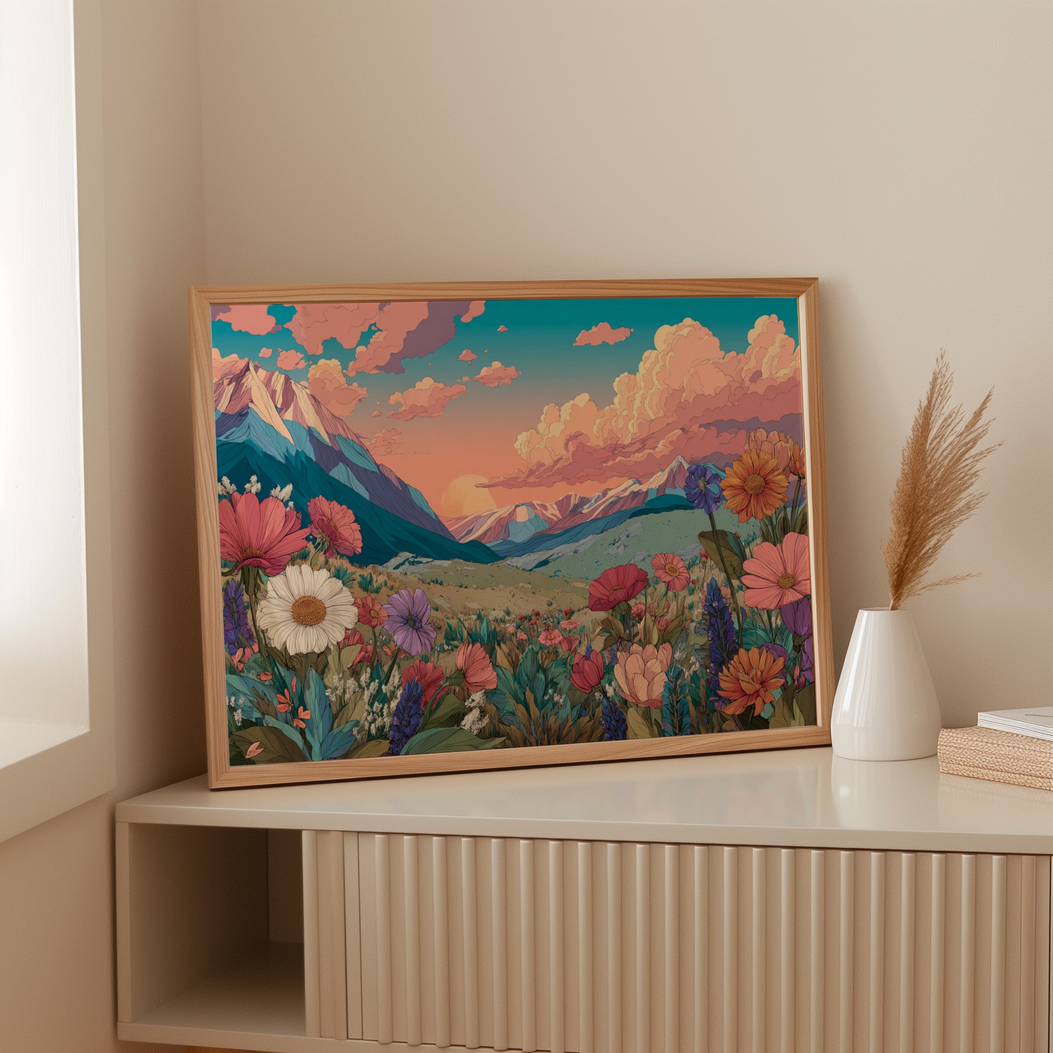 Wild daisies and cosmos dance in an alpine meadow, their petals catching the warm glow of a setting sun. The scene unfolds like a cherished memory, where coral-tinged clouds drift lazily across a turquoise sky. Majestic peaks rise in layers of teal and purple, their snow-capped summits reflecting the day's final rays, while delicate wildflowers in shades of coral, white, and indigo create a natural garden in the foreground. This dreamy landscape captures the fleeting magic of high-country summers.