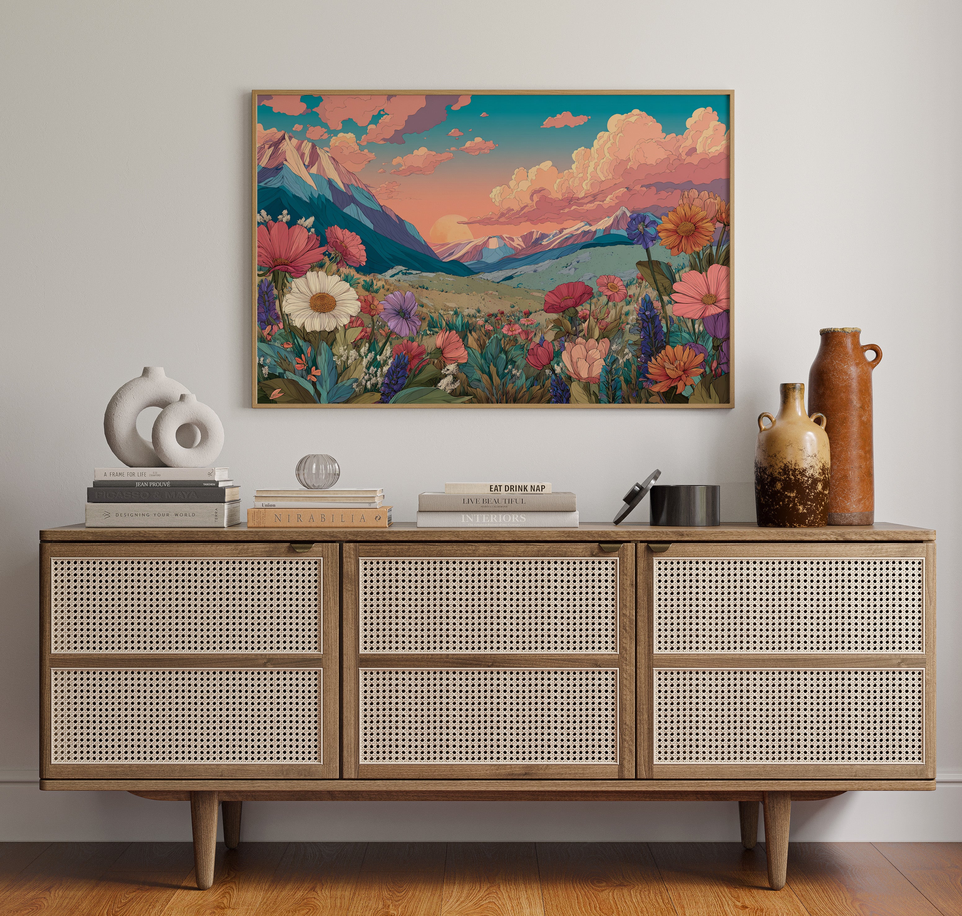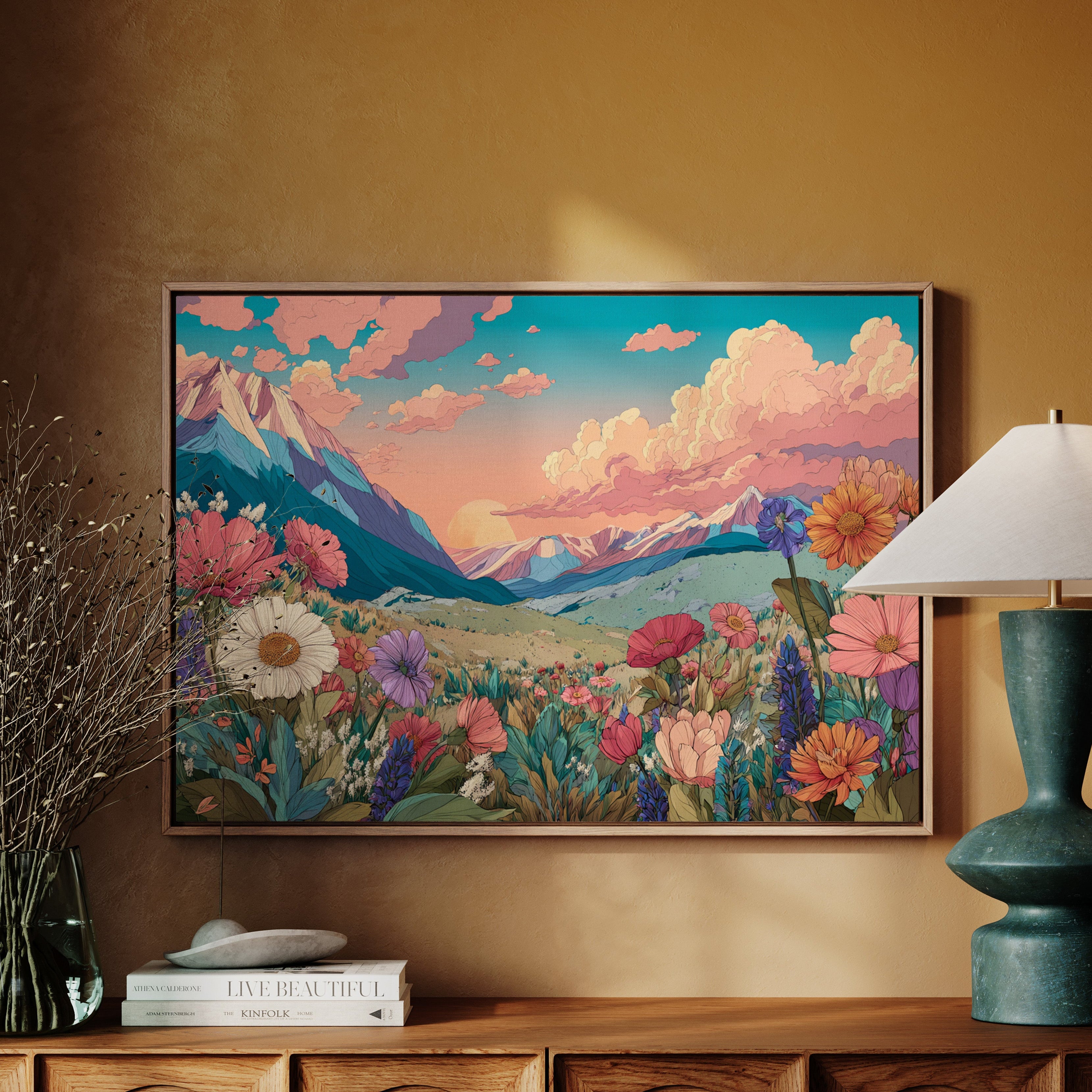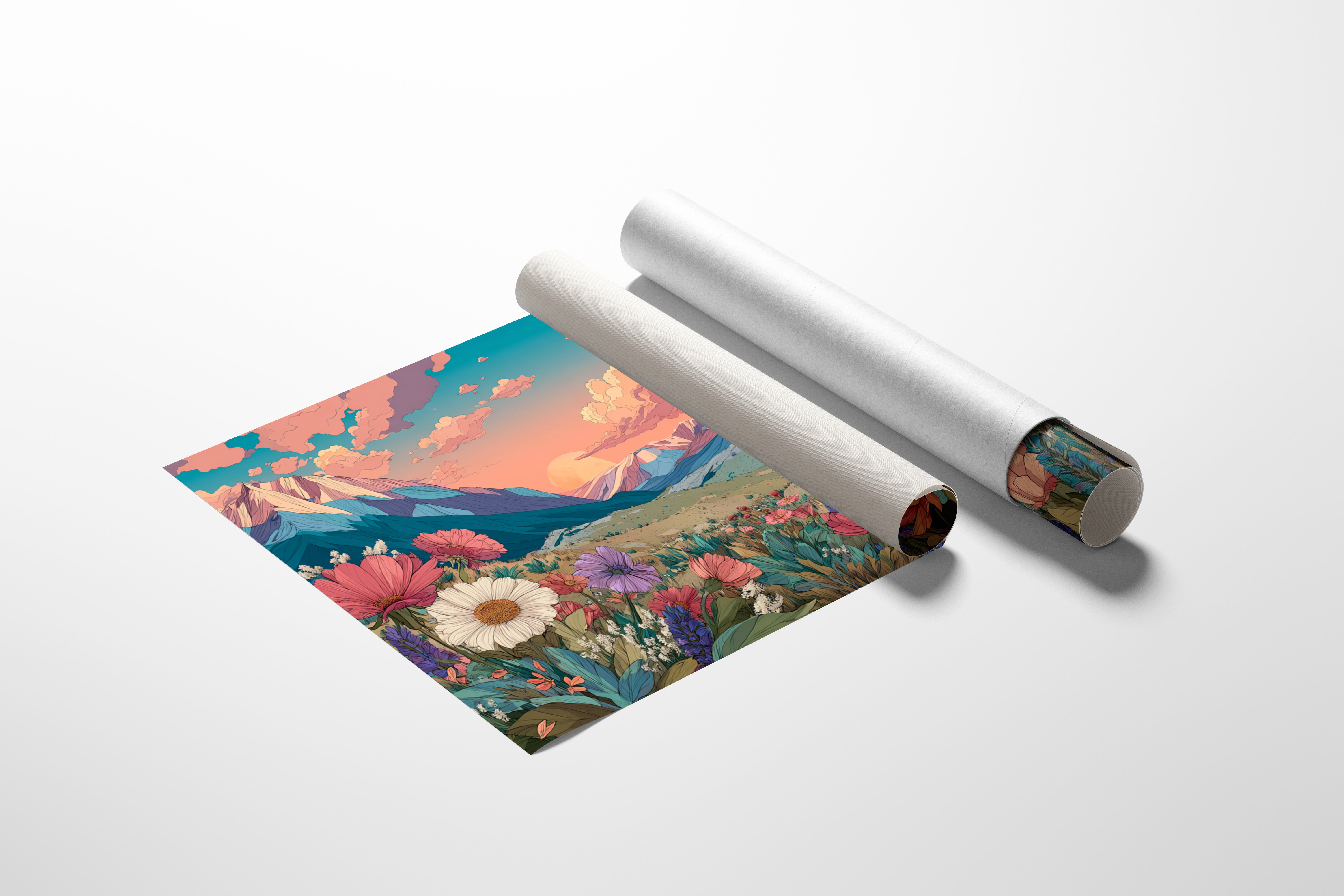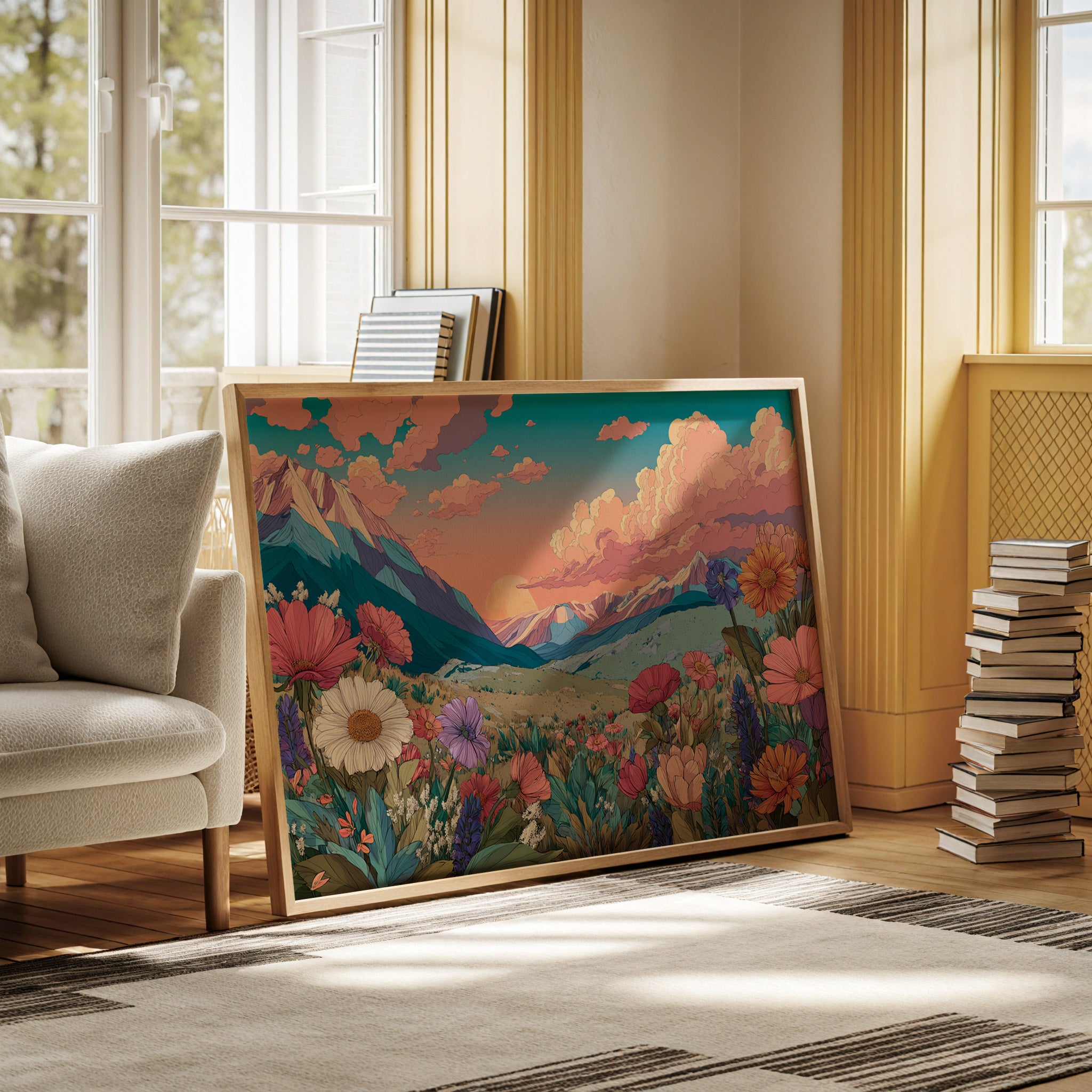 Wild daisies and cosmos dance in an alpine meadow, their petals catching the warm glow of a setting sun. The scene unfolds like a cherished memory, where coral-tinged clouds drift lazily across a turquoise sky. Majestic peaks rise in layers of teal and purple, their snow-capped summits reflecting the day's final rays, while delicate wildflowers in shades of coral, white, and indigo create a natural garden in the foreground. This dreamy landscape captures the fleeting magic of high-country summers.