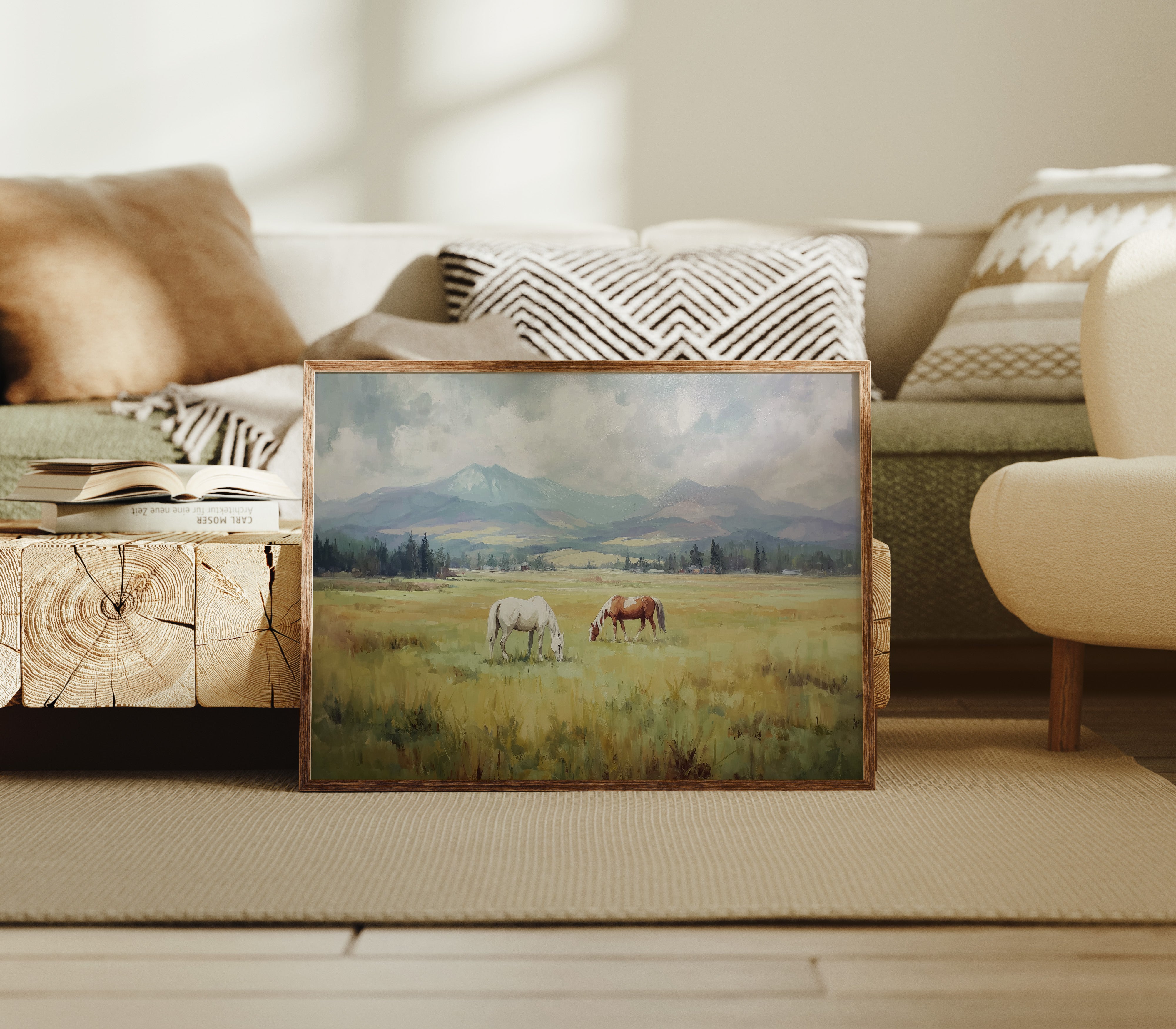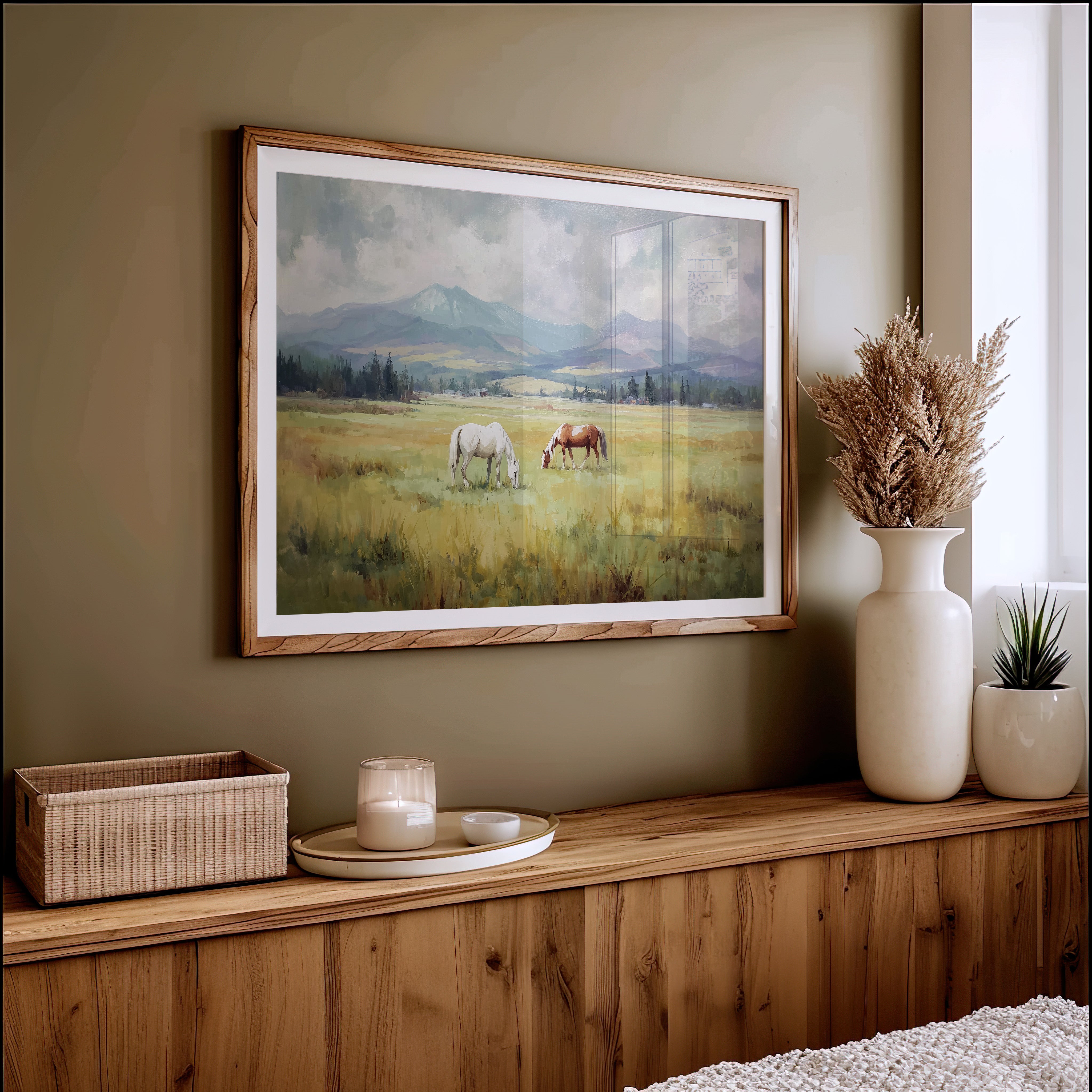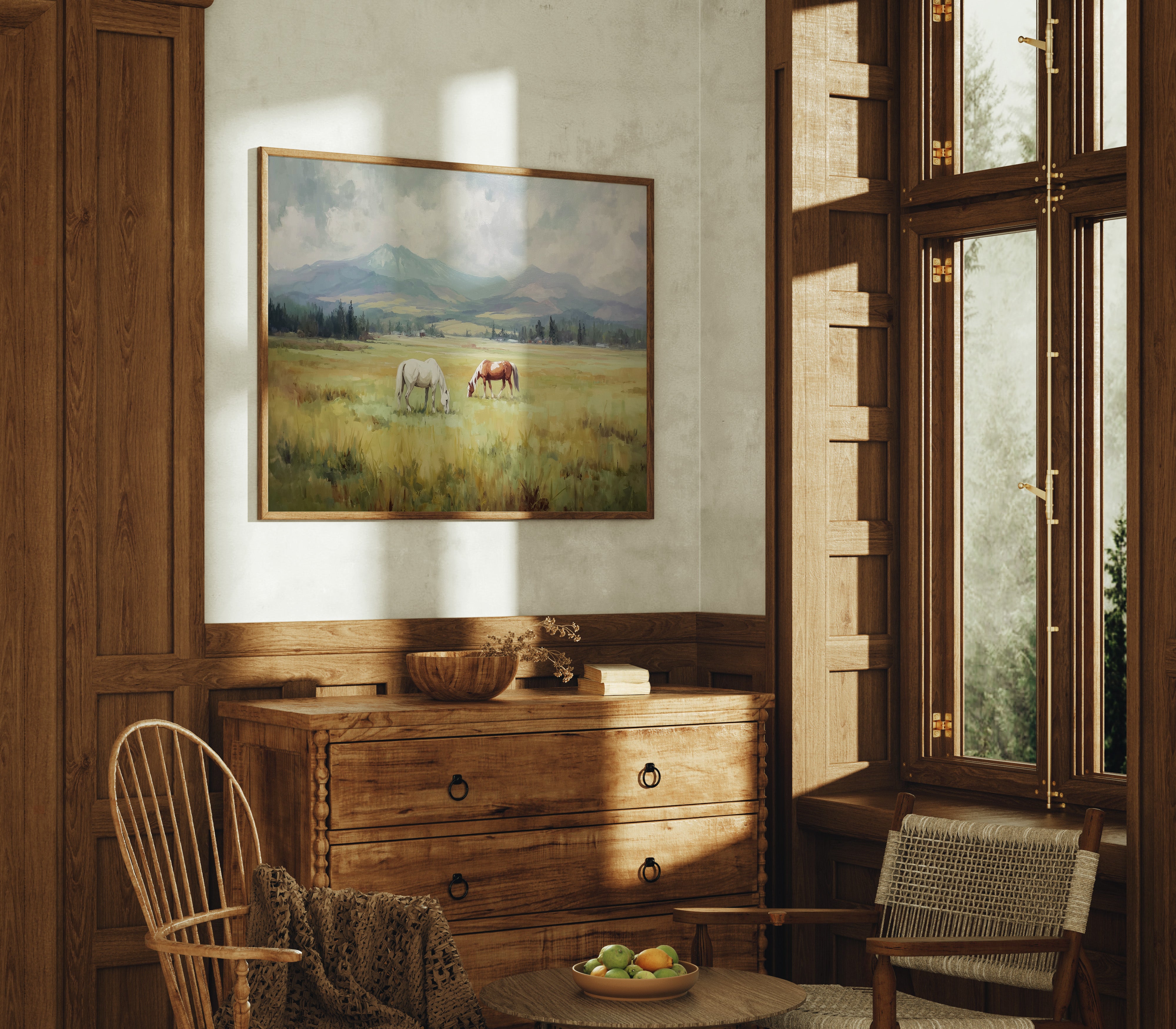 Golden prairie grass sways beneath towering peaks, where two horses graze in perfect contentment. This contemporary landscape captures the serene dialogue between earth and sky. The composition balances the majestic scale of distant mountains with intimate details of wild grasses and grazing horses, painted in soft sage greens and warm honey tones. The scene speaks to the timeless connection between wild spaces and the creatures who call them home. A perfect focal point for living rooms or offices seeking to bring the tranquility of wide-open spaces indoors.