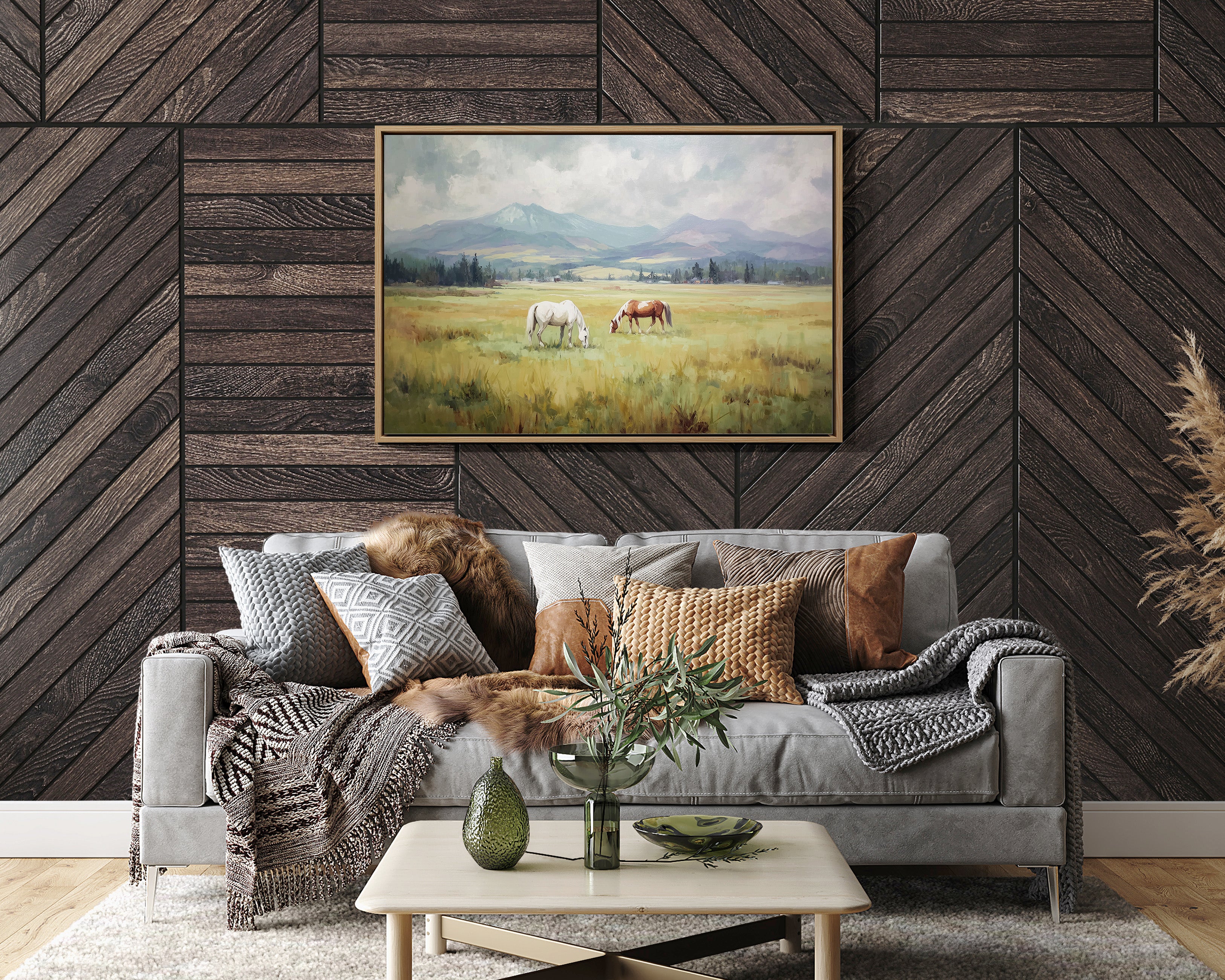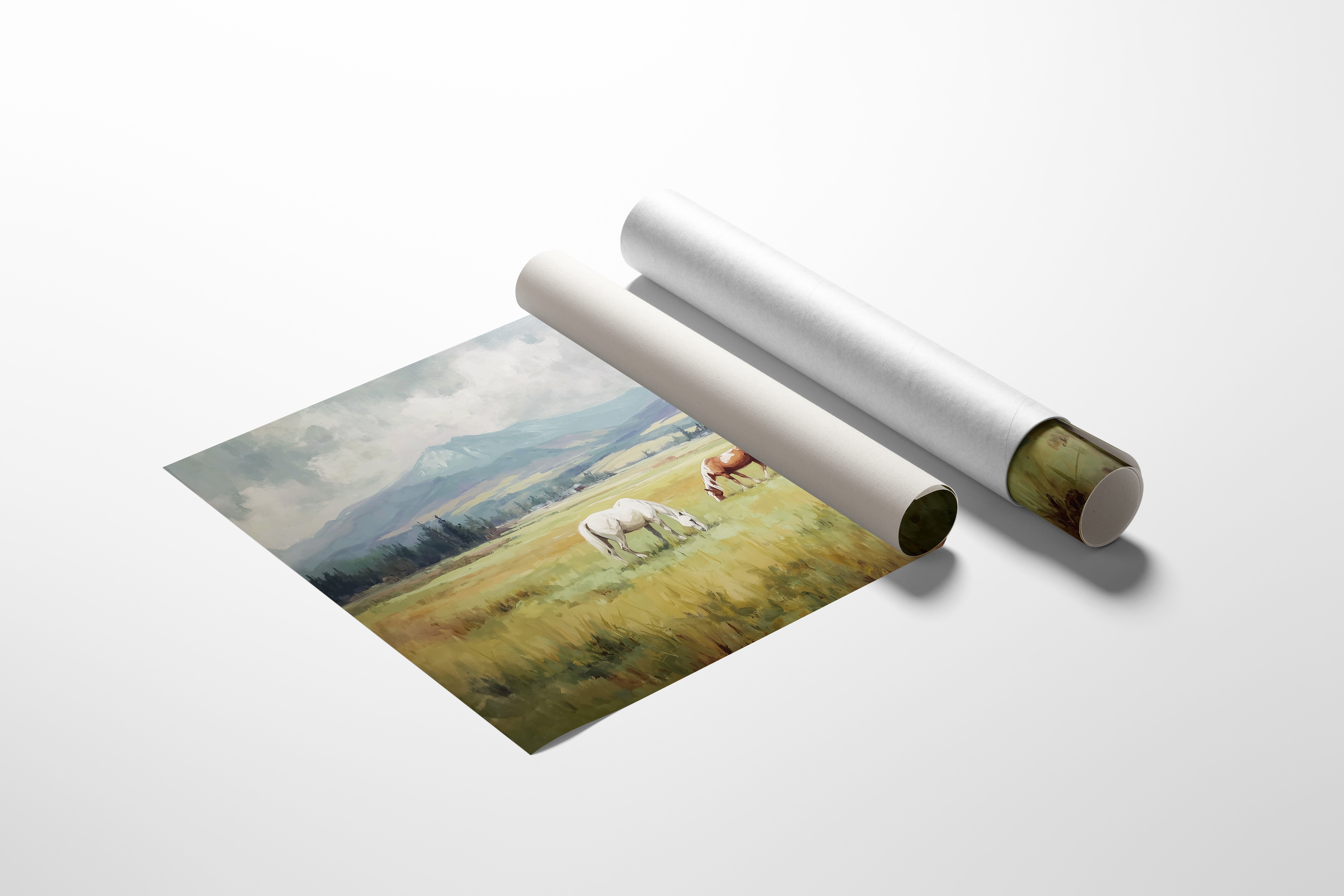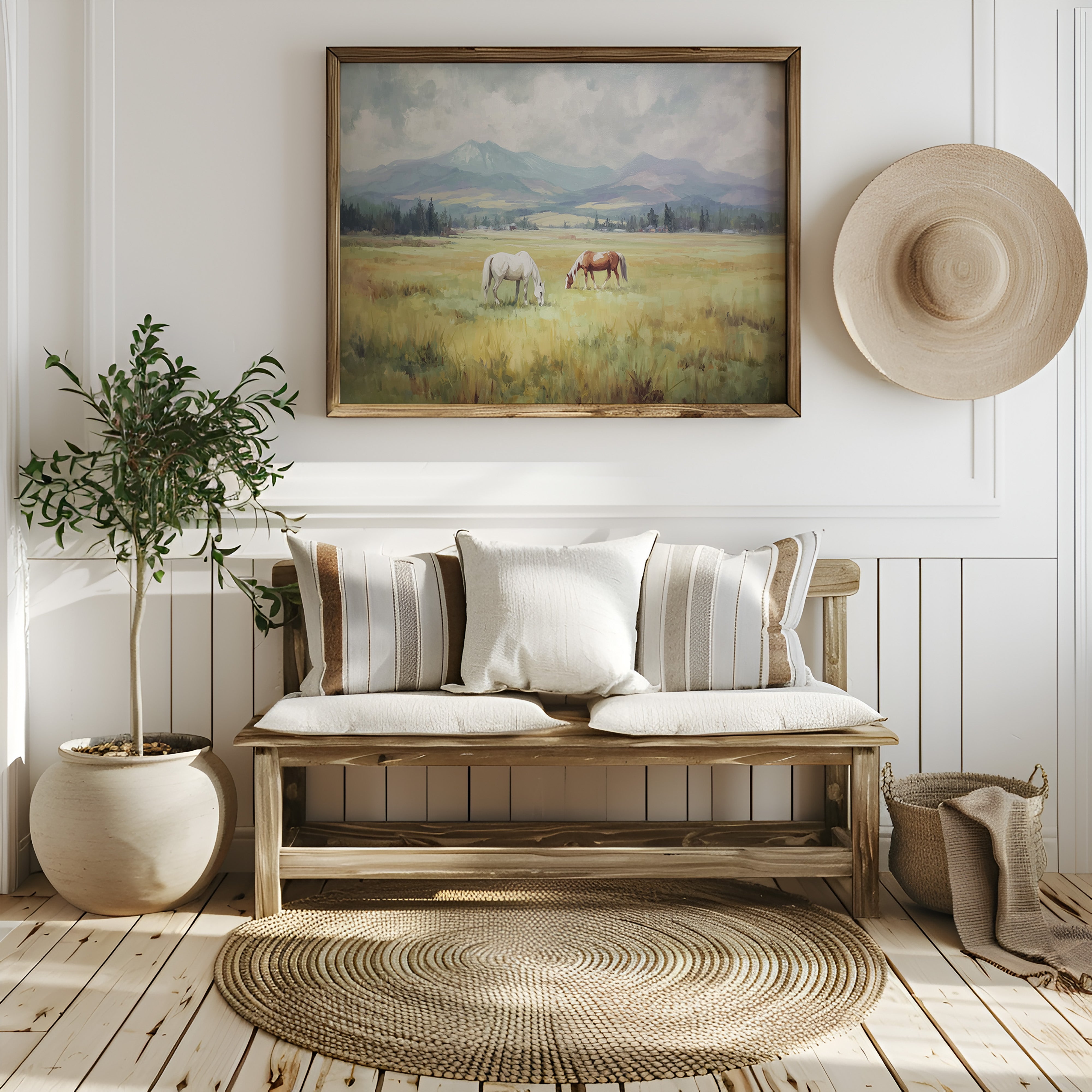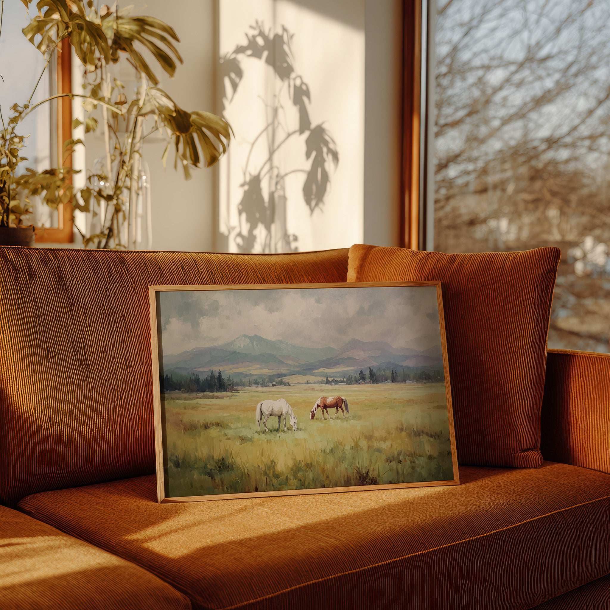 Golden prairie grass sways beneath towering peaks, where two horses graze in perfect contentment. This contemporary landscape captures the serene dialogue between earth and sky. The composition balances the majestic scale of distant mountains with intimate details of wild grasses and grazing horses, painted in soft sage greens and warm honey tones. The scene speaks to the timeless connection between wild spaces and the creatures who call them home. A perfect focal point for living rooms or offices seeking to bring the tranquility of wide-open spaces indoors.