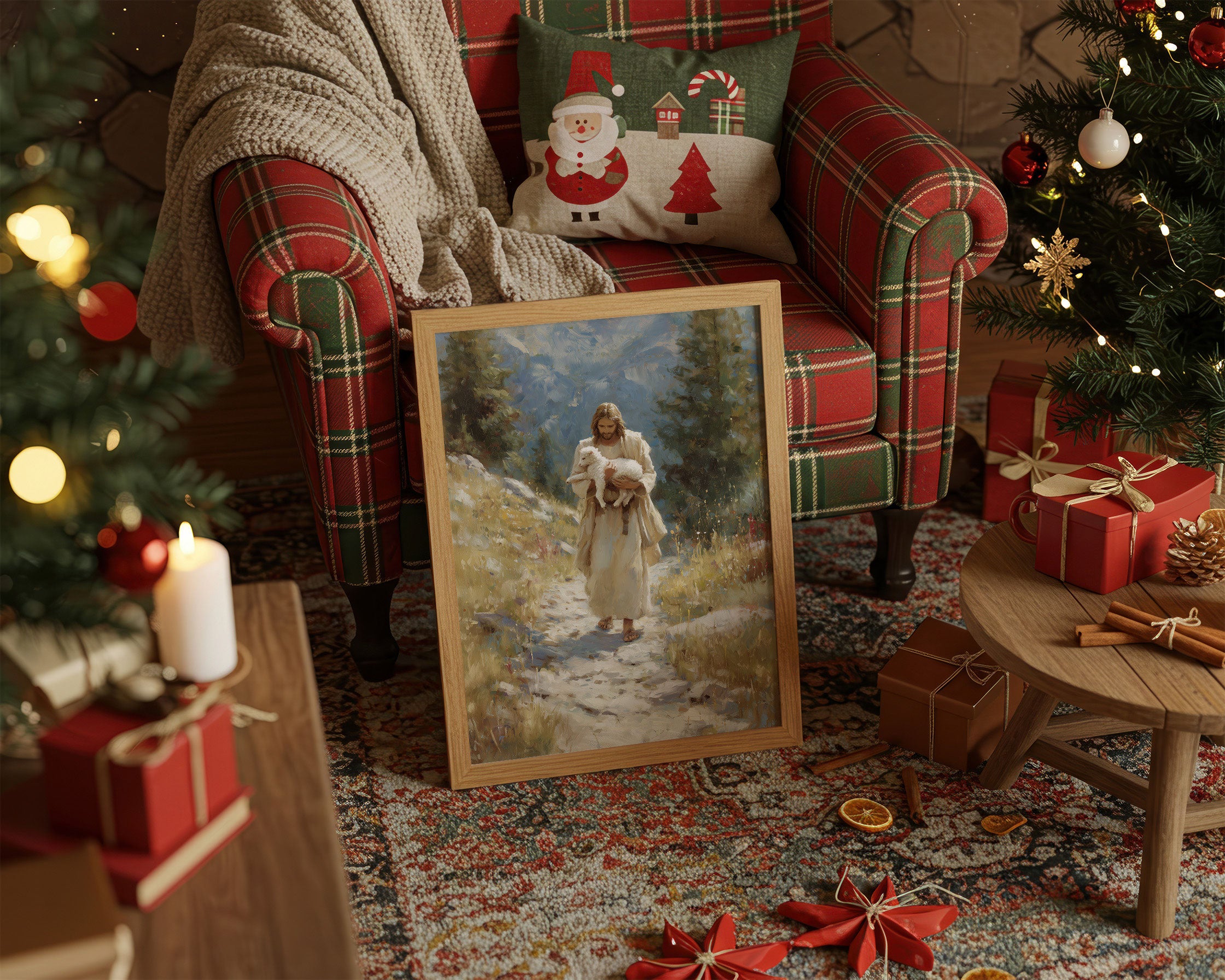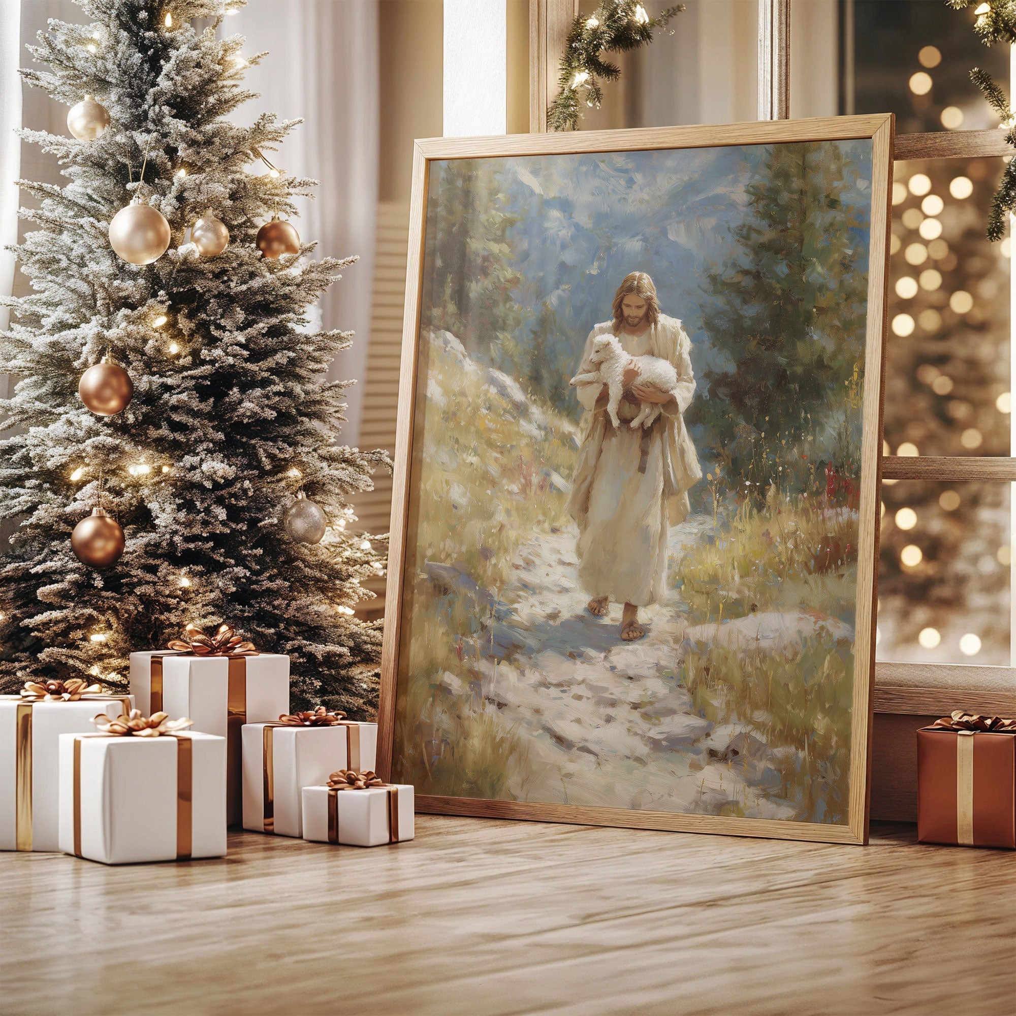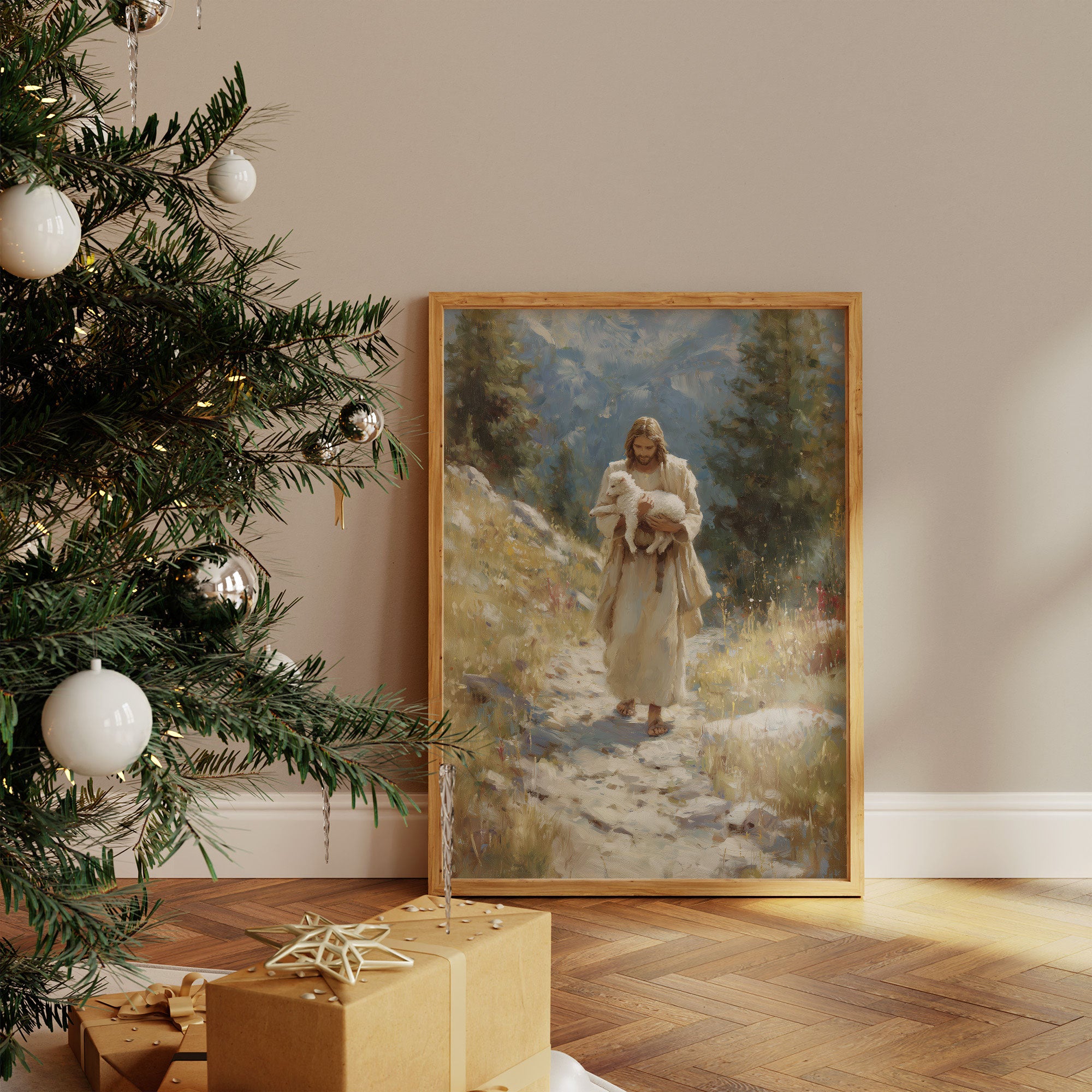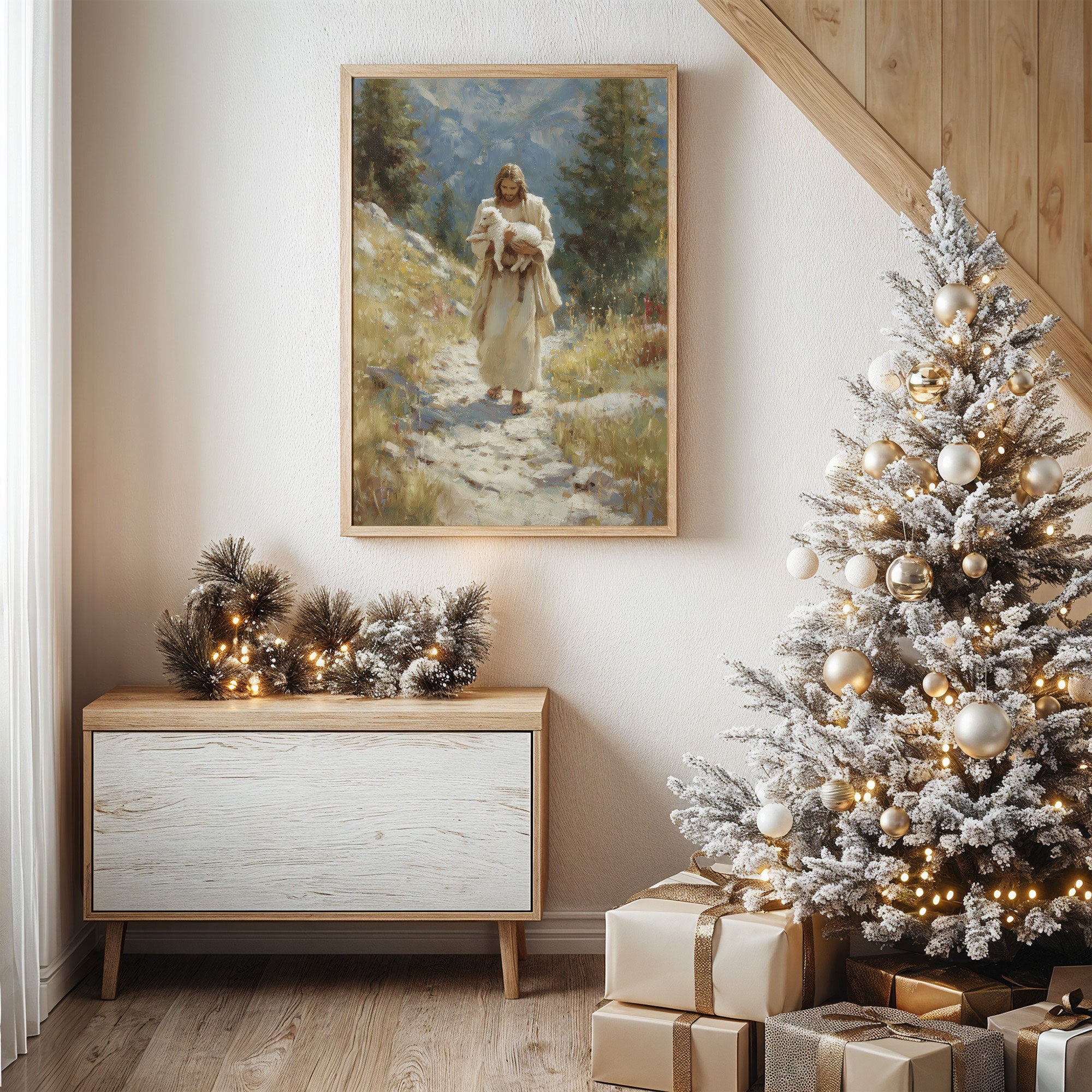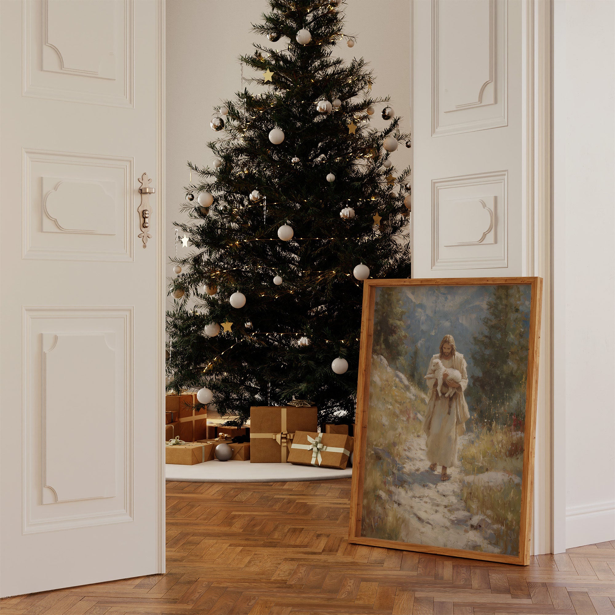 Soft winter light streams through sheer curtains, casting gentle shadows across a serene corner vignette. A classic painting in muted earth tones hangs above a minimalist wooden bench, while a luminous white Christmas tree adds a magical glow to the space. The scene marries contemporary simplicity with timeless holiday warmth, creating a meditation on light and shadow. This thoughtful arrangement transforms an everyday corner into a sanctuary of calm, where modern design meets seasonal celebration.