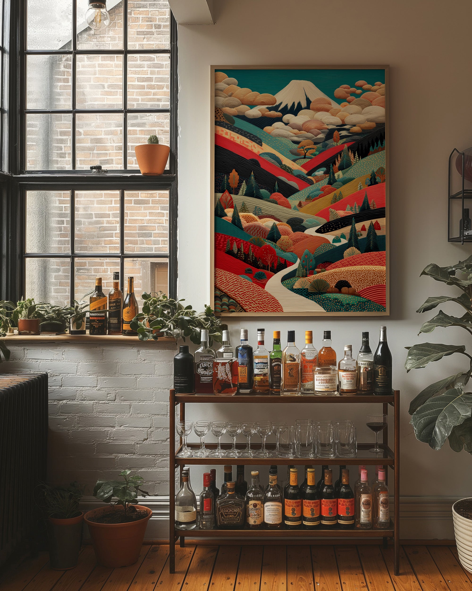 A winding river cuts through a vibrant landscape, leading the eye on an enchanted journey toward a snow-capped peak. Rich jewel tones of teal, coral, and gold create a tapestry of rolling hills and valleys, while stylized clouds dance above in warm peach hues. The contemporary Japanese-inspired composition transforms nature into a geometric celebration of pattern and form. This striking piece would bring bold energy and artistic sophistication to a modern living room or creative workspace, serving as both a conversation starter and a window into an imaginative world.