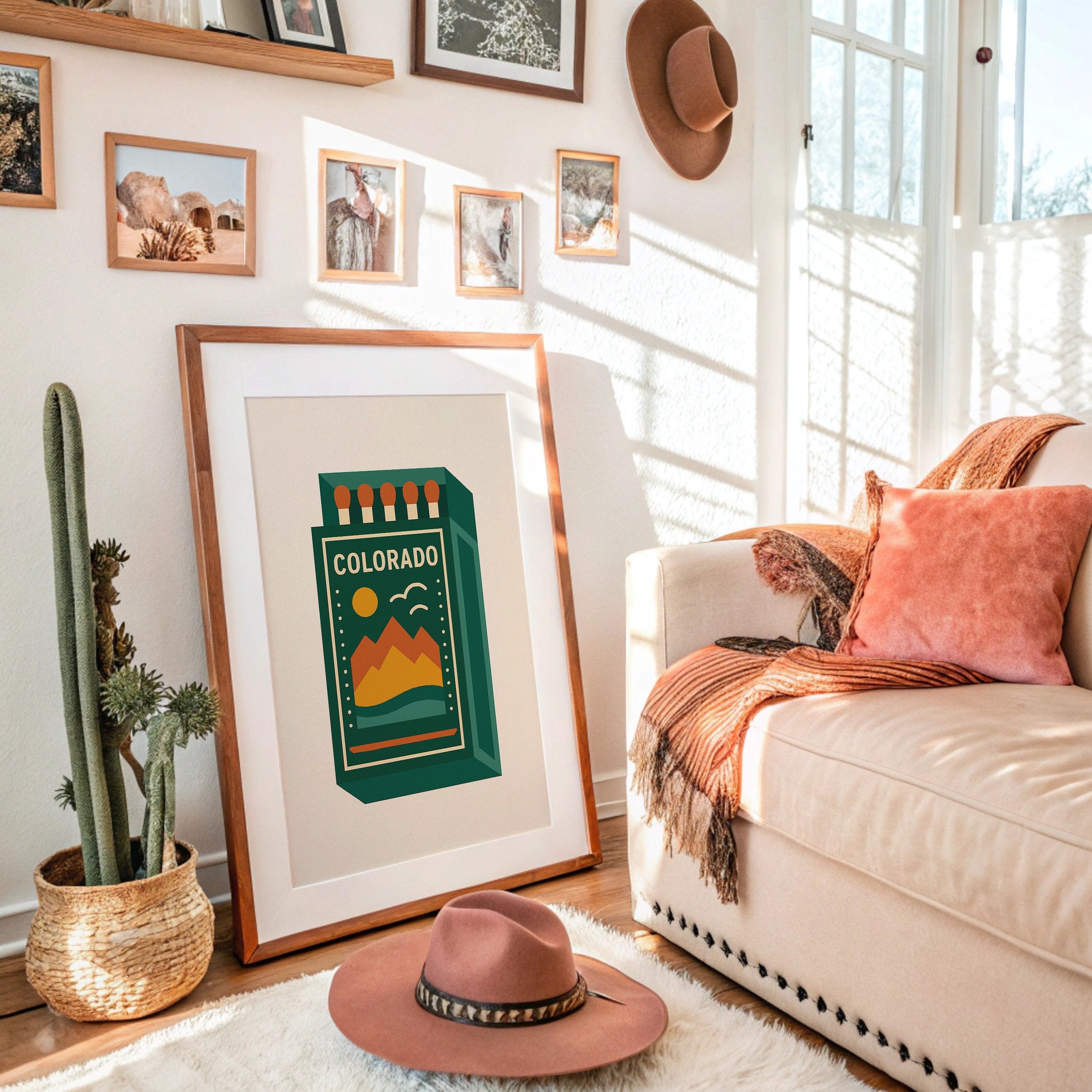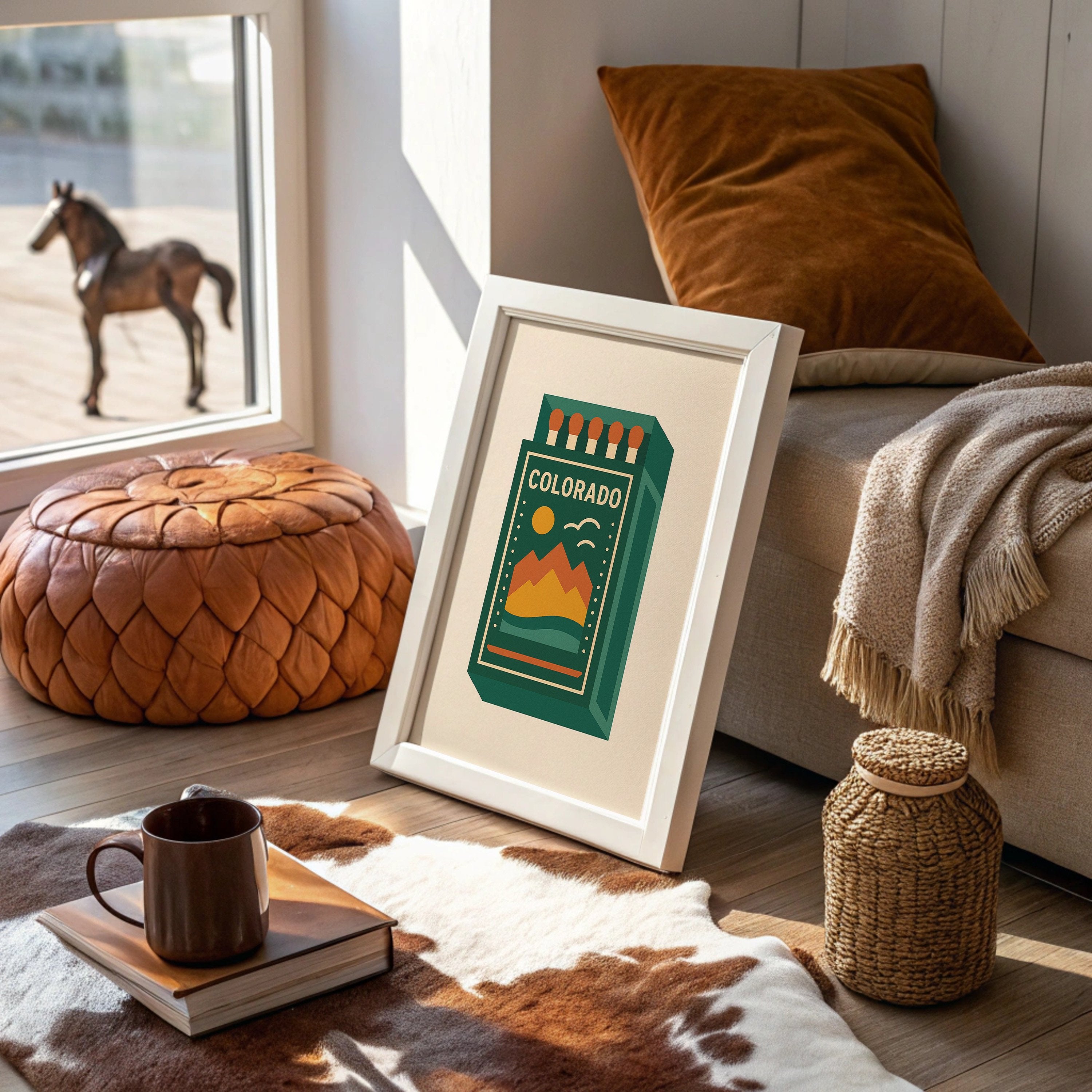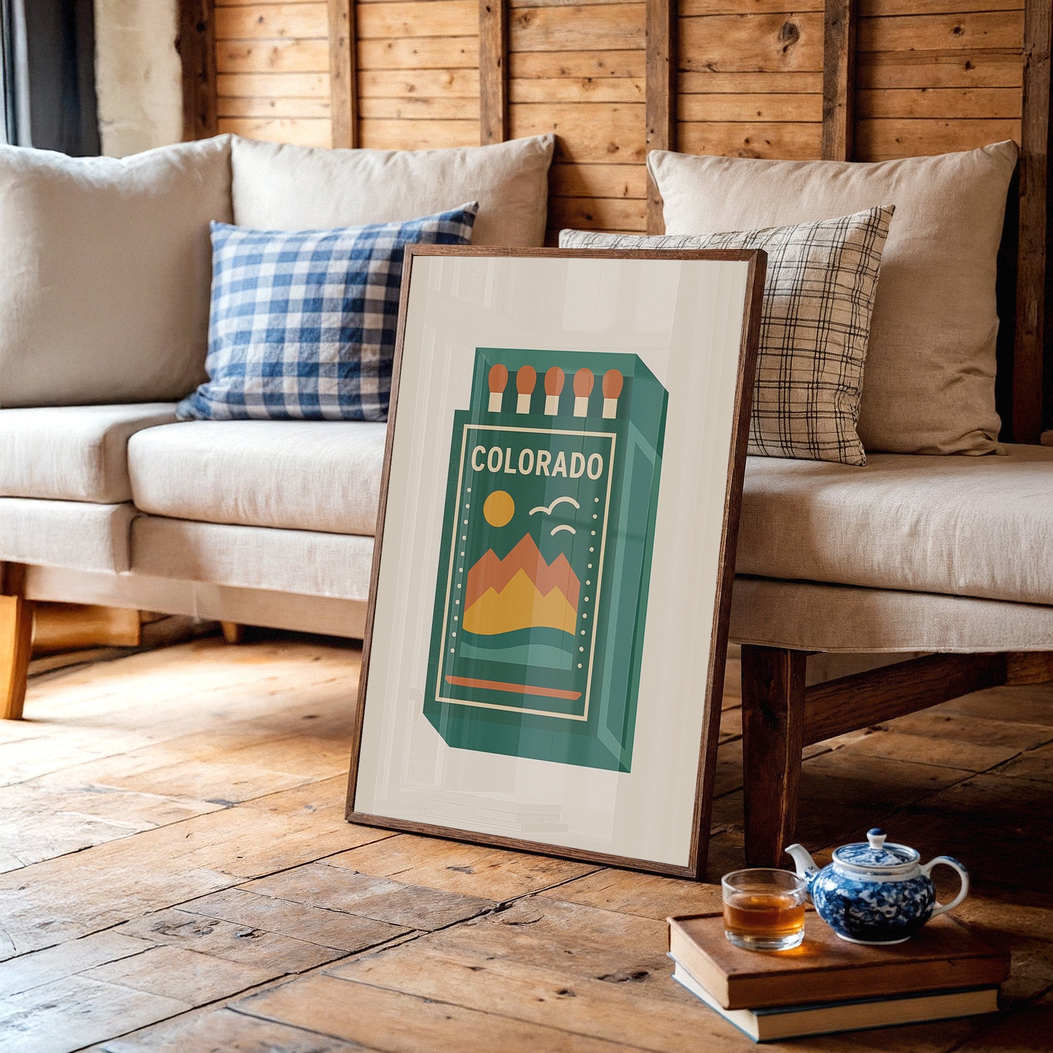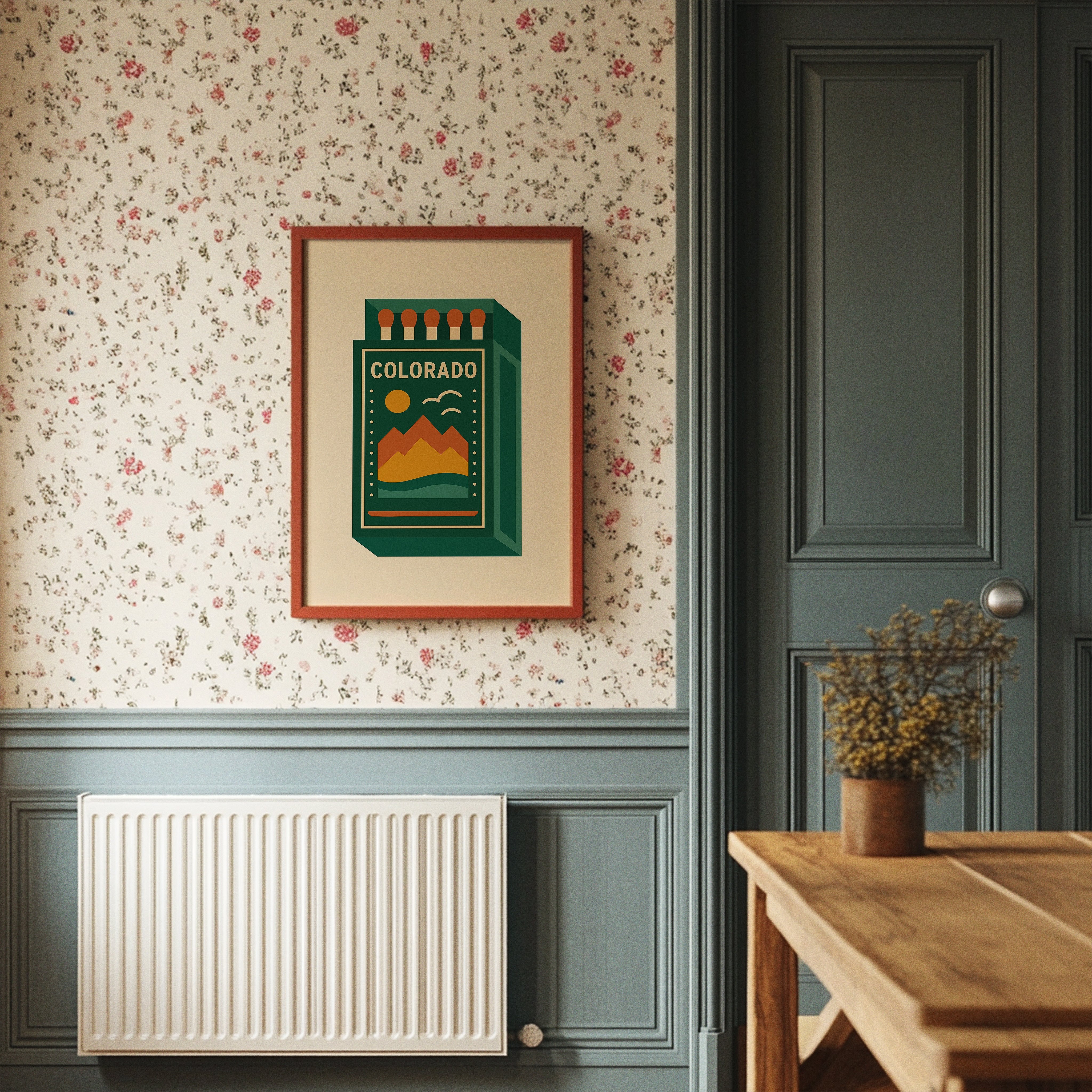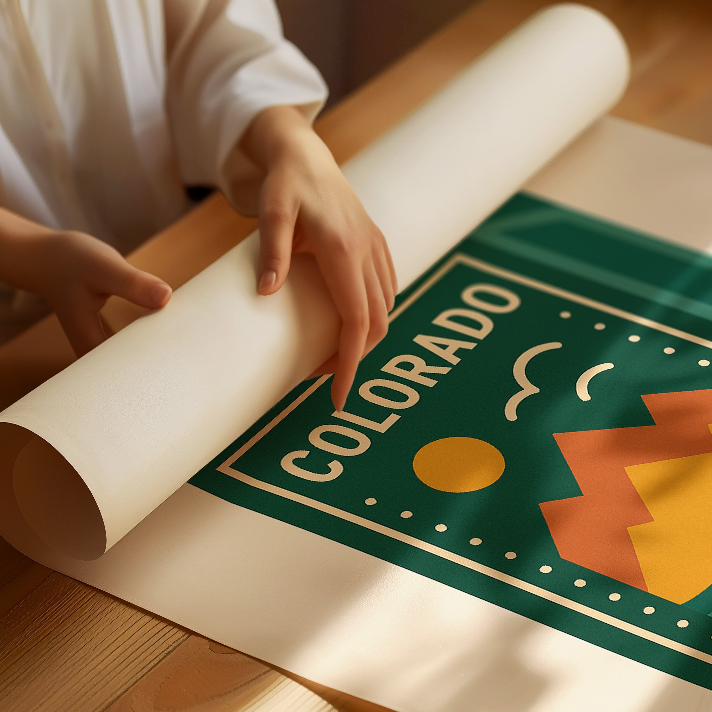 Nostalgia strikes like a match against emerald green, igniting memories of alpine adventures. The minimalist illustration captures Colorado's essence through geometric mountain ridges in warm terracotta and golden hues, set against a forest green backdrop where simplified birds soar beneath a perfect circular sun. This contemporary take on vintage travel ephemera brings a touch of retro wanderlust to home office spaces or cozy reading nooks.