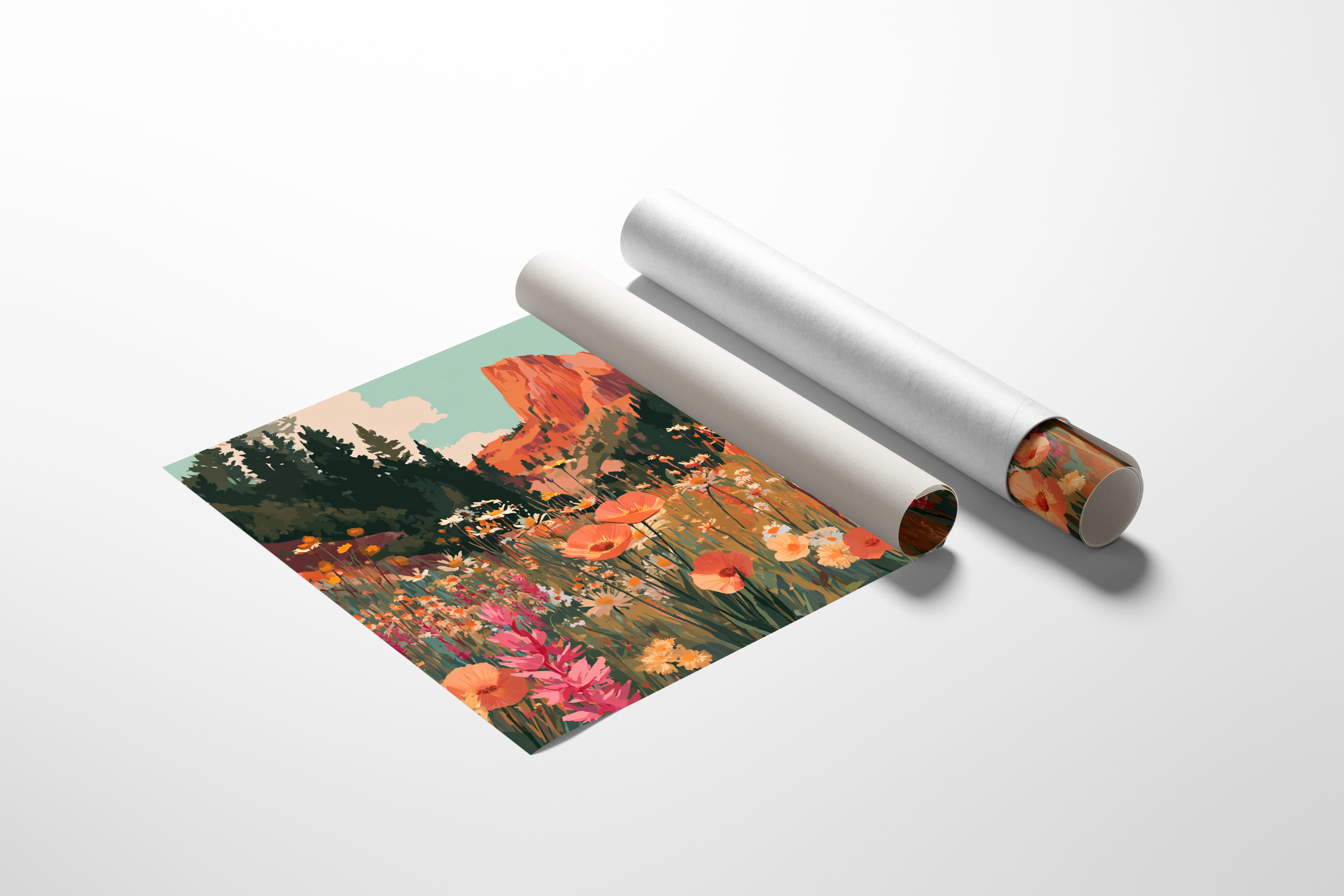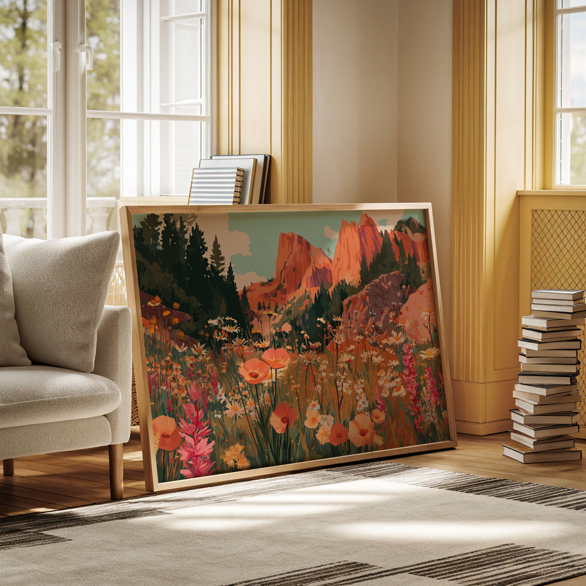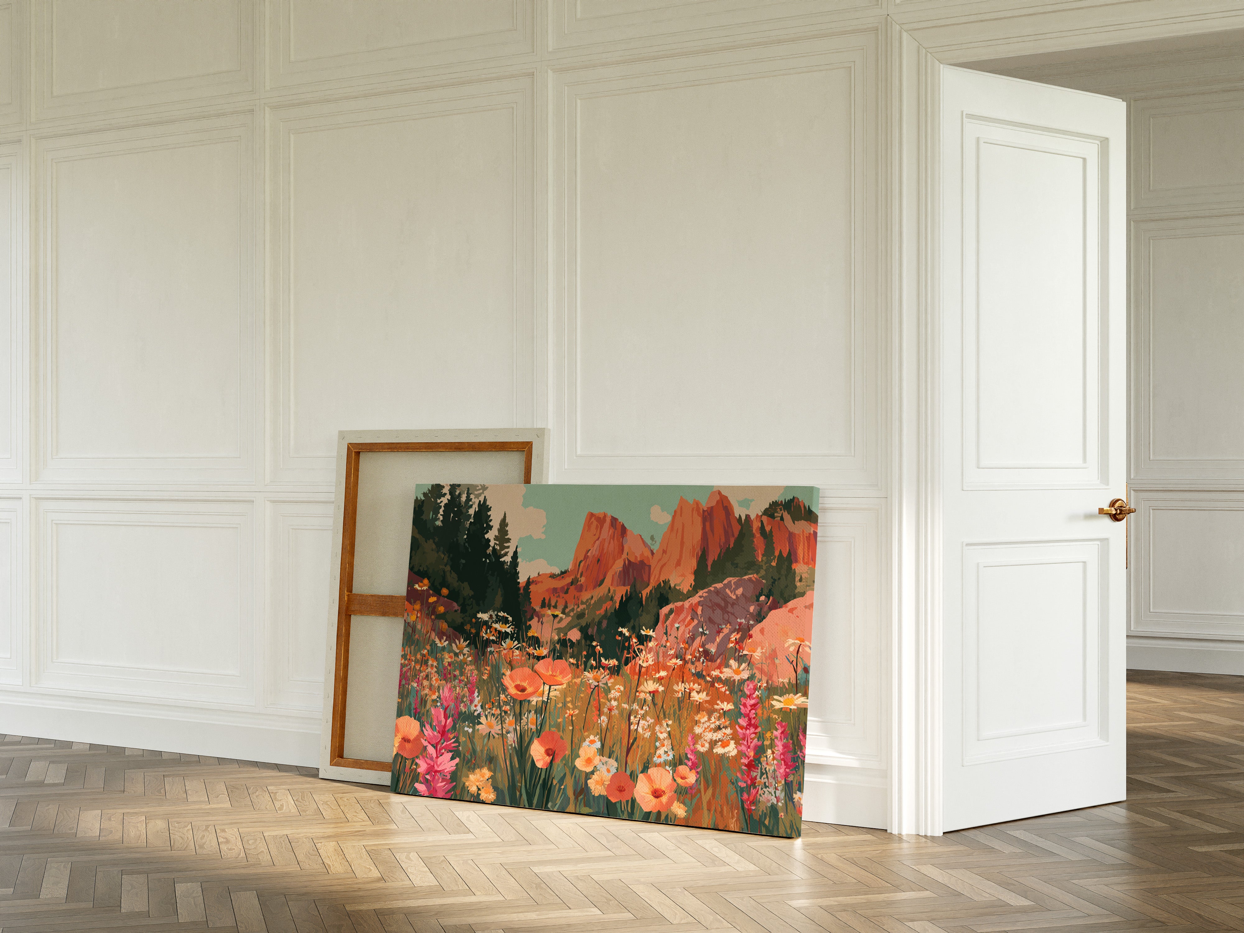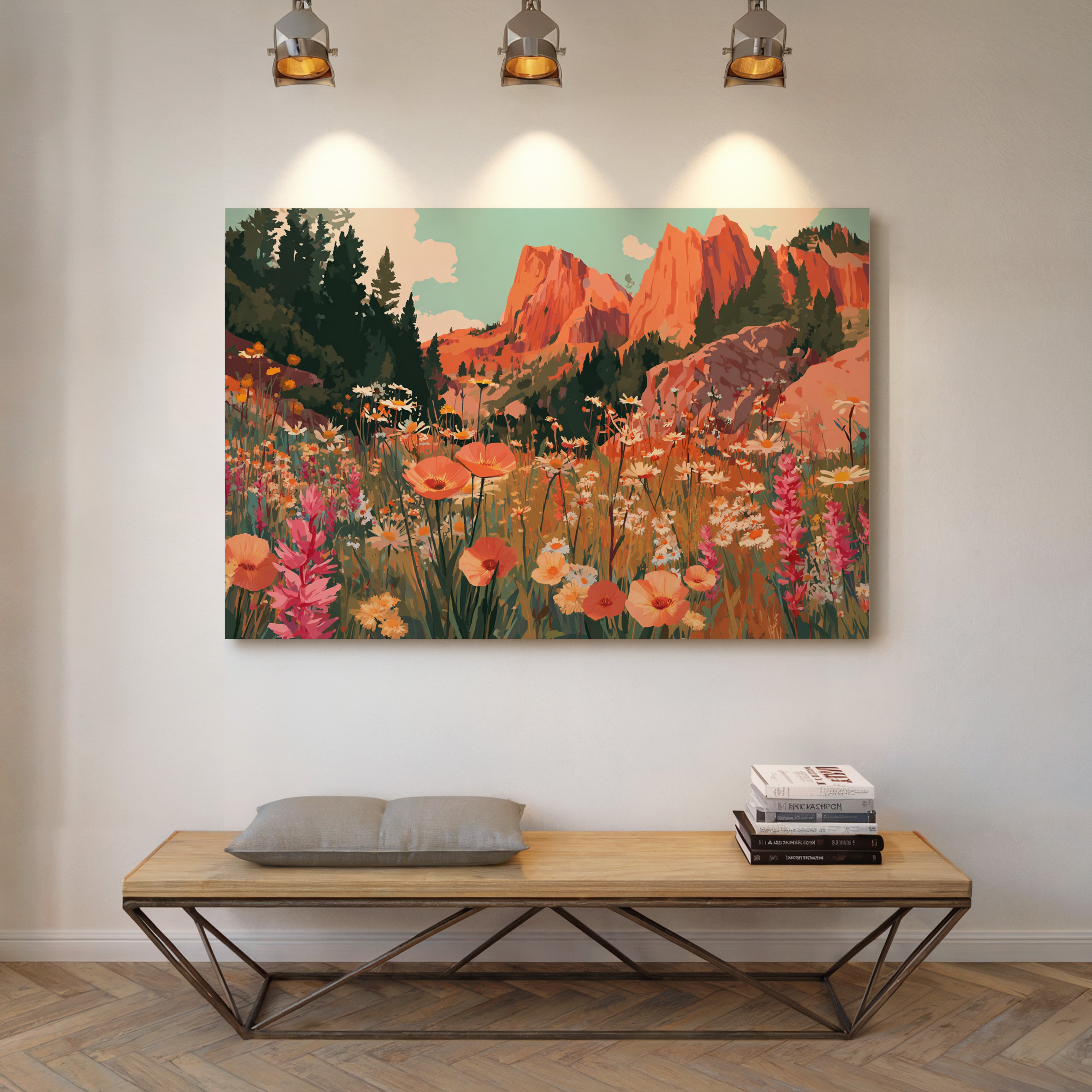 Coral poppies and white daisies sway in a gentle breeze, their delicate petals catching the warm morning light. The wildflower meadow stretches toward towering red-orange cliffs that pierce the mint-green sky, creating a dramatic backdrop for nature's garden. Deep evergreens frame the scene while pink snapdragons add unexpected bursts of color among the golden meadow grasses. This piece captures the fleeting magic of alpine summers, where rugged geology meets ephemeral blooms.
