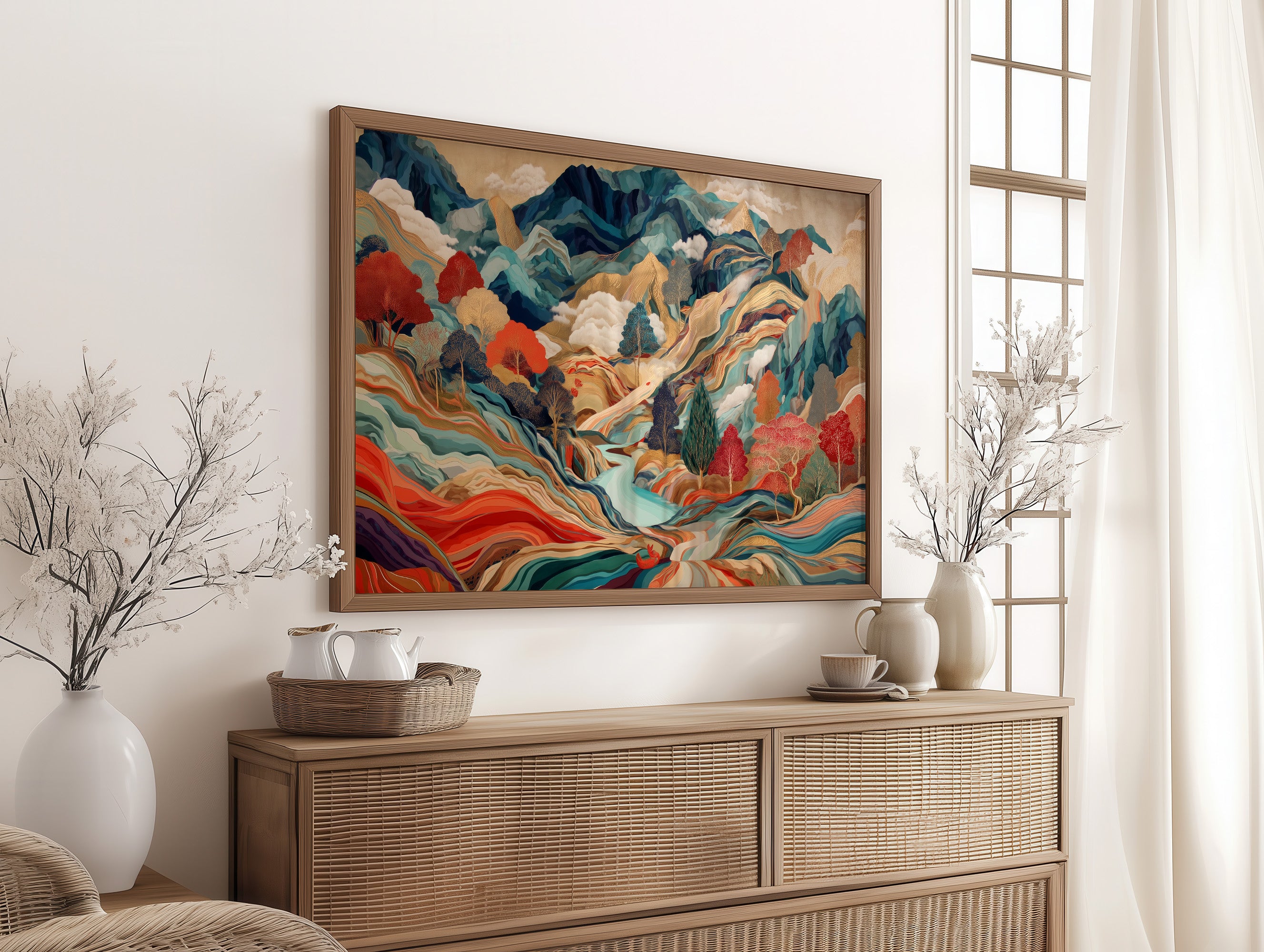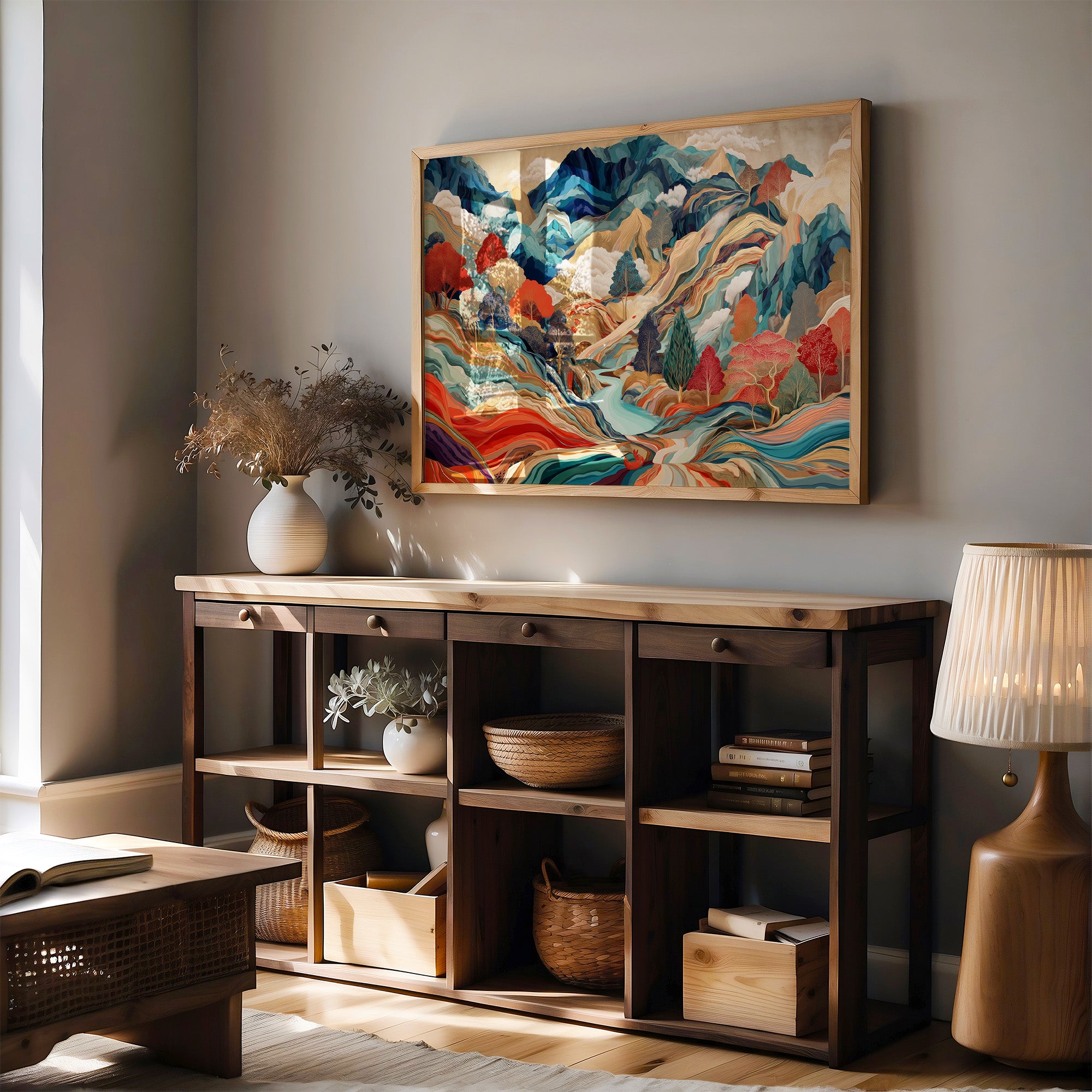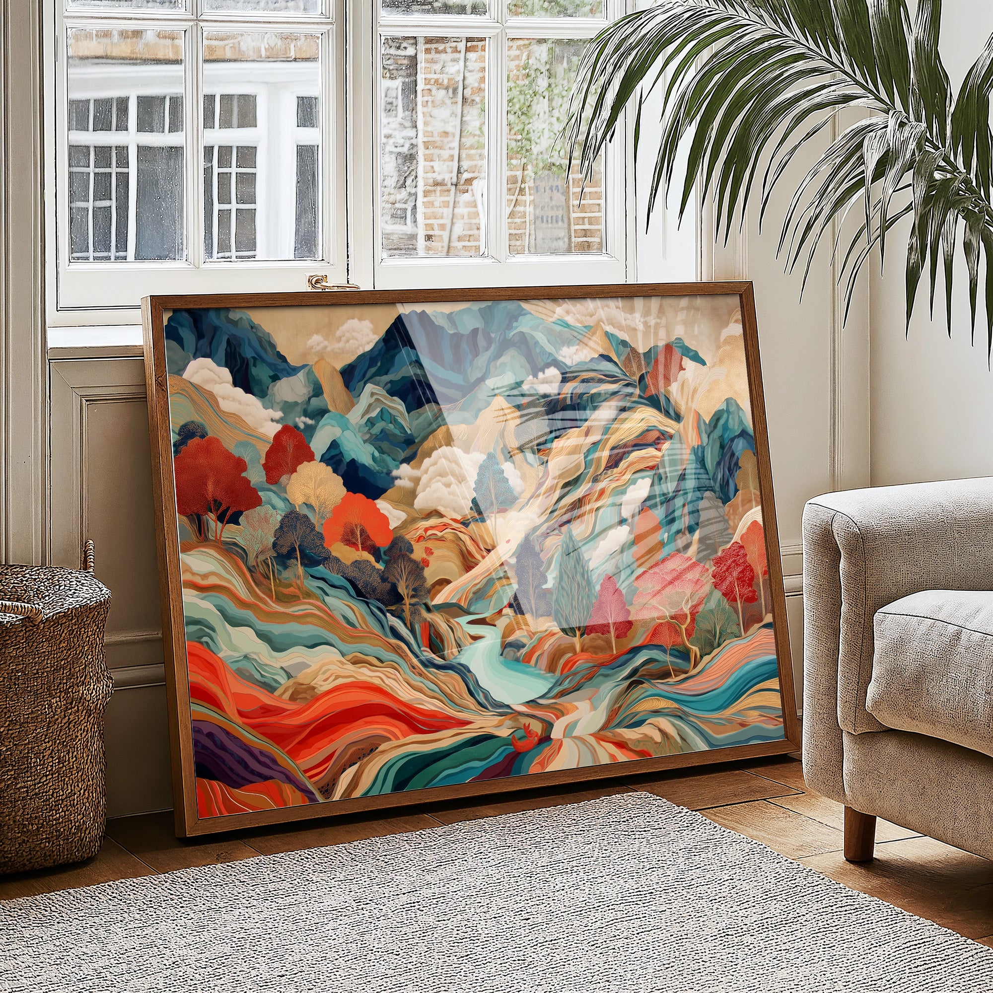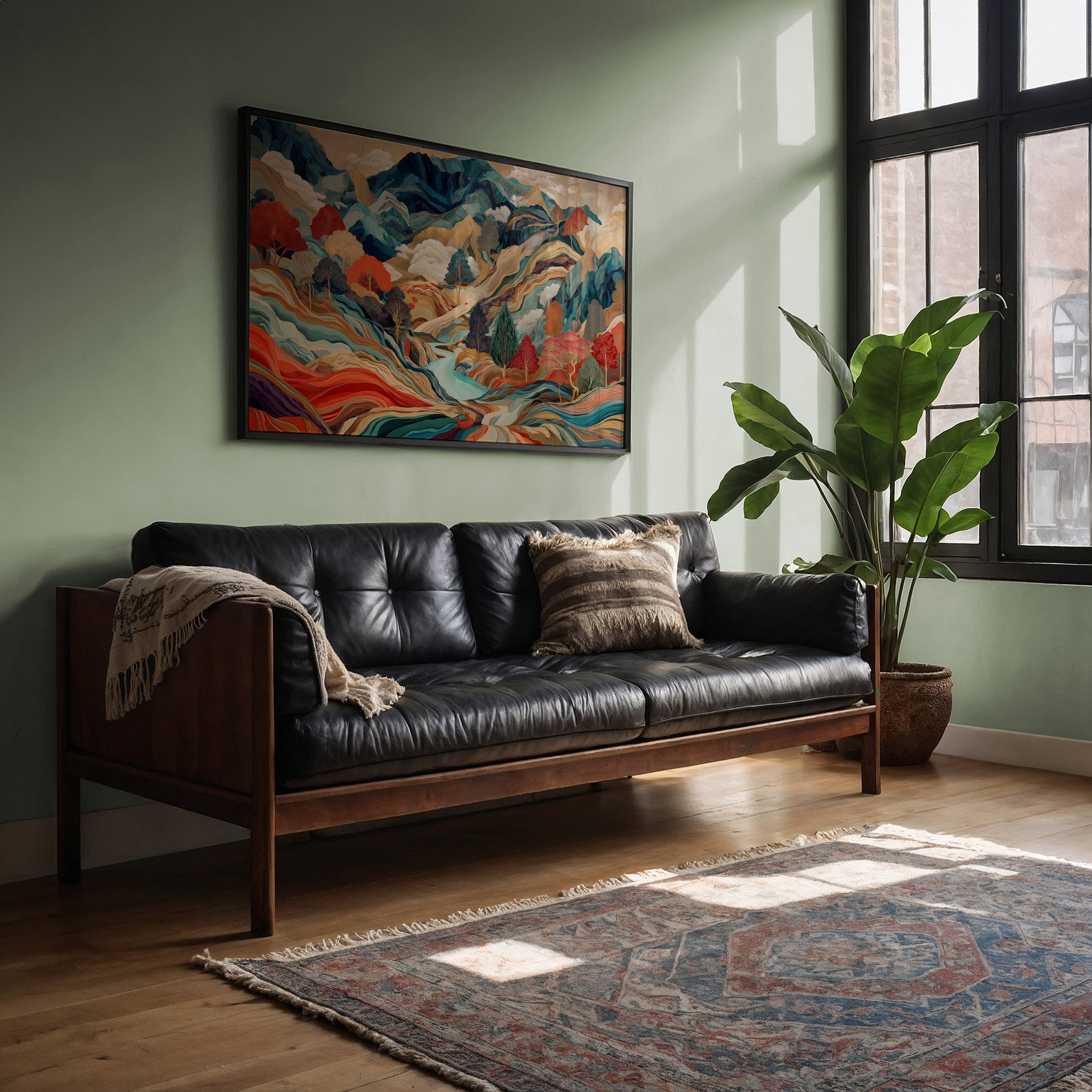 Afternoon sunlight streams across a corduroy couch, casting dancing shadows from nearby plants while illuminating a vibrant landscape artwork. The painting flows with fluid movement, combining deep teals and fiery oranges in an abstract interpretation of mountain valleys and winding rivers. Rich textures and layered colors create a dreamlike topography where reality meets imagination, with autumn trees dotting the rhythmic terrain in bold crimson accents. This piece would bring an artistic focal point to a modern living room or study, especially in spaces that embrace both natural elements and contemporary design.