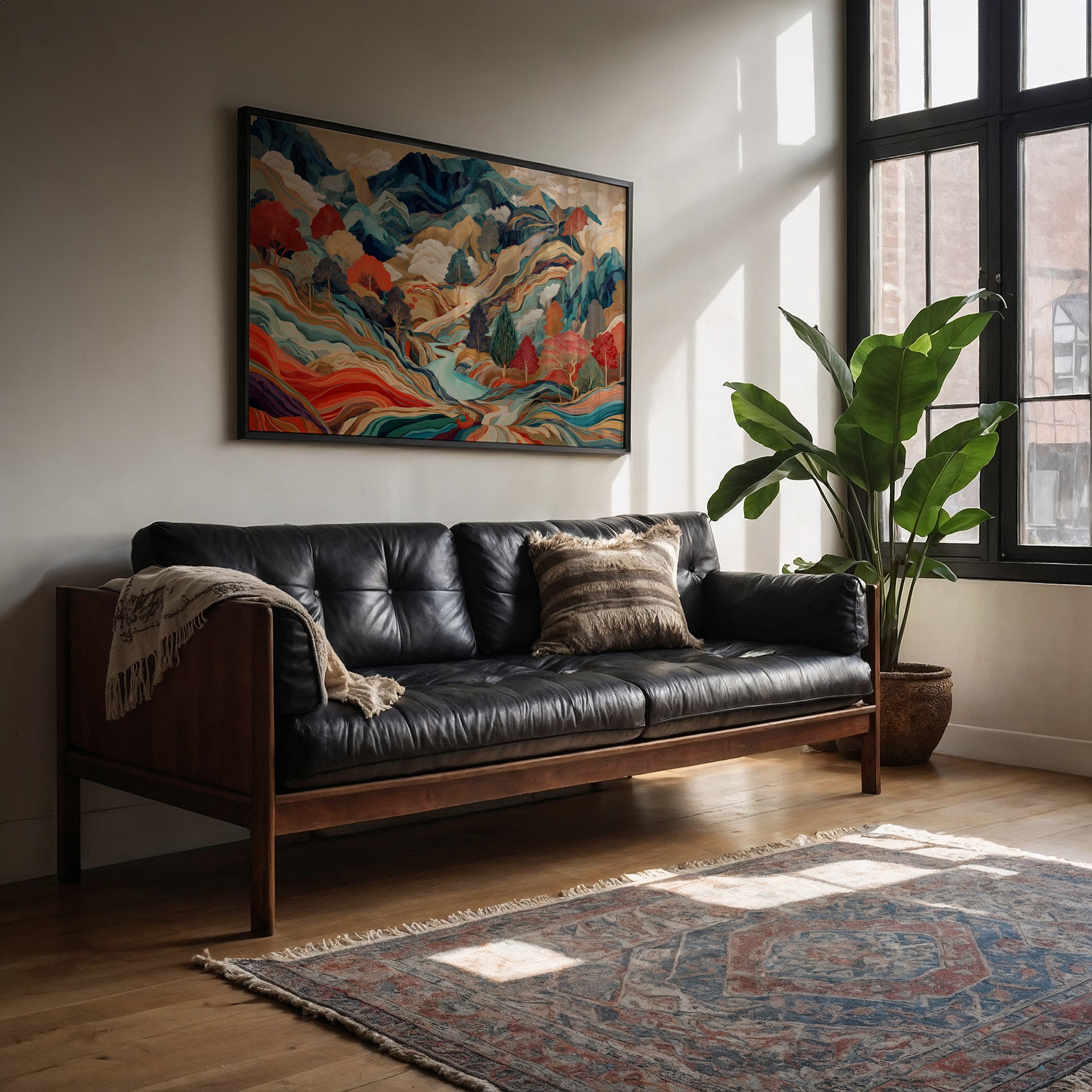 Your artwork should take up 60-75% of wall space above furniture. For standard sofas, choose 24"x36" or larger. When in doubt, go slightly bigger.