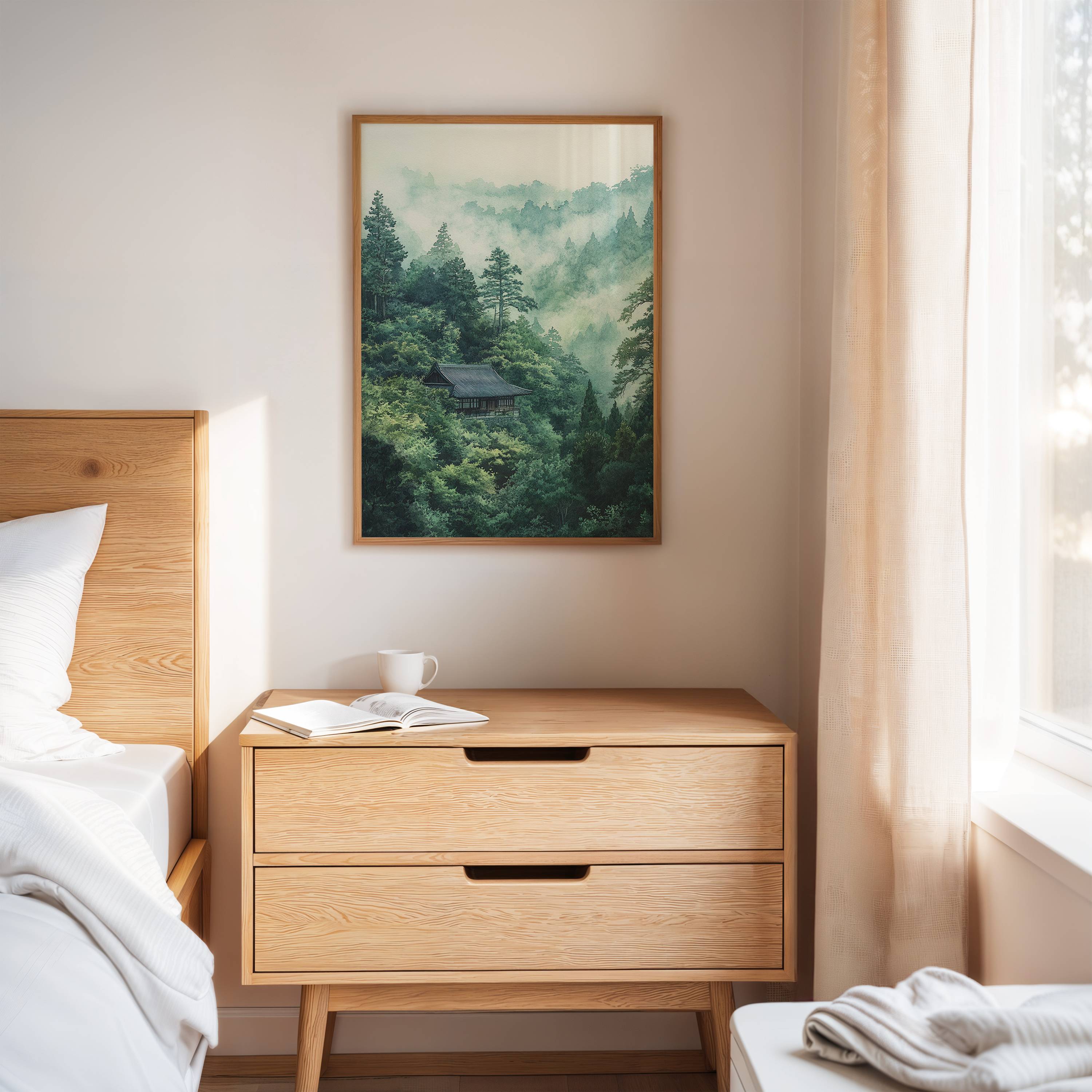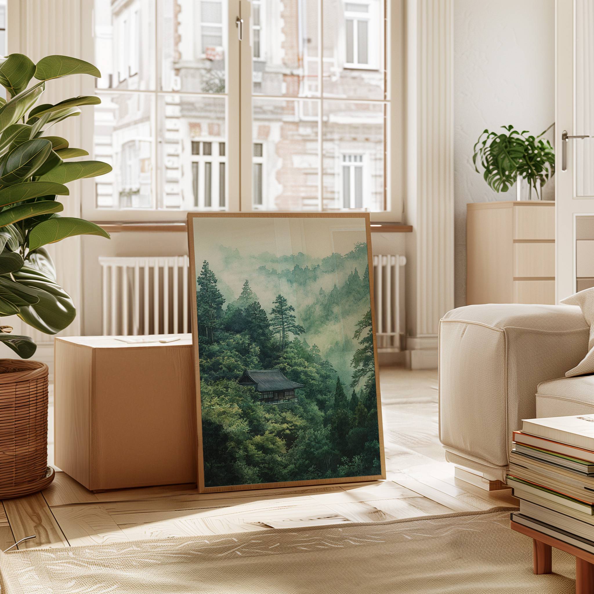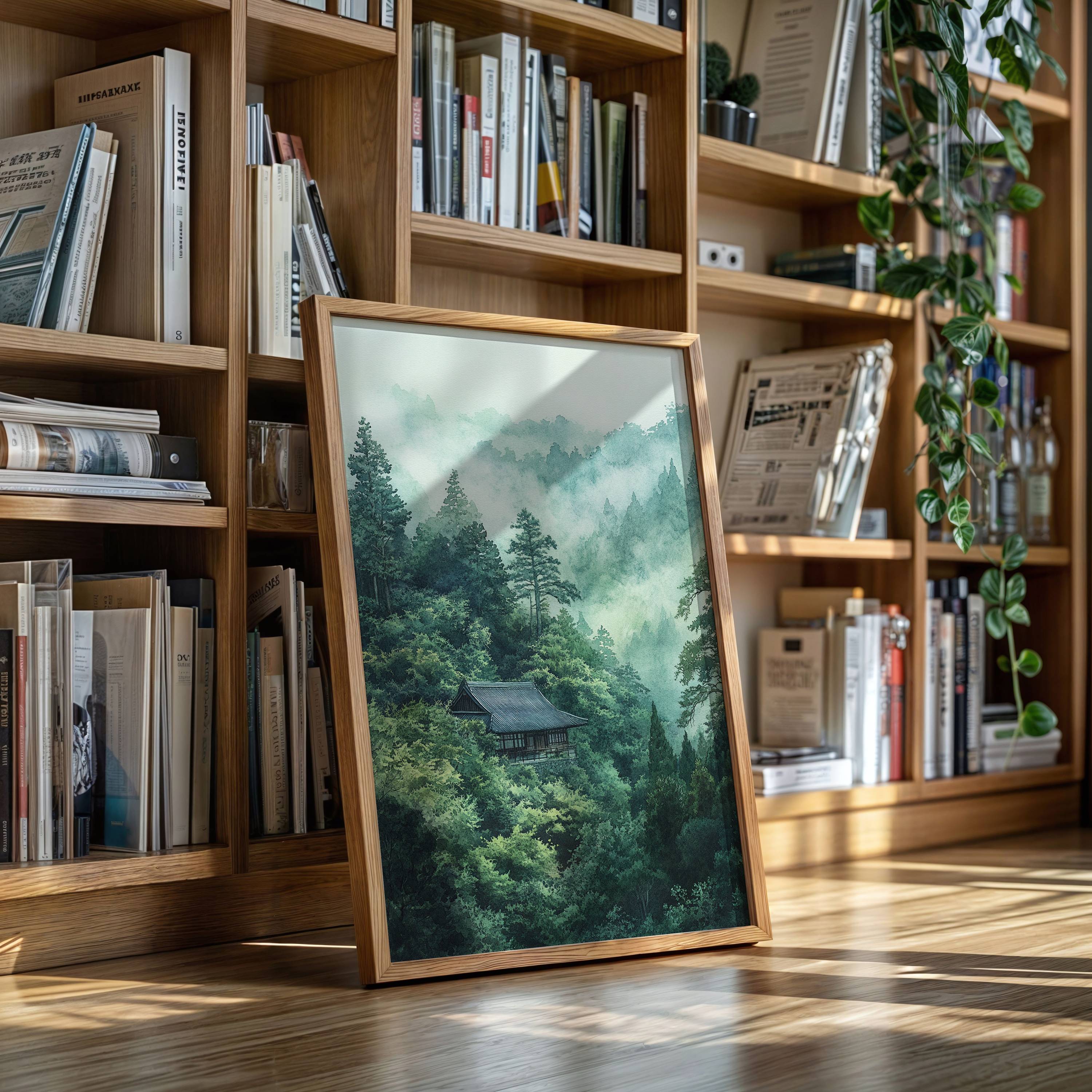Morning fog drifts through ancient pines, wrapping a solitary temple in its cool embrace. The traditional Japanese architecture stands in perfect harmony with its surroundings, its dark roof and wooden beams emerging from a sea of vibrant forest greens. Layers of misty mountains create depth in watercolor-like washes, while delicate details in the foliage suggest the gentle movement of mountain air. This tranquil scene captures the essence of contemplative solitude, where architecture and nature exist in perfect balance. Perfect for meditation rooms, reading nooks, or any space where you seek to create a sense of peaceful retreat.
