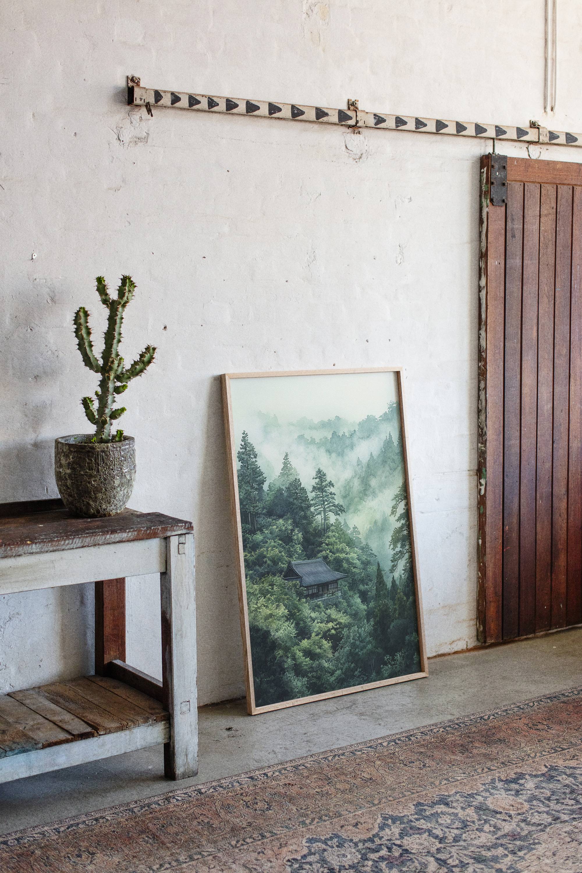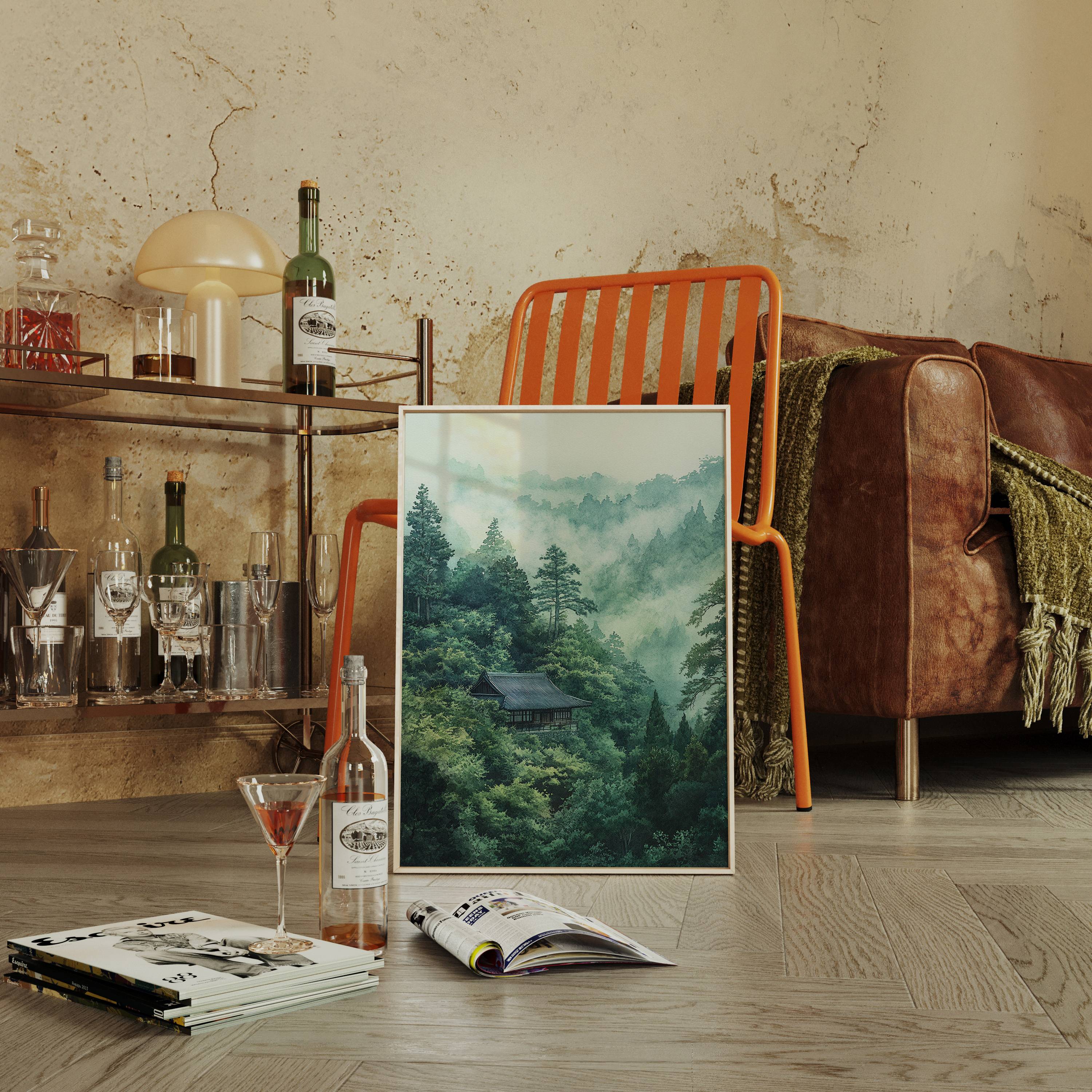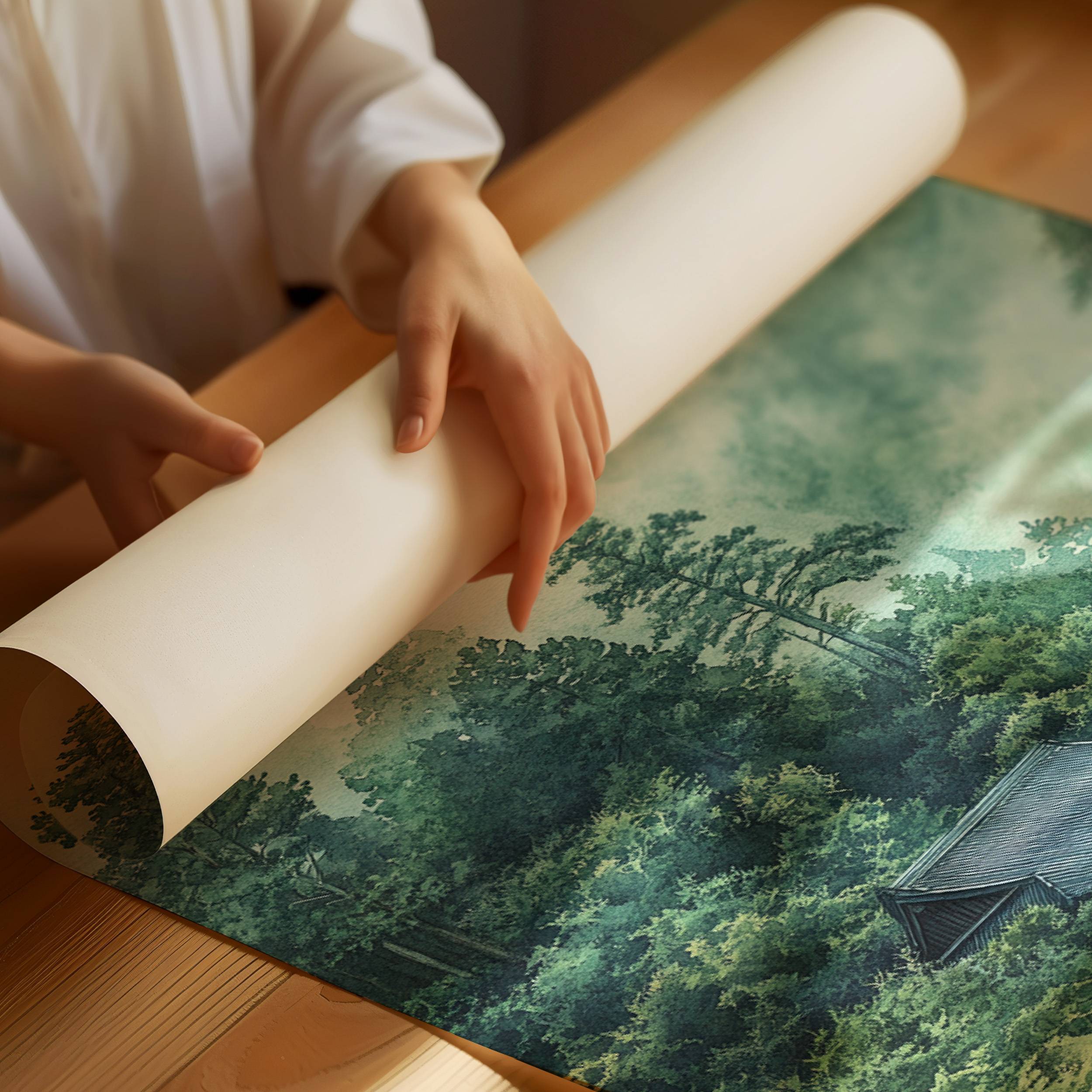 Morning fog drifts through ancient pines, wrapping a solitary temple in its cool embrace. The traditional Japanese architecture stands in perfect harmony with its surroundings, its dark roof and wooden beams emerging from a sea of vibrant forest greens. Layers of misty mountains create depth in watercolor-like washes, while delicate details in the foliage suggest the gentle movement of mountain air. This tranquil scene captures the essence of contemplative solitude, where architecture and nature exist in perfect balance. Perfect for meditation rooms, reading nooks, or any space where you seek to create a sense of peaceful retreat.