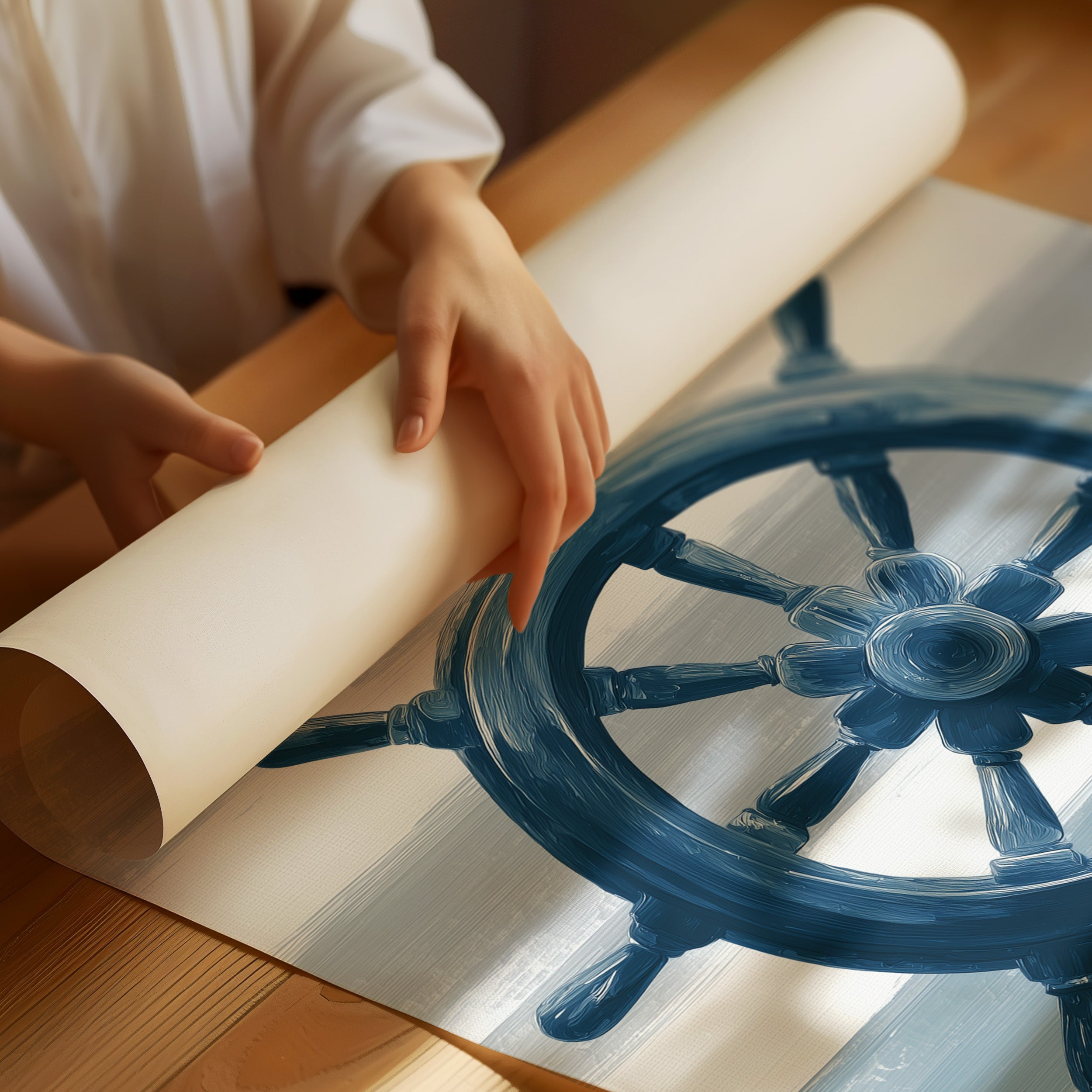 A minimalist painting of a navy blue ship's wheel stands against a backdrop of soft gray horizontal brushstrokes suggesting a misty seascape. The artwork against its wooden tranquil quality while evoking maritime nostalgia and the eternal call of ocean journeys.