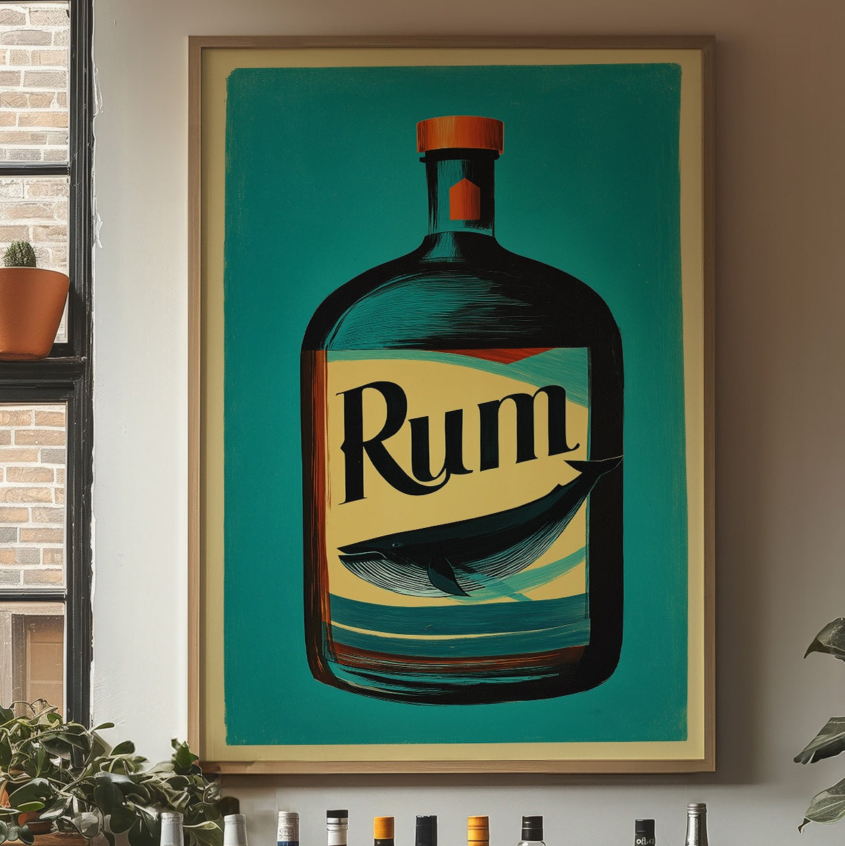 A stylized pop art rendering of a rum bottle against a vibrant teal background. The illustration features a dark glass bottle with an orange cap and a beige label prominently displaying "Rum" in bold black typography. A graceful whale silhouette swims across the label, suggesting maritime heritage and oceanic connections.