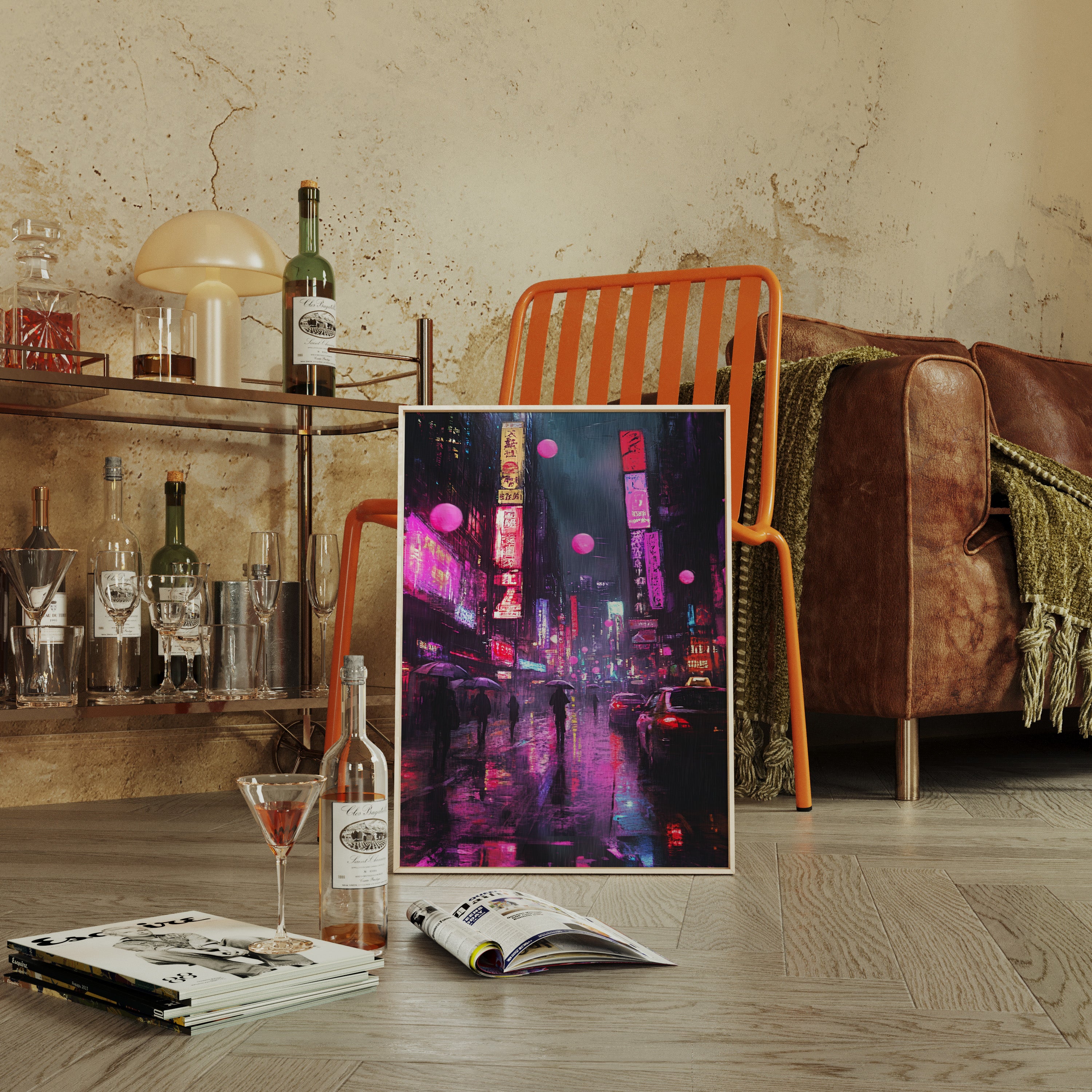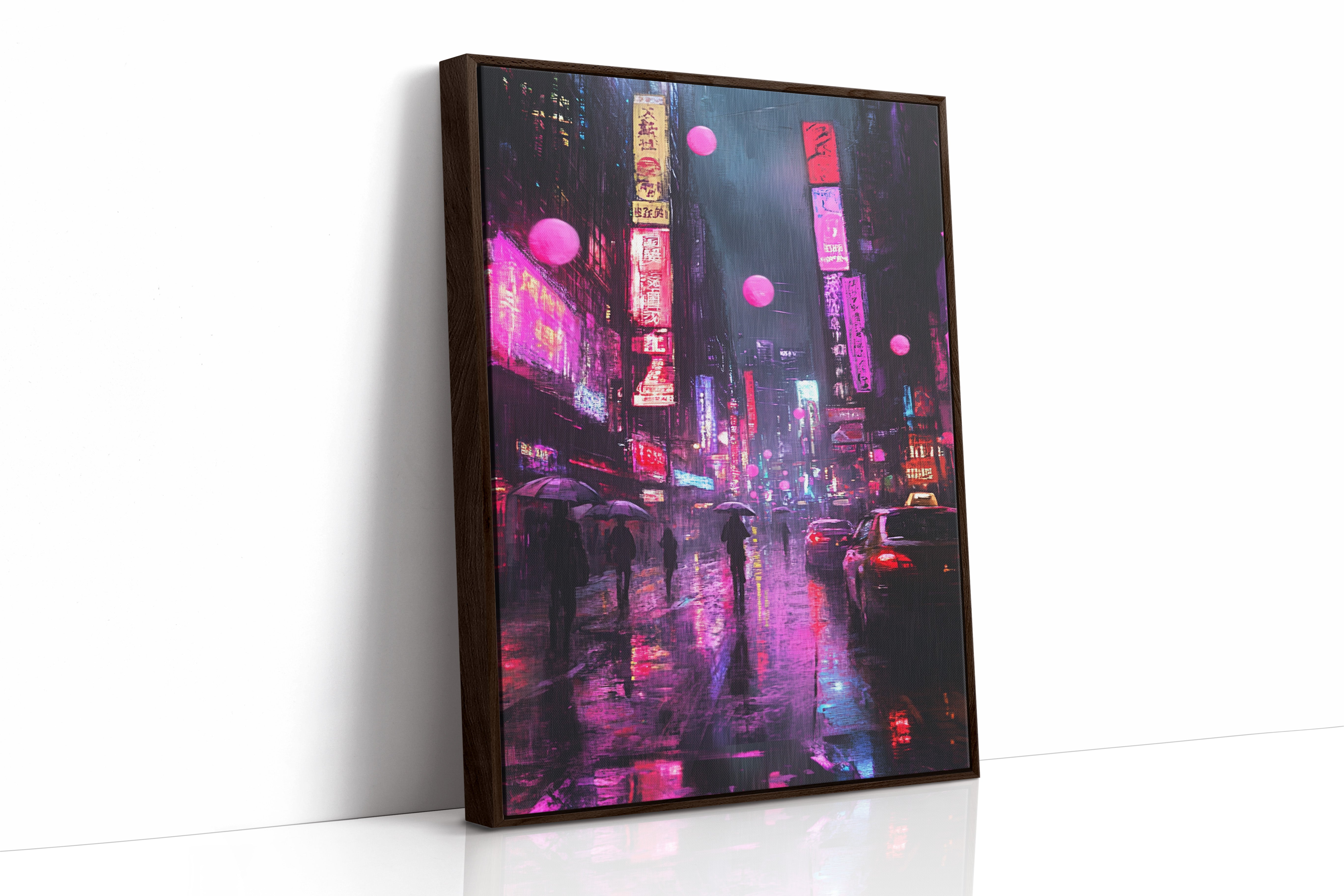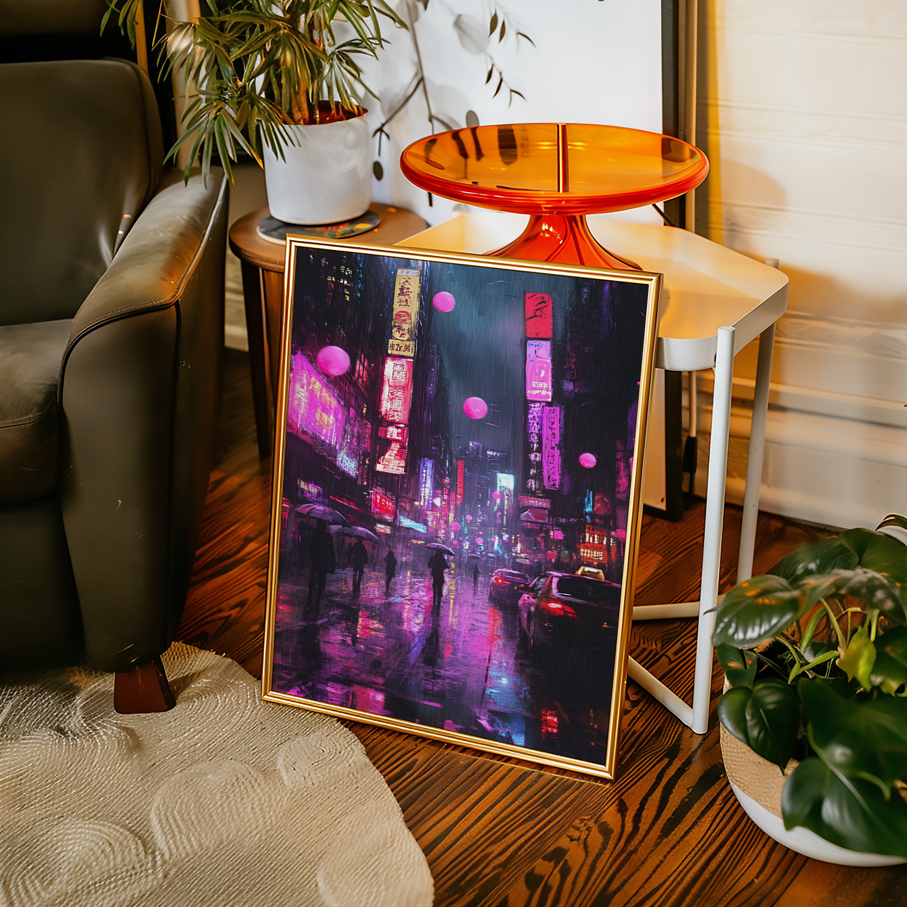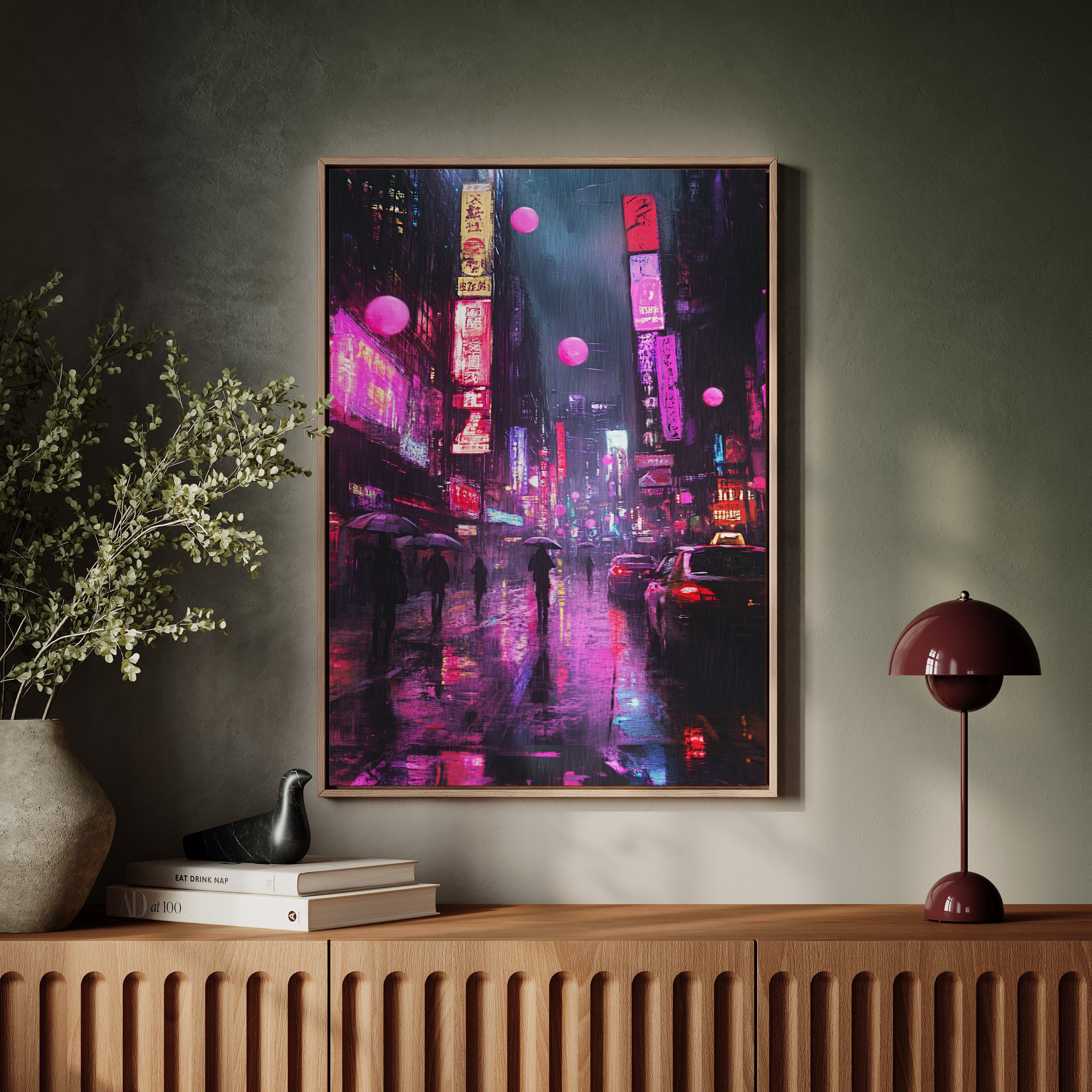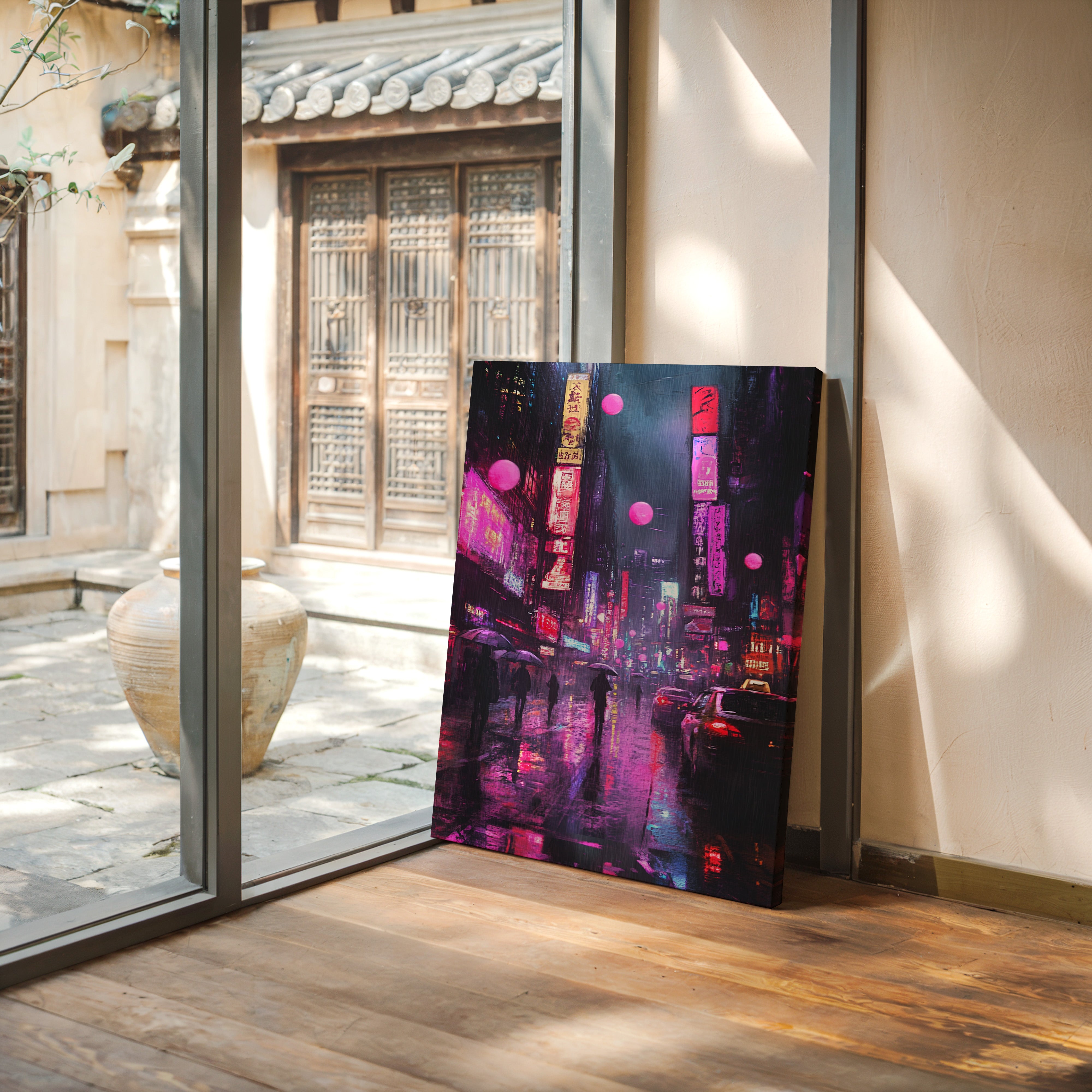 Under a canopy of neon lights, the city pulses with life even as rain softens its edges. Part of our 'The Urban Canvas' collection, this piece captures the vibrant essence of modern cityscapes. Ideal for living rooms or creative studios, it brings an energetic yet calming presence to any space. Each piece is crafted with precision, ensuring a captivating addition to your decor.