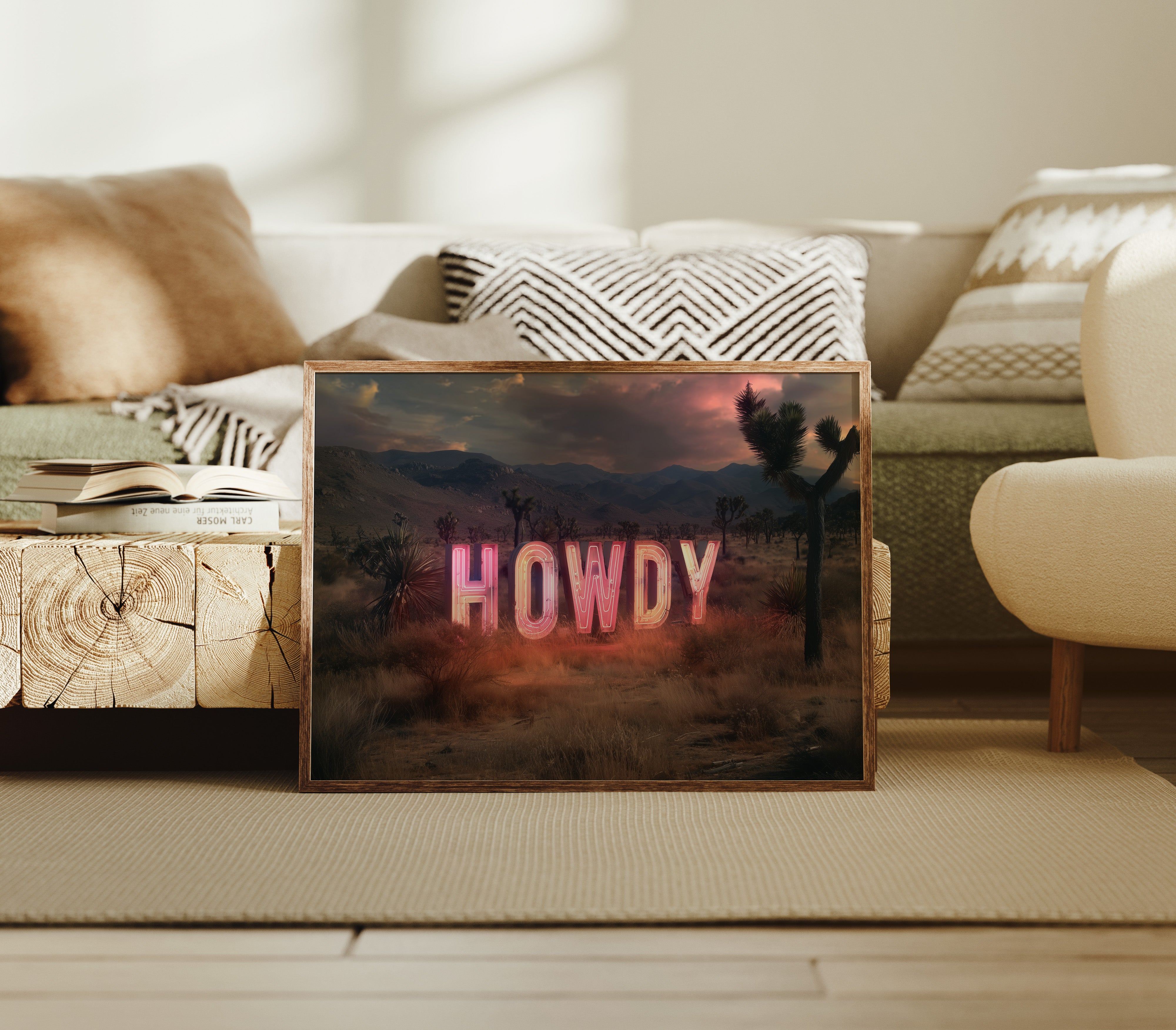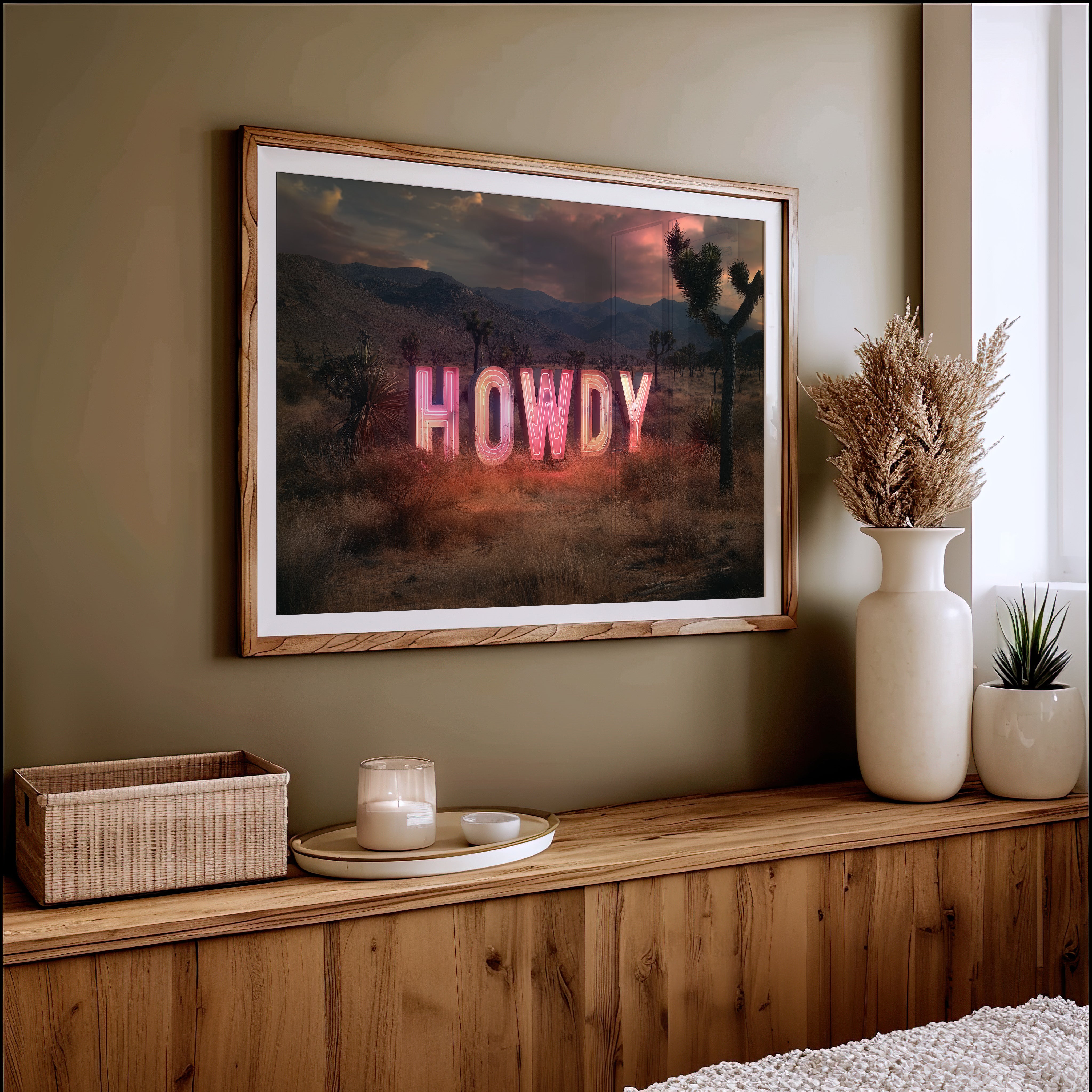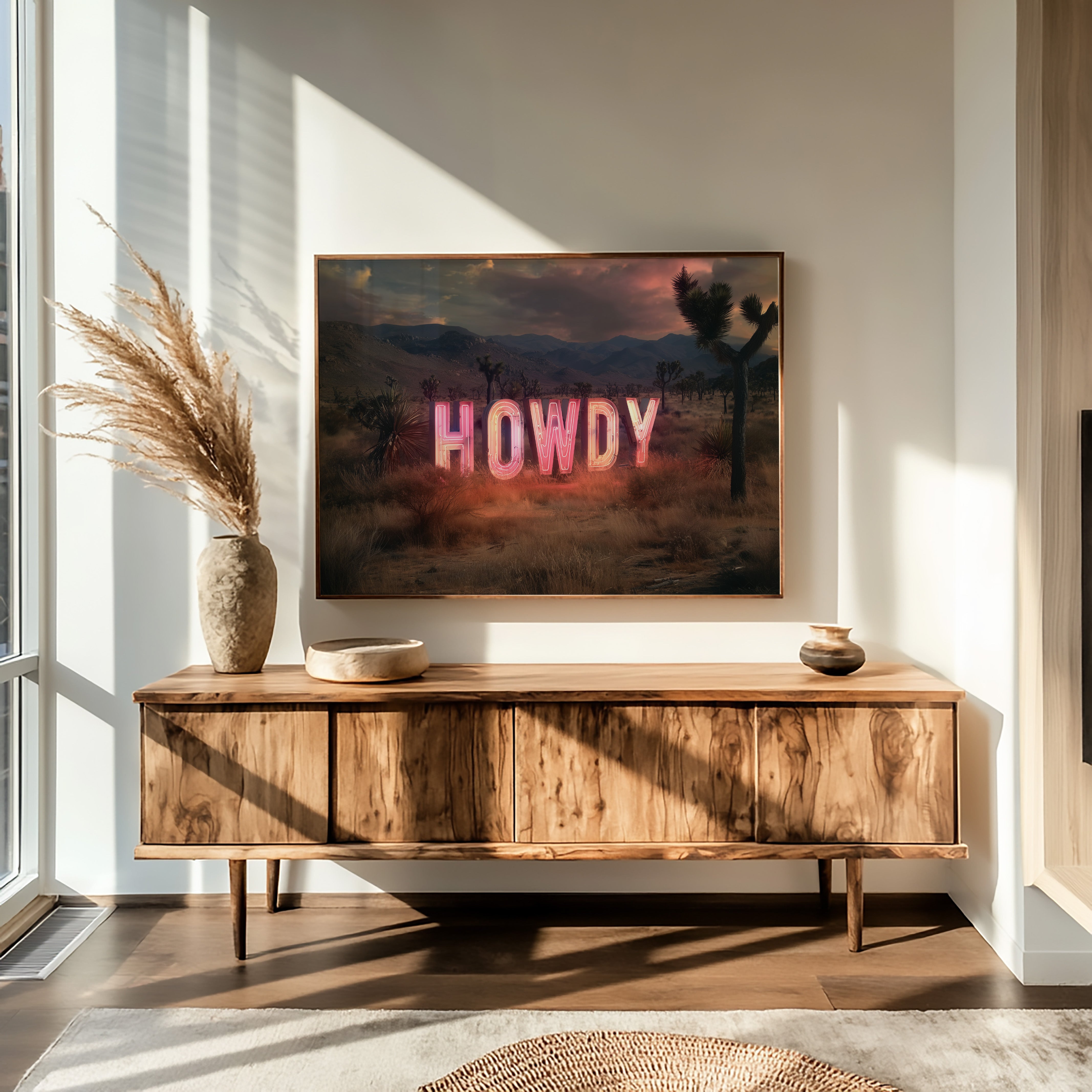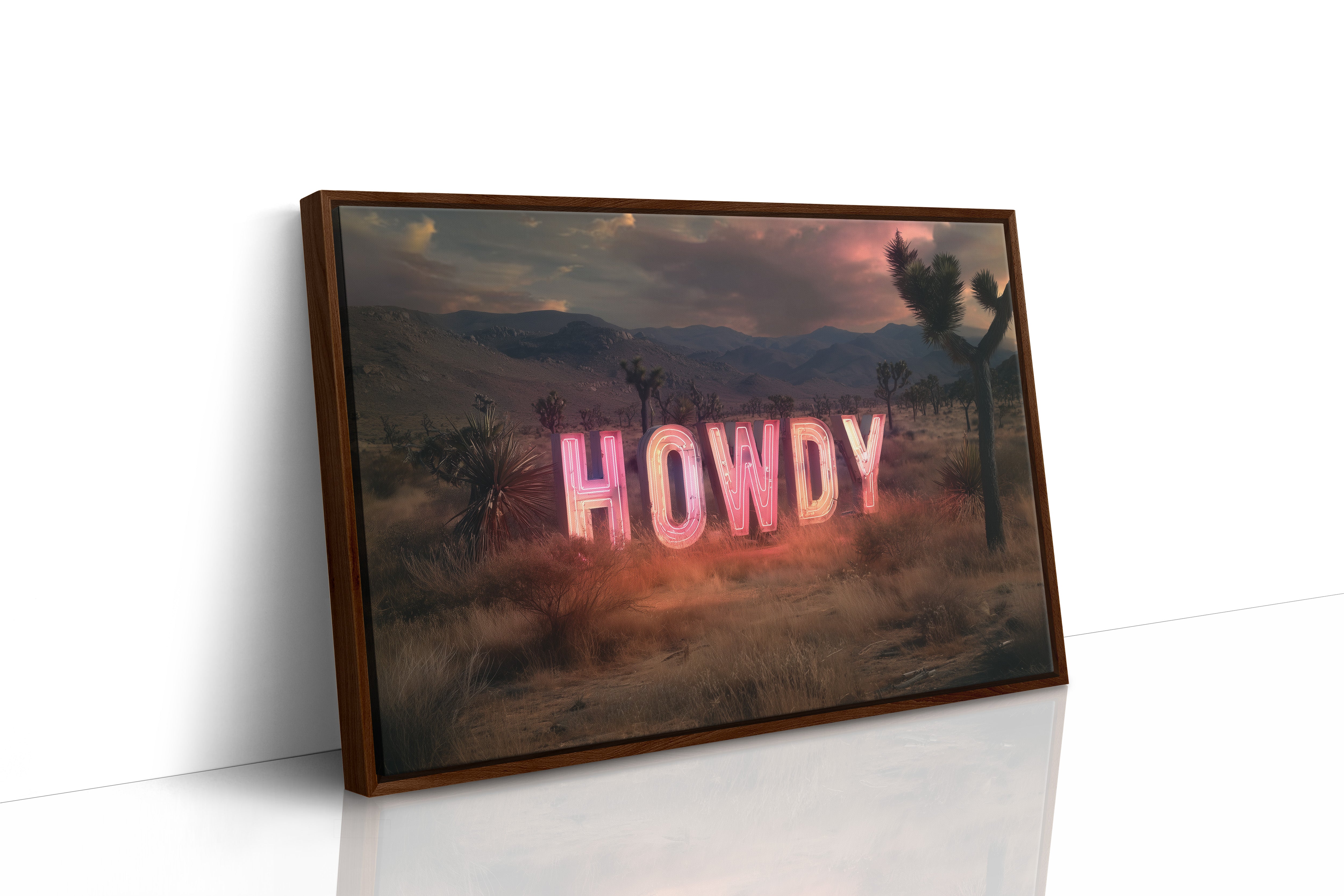 Pink neon pierces the gathering twilight, casting an ethereal glow across rustling desert grasses. This striking contemporary piece captures the intersection of artificial glamour and raw natural beauty. Joshua trees stand sentinel against dusky mountains while 'HOWDY' blazes in retro-inspired letterforms, creating a uniquely American tableau where vintage Americana meets untamed wilderness. The composition bathes in the warm coral tones of sunset, while electric pink illumination adds a modern edge to the timeless desert landscape. Perfect for making a bold statement in modern living spaces or adding unexpected flair to minimalist interiors. The piece invites viewers to pause and consider the beautiful contradiction of urban artistry in wild spaces.