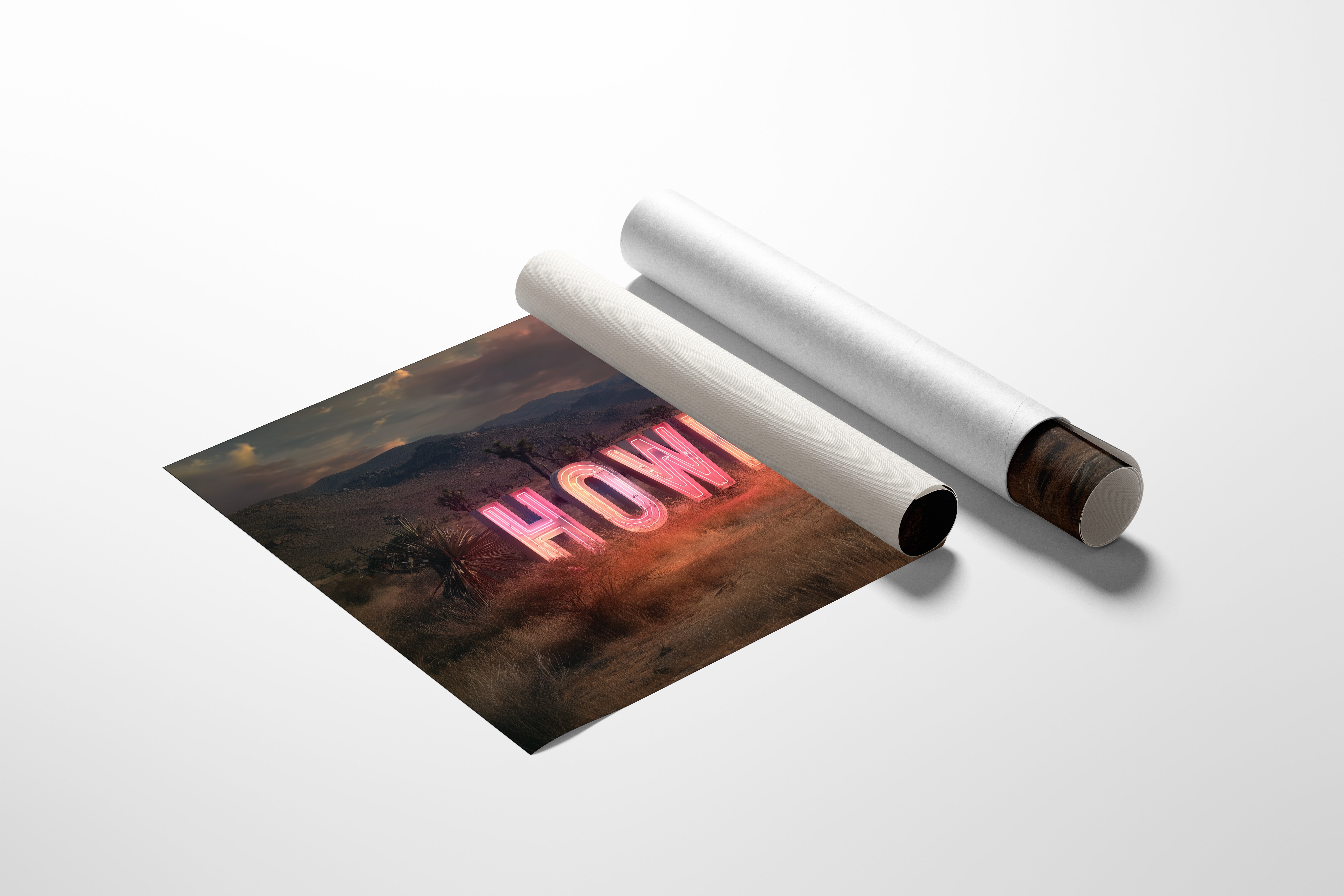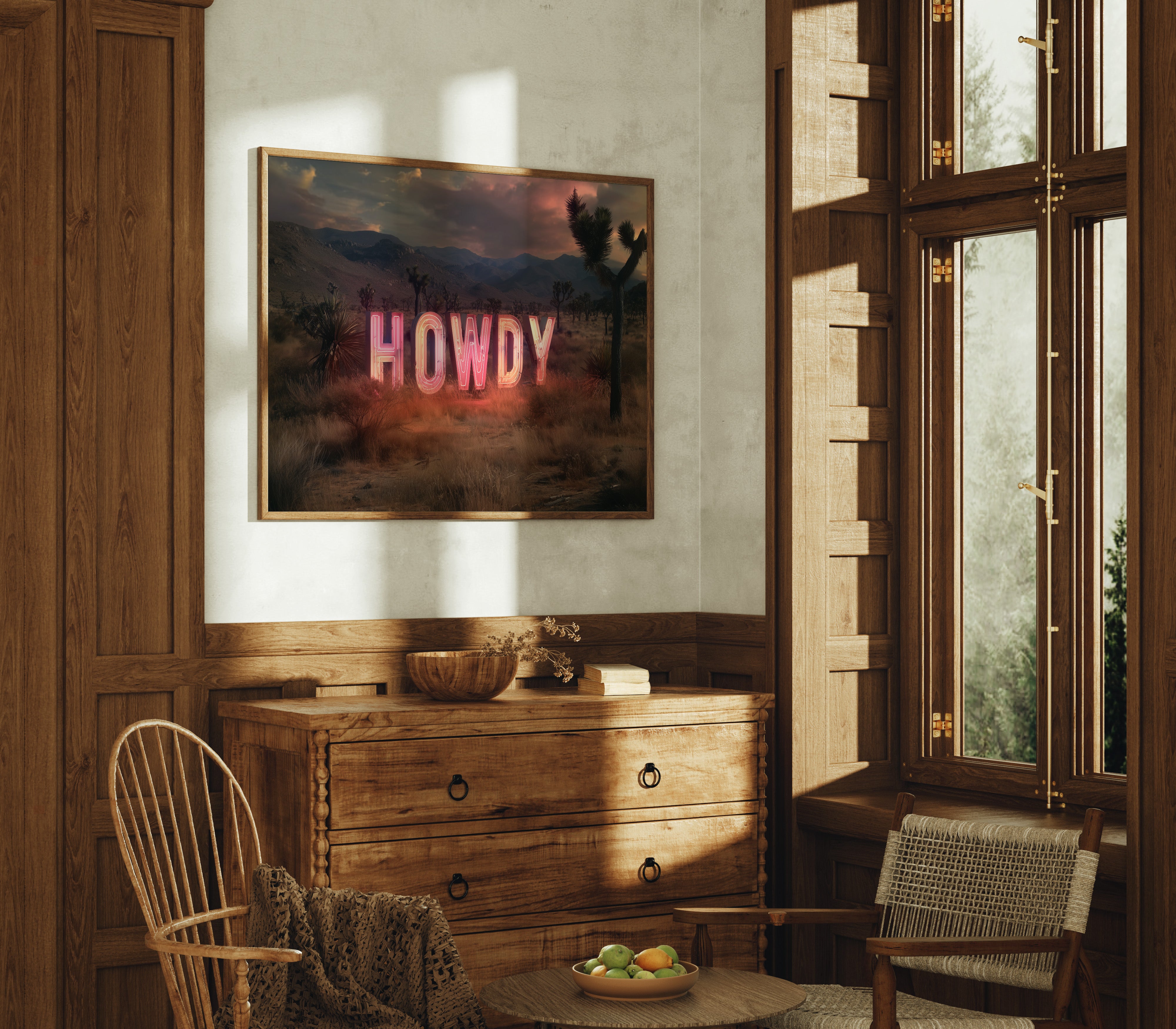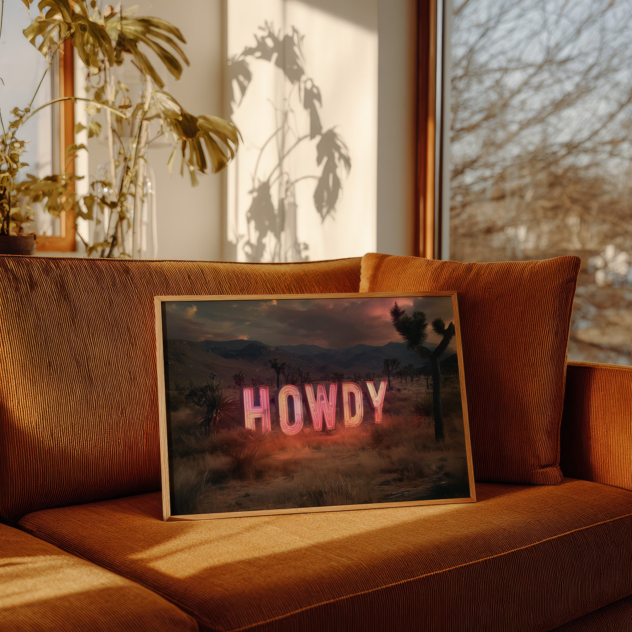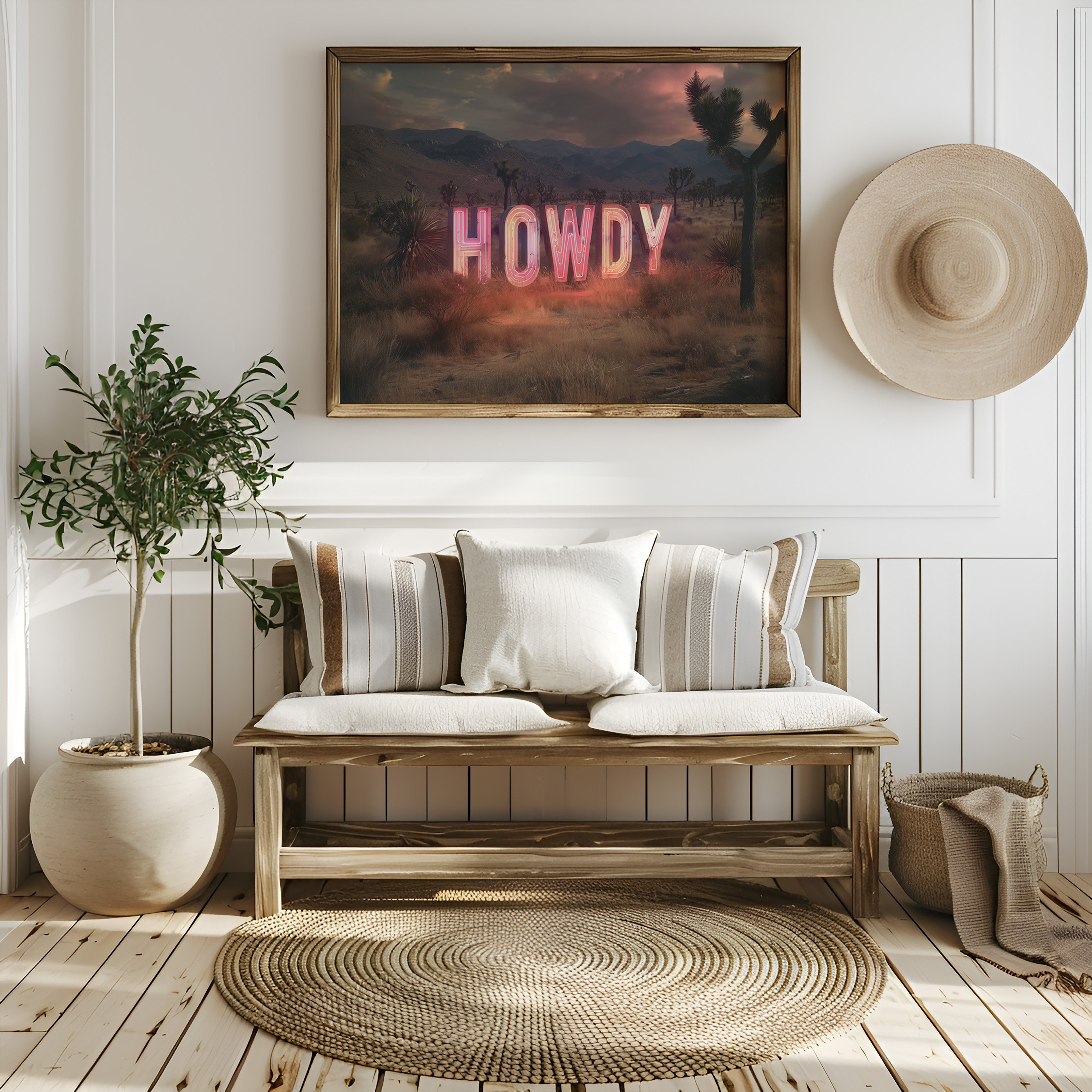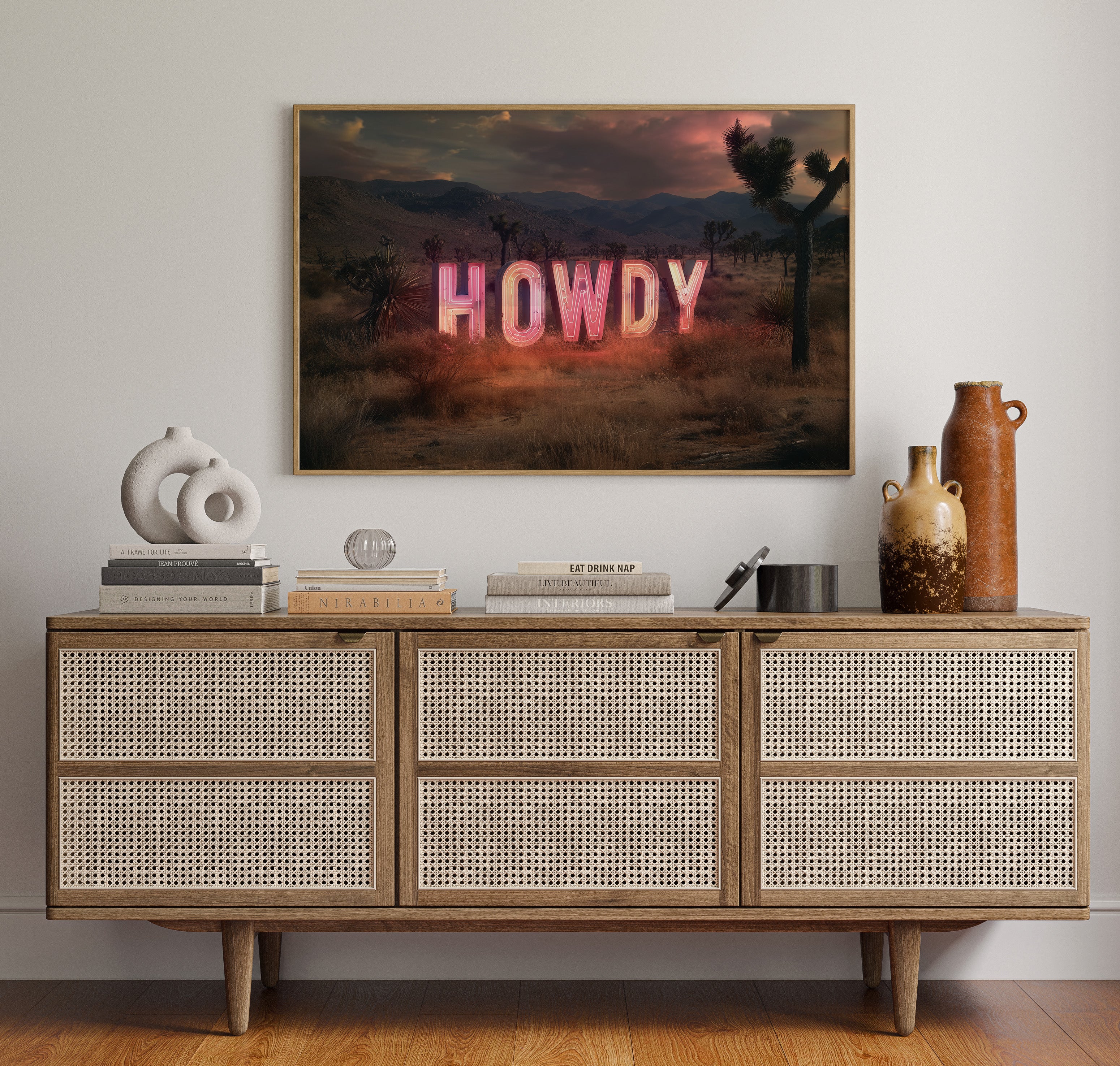 Pink neon pierces the gathering twilight, casting an ethereal glow across rustling desert grasses. This striking contemporary piece captures the intersection of artificial glamour and raw natural beauty. Joshua trees stand sentinel against dusky mountains while 'HOWDY' blazes in retro-inspired letterforms, creating a uniquely American tableau where vintage Americana meets untamed wilderness. The composition bathes in the warm coral tones of sunset, while electric pink illumination adds a modern edge to the timeless desert landscape. Perfect for making a bold statement in modern living spaces or adding unexpected flair to minimalist interiors. The piece invites viewers to pause and consider the beautiful contradiction of urban artistry in wild spaces.