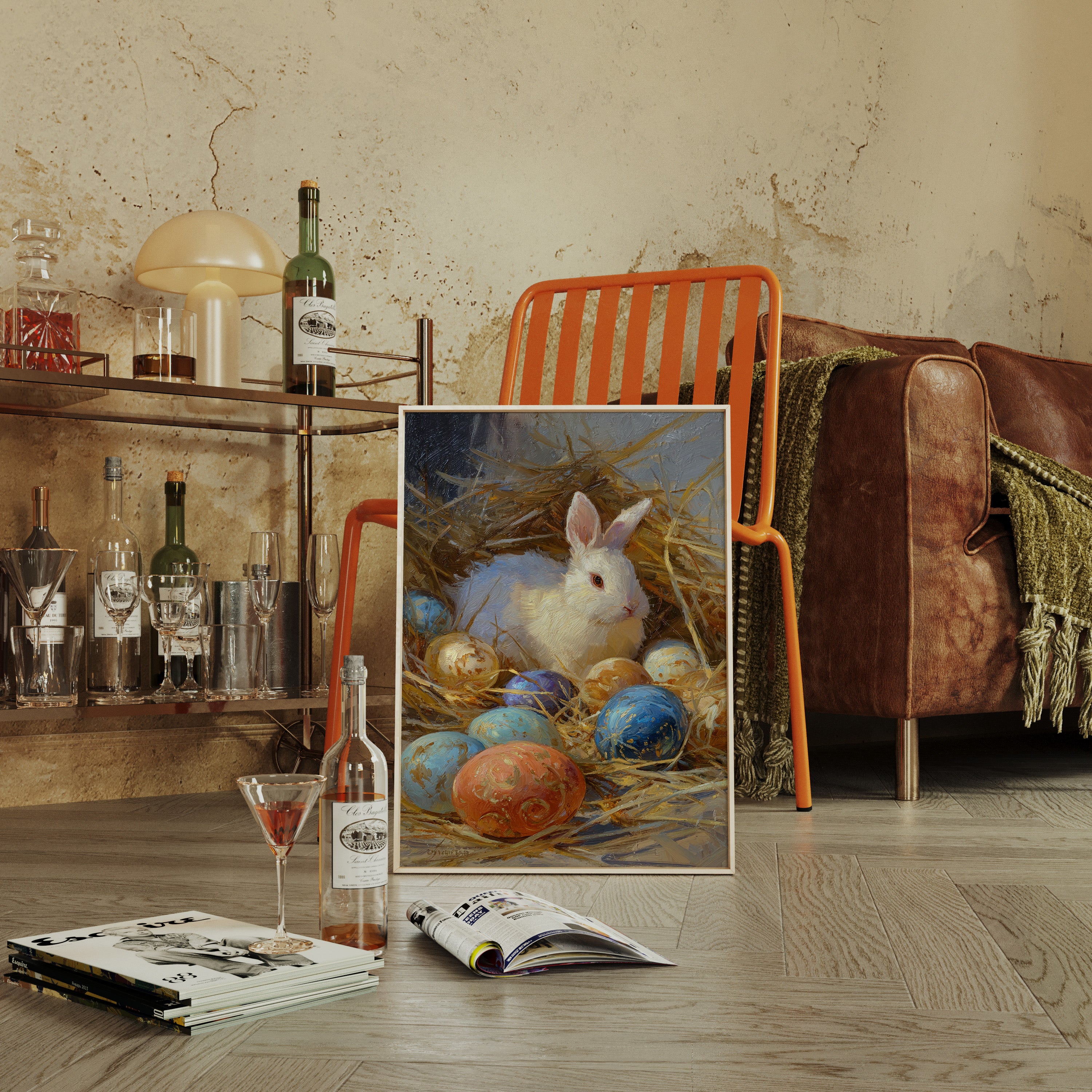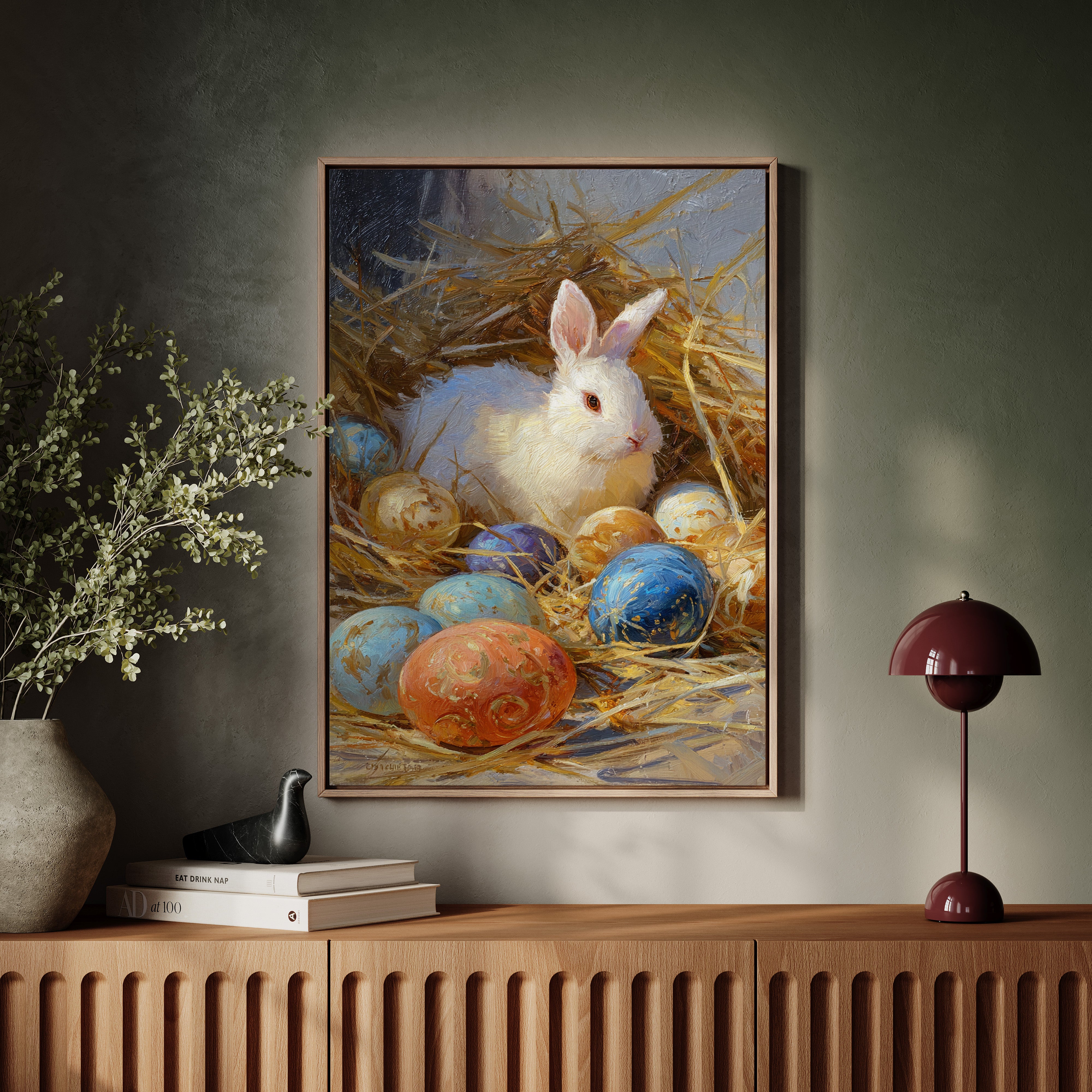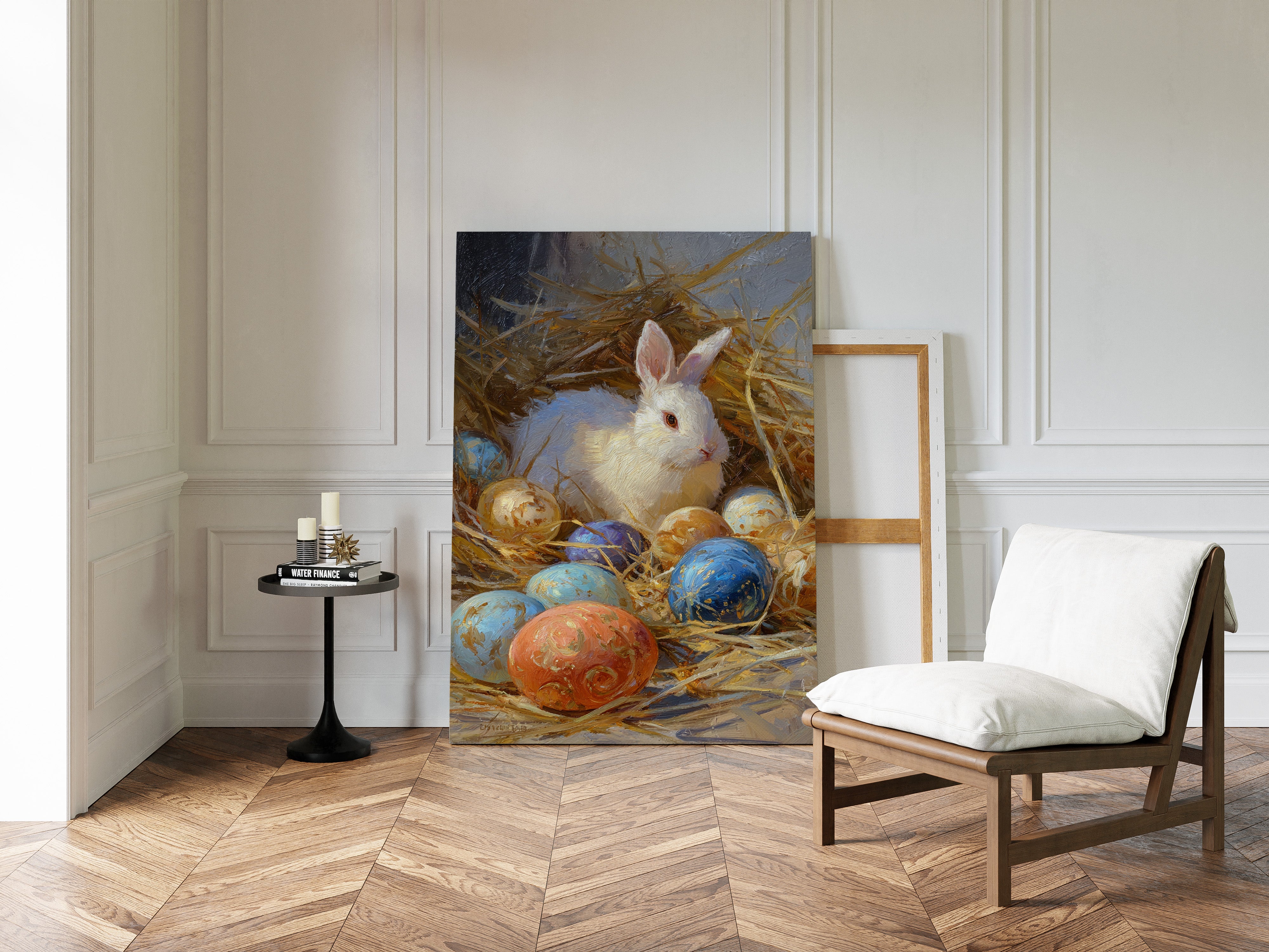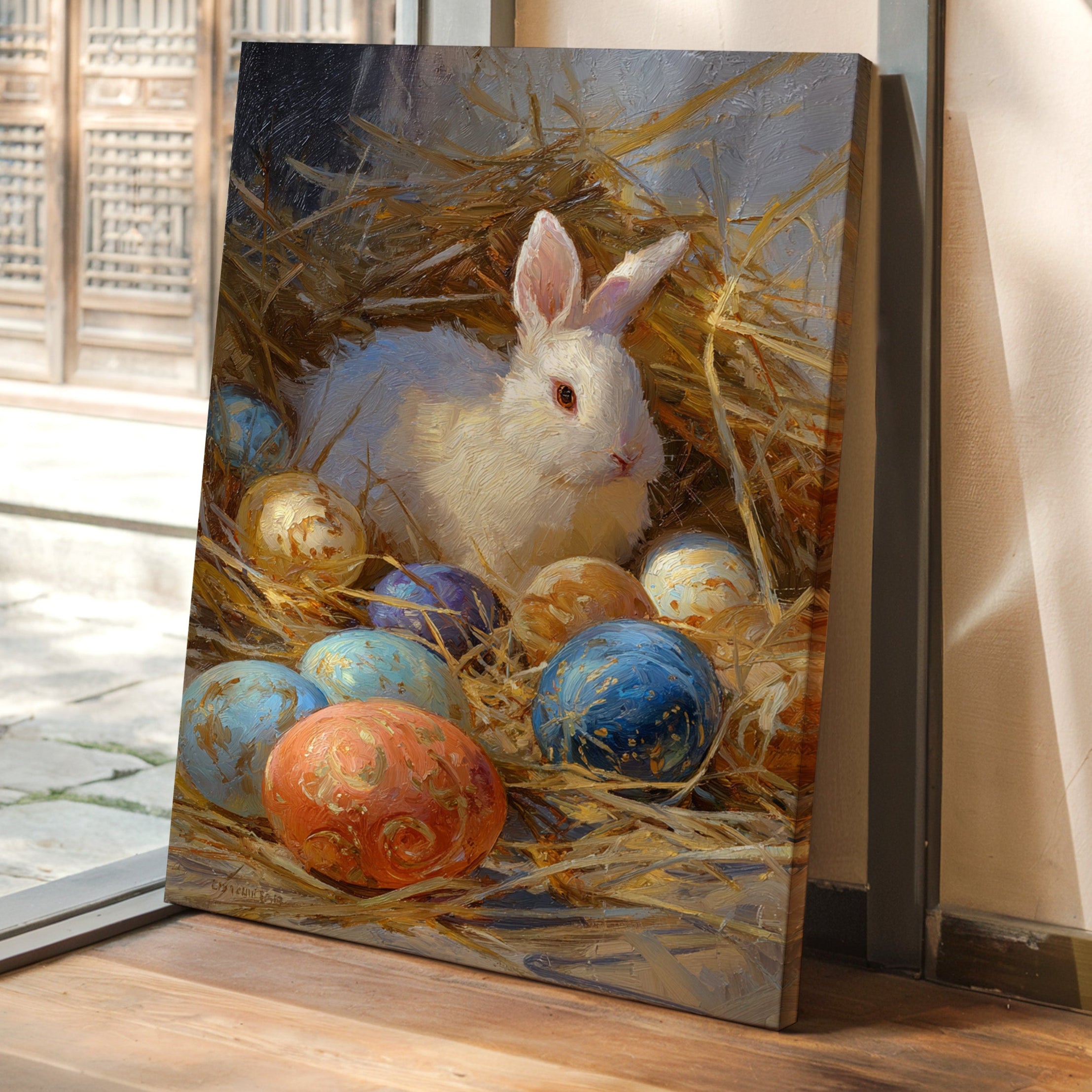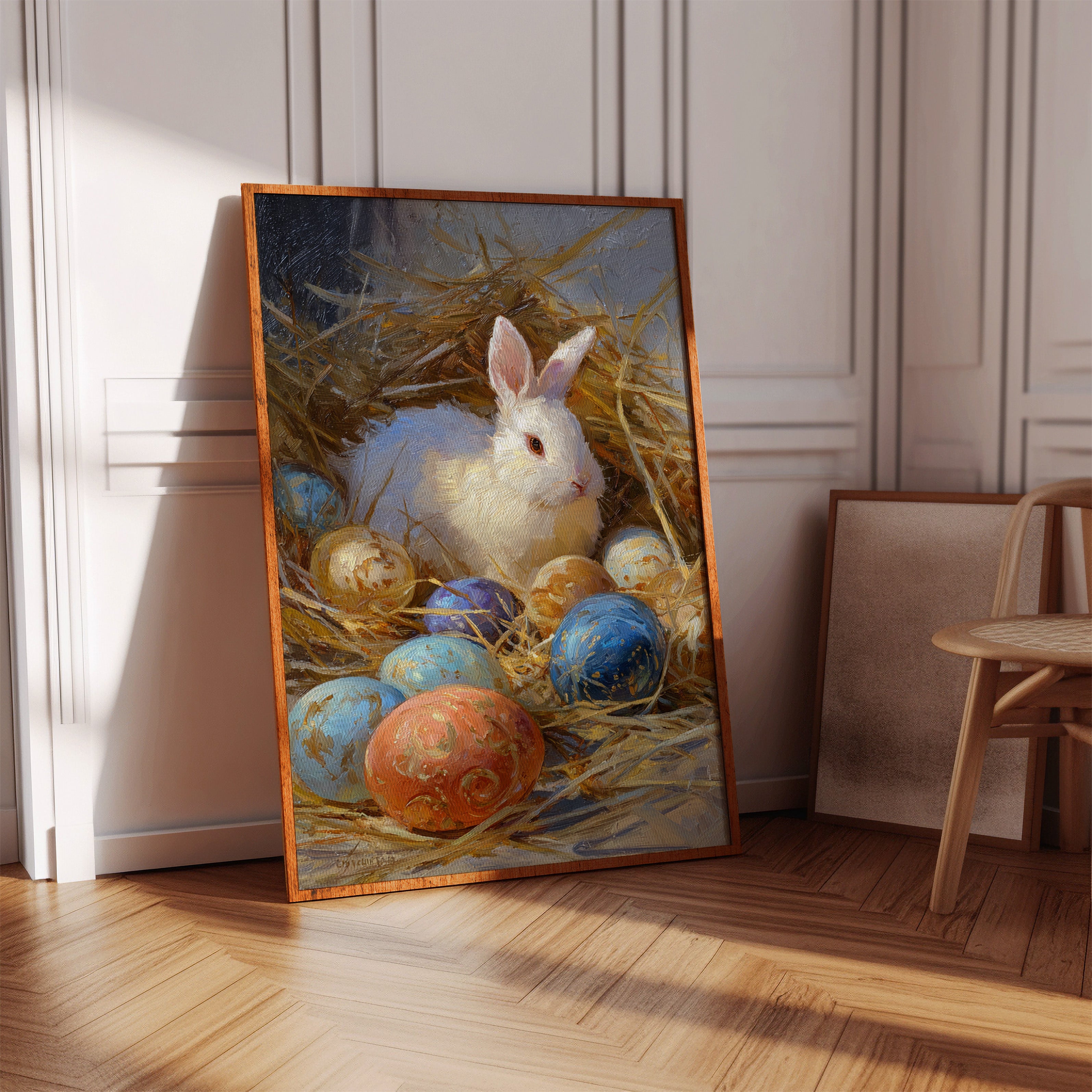 In a sunlit corner, a gentle rabbit rests among a vibrant array of painted eggs, their intricate patterns beckoning tales of springtime joy. This piece captures the spirit of the Artisanal collection, celebrating the beauty of handcrafted moments. The soft fur of the rabbit contrasts with the rich textures of the eggs, each hue alive with the promise of new beginnings. Ideal for brightening a child's room or adding a whimsical touch to a cozy nook.