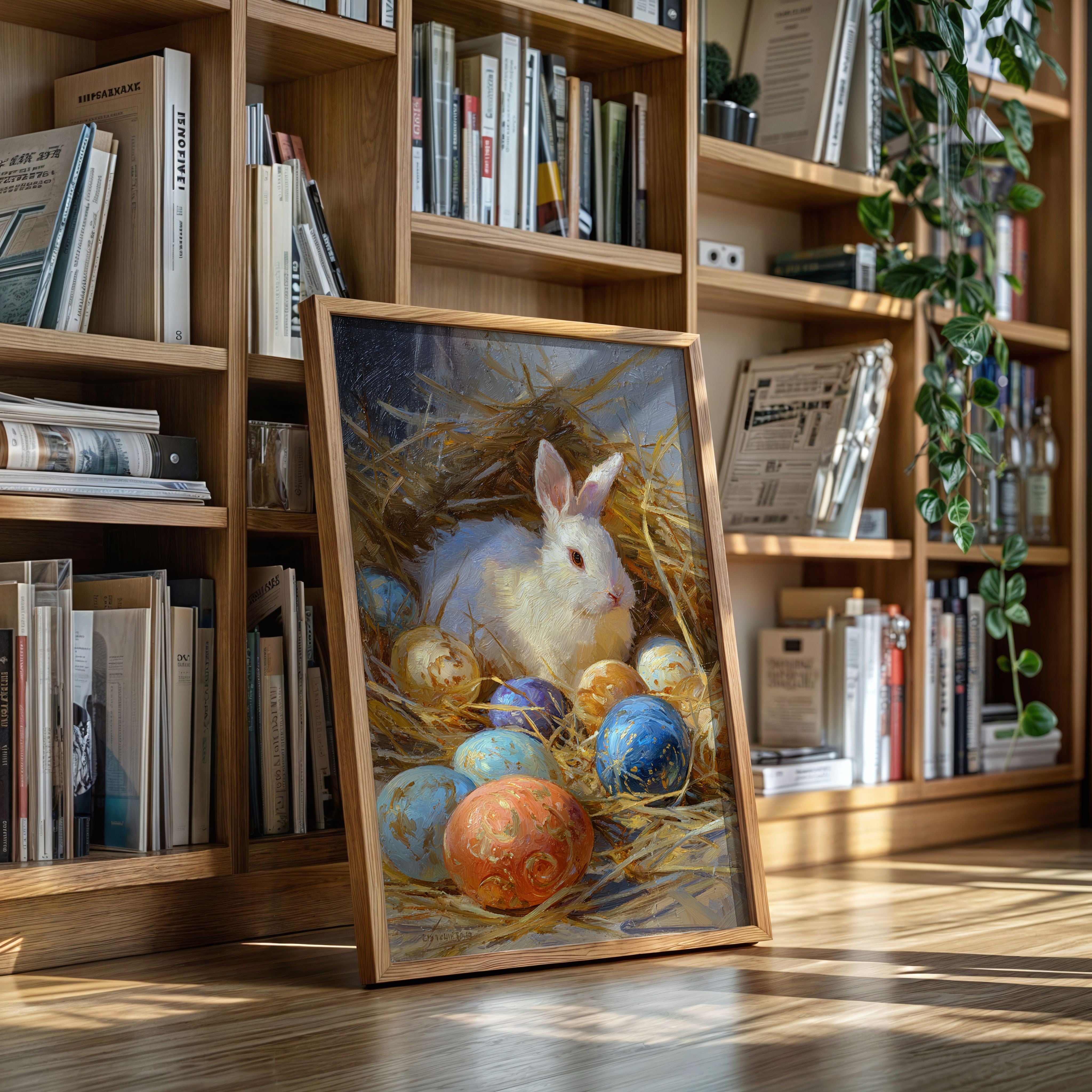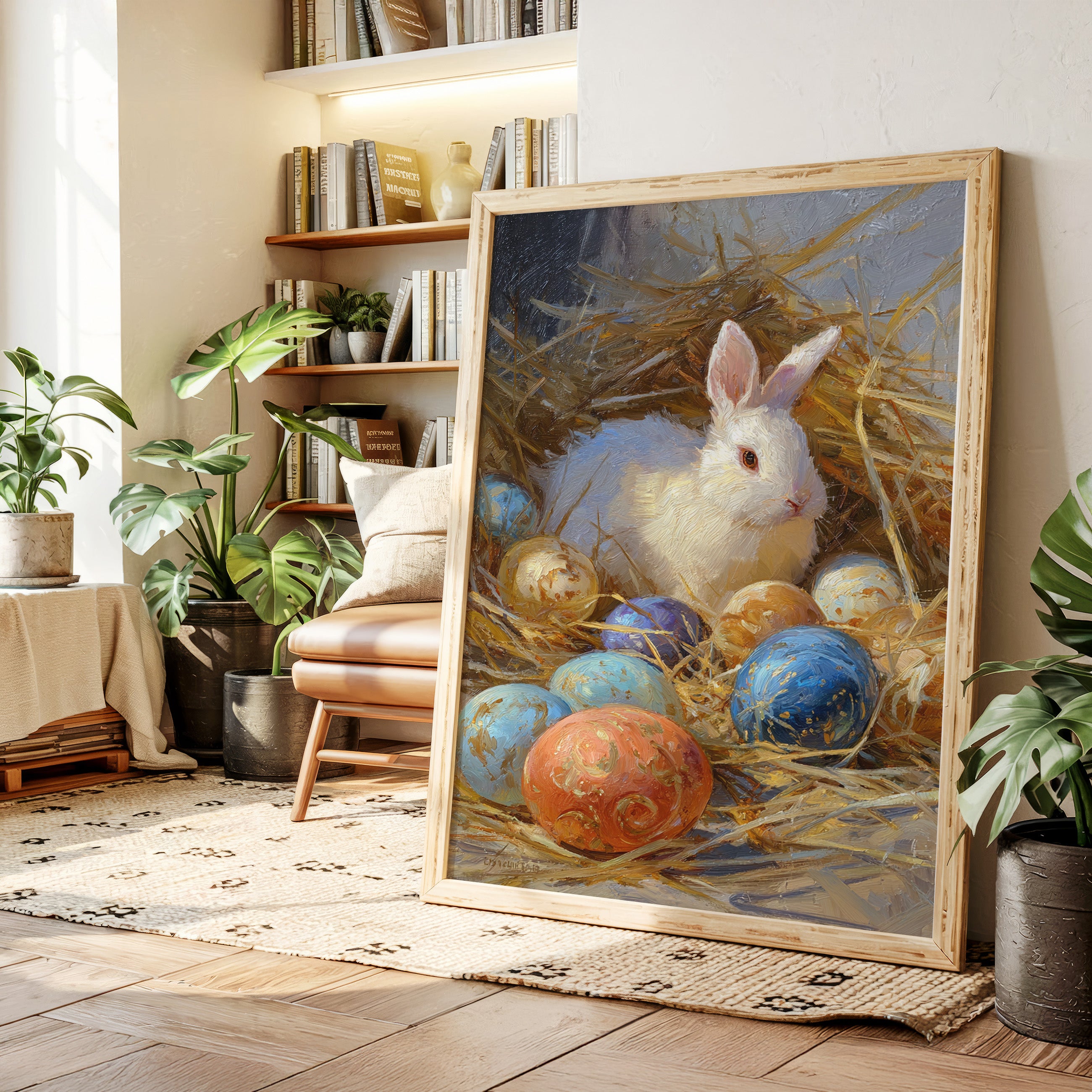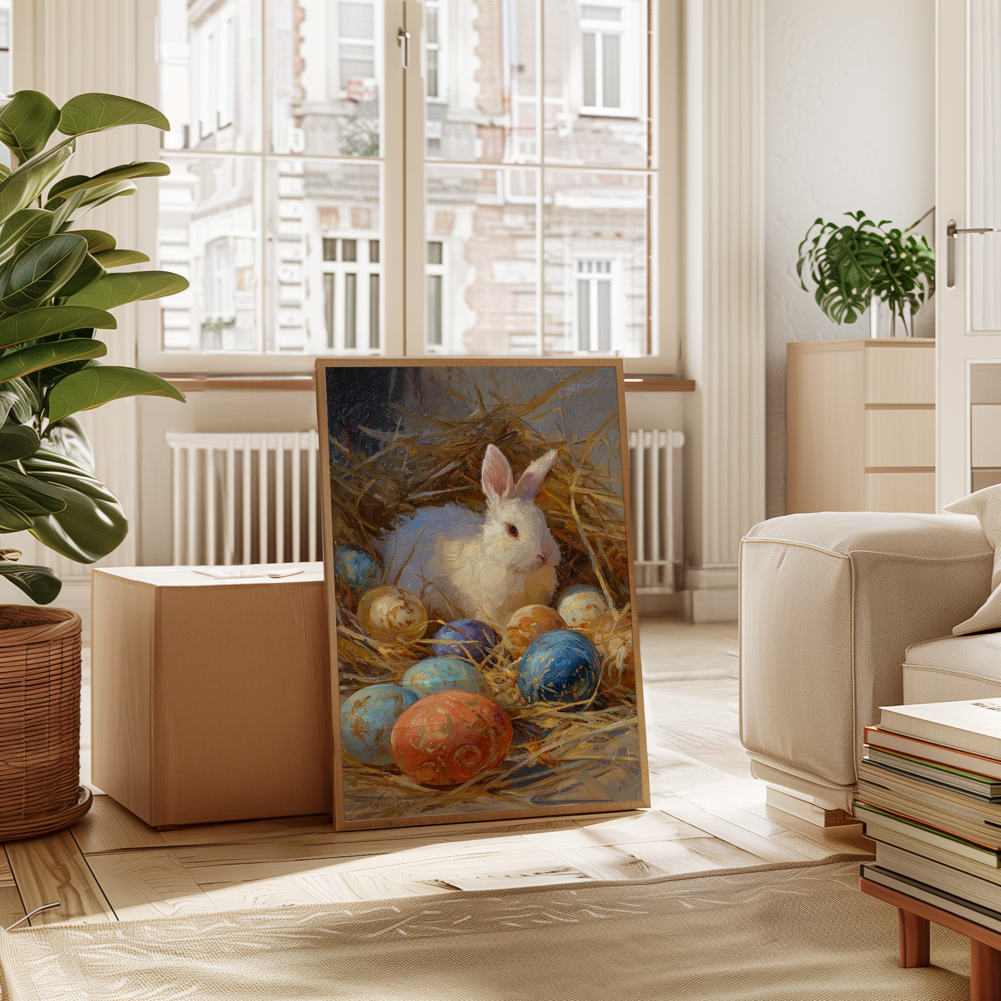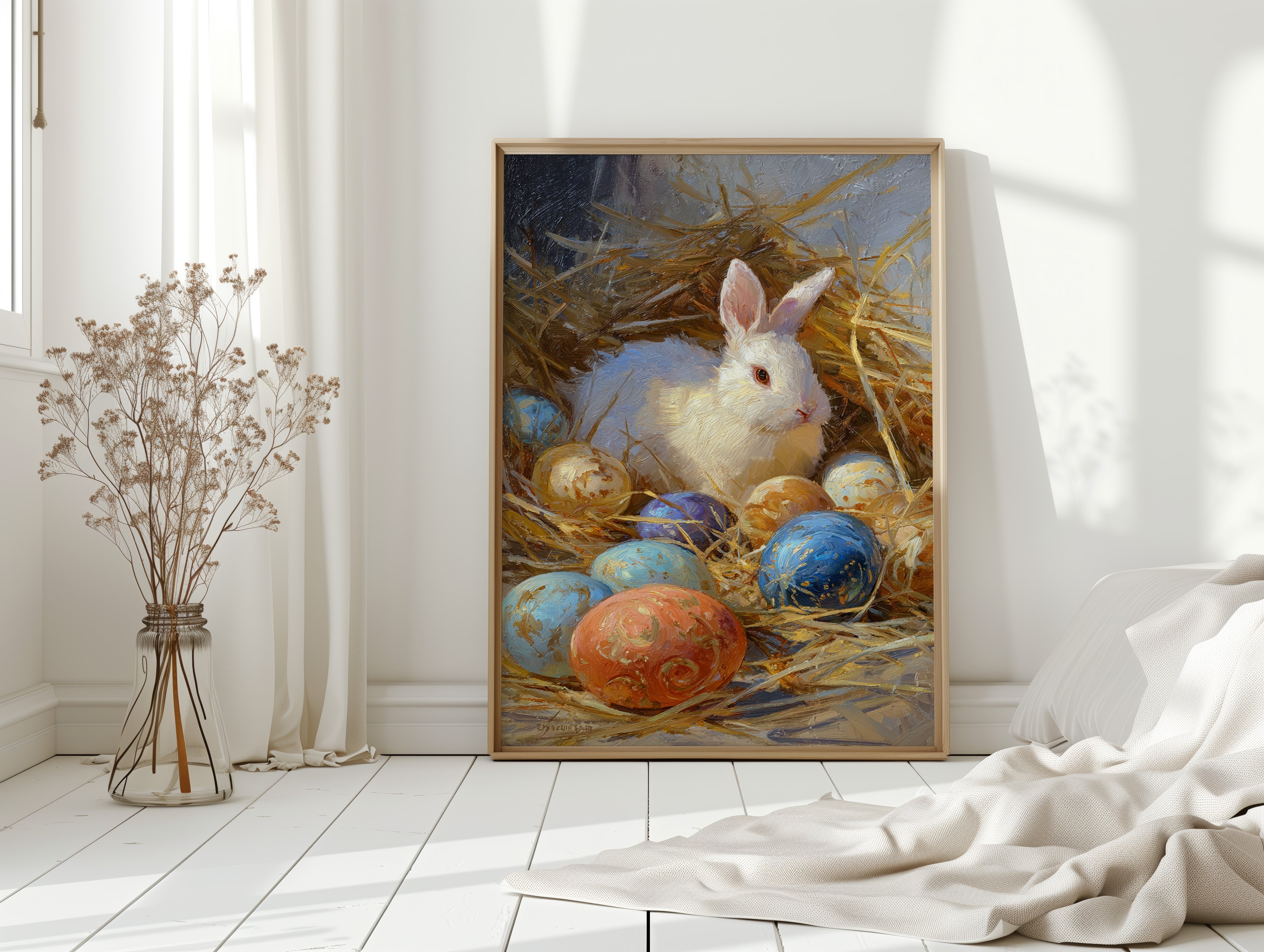 In a sunlit corner, a gentle rabbit rests among a vibrant array of painted eggs, their intricate patterns beckoning tales of springtime joy. This piece captures the spirit of the Artisanal collection, celebrating the beauty of handcrafted moments. The soft fur of the rabbit contrasts with the rich textures of the eggs, each hue alive with the promise of new beginnings. Ideal for brightening a child's room or adding a whimsical touch to a cozy nook.