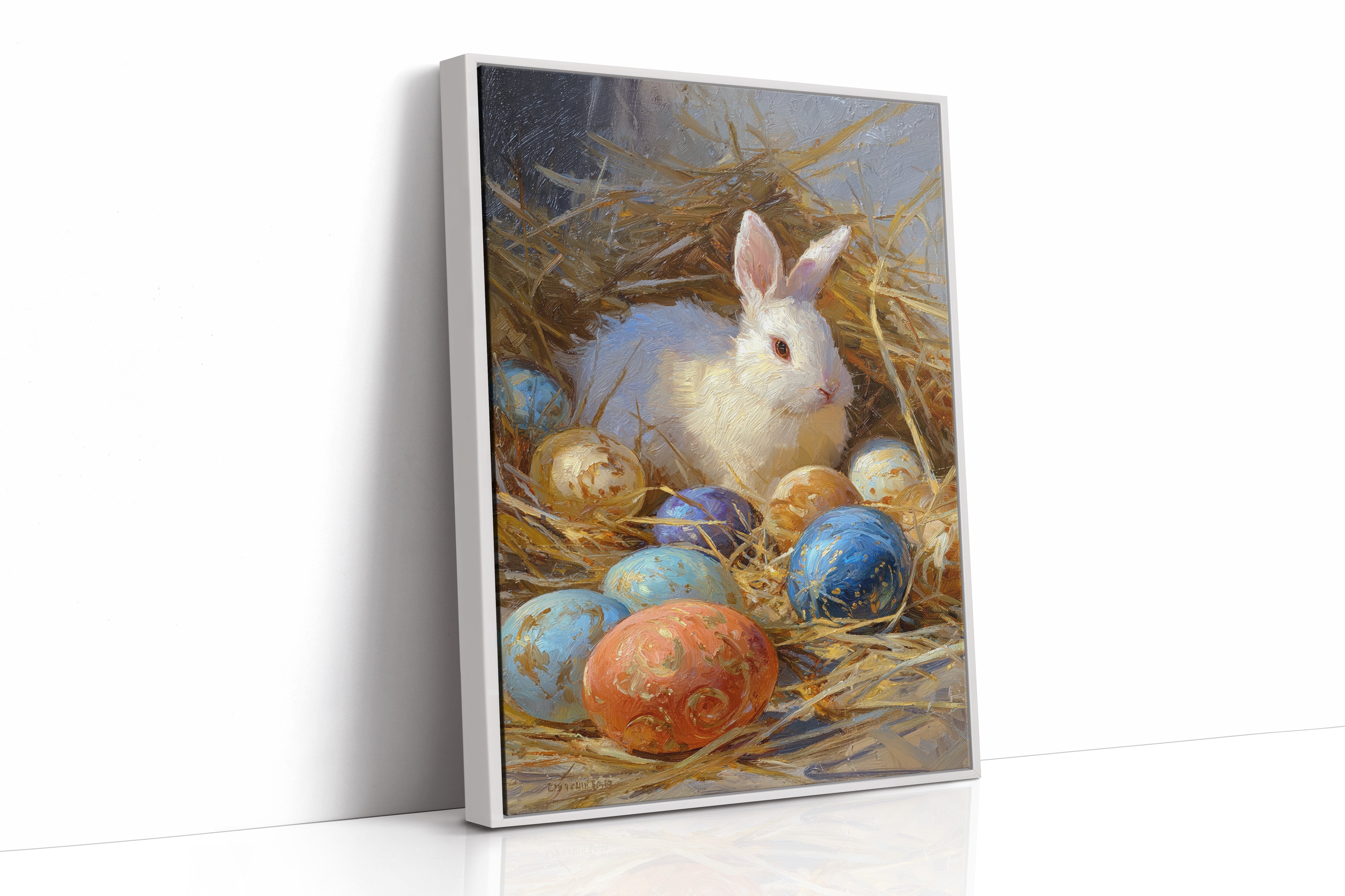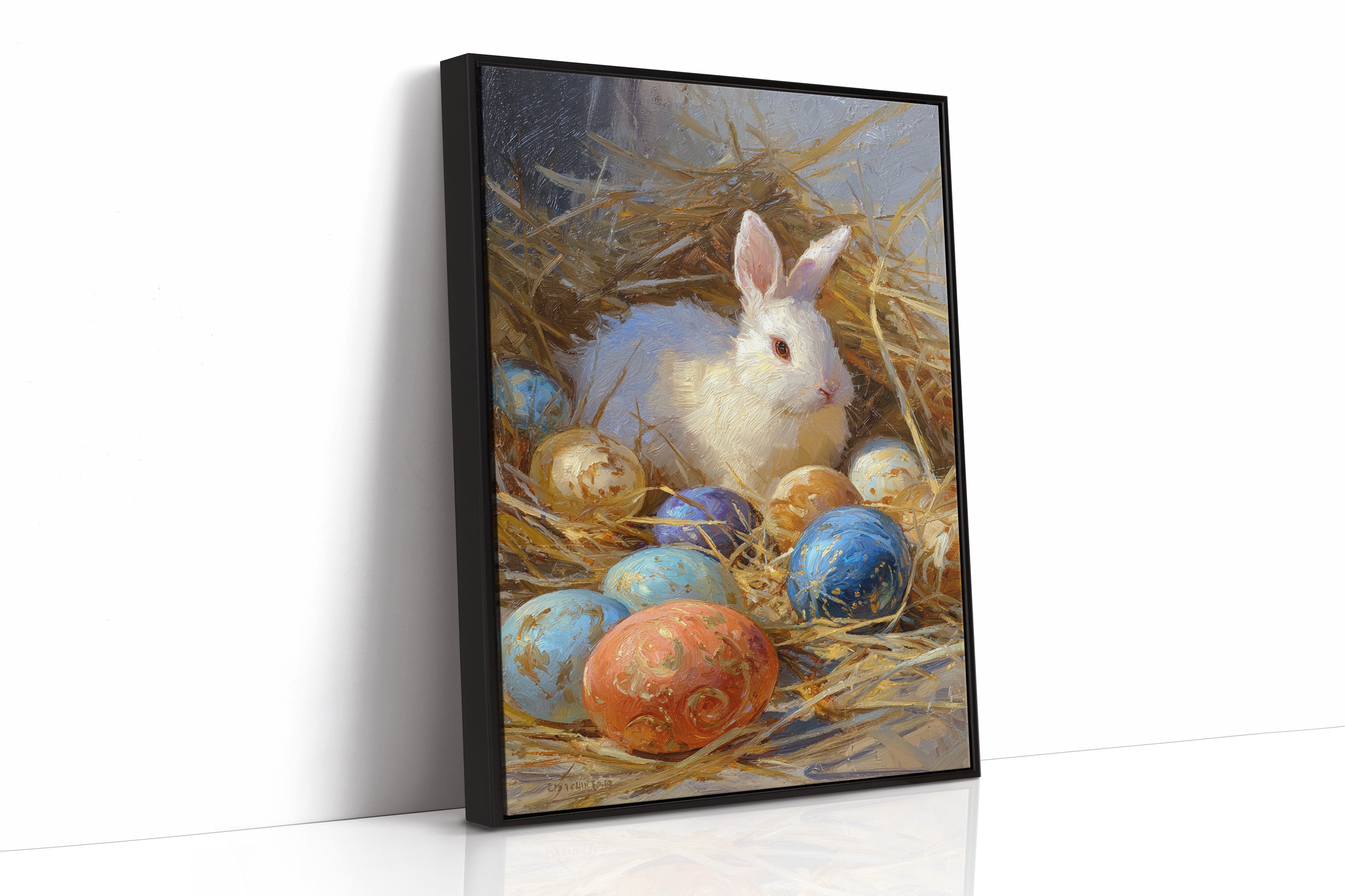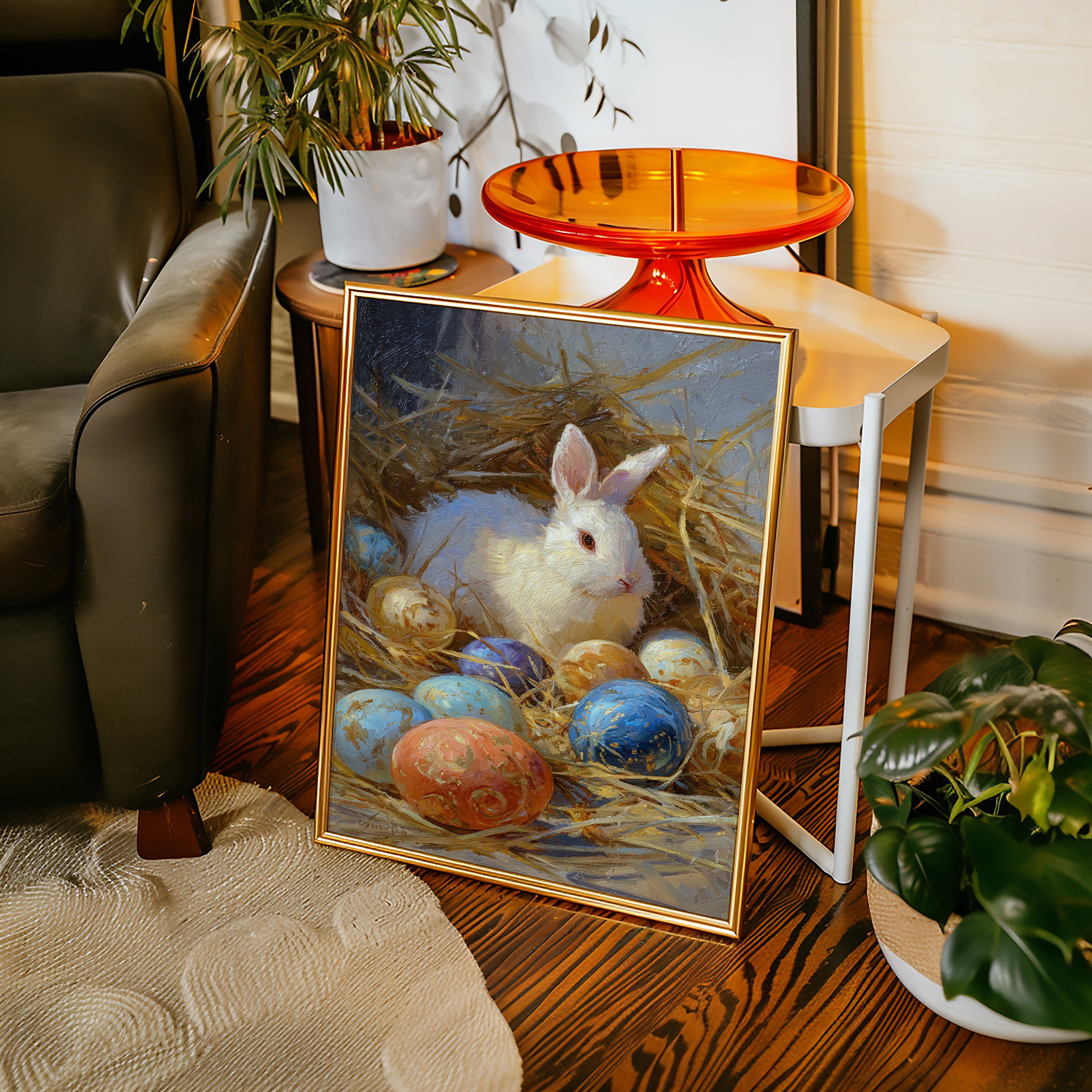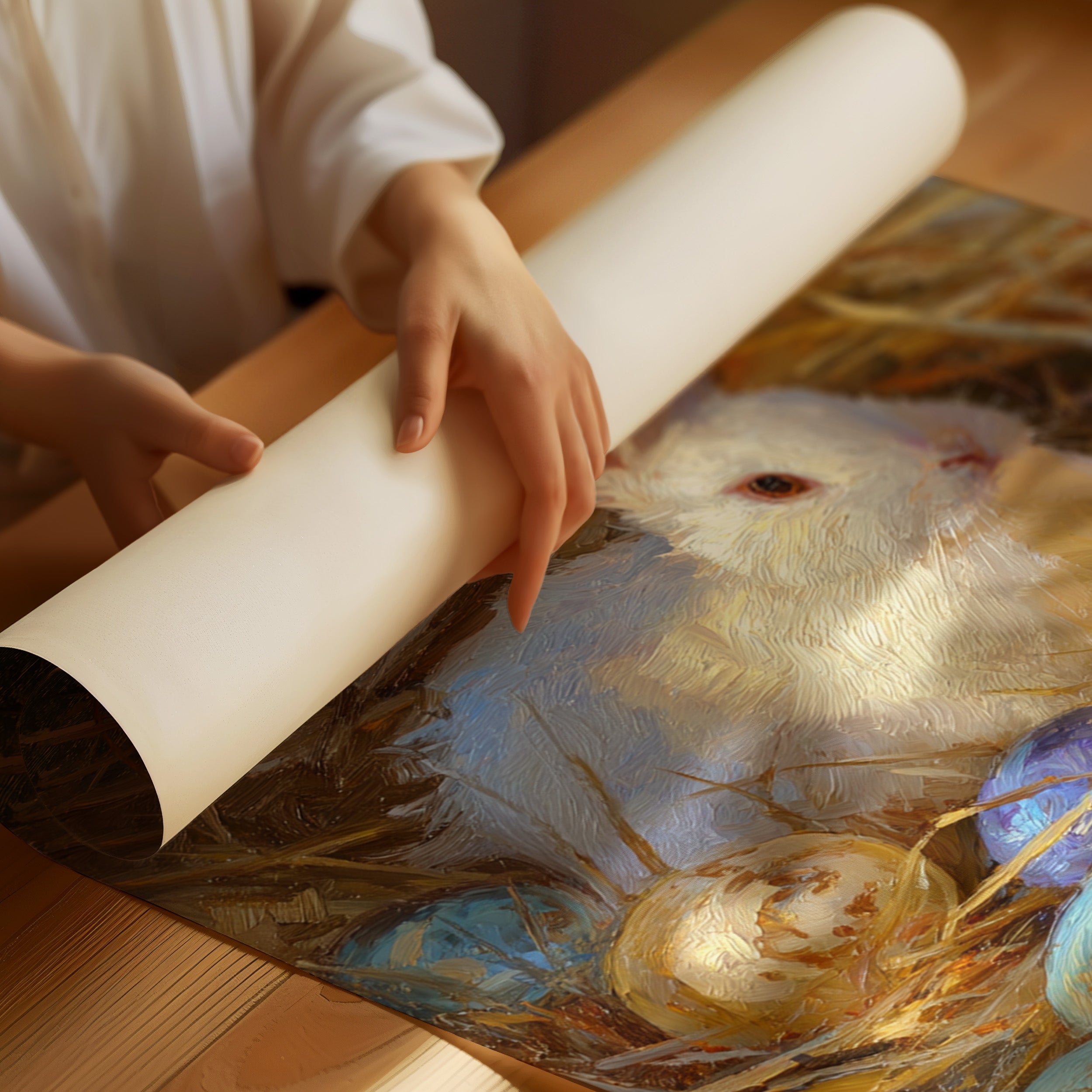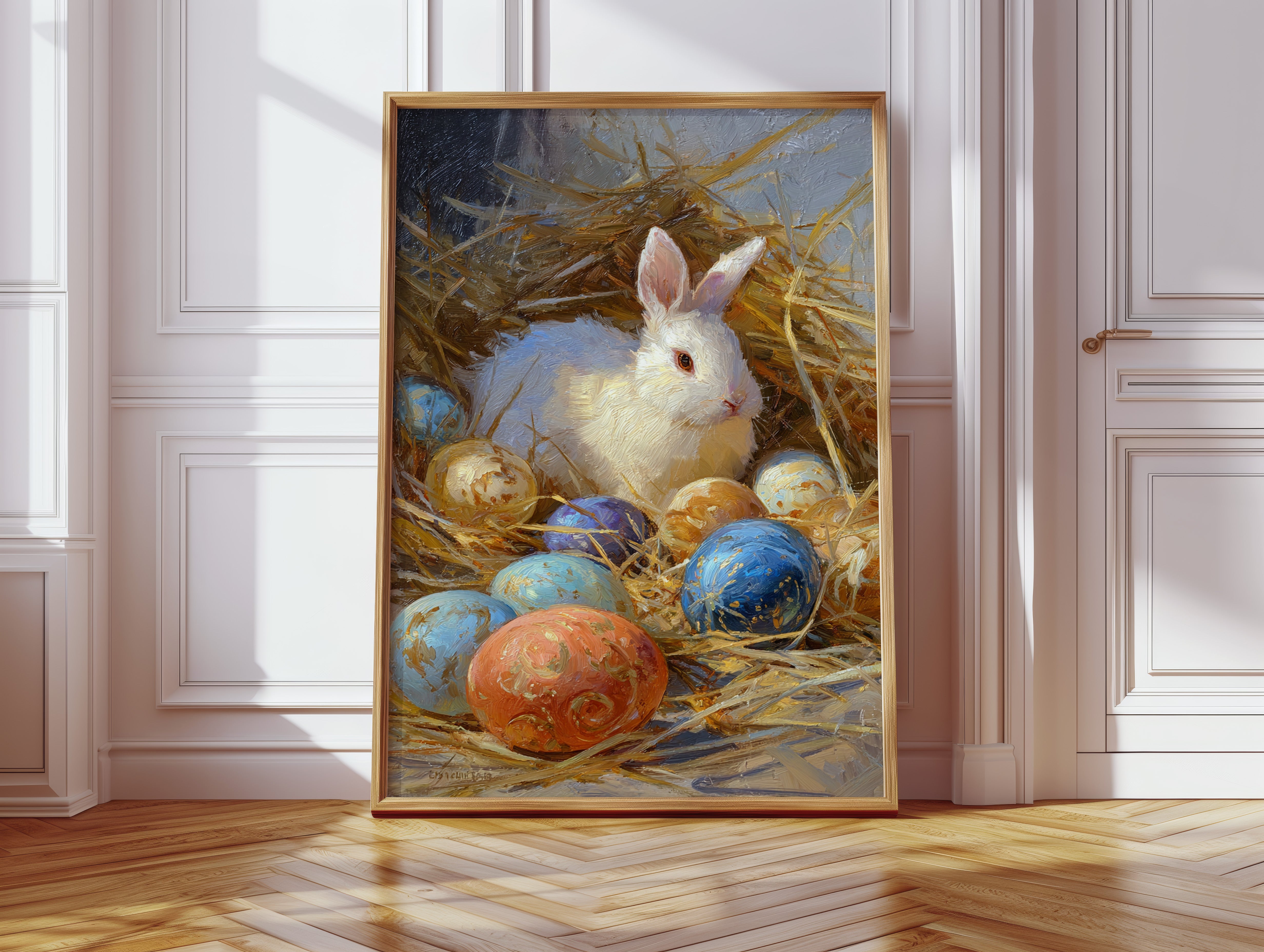 In a sunlit corner, a gentle rabbit rests among a vibrant array of painted eggs, their intricate patterns beckoning tales of springtime joy. This piece captures the spirit of the Artisanal collection, celebrating the beauty of handcrafted moments. The soft fur of the rabbit contrasts with the rich textures of the eggs, each hue alive with the promise of new beginnings. Ideal for brightening a child's room or adding a whimsical touch to a cozy nook.