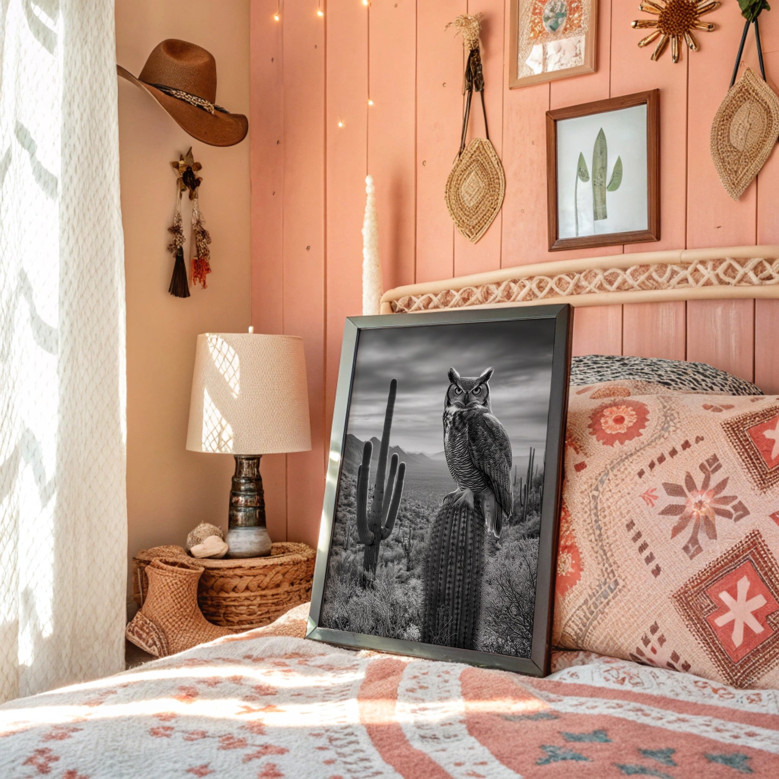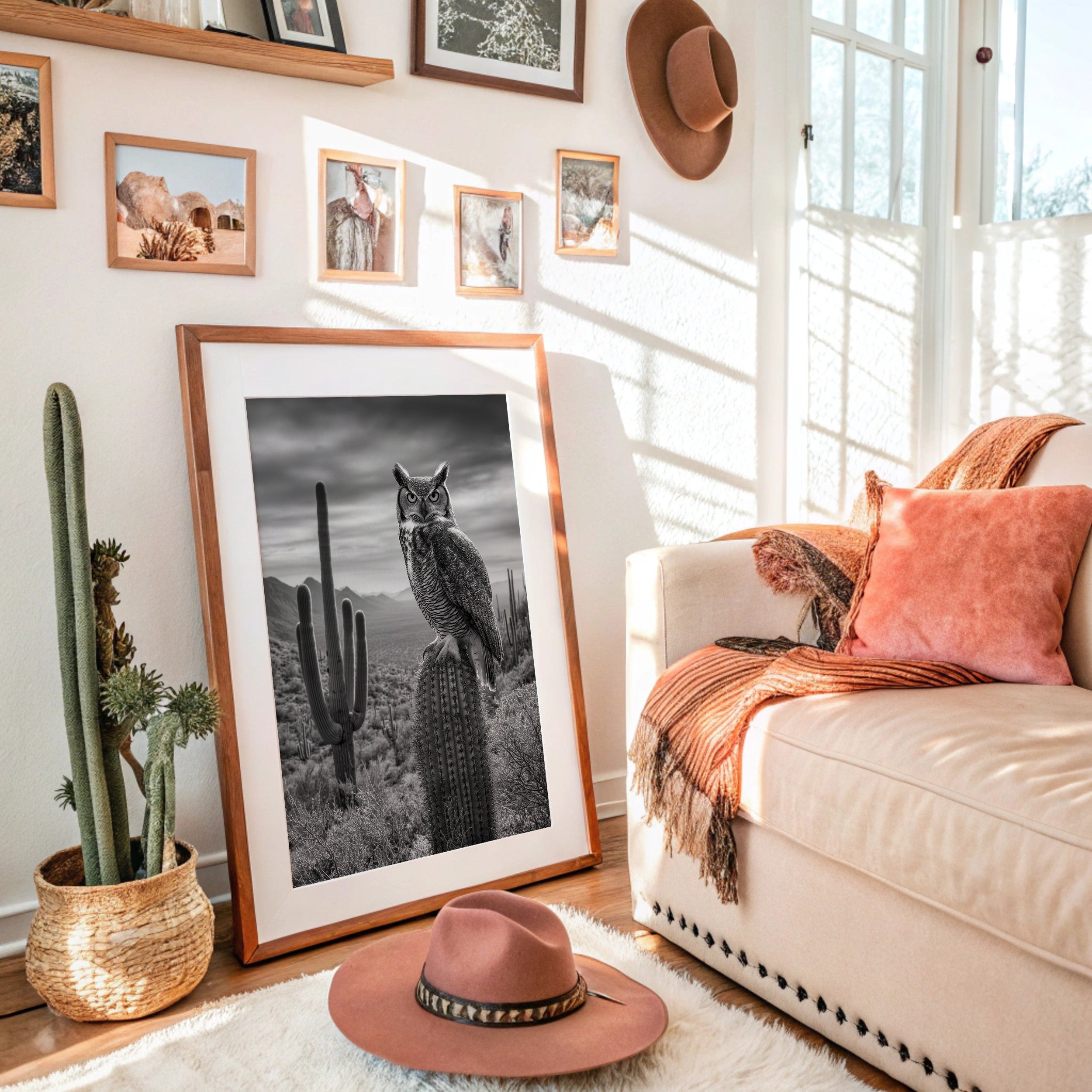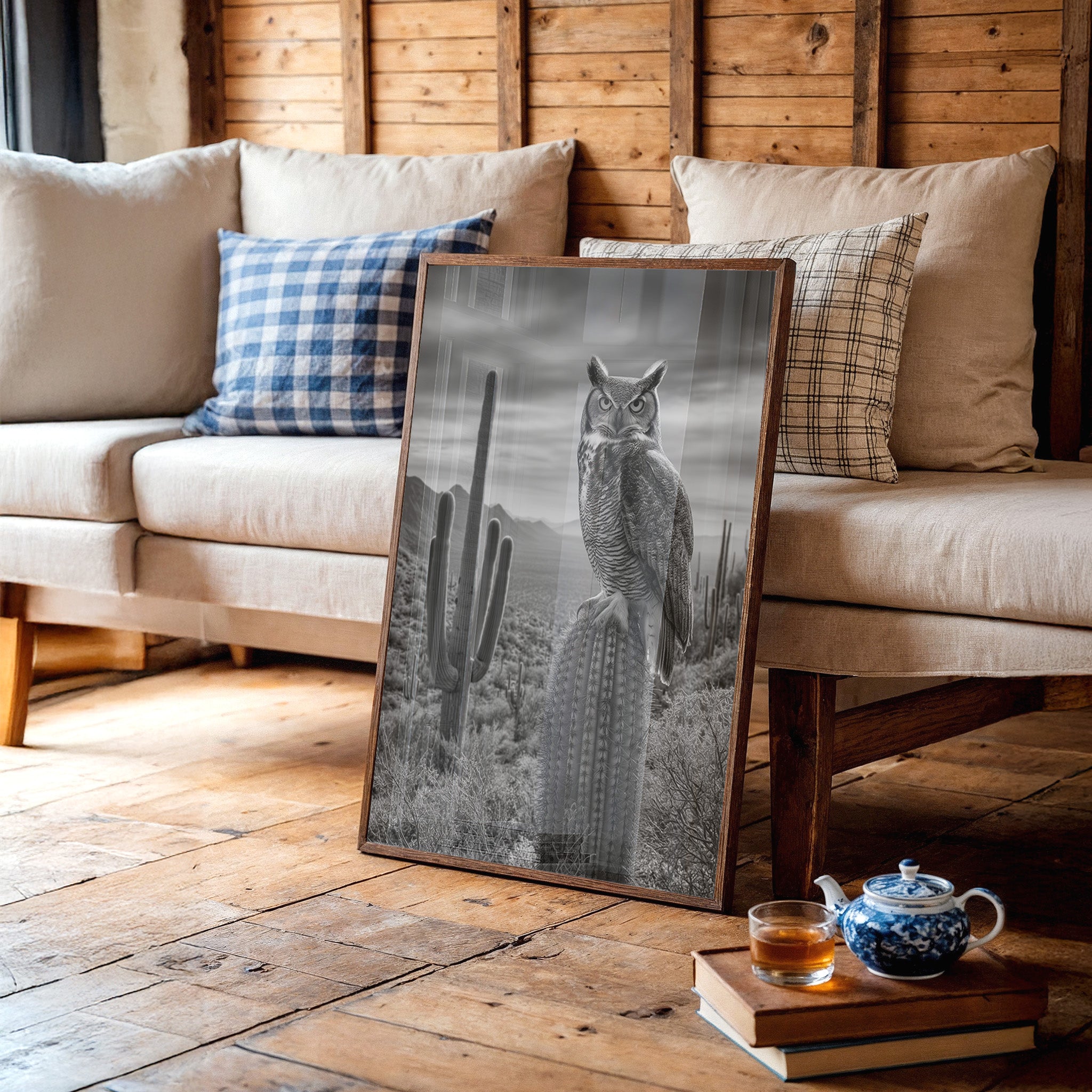 A majestic great horned owl stands sentinel atop a towering saguaro cactus, its piercing gaze commanding the desert landscape below. The black and white composition accentuates the dramatic contrast between the owl's fierce presence and the serene desert expanse, while distant mountains fade into moody clouds. This striking wildlife portrait captures both the untamed spirit of the Southwest and the quiet dignity of its nocturnal inhabitants. Perfect for adding a bold statement to a modern ranch house, rustic study, or any space celebrating the raw beauty of desert wildlife.