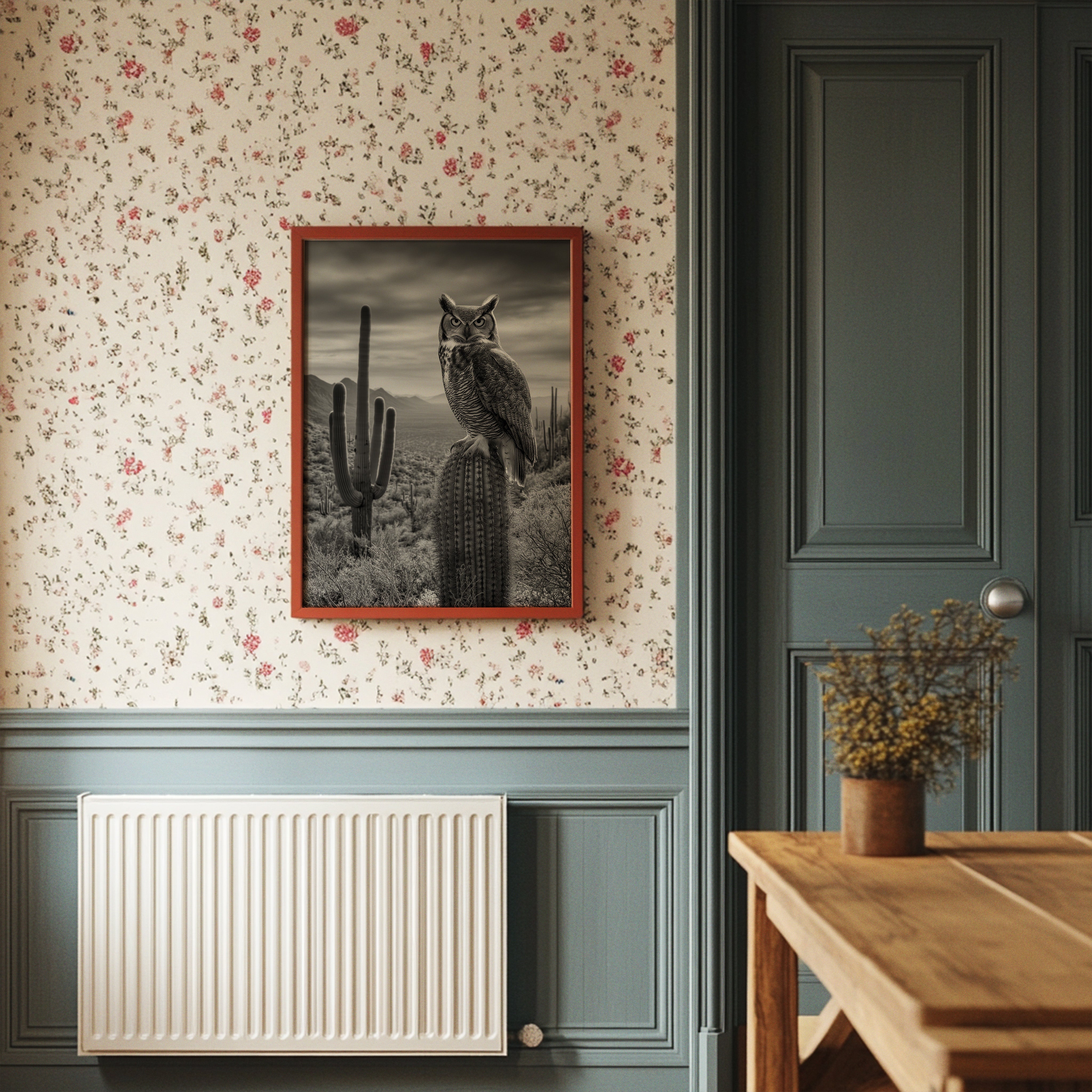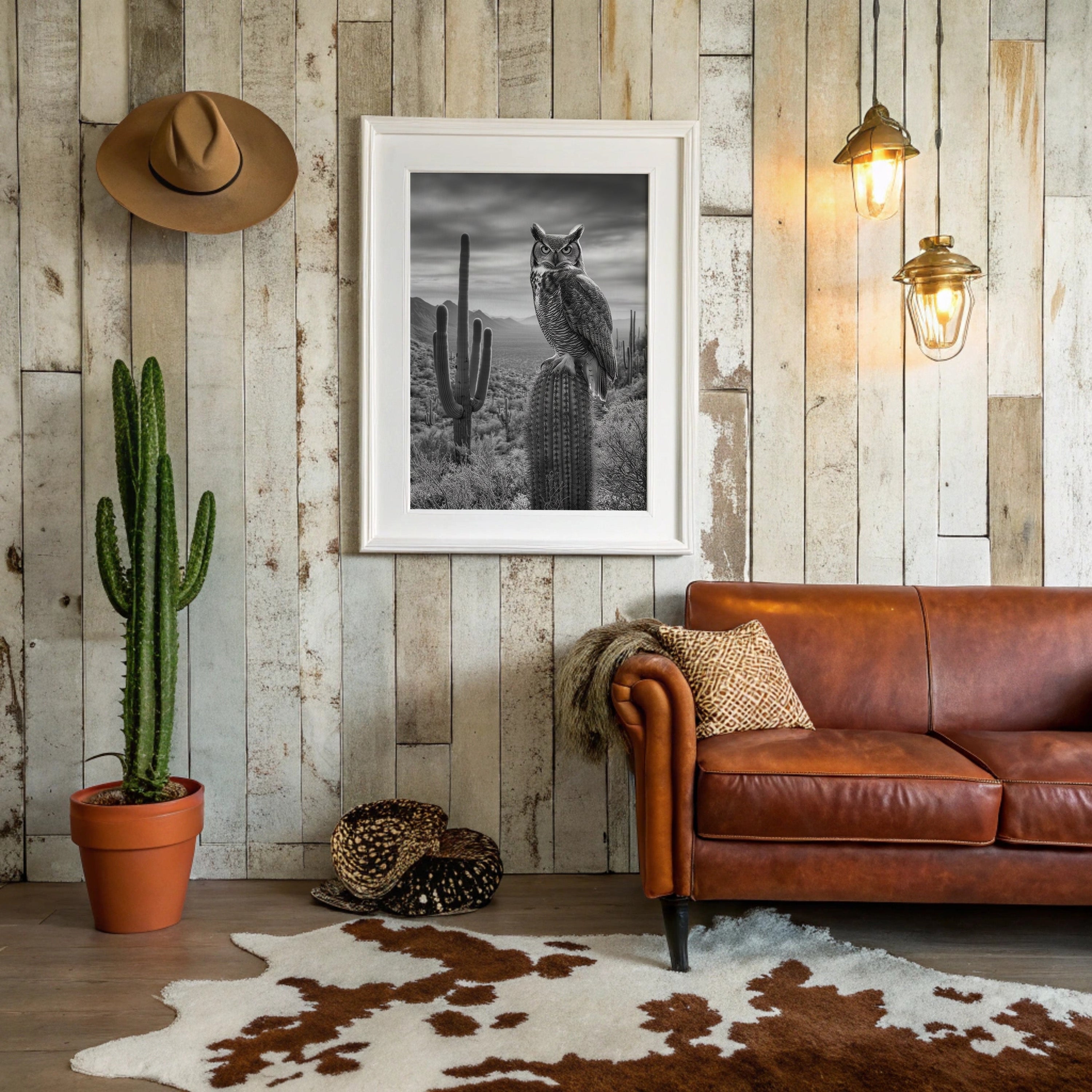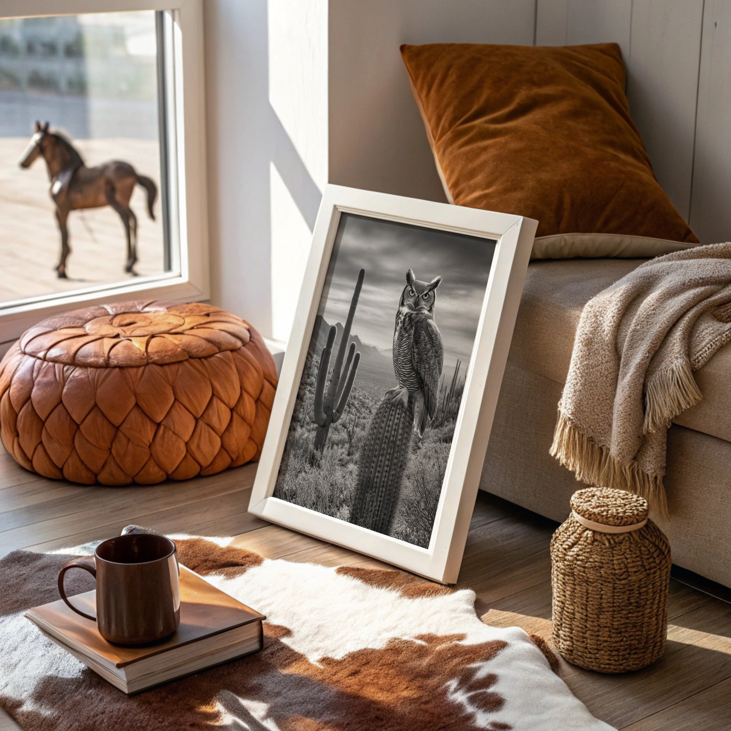 A majestic great horned owl stands sentinel atop a towering saguaro cactus, its piercing gaze commanding the desert landscape below. The black and white composition accentuates the dramatic contrast between the owl's fierce presence and the serene desert expanse, while distant mountains fade into moody clouds. This striking wildlife portrait captures both the untamed spirit of the Southwest and the quiet dignity of its nocturnal inhabitants. Perfect for adding a bold statement to a modern ranch house, rustic study, or any space celebrating the raw beauty of desert wildlife.