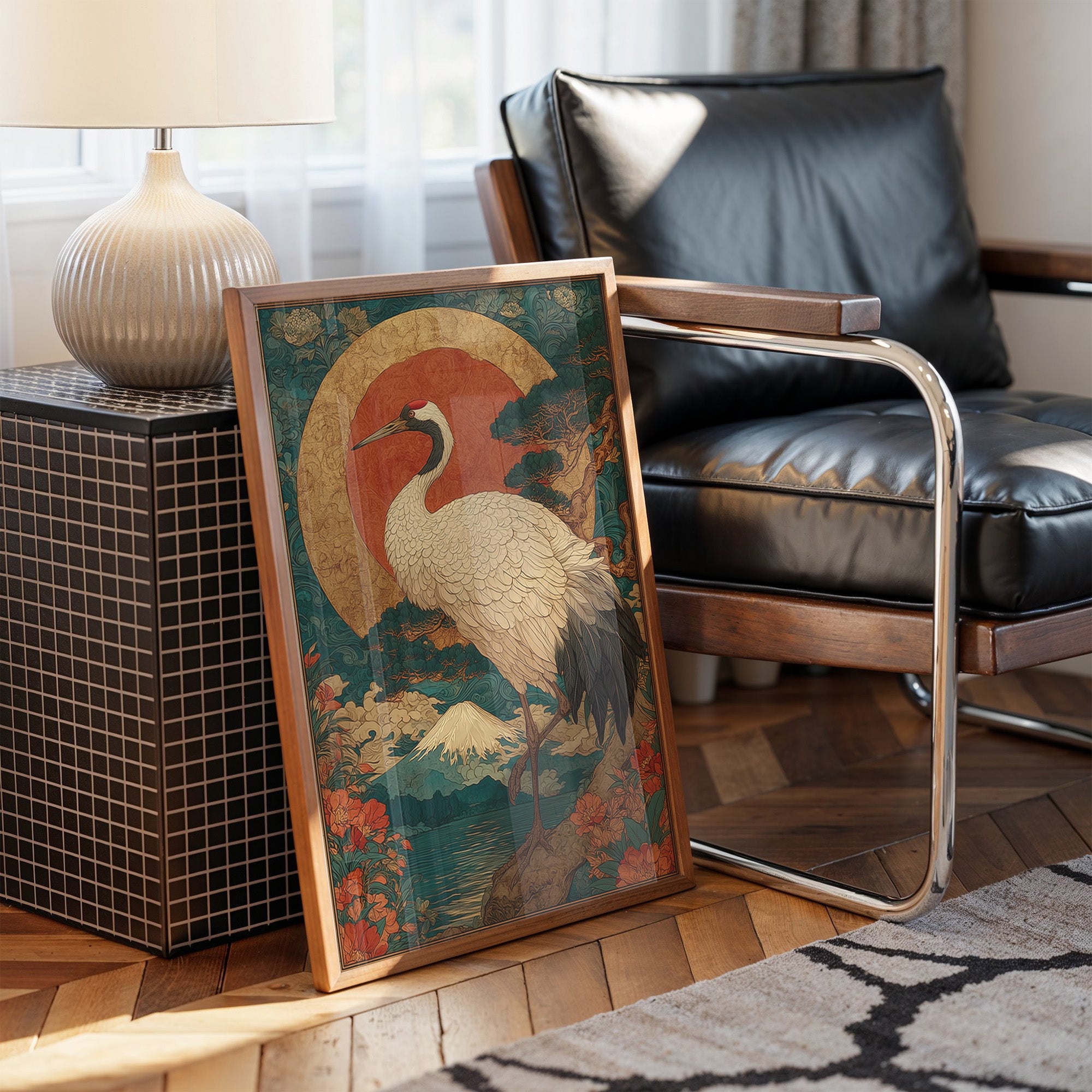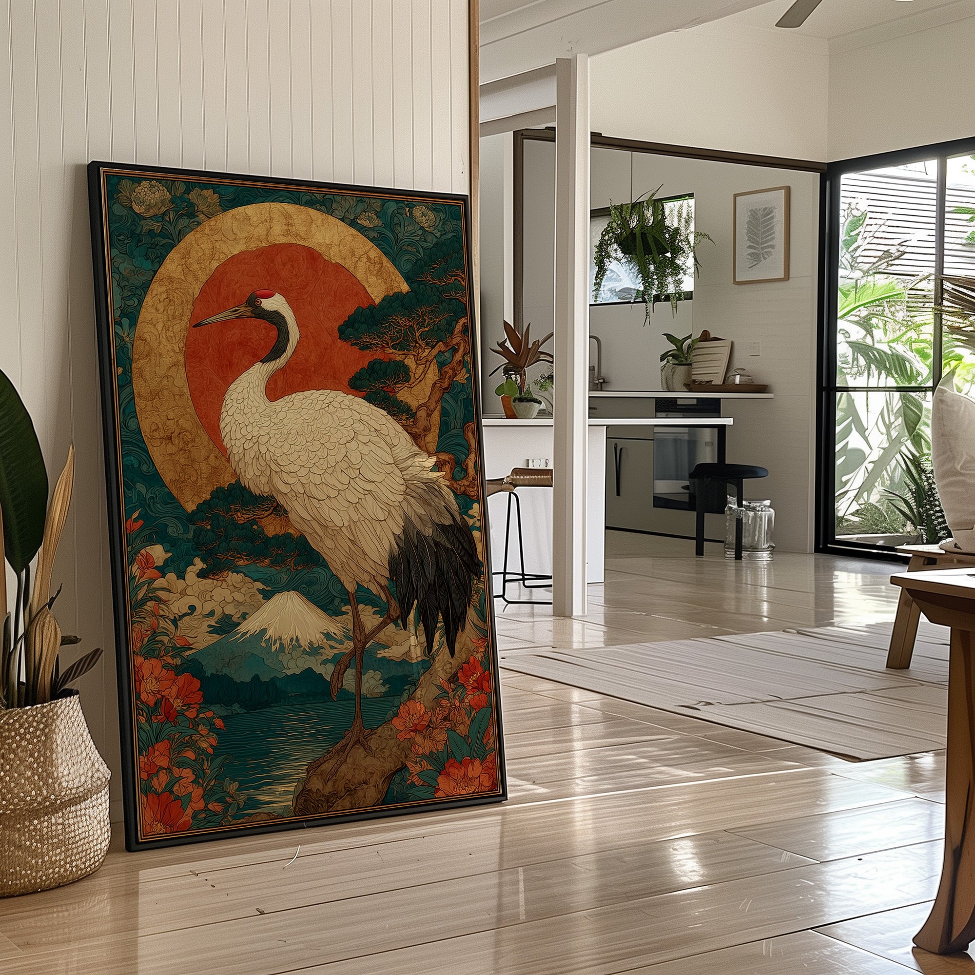 A majestic crane stands in quiet contemplation against a blazing orange sun, its feathers rendered in delicate detail against a rich teal landscape. The composition weaves together traditional Asian artistic elements with contemporary styling, featuring ornate florals and flowing patterns that dance across the scene. This striking piece balances warm terracotta tones with deep oceanic teals, creating a harmonious celebration of nature's elegance. This piece would transform a reading nook or dining room into a sophisticated sanctuary, bringing both serenity and artistic depth to any contemporary space.
