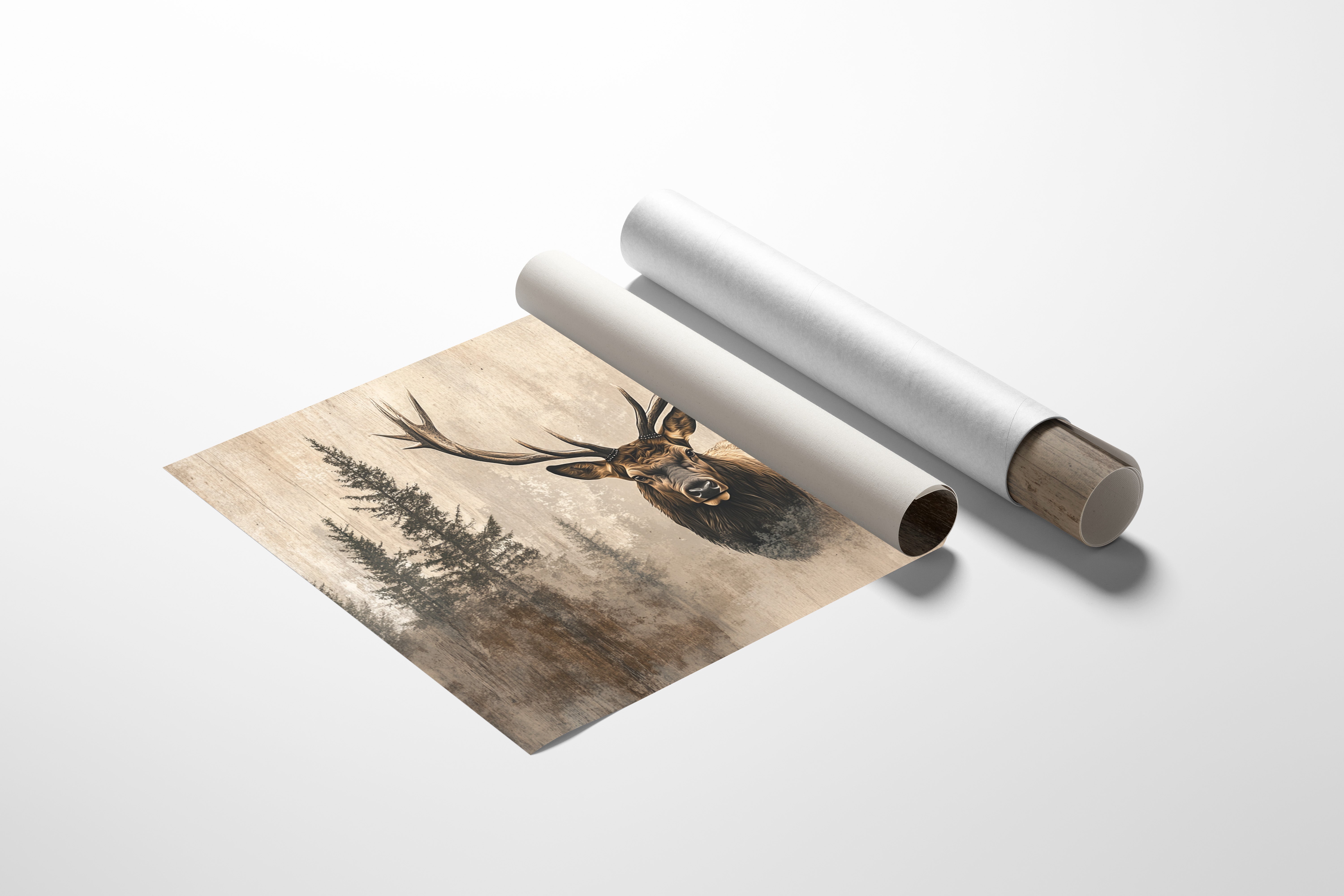 A majestic bull elk emerges from the misty forest, his presence commanding attention against a weathered backdrop. His impressive antlers crown him like nature's royalty, while his penetrating gaze holds ancient wisdom of the wilderness. The textured treatment creates a timeless quality, with earth tones and subtle grays merging the mighty creature with the ethereal pine forest behind him. This piece captures the raw dignity of wildlife while maintaining an artistic sophistication that elevates any space. Perfect for a mountain lodge great room, rustic study, or any space seeking to bring the quiet power of nature indoors.