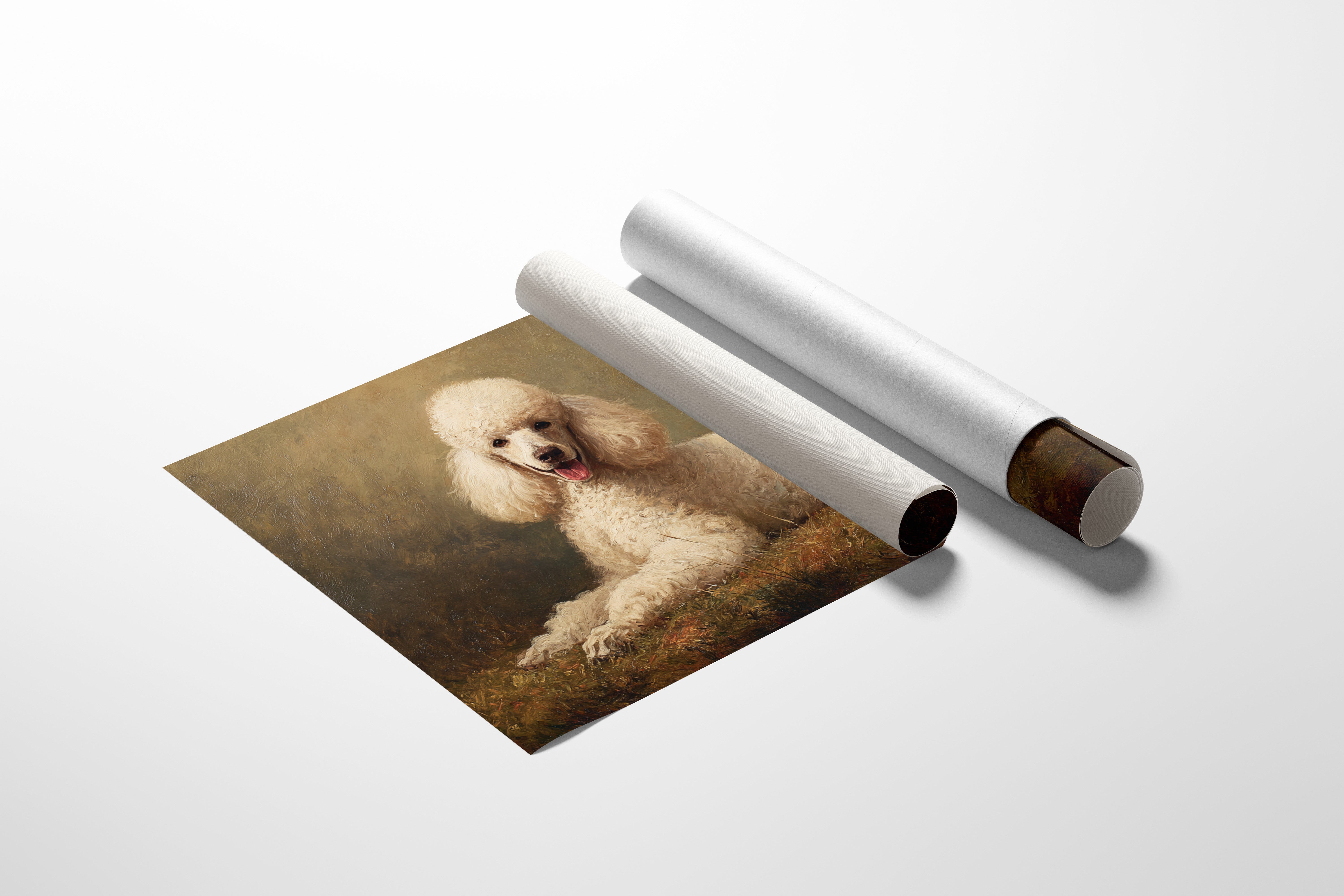 A regal white poodle radiates joy and elegance against a rich, painterly backdrop. The classical portrait captures every curl and wave of the dog's pristine coat, gleaming like fresh snow in warm light. Deep earth tones and masterful brushstrokes create a timeless atmosphere, while the dog's bright expression and relaxed pose convey both dignity and warmth. This sophisticated piece would bring character and refined charm to a study, living room, or any space celebrating the bond between humans and their four-legged companions.