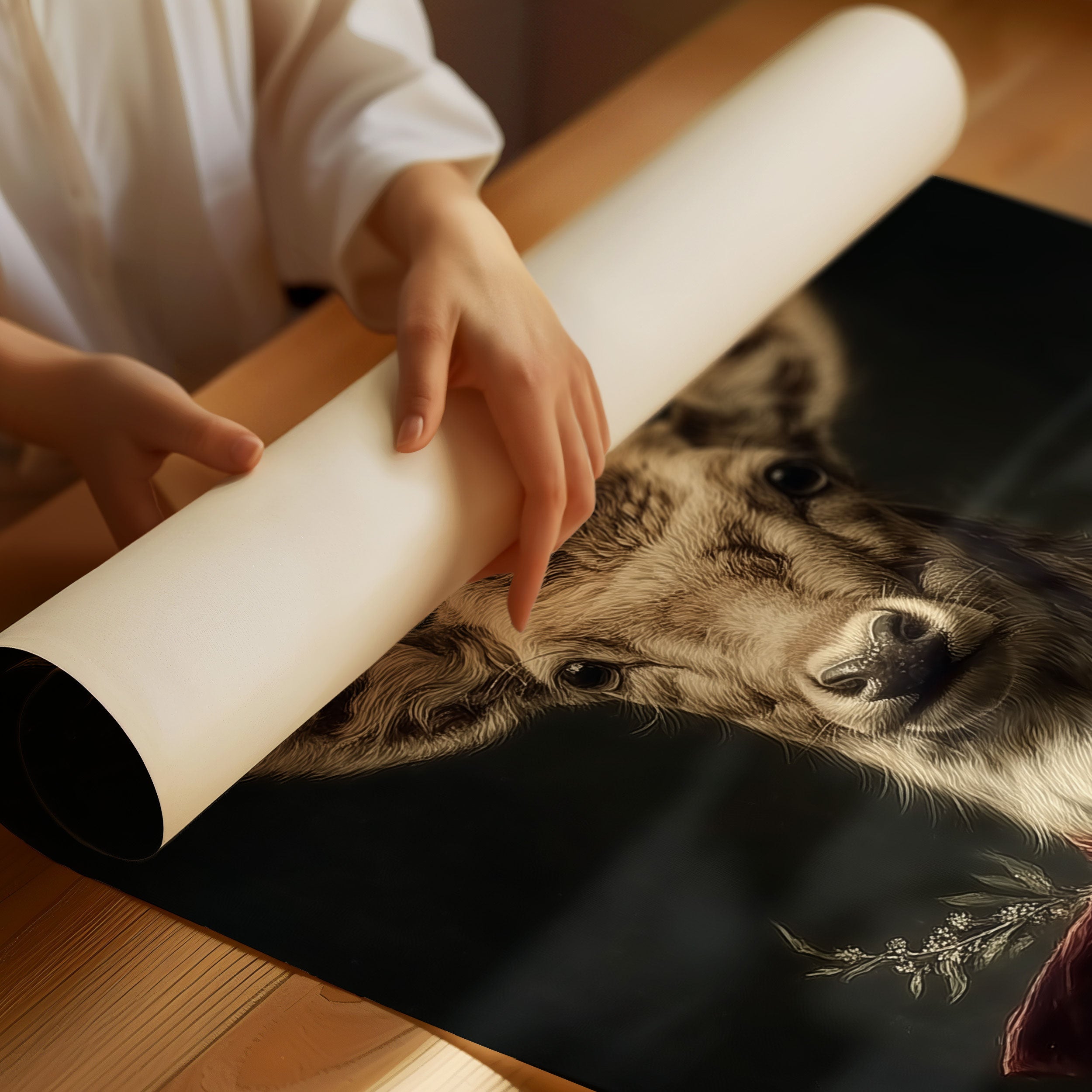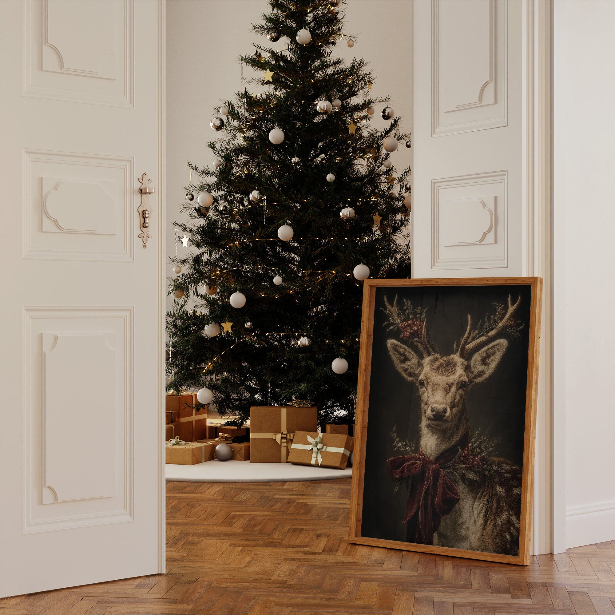 A regal young deer gazes softly through time, adorned with a luxurious burgundy velvet bow and delicate winter botanicals. The portrait captures an ethereal quality, with rich earth tones and masterful shadowing that brings depth to each carefully rendered detail of fur and antler. Against a dramatic dark background, the deer's gentle expression and festive decorations create a perfect harmony between wild nature and holiday refinement. This distinguished portrait would make a striking statement piece in a lodge-inspired living room or add seasonal sophistication to a formal dining space during winter celebrations.
