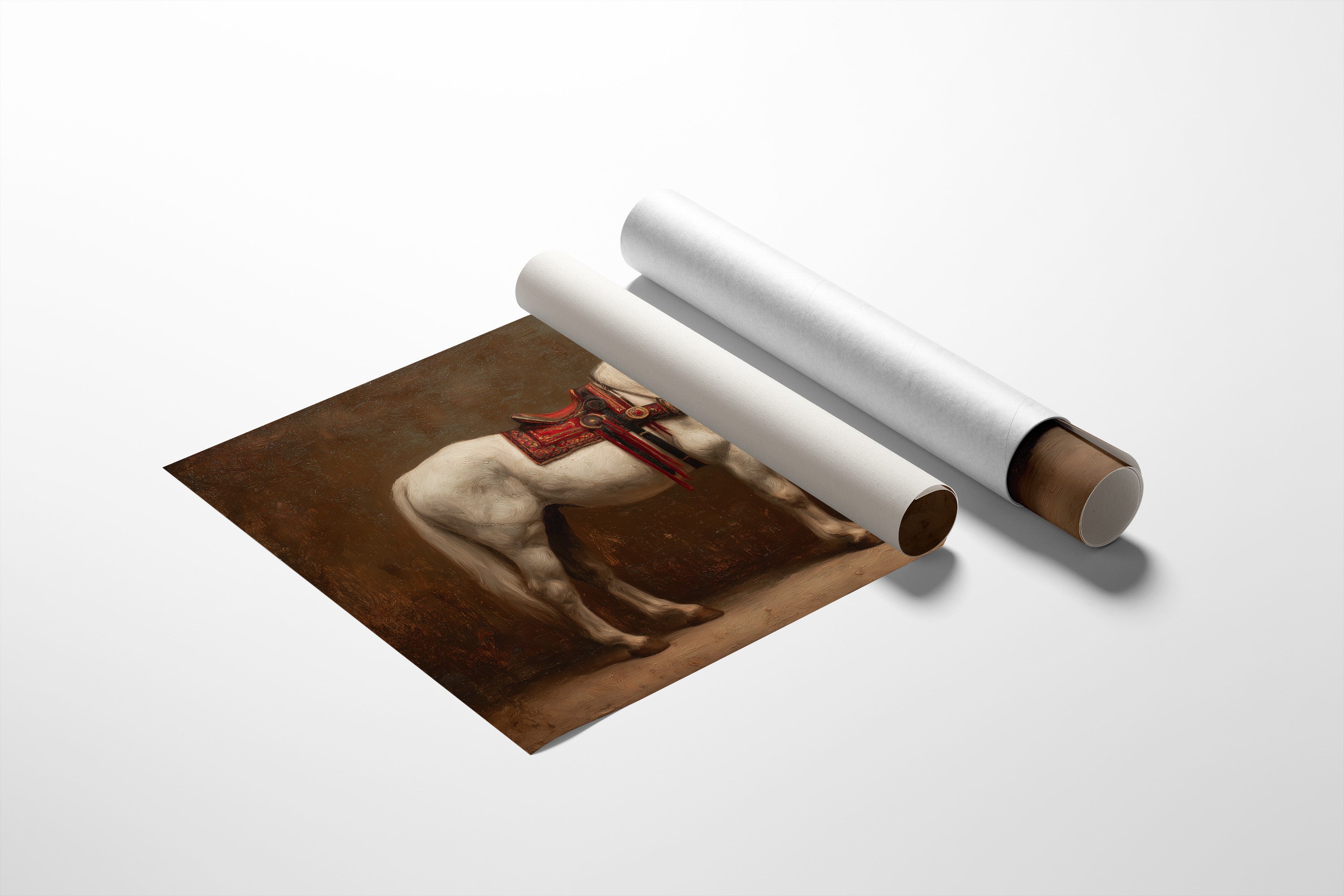 A moment of quiet elegance captured where past meets present. The classical portrait of a white horse adorned with rich crimson tack stands proudly against a backdrop of countless stories waiting to be discovered. Warm sepia tones of the painting contrast beautifully with the orderly rows of booksspines in cream, navy, and burgundy creating a sophisticated palette of knowledge and artistry. This striking piece brings equestrian nobility into a contemporary setting, perfect for a study, reading nook, or any space where intellectual curiosity meets refined taste.