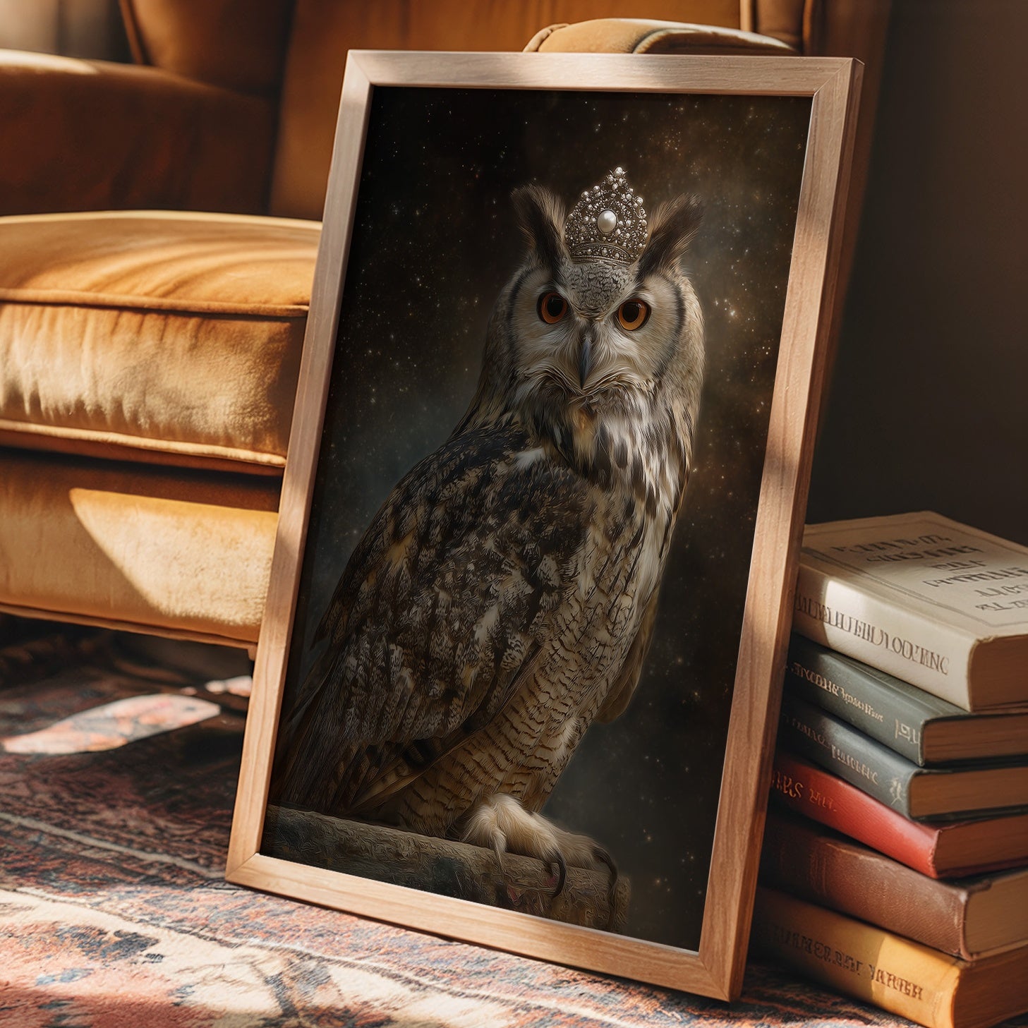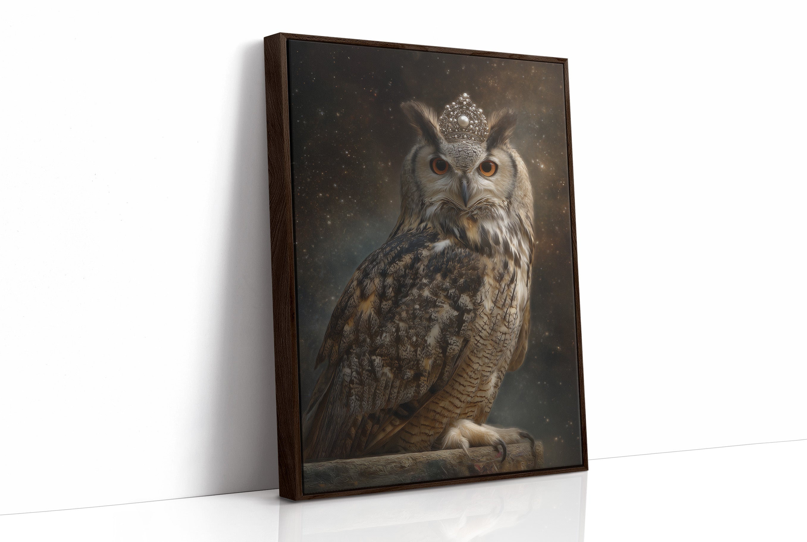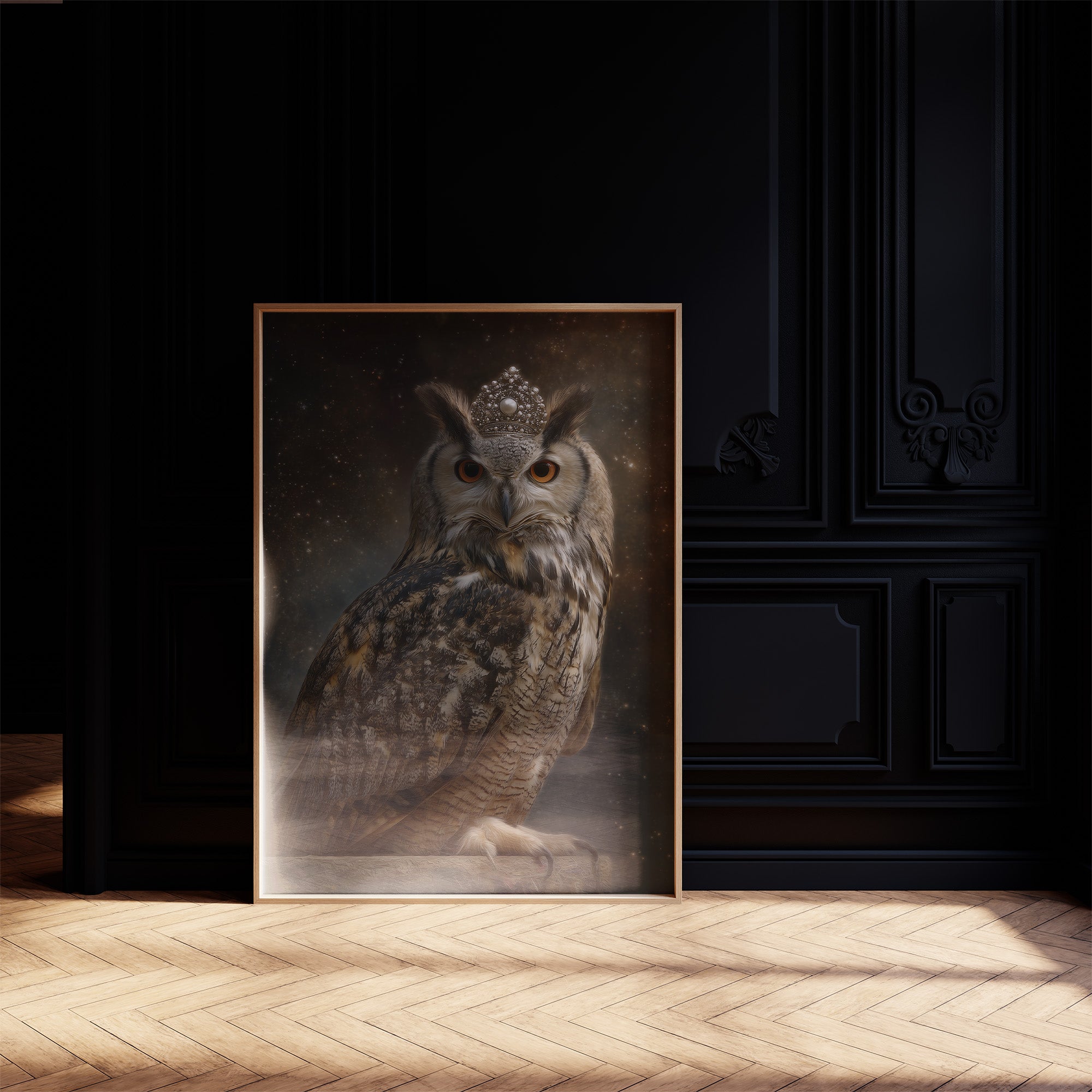 Amber eyes pierce through the veil of dusk, commanding attention with regal intensity. The crowned owl sits poised against a backdrop of misty darkness, its feathers a tapestry of earthy browns and subtle grays illuminated by ethereal light. Delicate sparkles dance around the silver diadem, transforming this woodland hunter into a mystical monarch of the night forest.