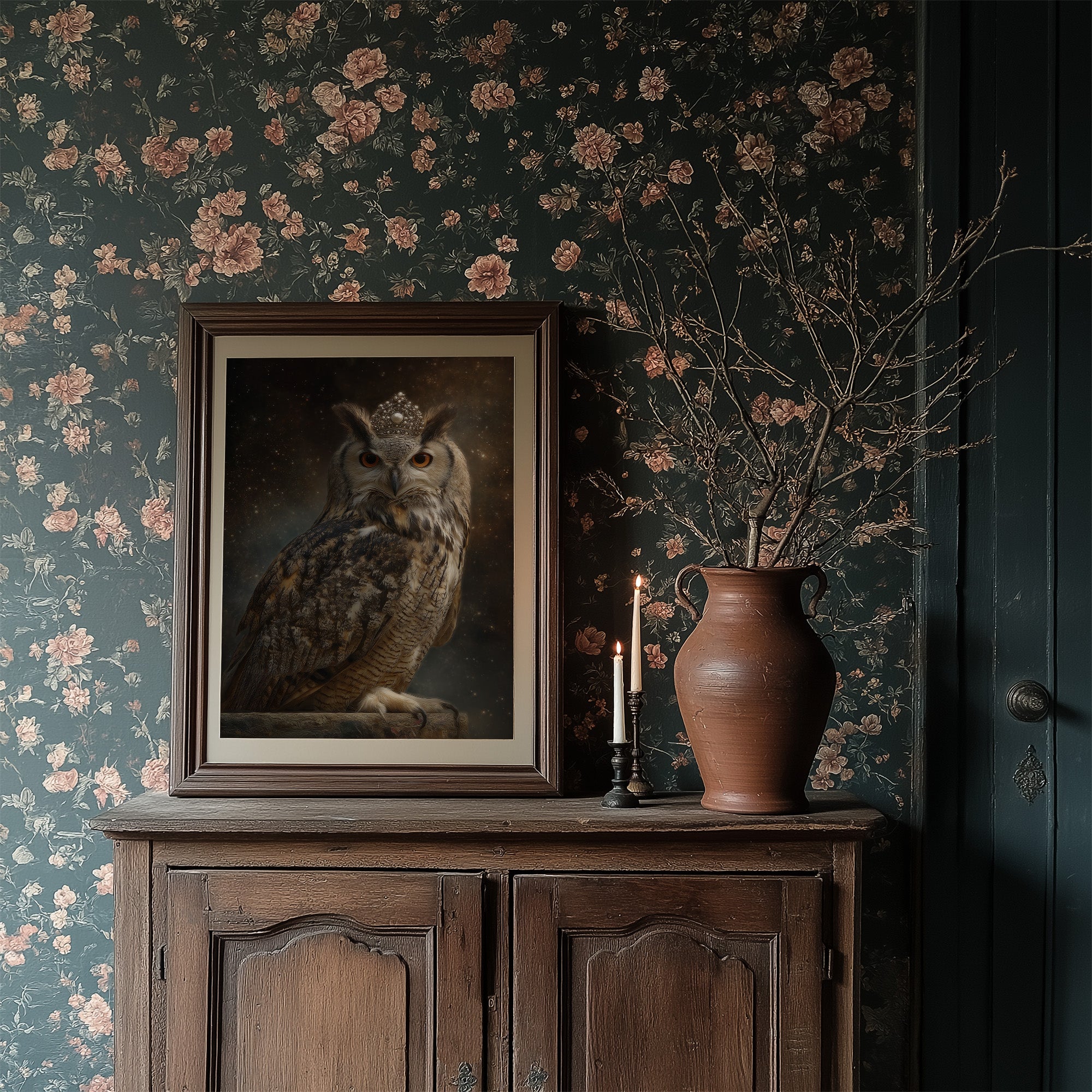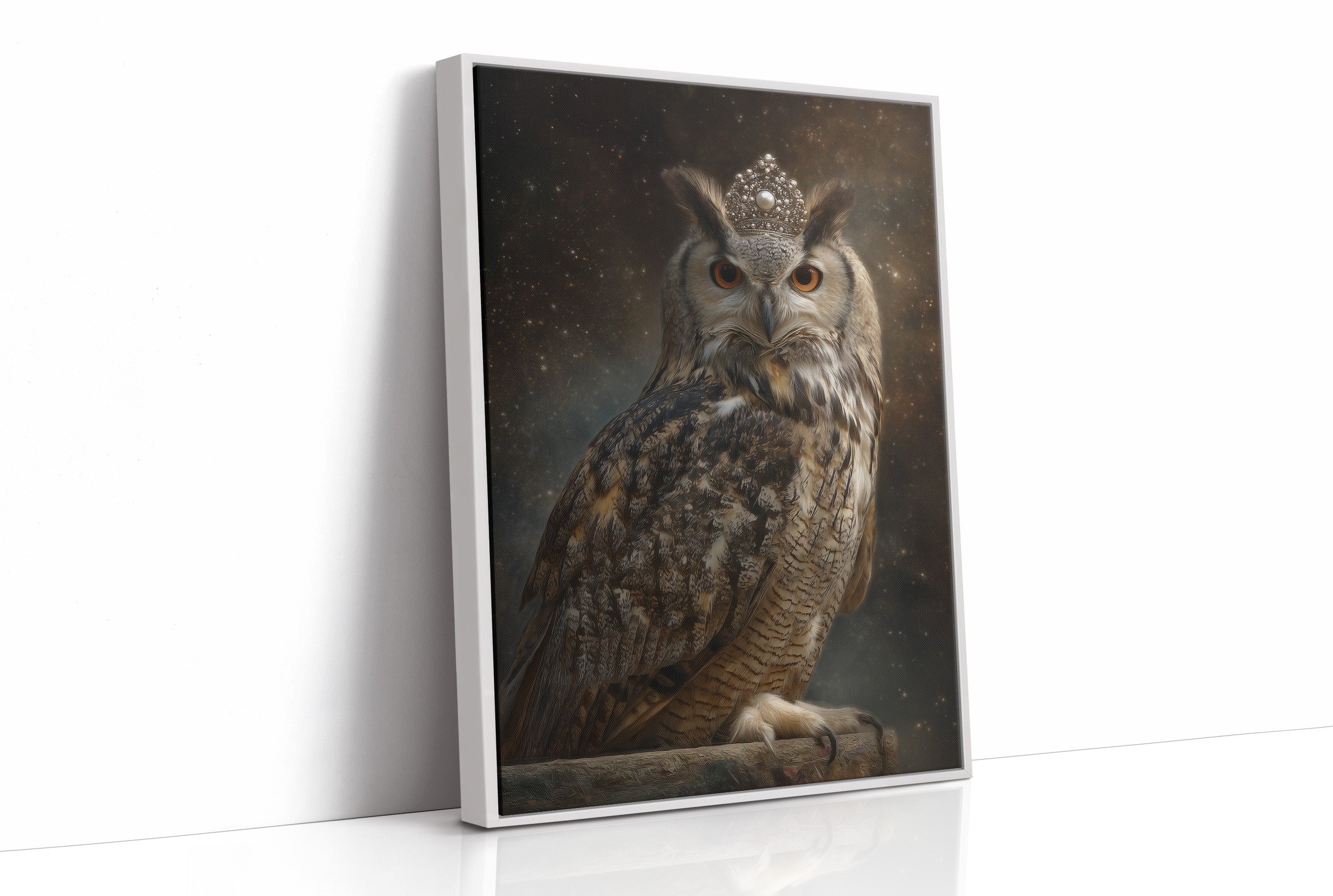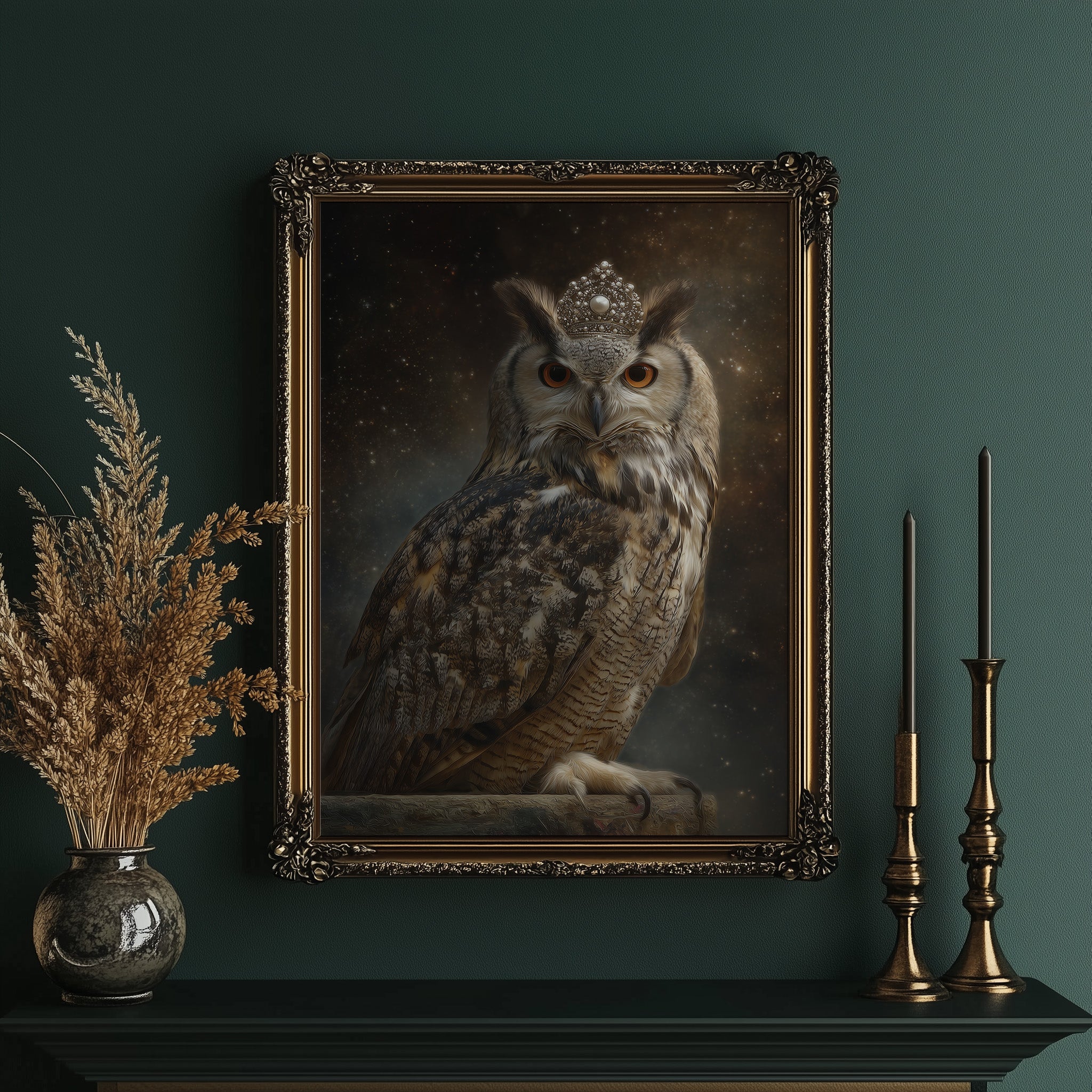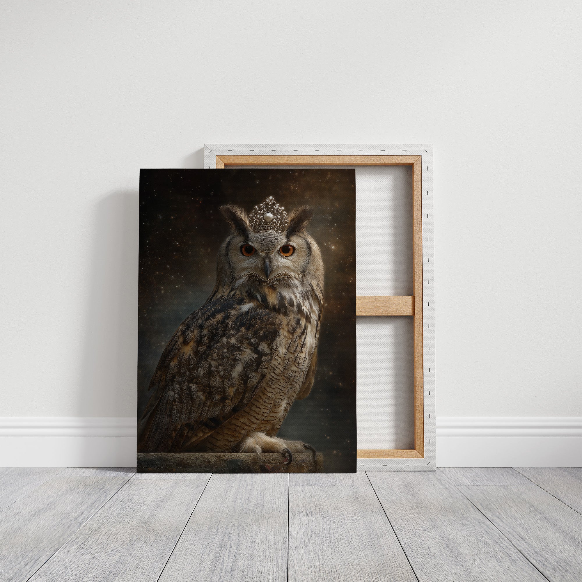 Amber eyes pierce through the veil of dusk, commanding attention with regal intensity. The crowned owl sits poised against a backdrop of misty darkness, its feathers a tapestry of earthy browns and subtle grays illuminated by ethereal light. Delicate sparkles dance around the silver diadem, transforming this woodland hunter into a mystical monarch of the night forest.