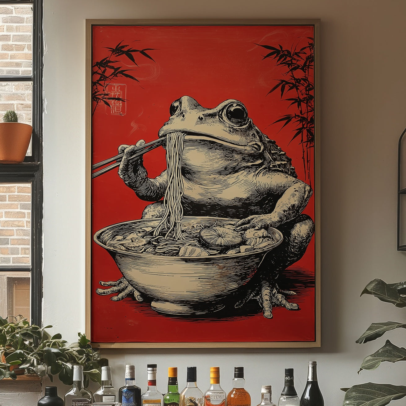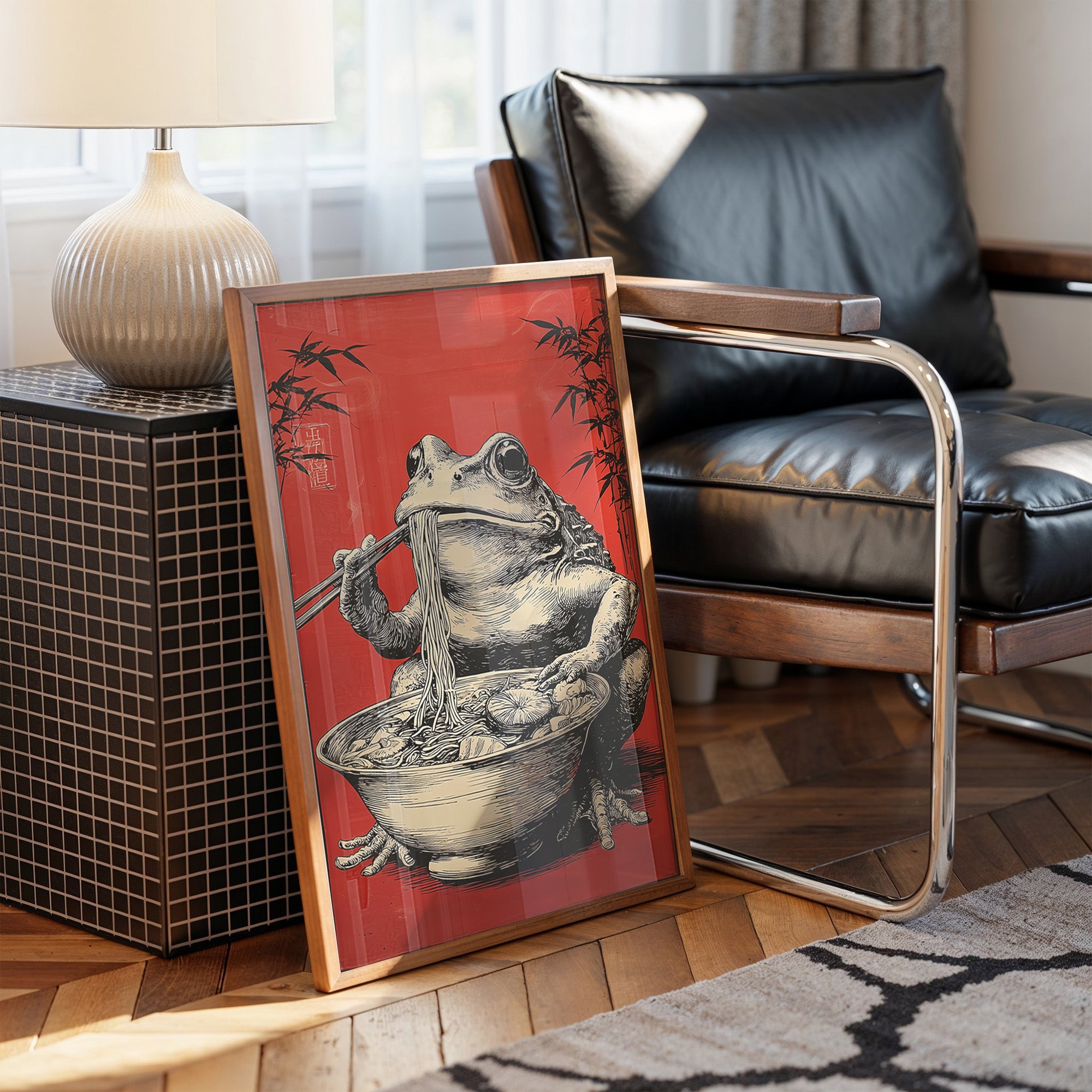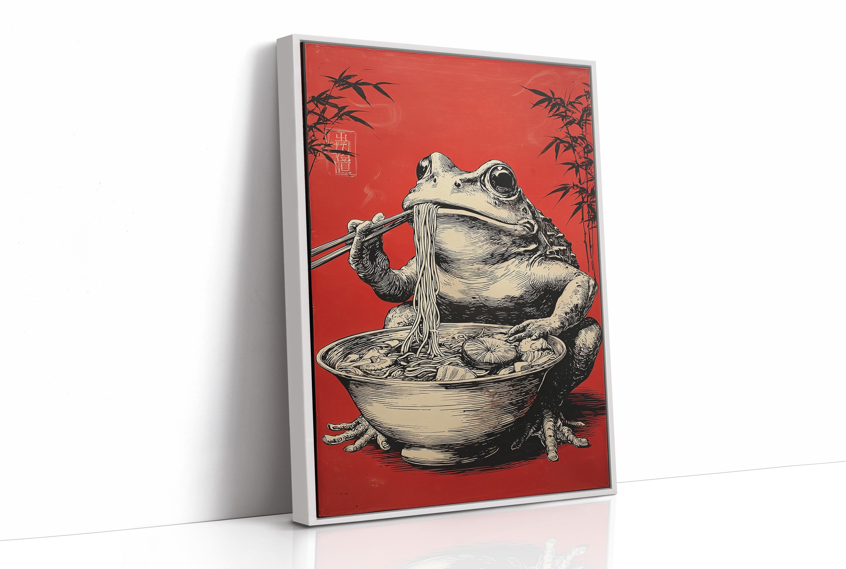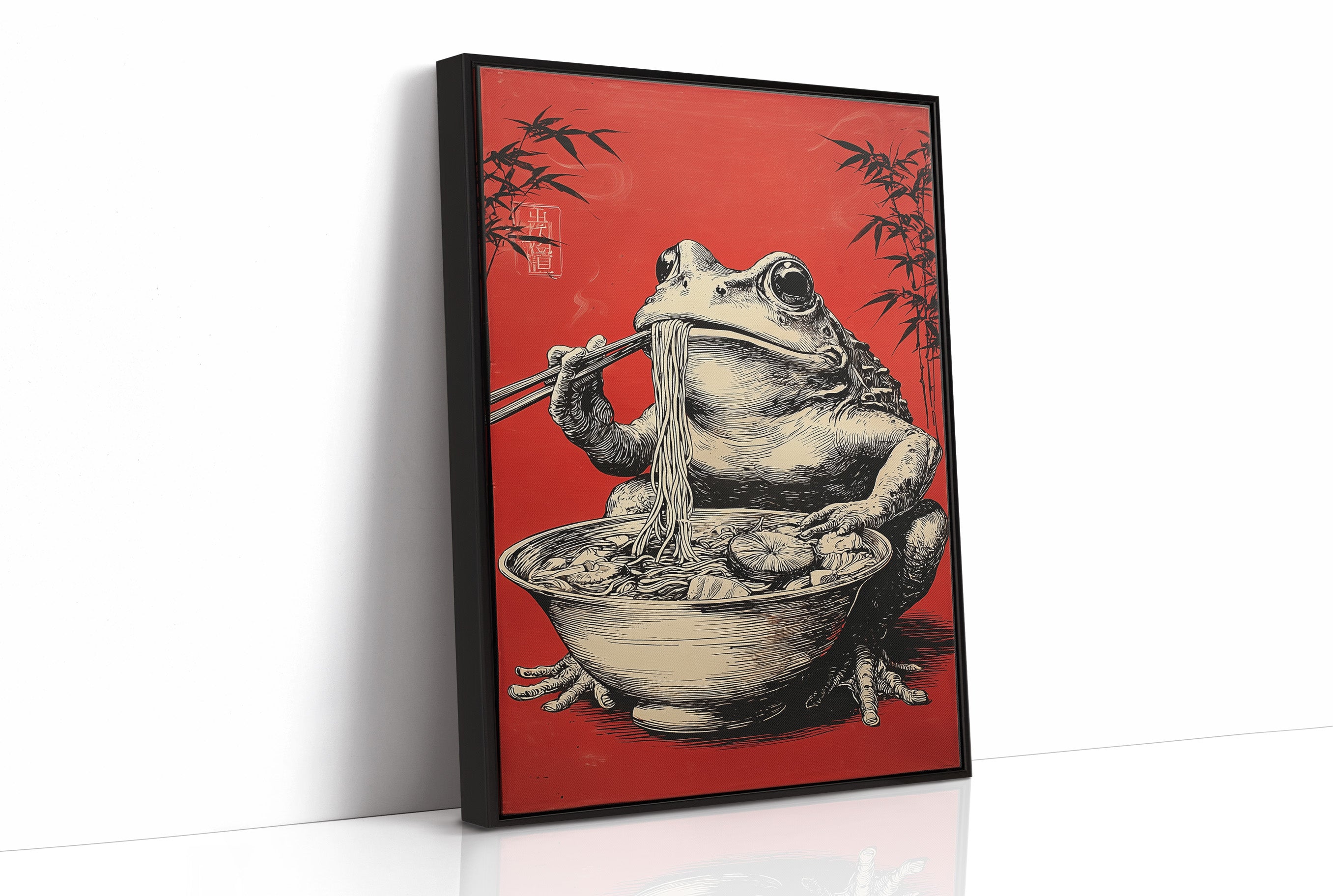 A whimsical scene unfolds as a rotund frog perches contentedly over a steaming bowl of noodles, chopsticks poised with practiced precision. Against a striking crimson background adorned with delicate bamboo silhouettes, this illustration marries Eastern artistic traditions with contemporary humor. The detailed crosshatching and masterful linework bring the amphibian gourmand to life, creating an engaging character study that balances sophistication with playful charm. This piece would make a delightful focal point in a modern dining room or add personality to a minimalist kitchen space, where its bold red backdrop and artistic narrative can spark conversation.